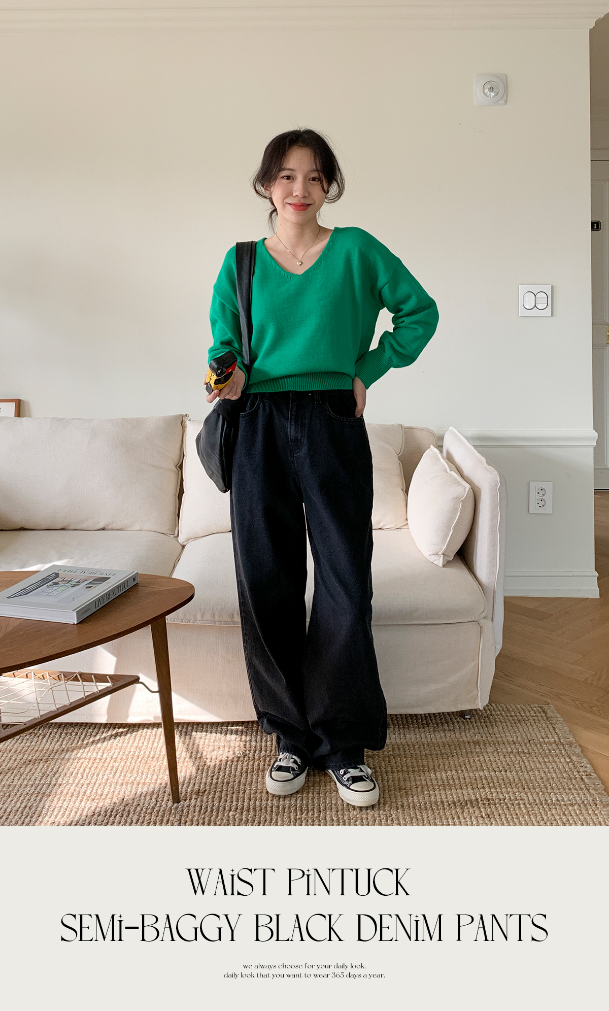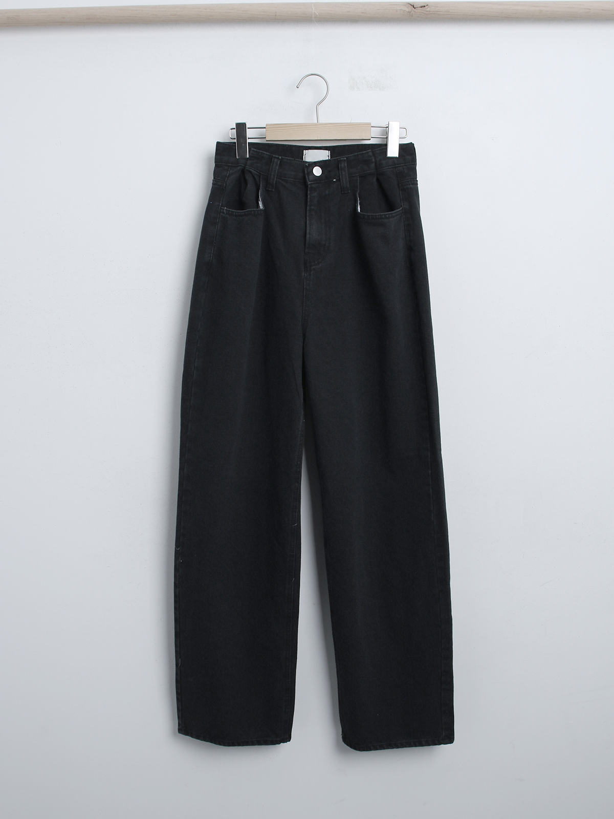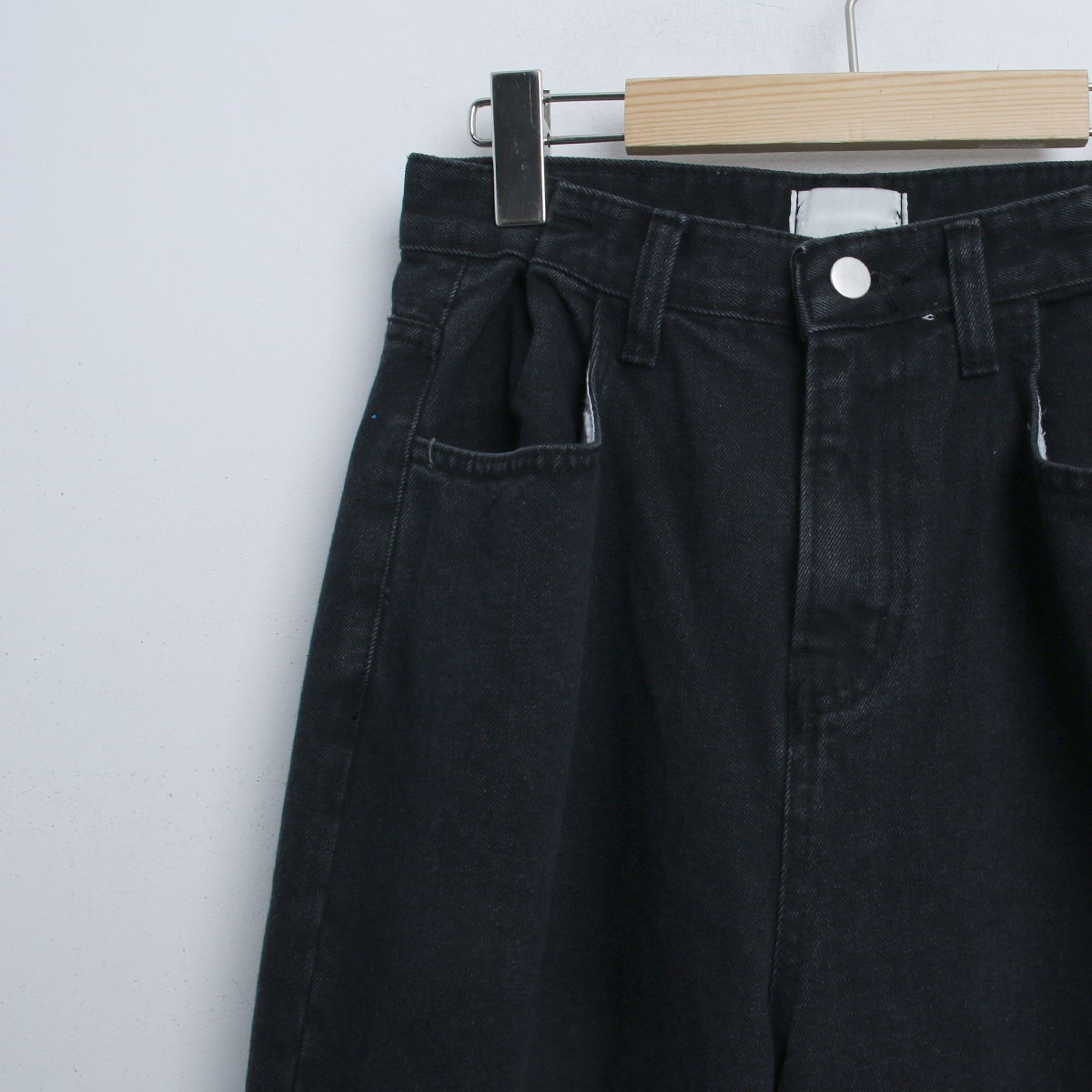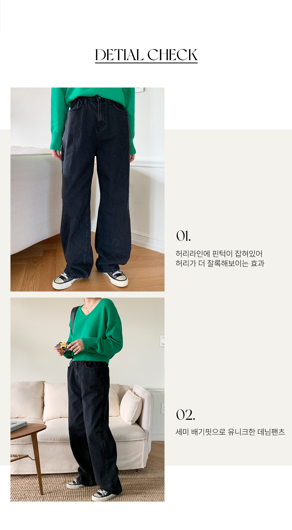 허리라인에 핀턱이 잡혀있어 허리가 더 잘록해보이고, 세미 배기핏으로 유니크한 데님팬츠