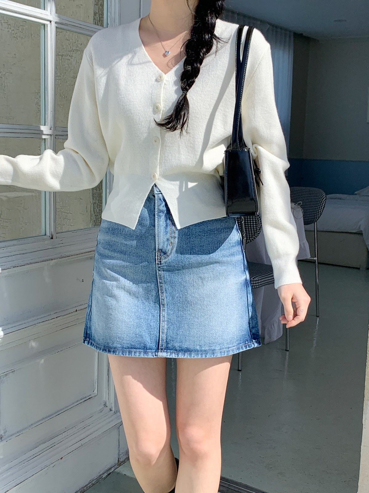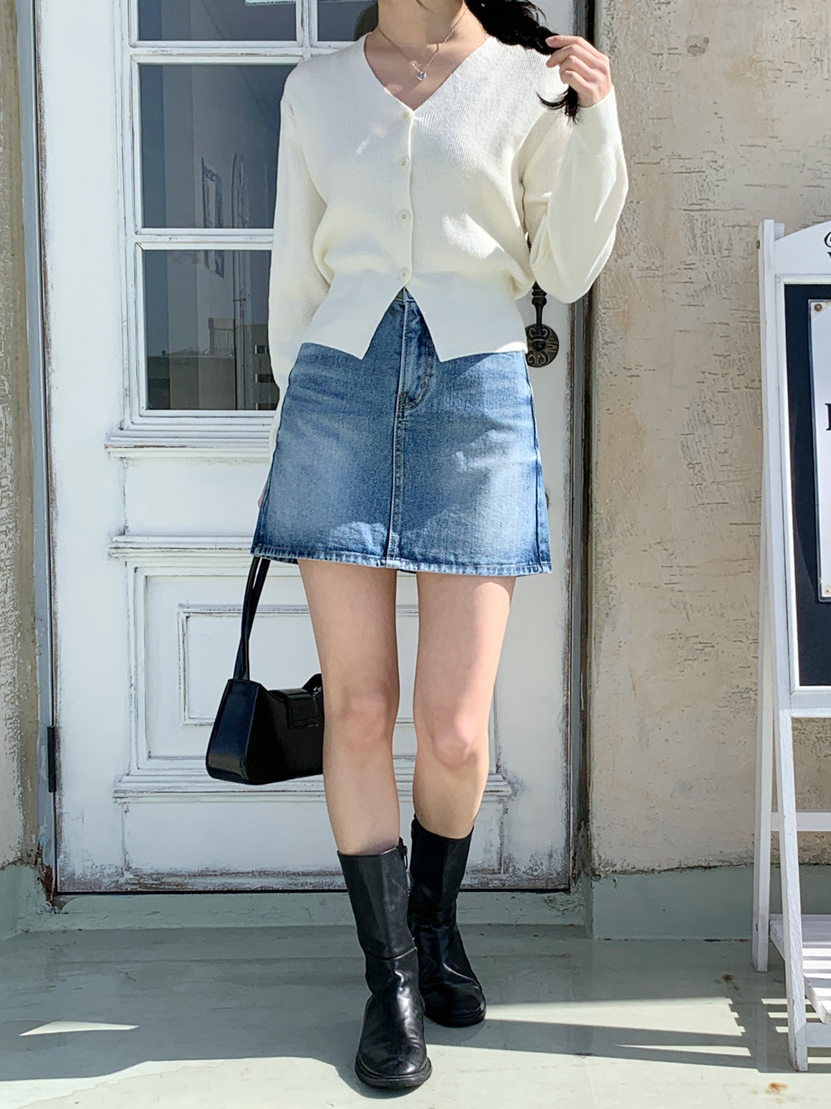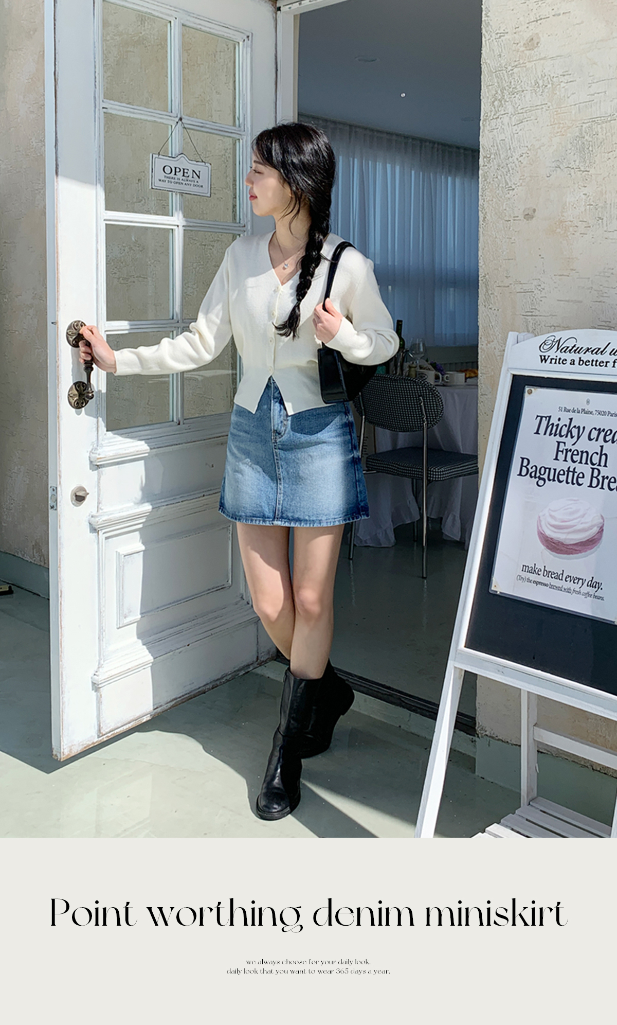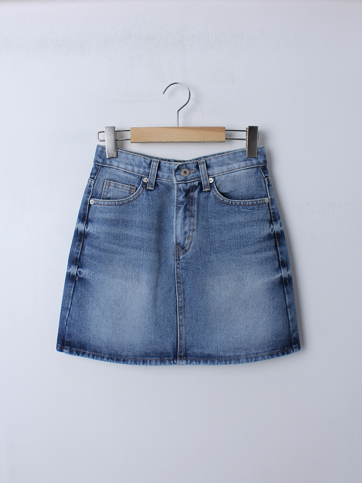 심플하게 앞워싱이 들어간 데님 미니스커트이며,