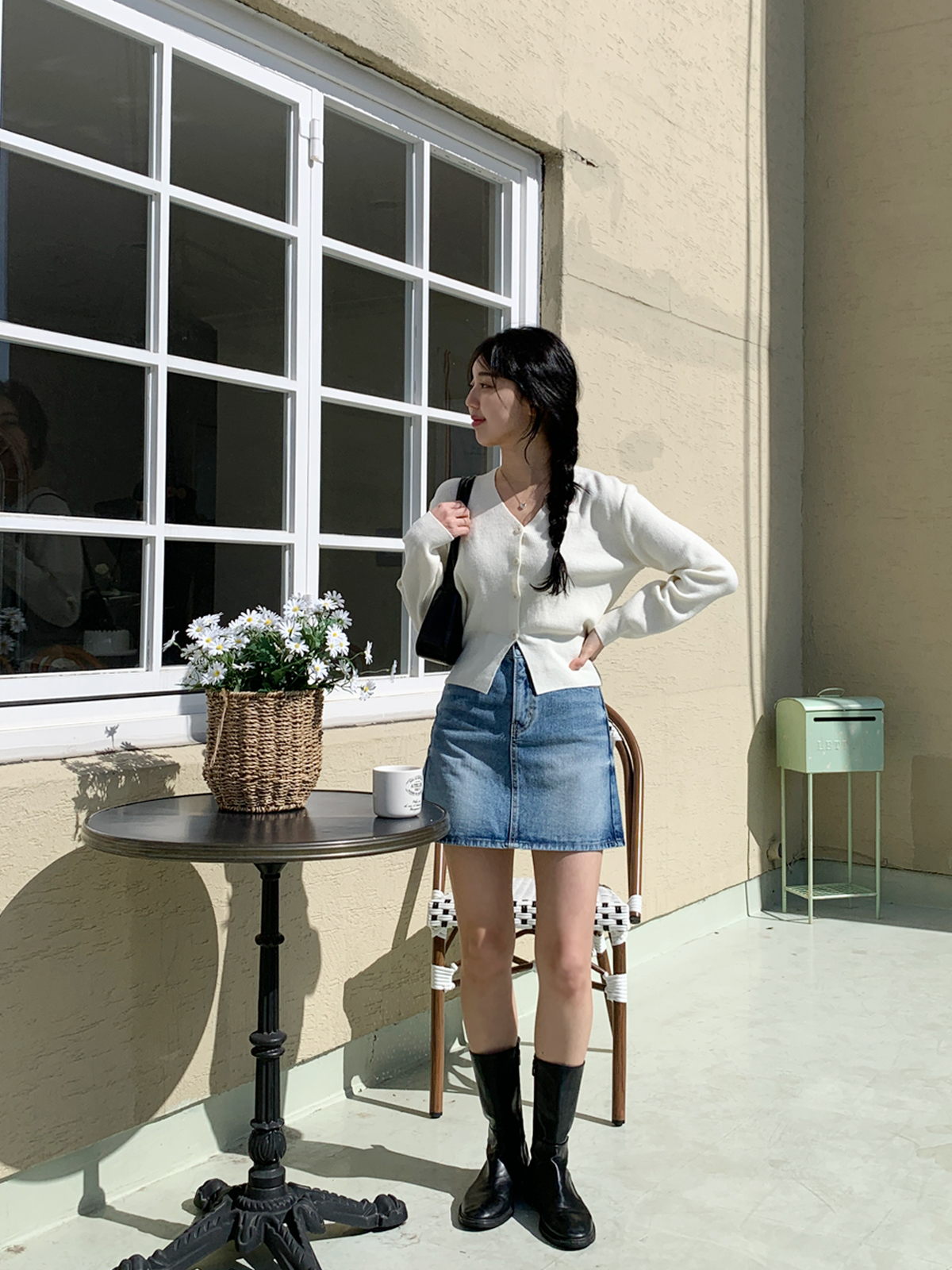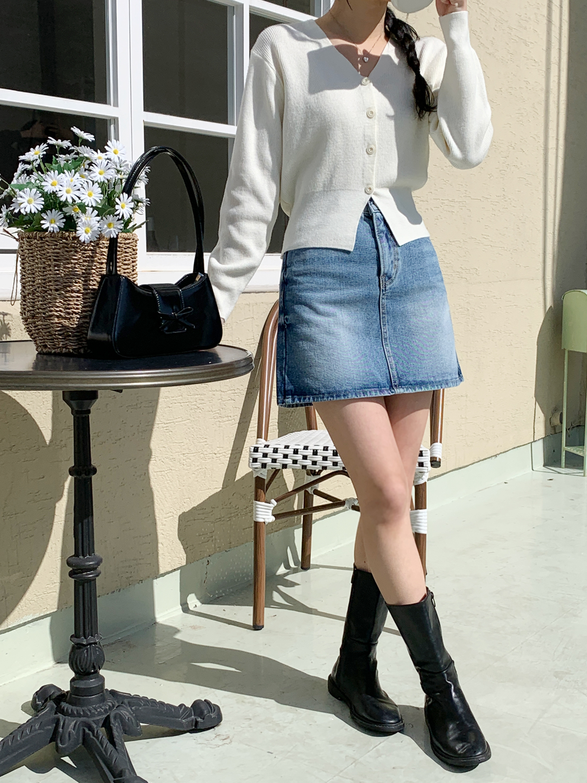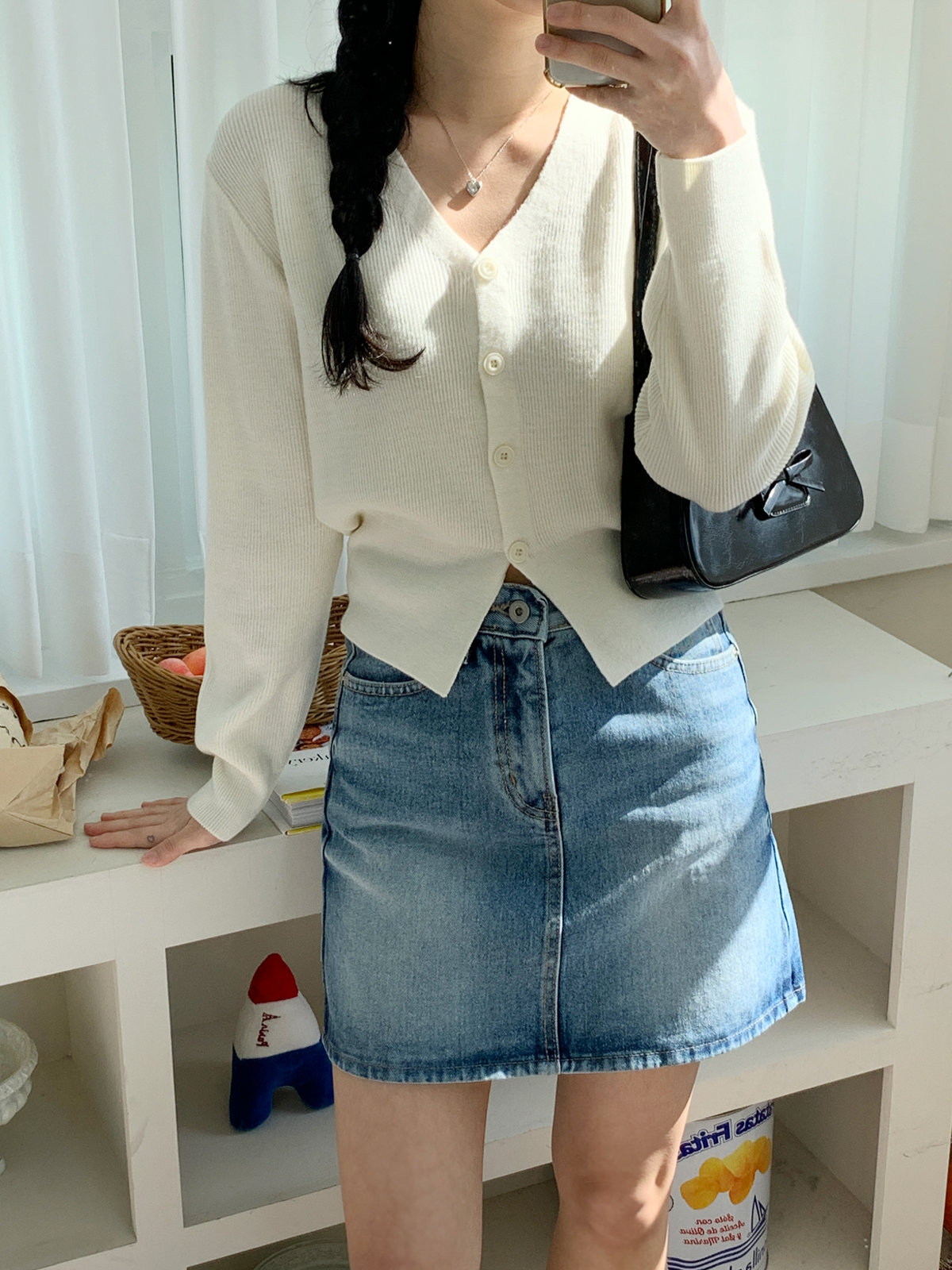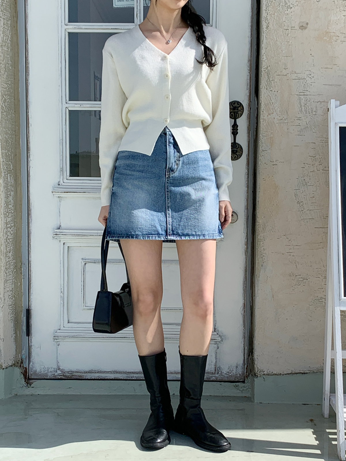 심플하게 앞워싱이 들어간 데님 미니스커트이며,