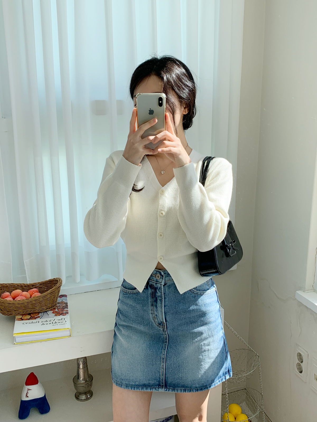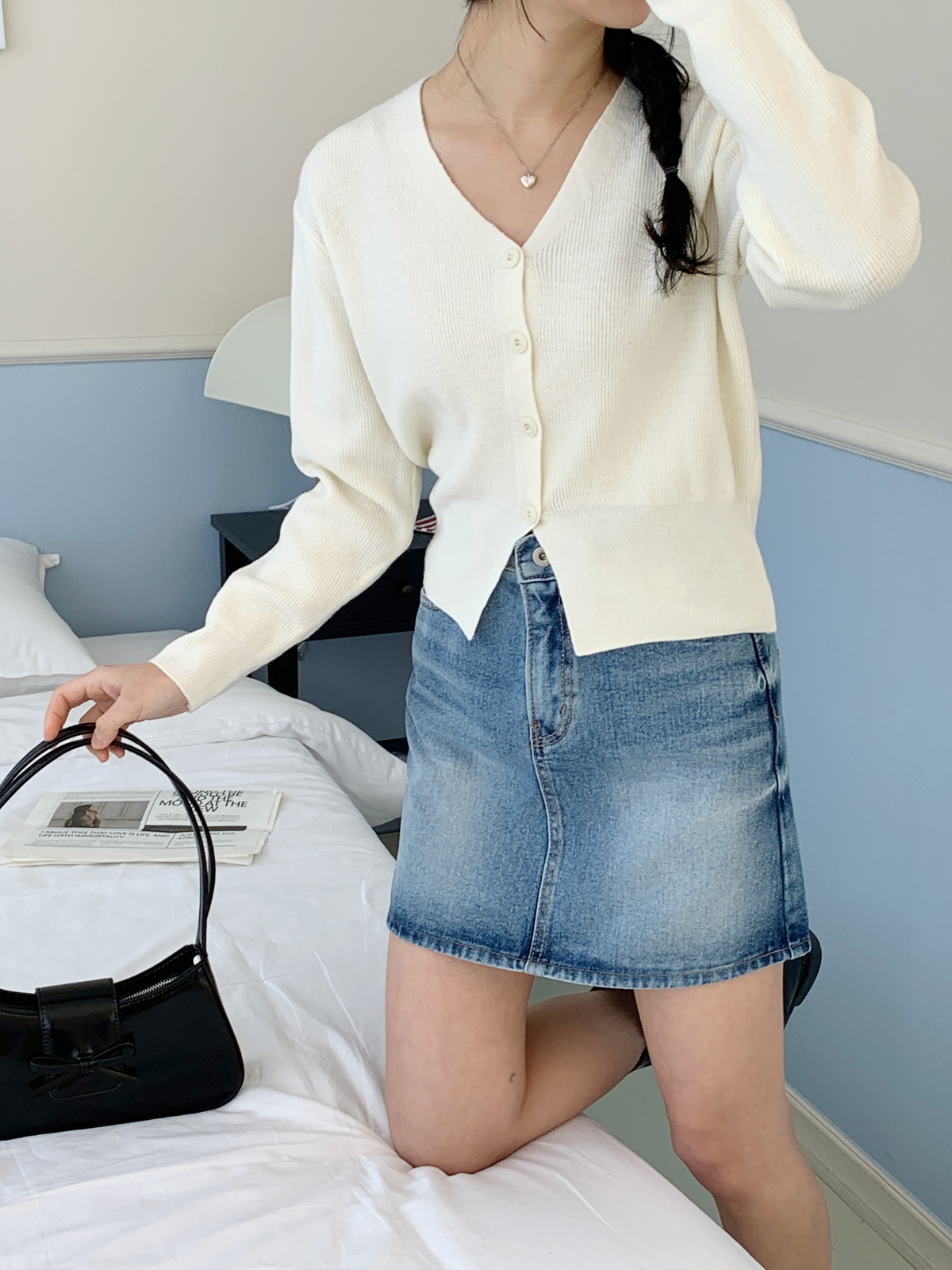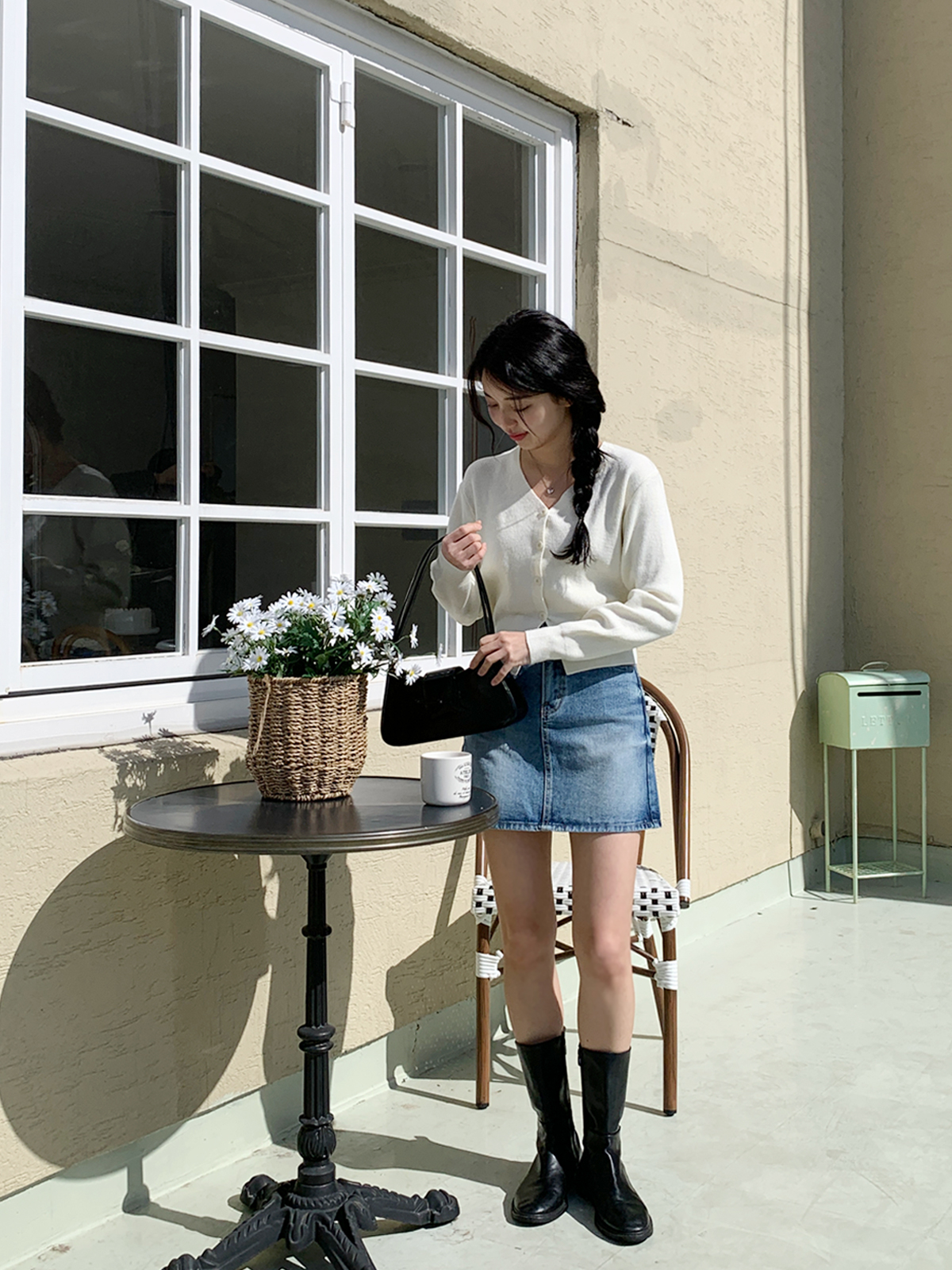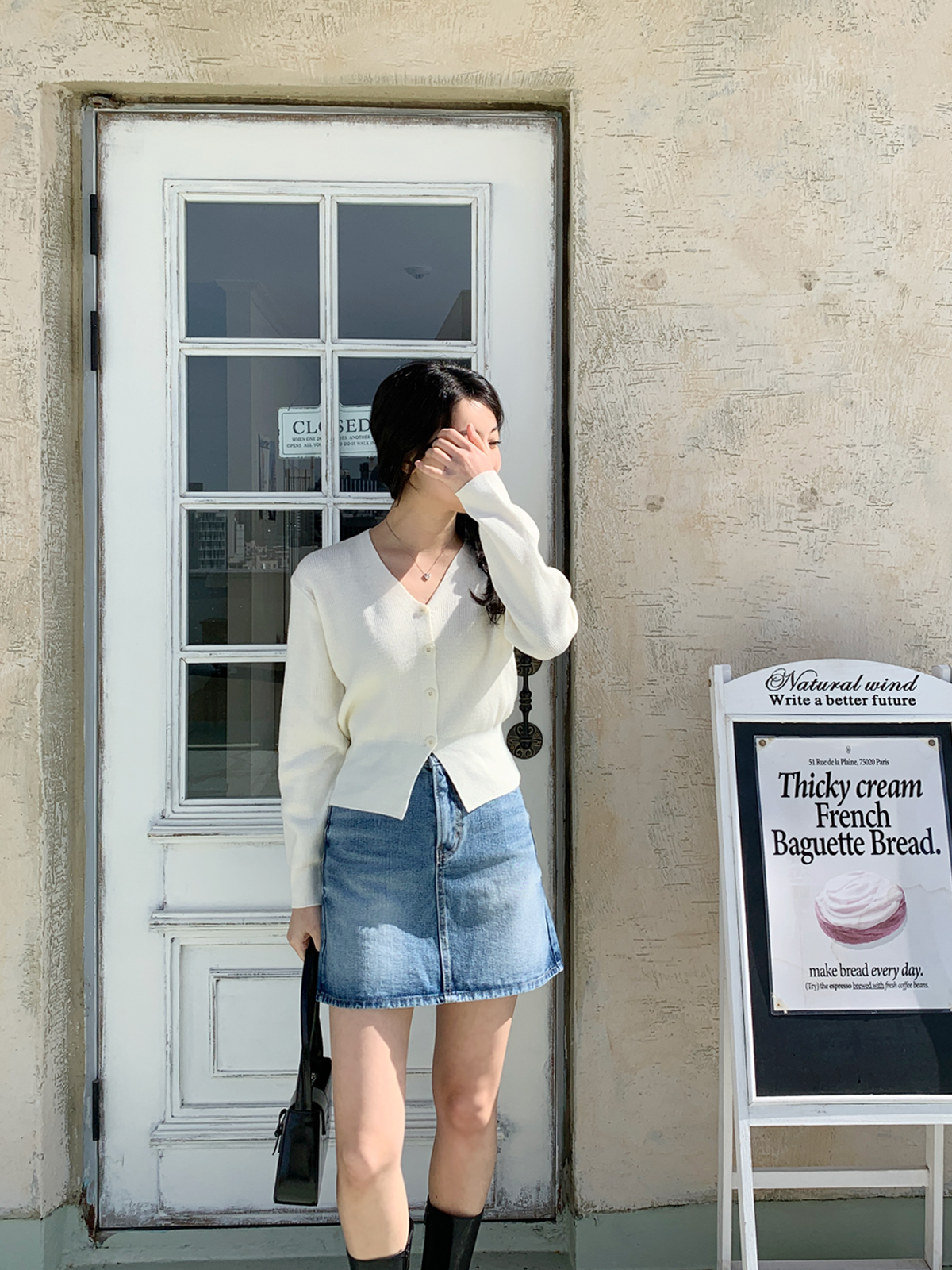 심플하게 앞워싱이 들어간 데님 미니스커트이며,