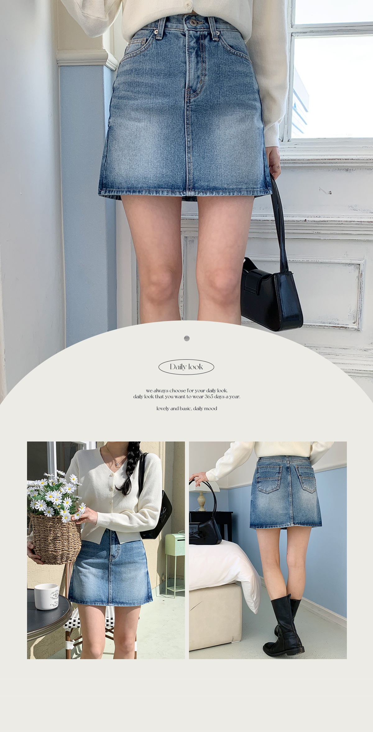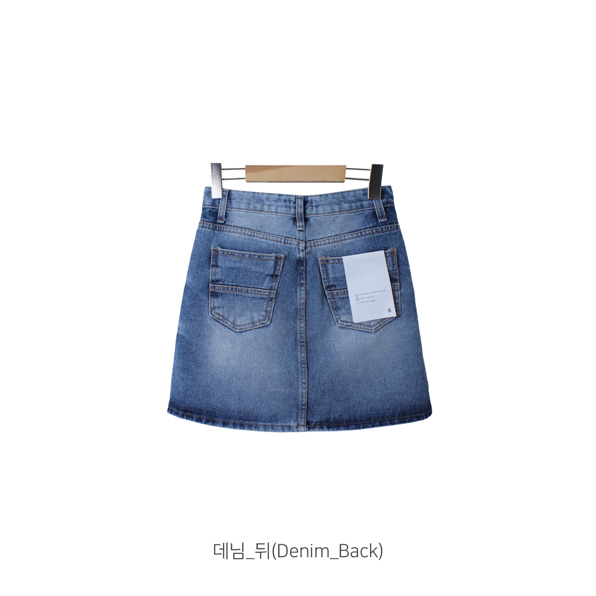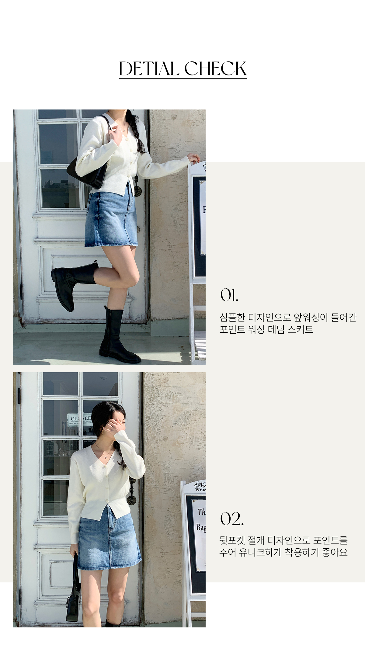 심플하게 앞워싱이 들어간 데님 미니스커트이며, 뒷포켓에 절개 디자인으로 포인트를 주어 유니크한 스커트