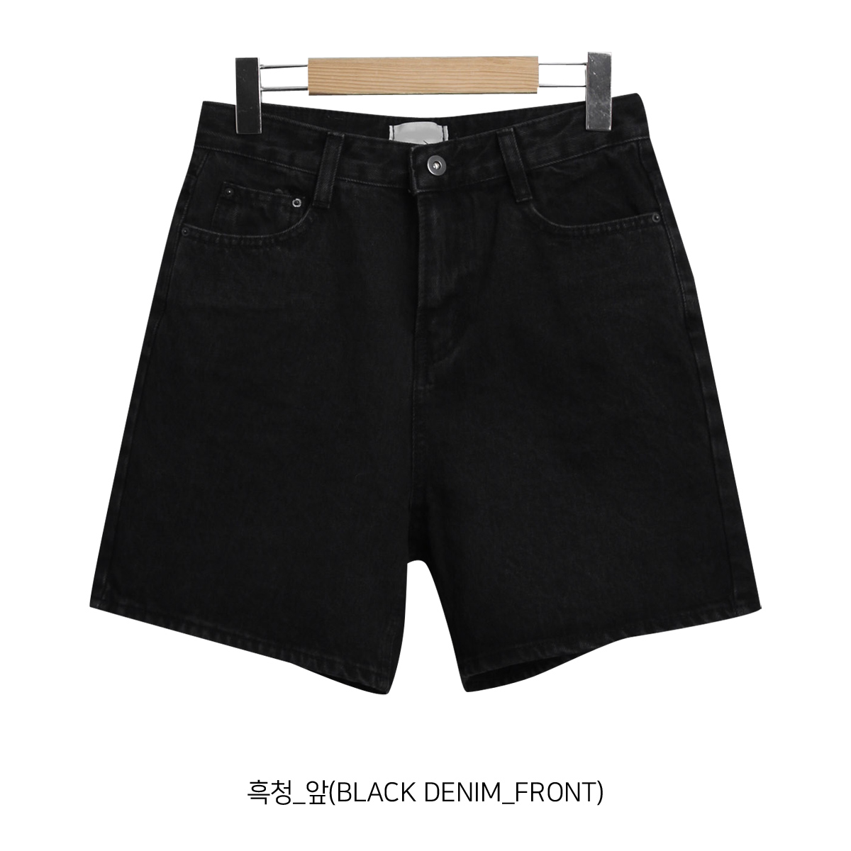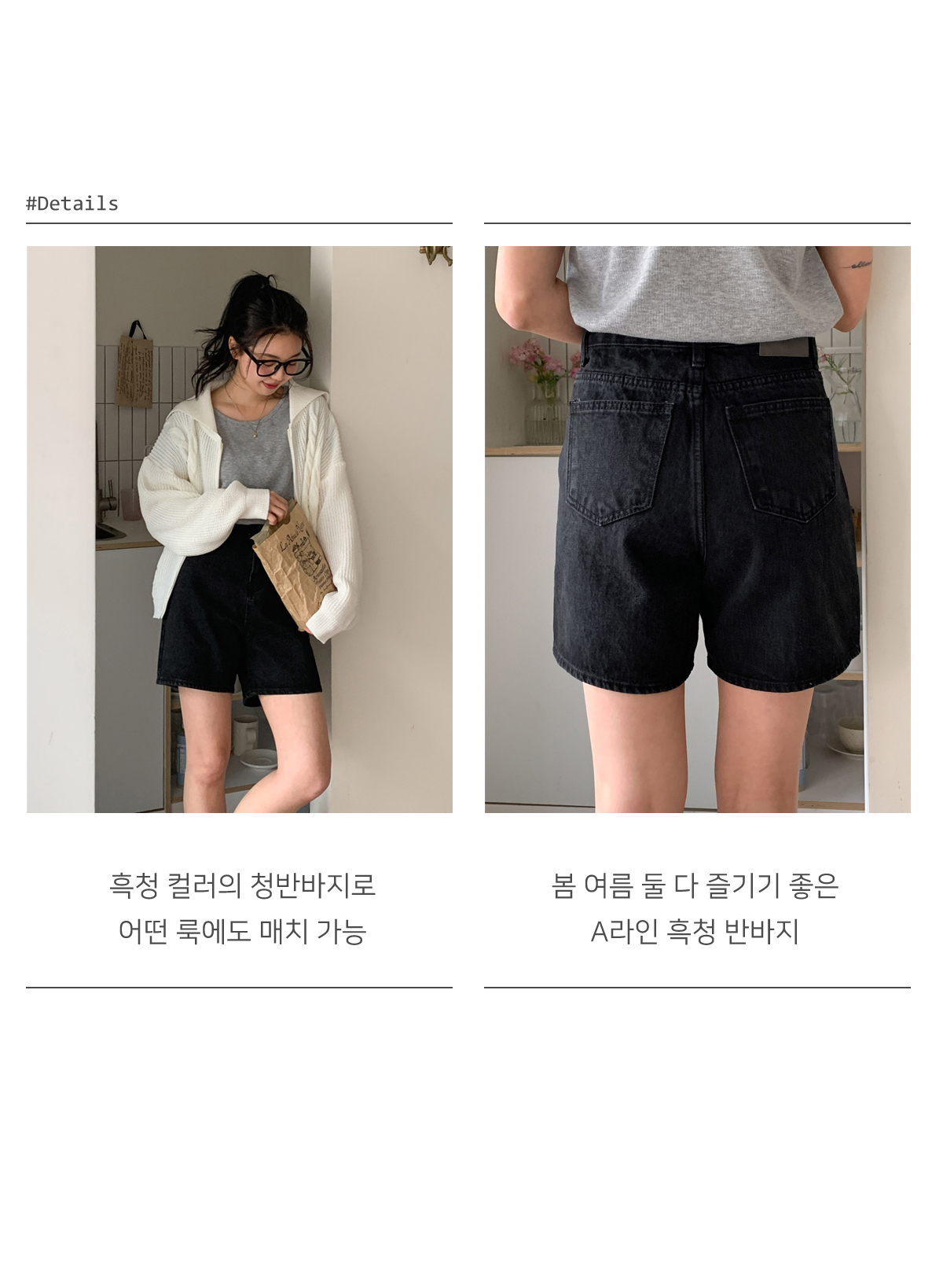 흑청 컬러의 청반바지로 어느룩에도 매치하기 쉬우며, 봄 여름 둘 다 즐기기 좋은 A라인 흑청 반바지