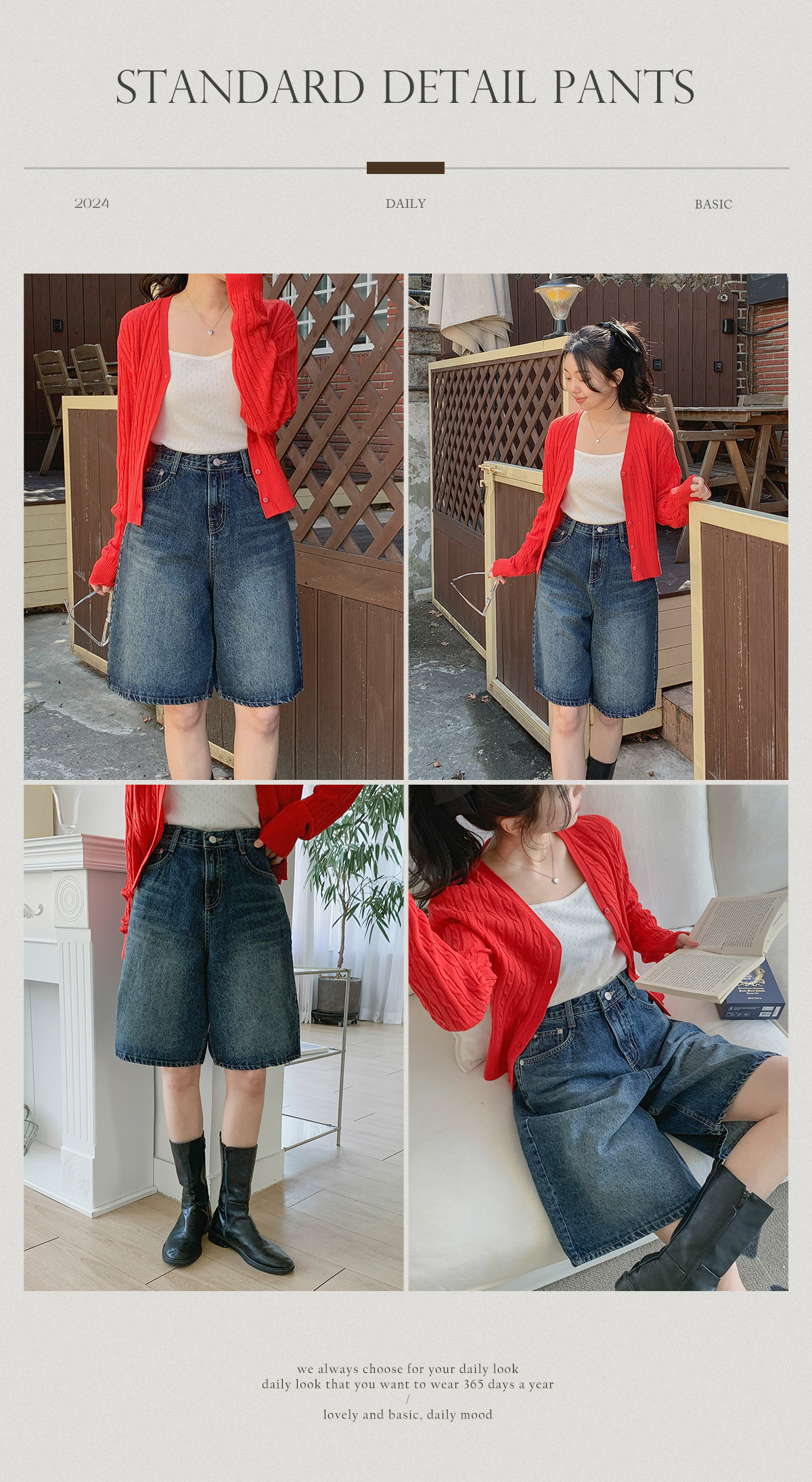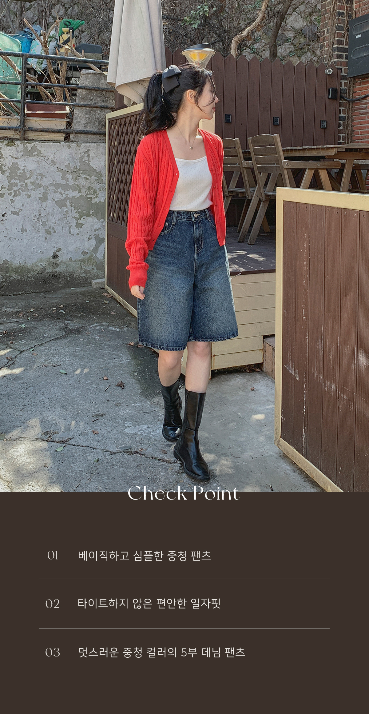 베이직하고 심플한 워싱 디테일이 들어가 밋밋하지 않은 다리라인을 연출해주며, 타이트하지않은 일자핏의 5부 중청 데님팬츠