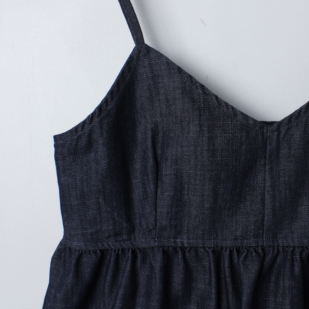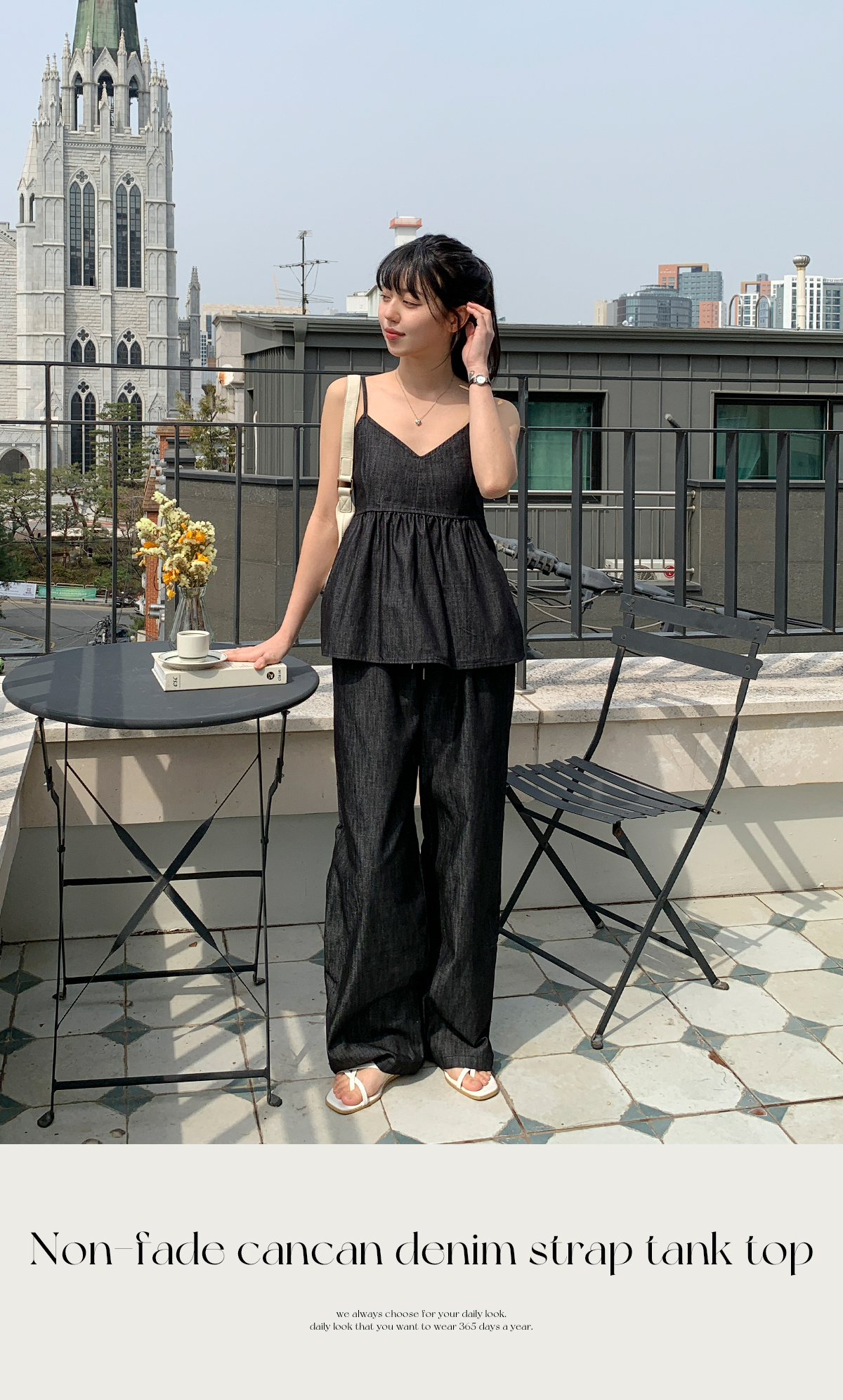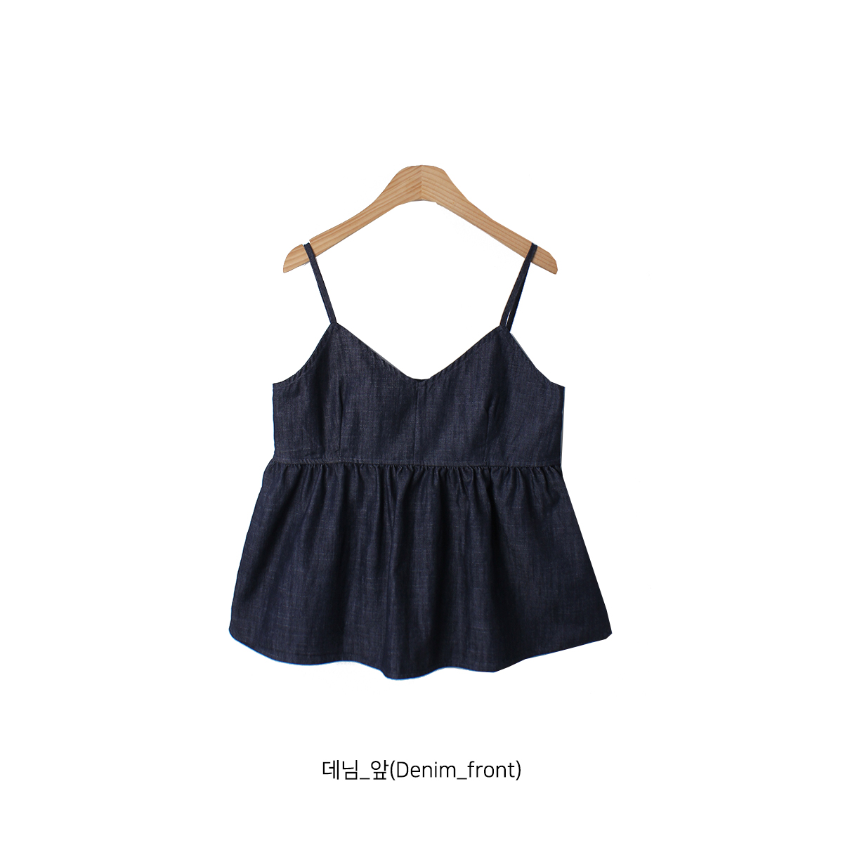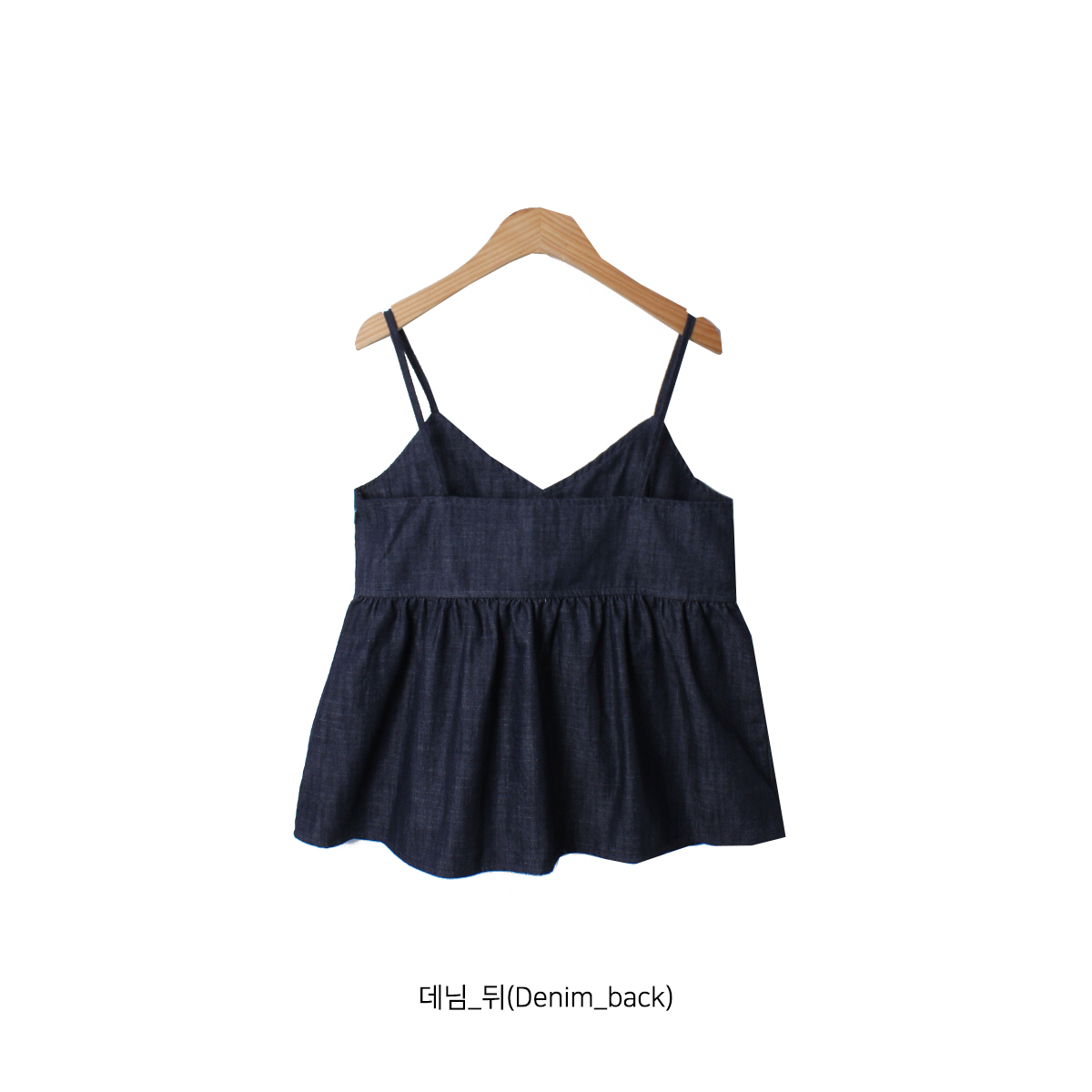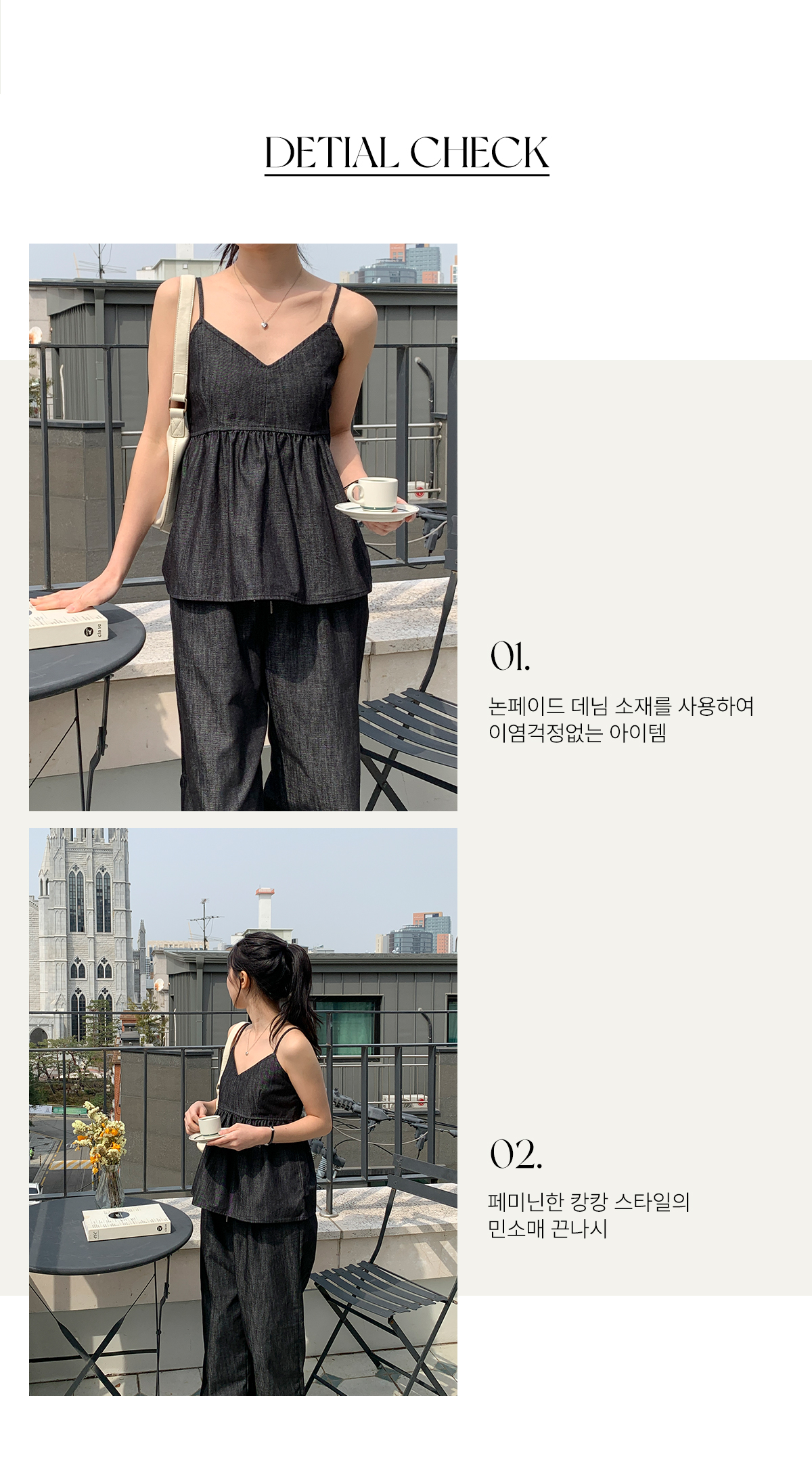 논페이드 데님 소재를 사용하여 이염걱정없이 입으실 수 있으며 페미닌한 캉캉 스타일의 민소매 끈나시
