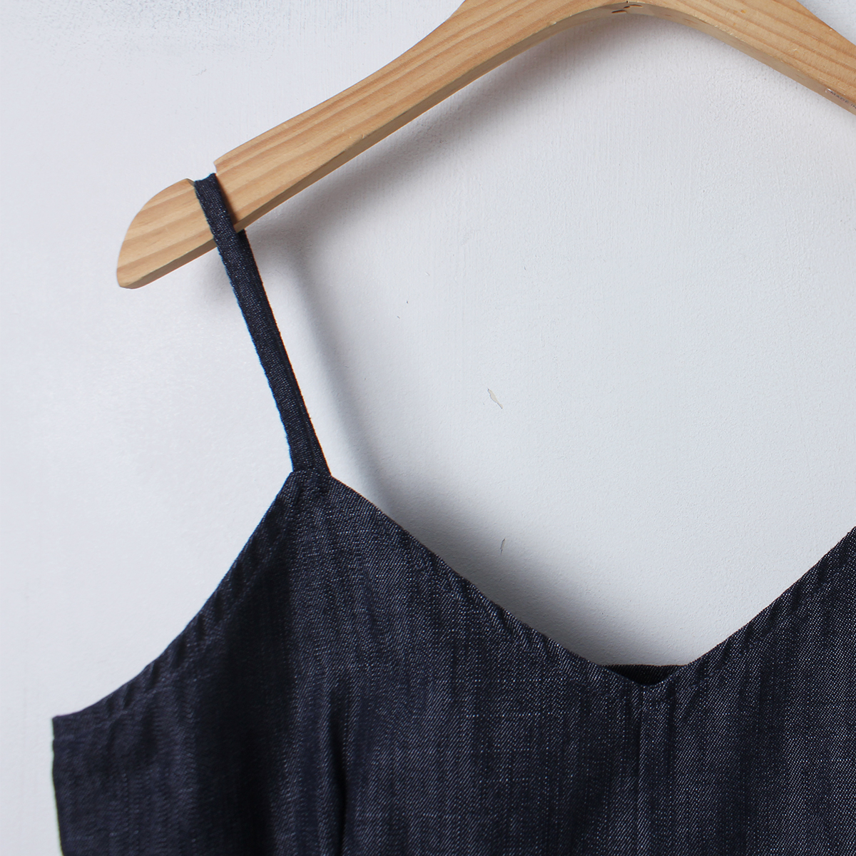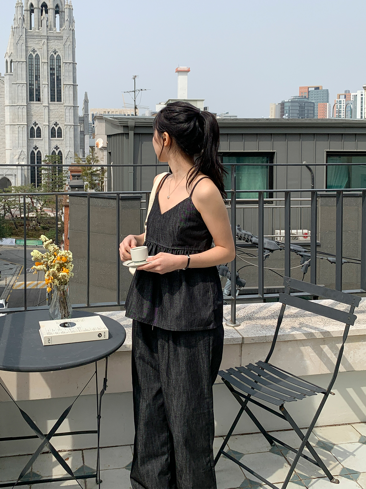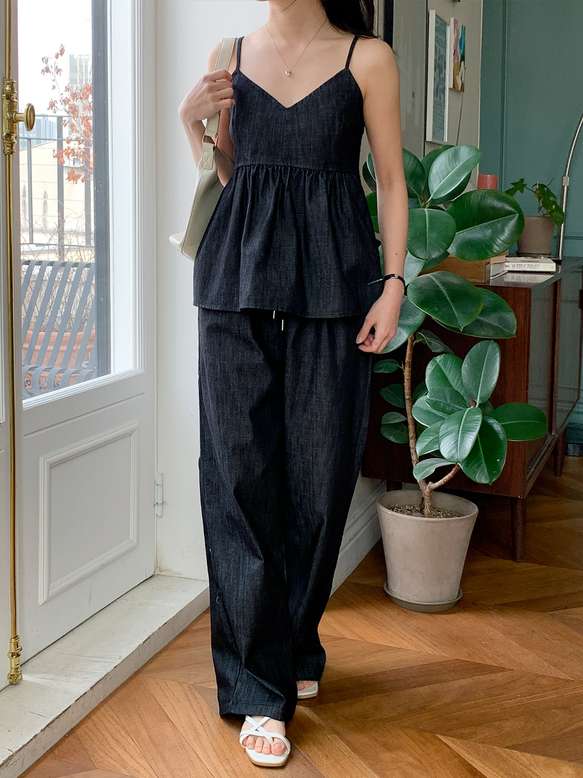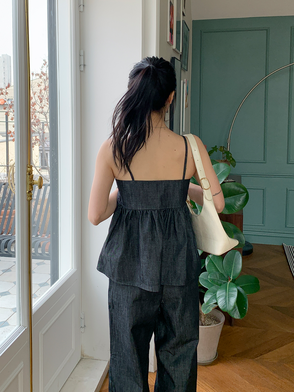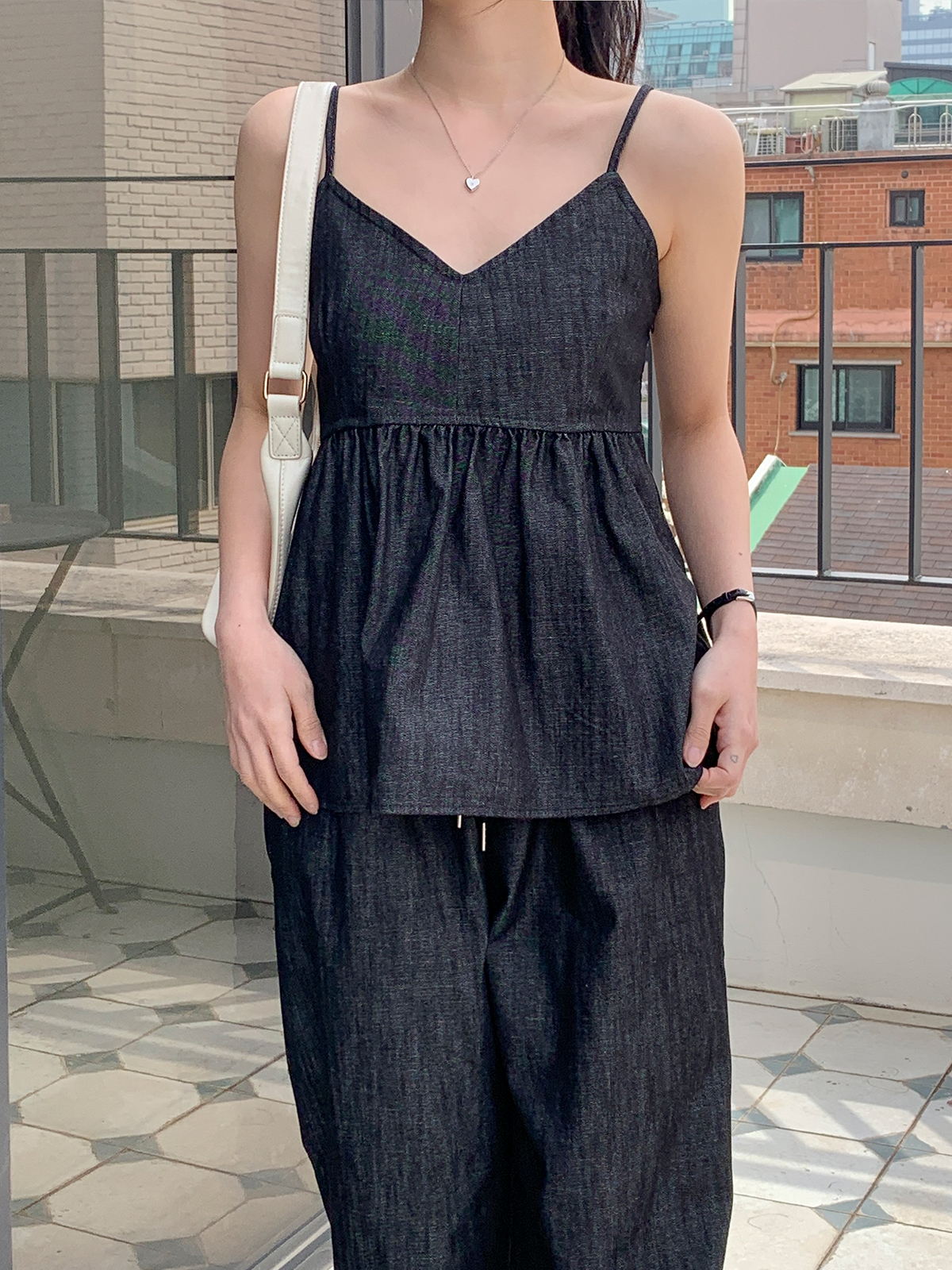 논페이드 데님 소재를 사용하여 이염걱정없이 입으실 수 있으며 페미닌한 캉캉 스타일의 민소매 끈나시