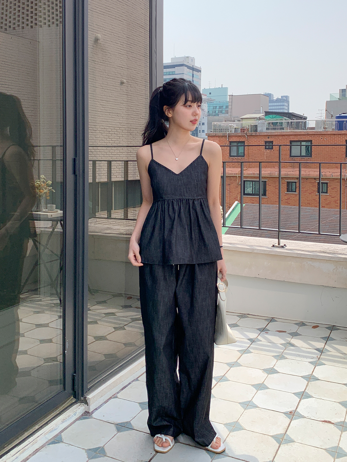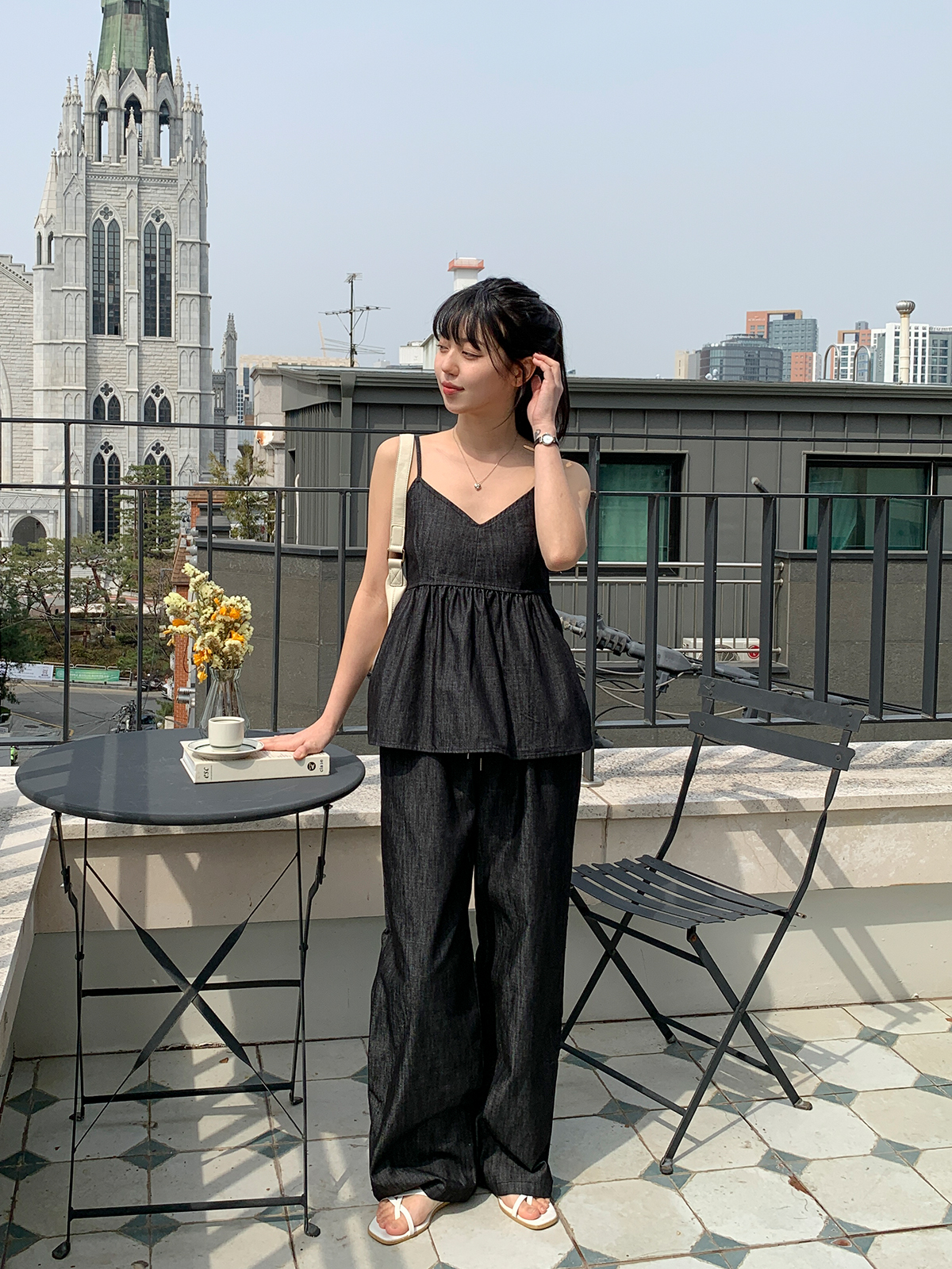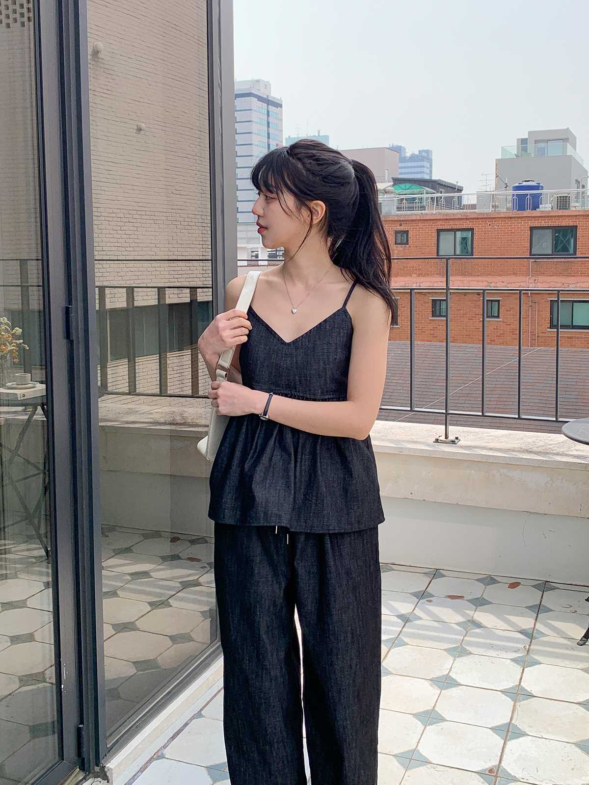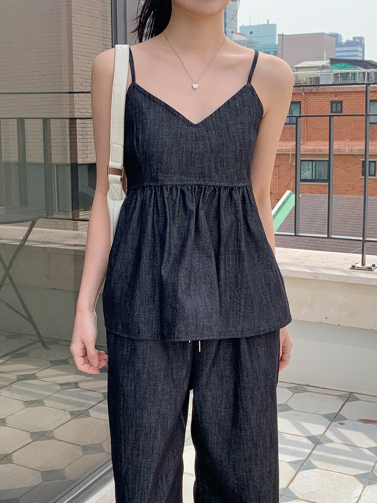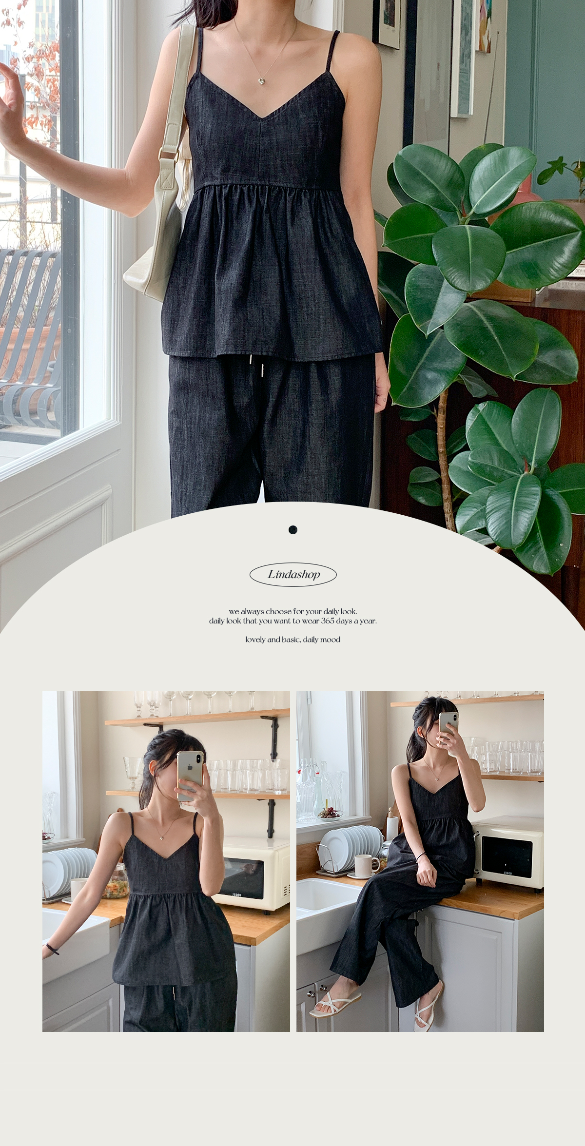 논페이드 데님 소재를 사용하여 이염걱정없이 입으실 수 있으며 페미닌한 캉캉 스타일의 민소매 끈나시