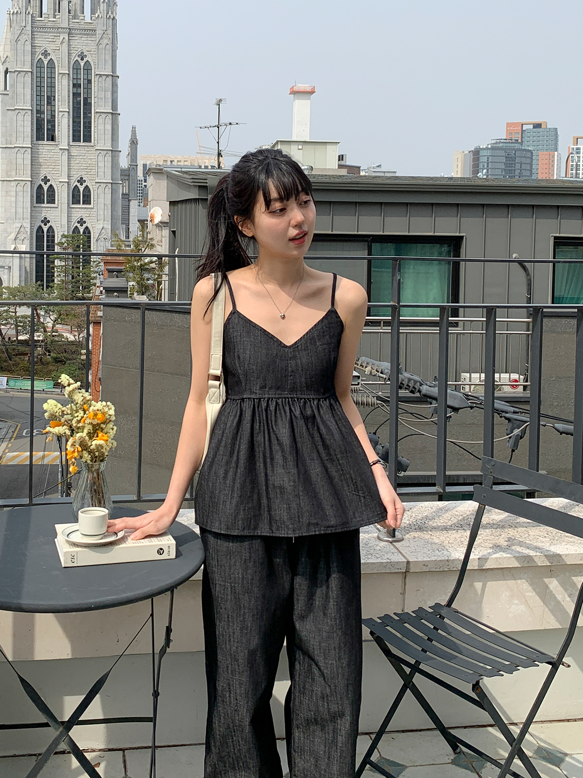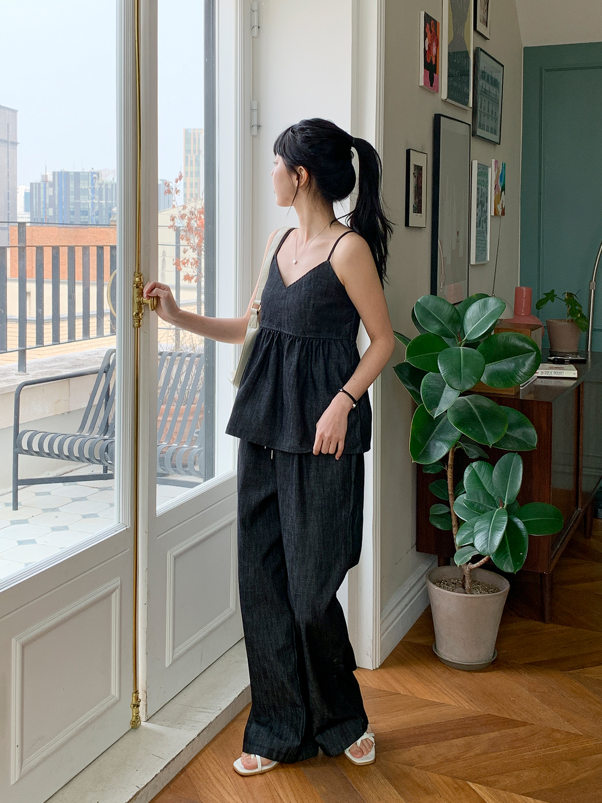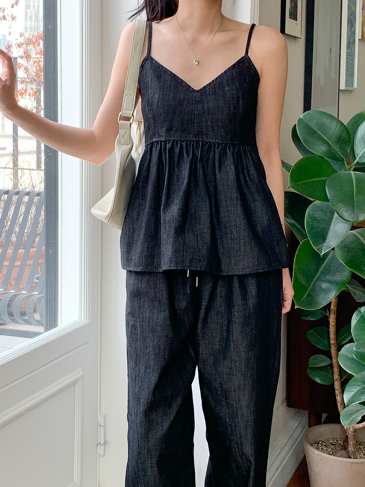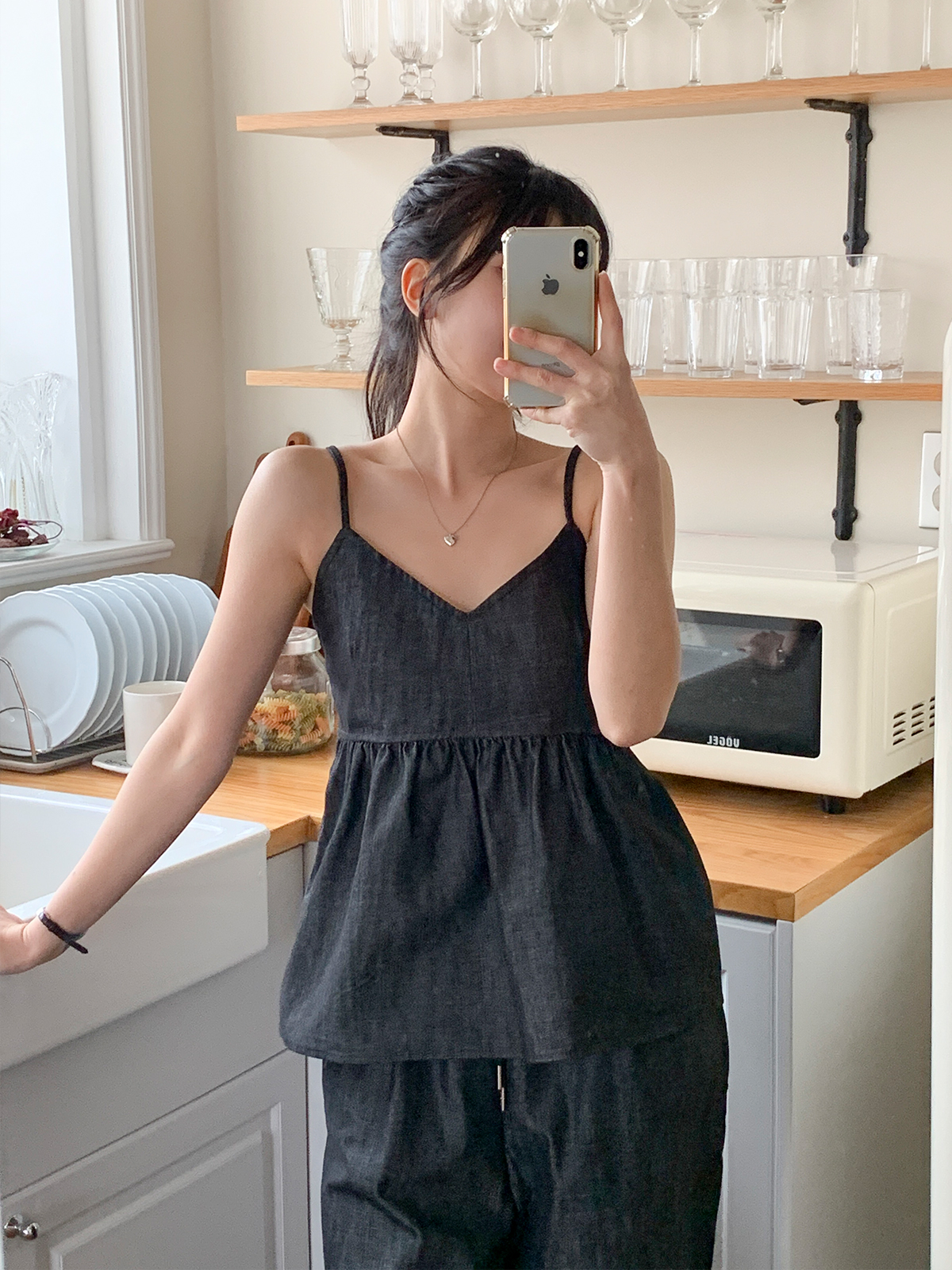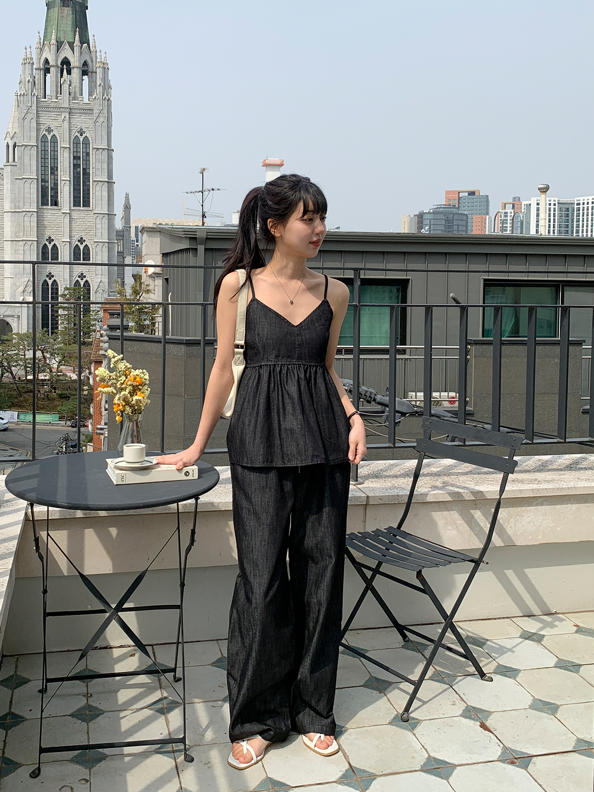 논페이드 데님 소재를 사용하여 이염걱정없이 입으실 수 있으며 페미닌한 캉캉 스타일의 민소매 끈나시