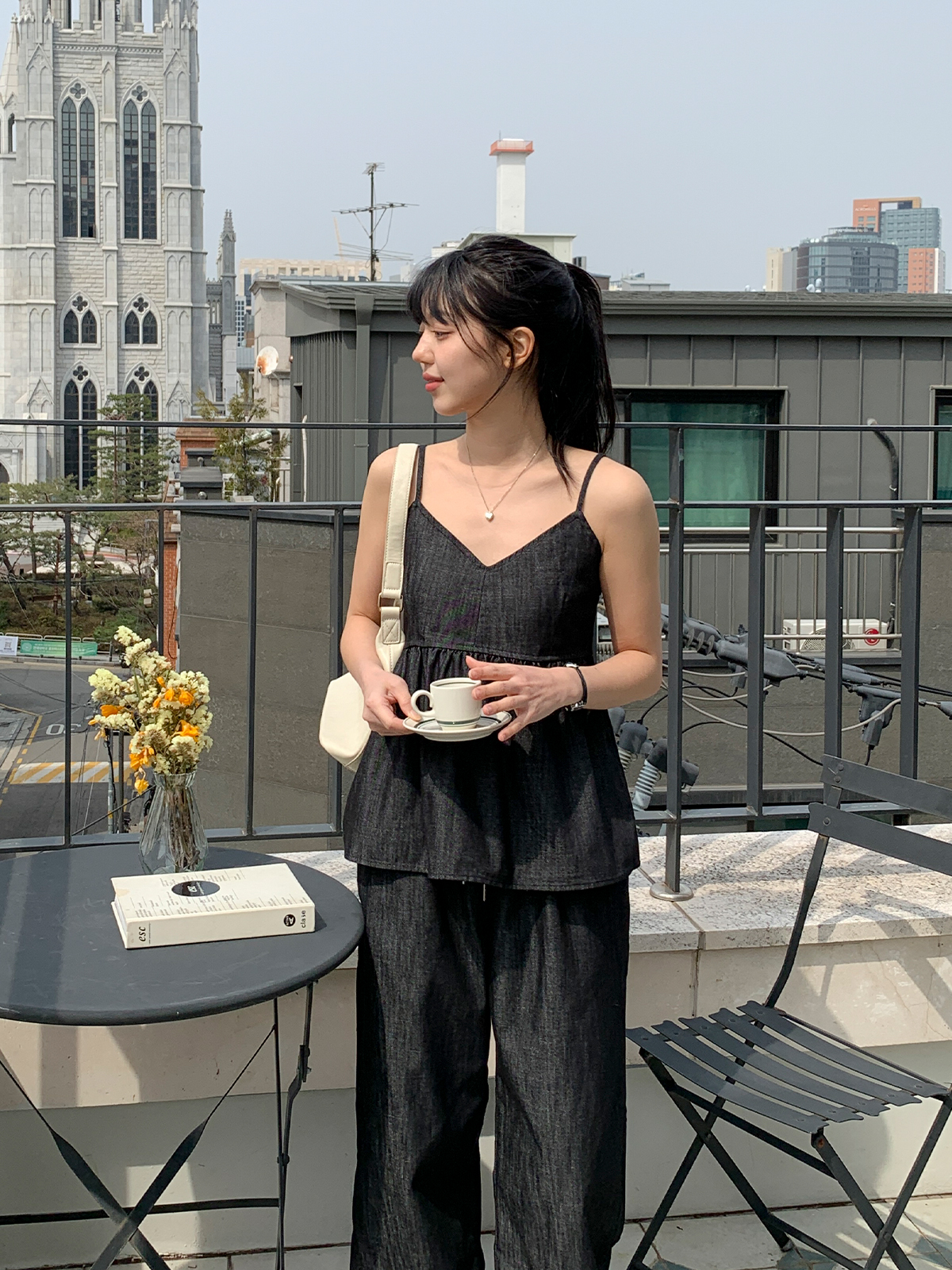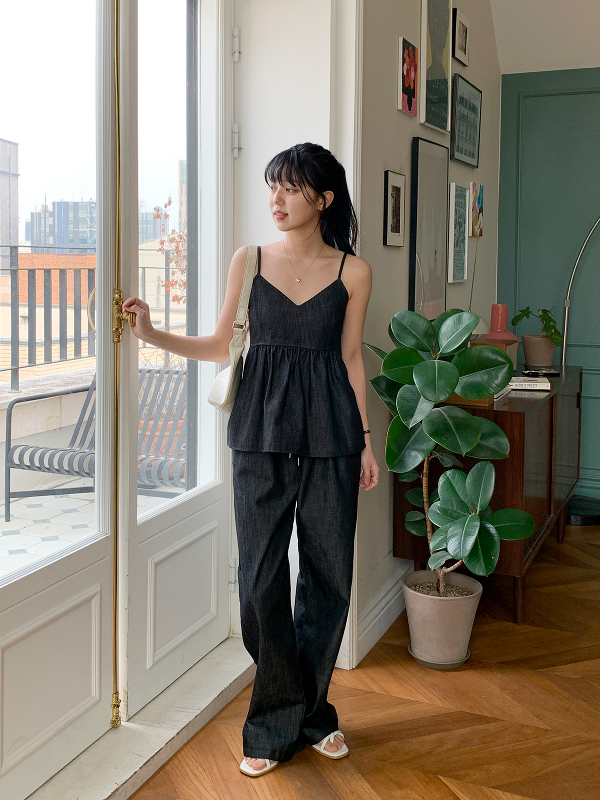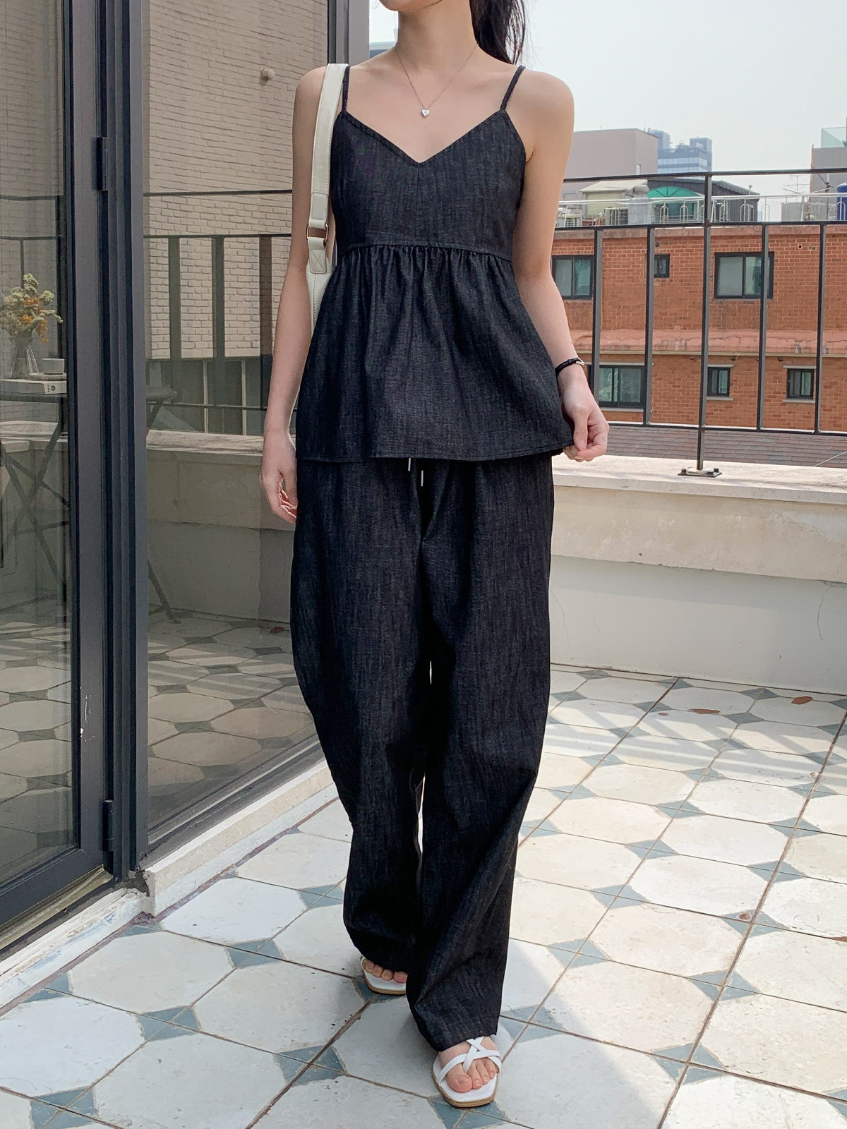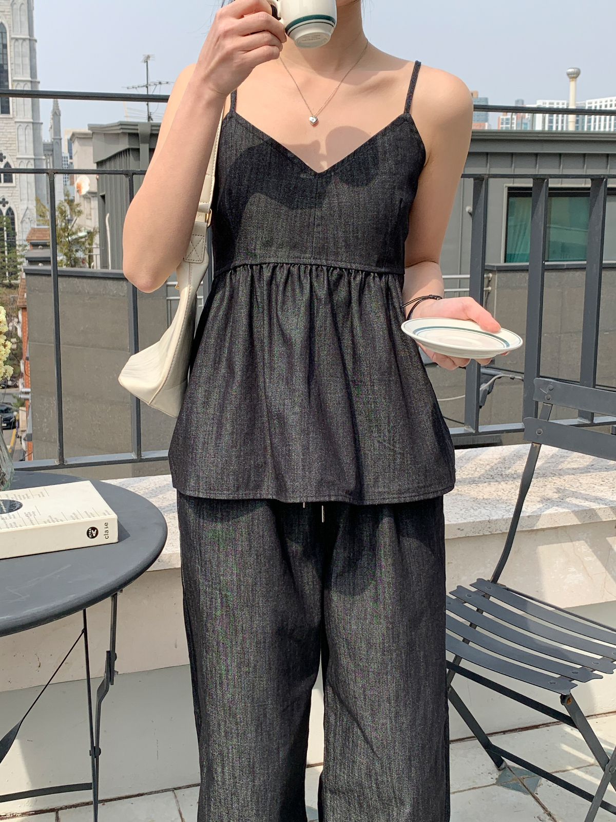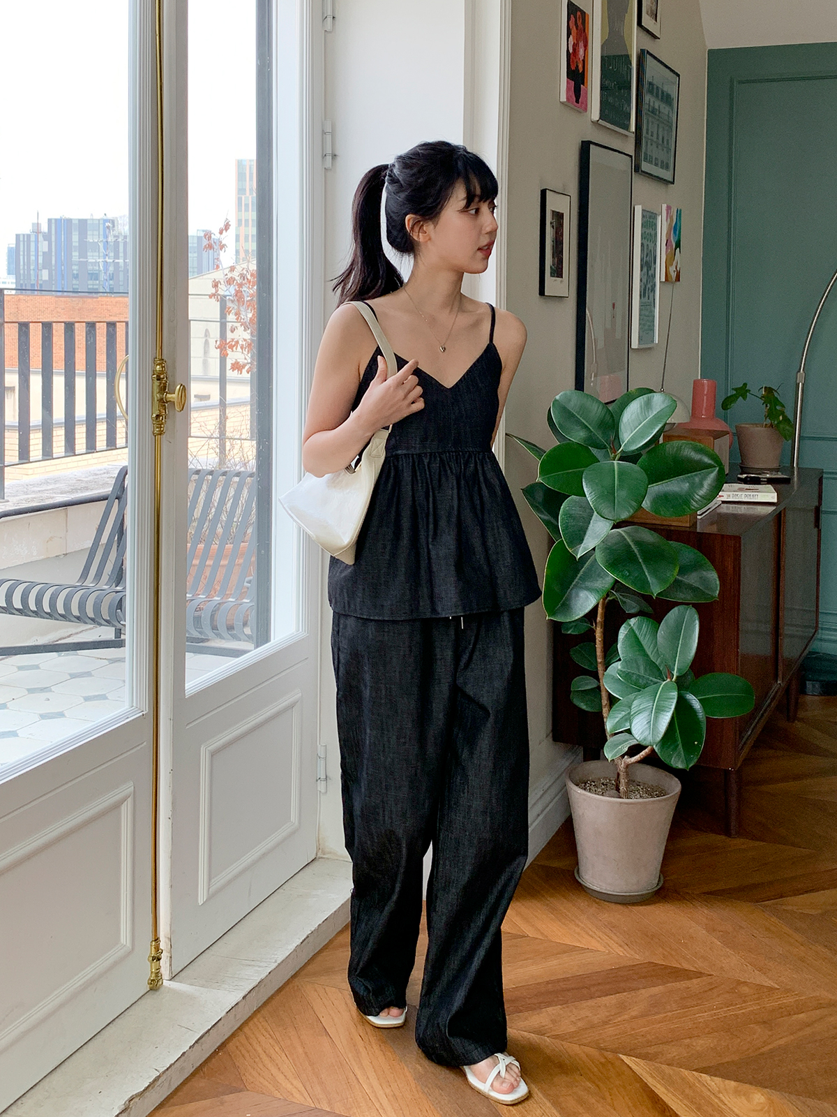 논페이드 데님 소재를 사용하여 이염걱정없이 입으실 수 있으며 페미닌한 캉캉 스타일의 민소매 끈나시