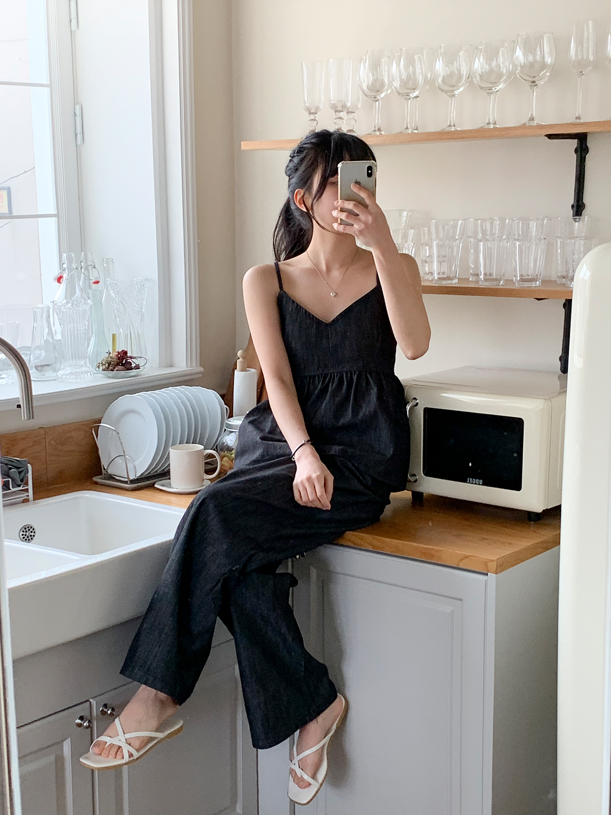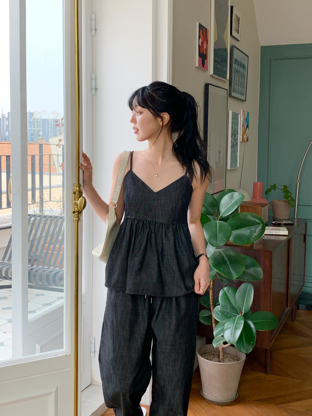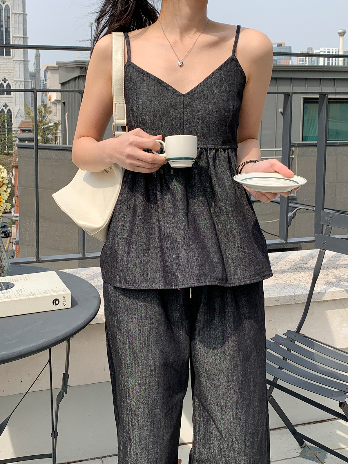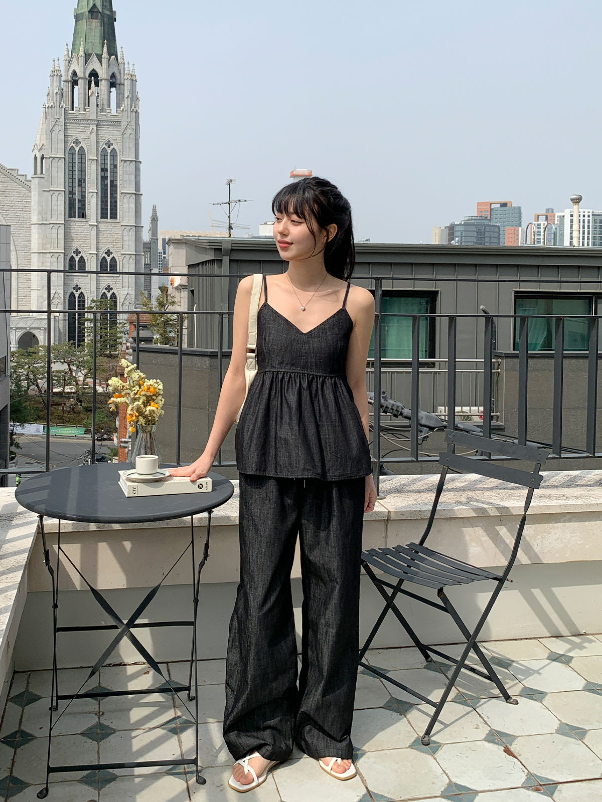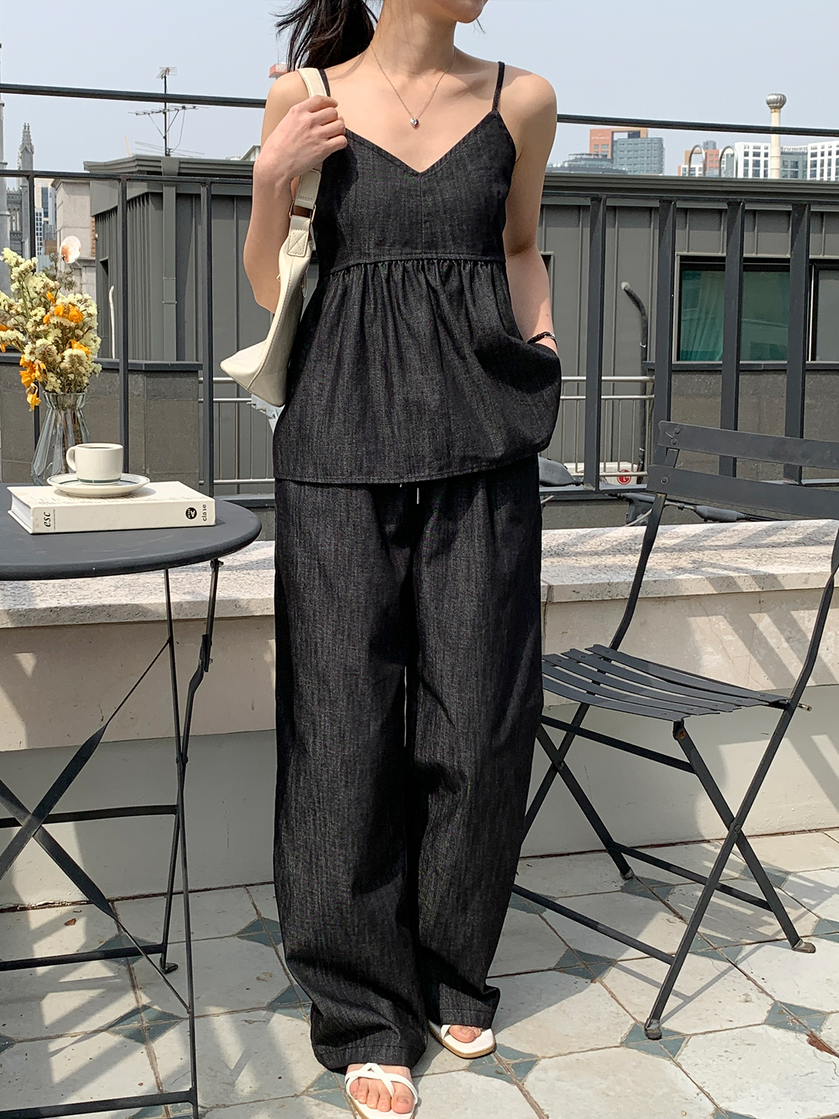 논페이드 데님 소재를 사용하여 이염걱정없이 입으실 수 있으며 페미닌한 캉캉 스타일의 민소매 끈나시