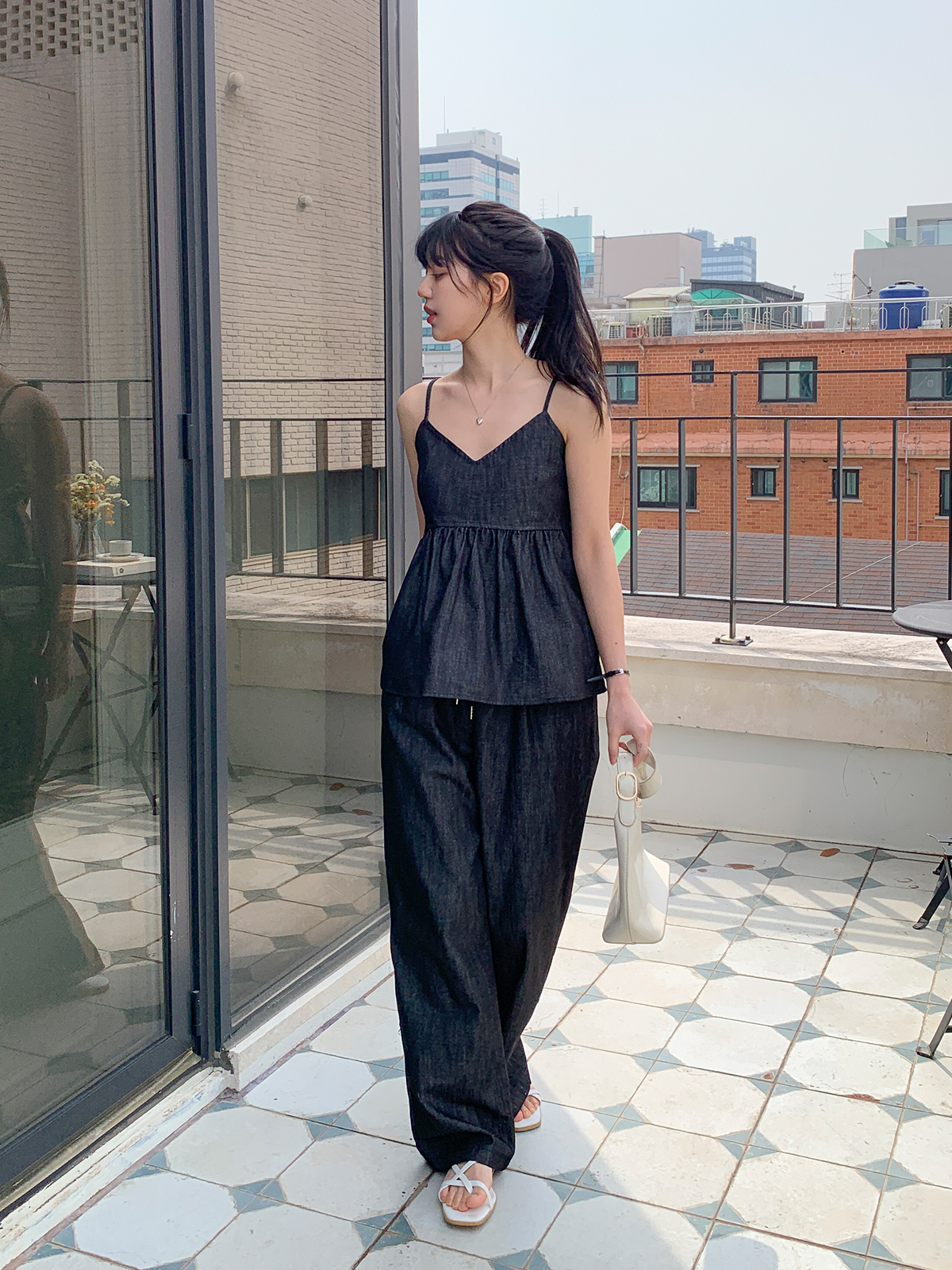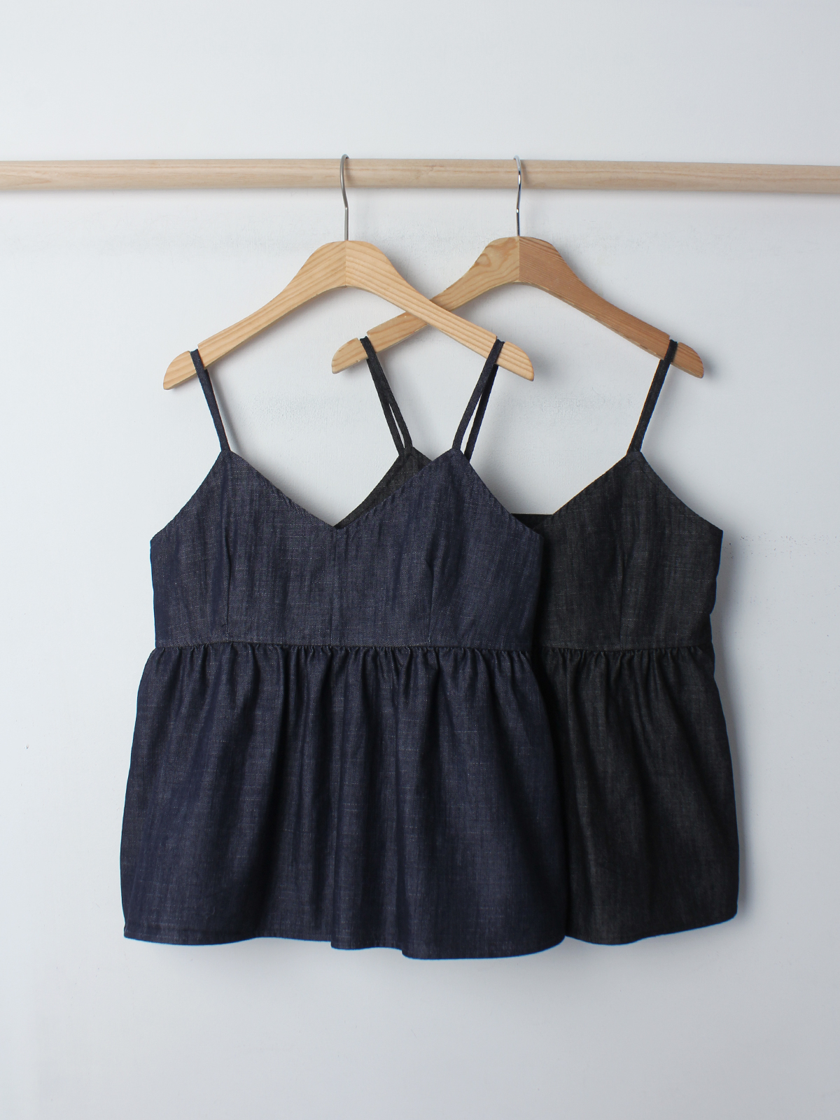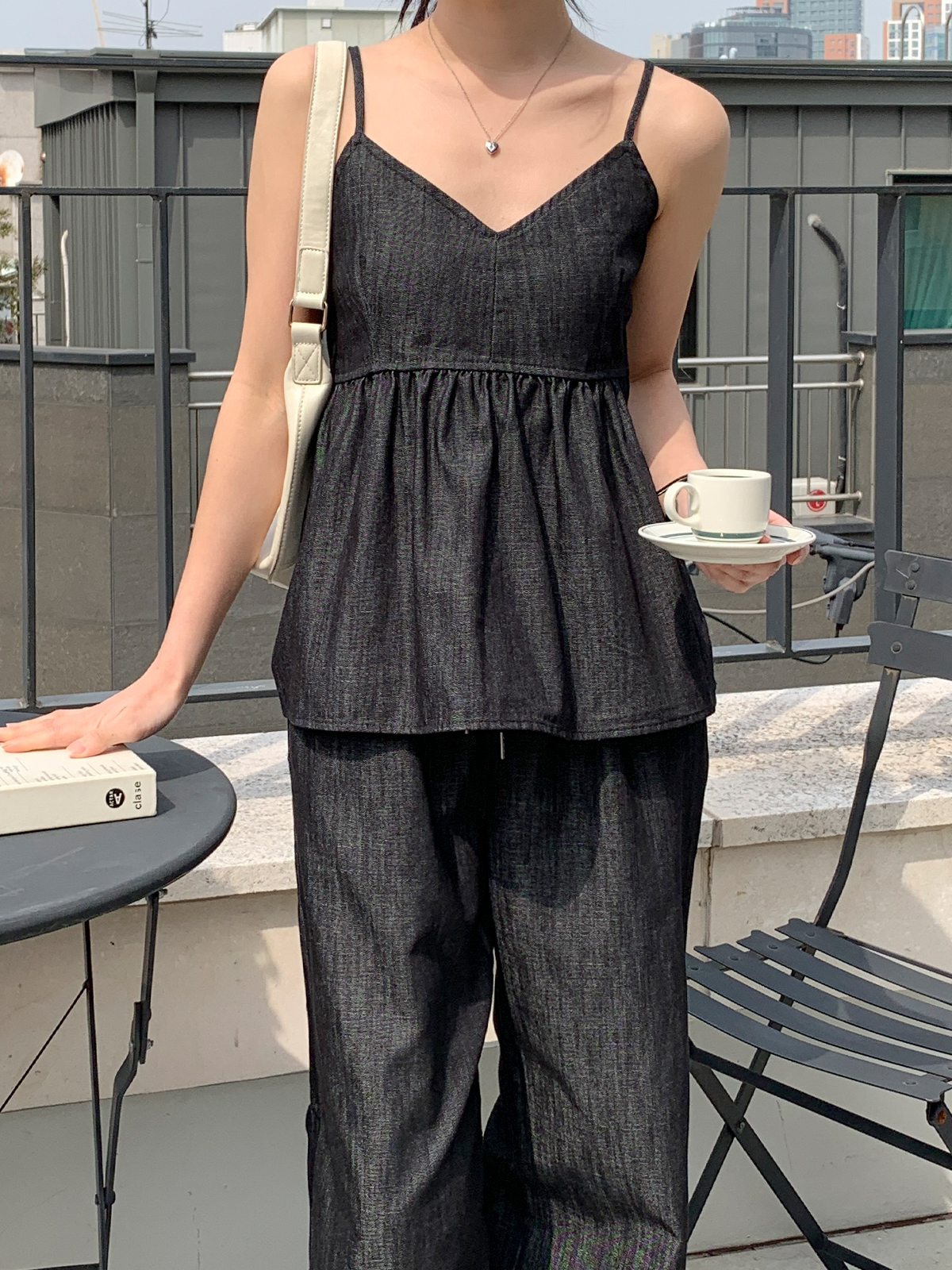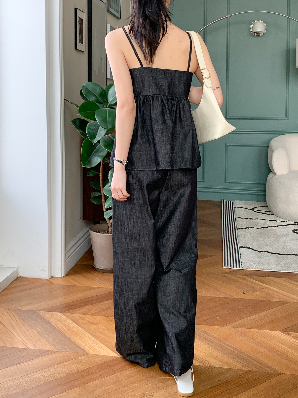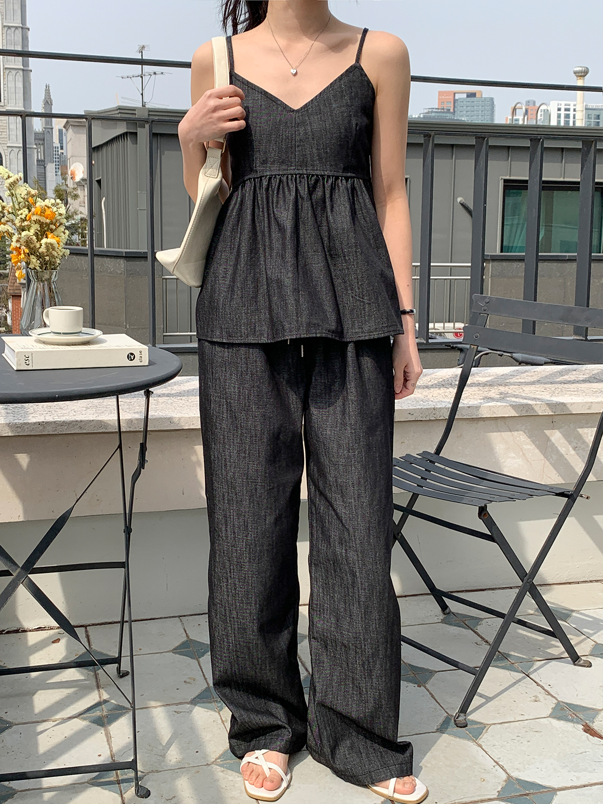 논페이드 데님 소재를 사용하여 이염걱정없이 입으실 수 있으며 페미닌한 캉캉 스타일의 민소매 끈나시