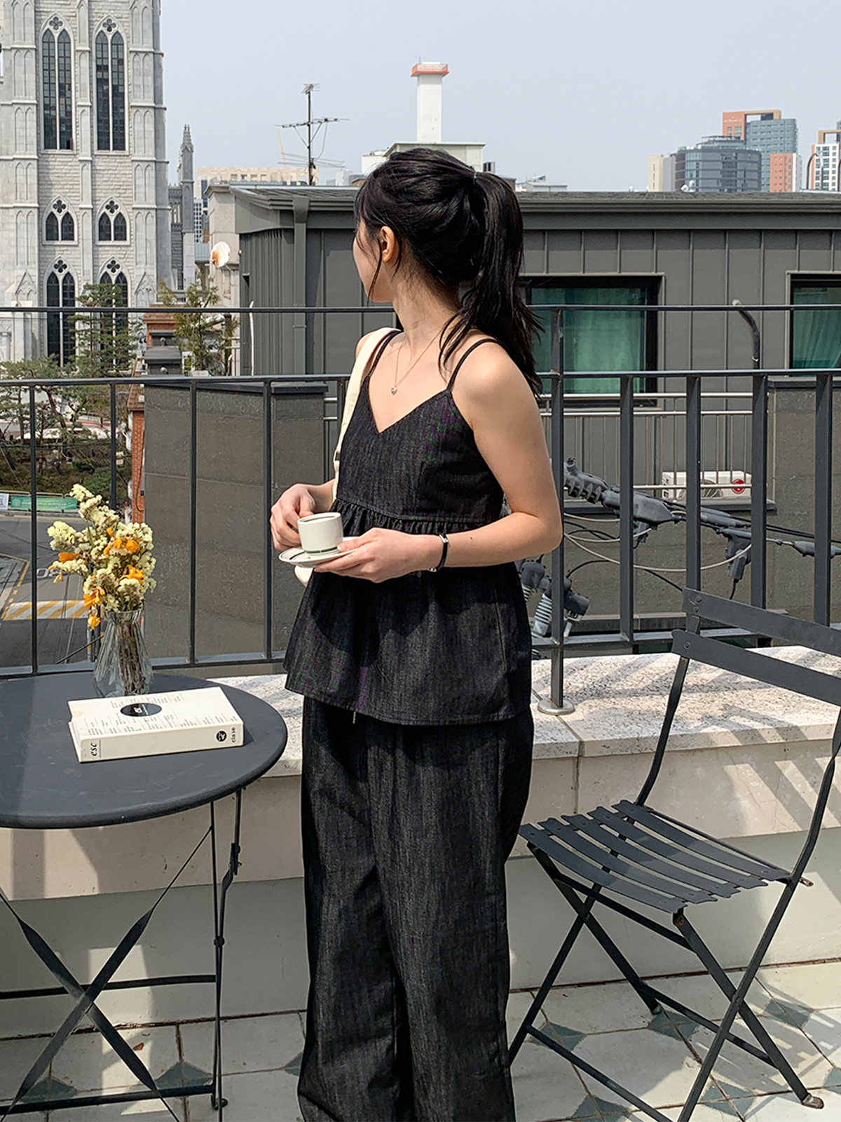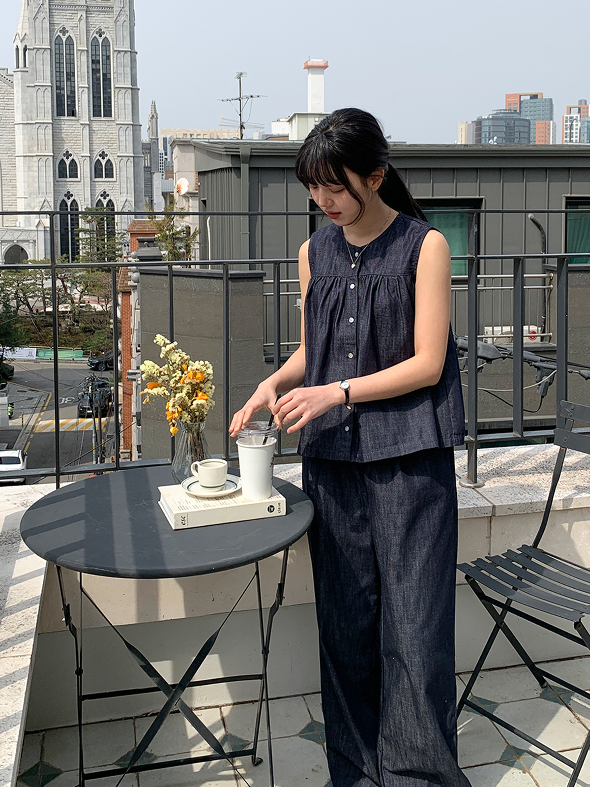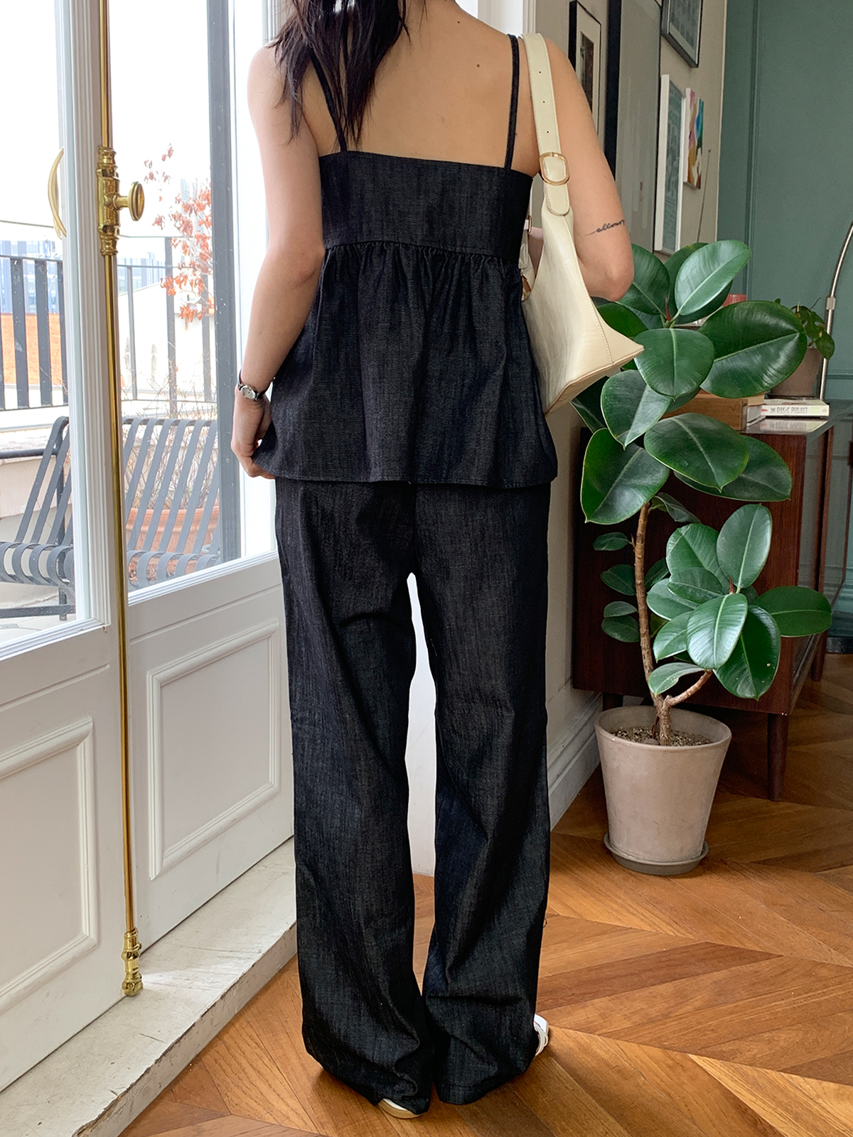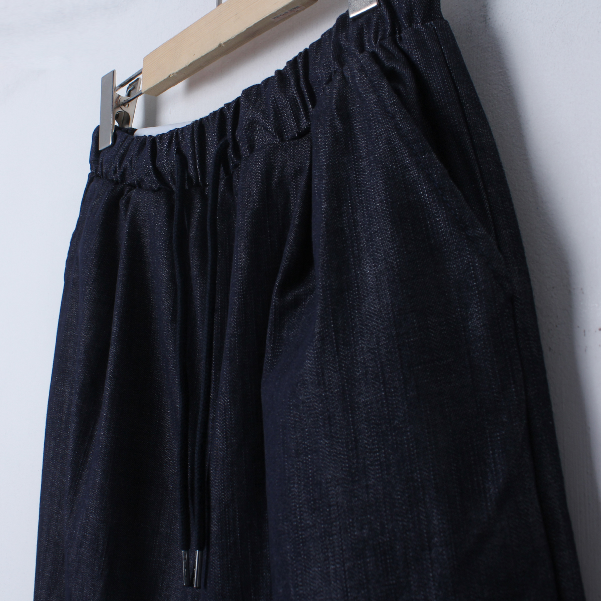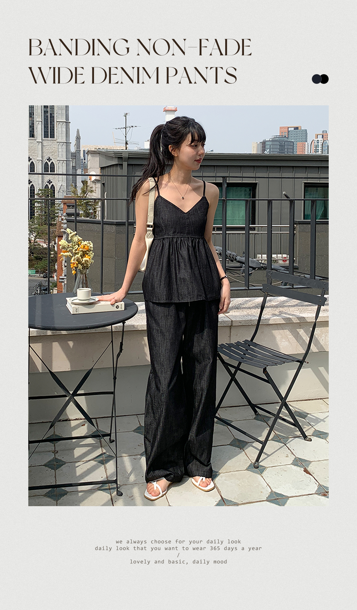 논페이드 데님 소재의 와이드한 핏감의 데님팬츠
