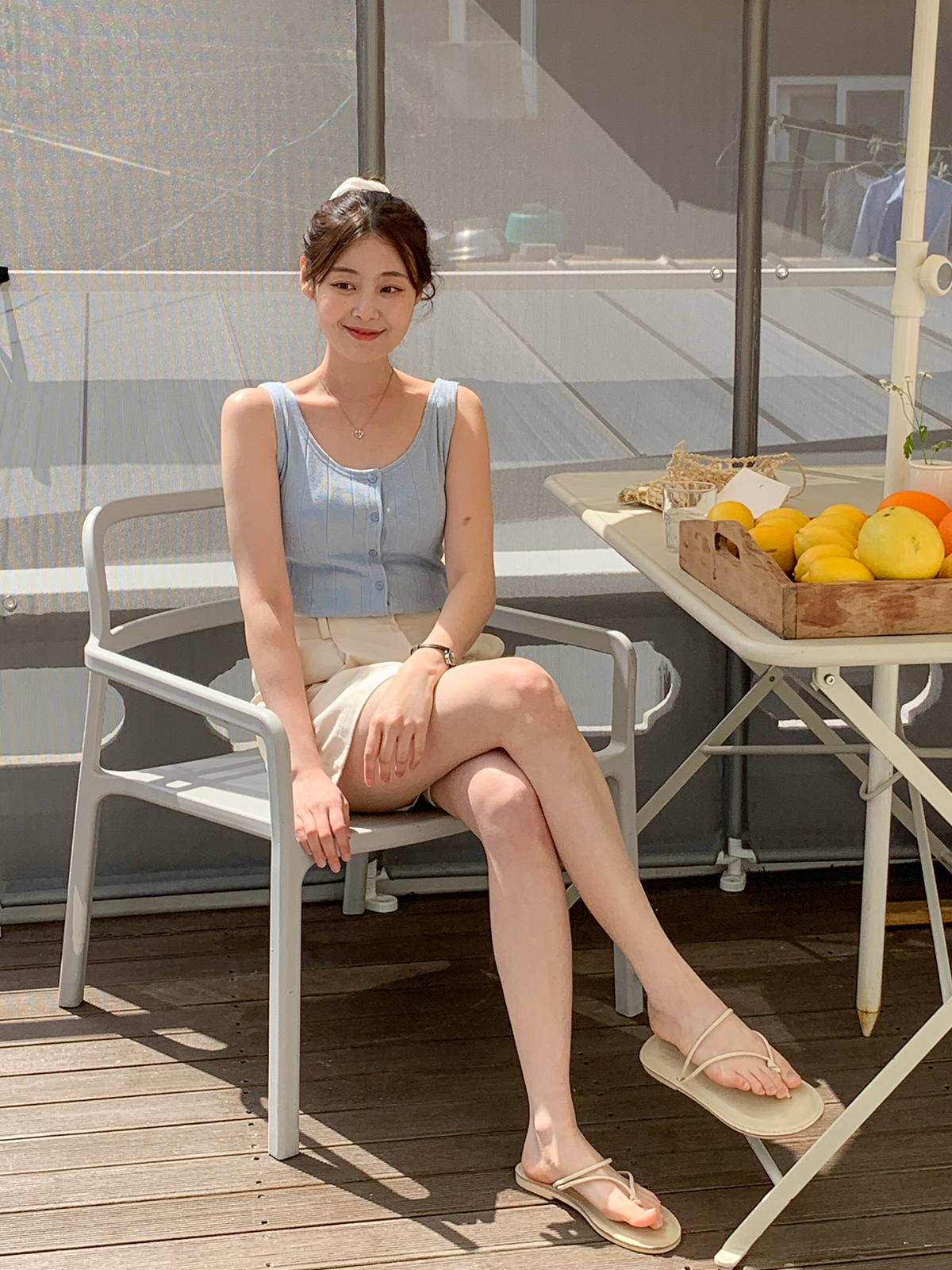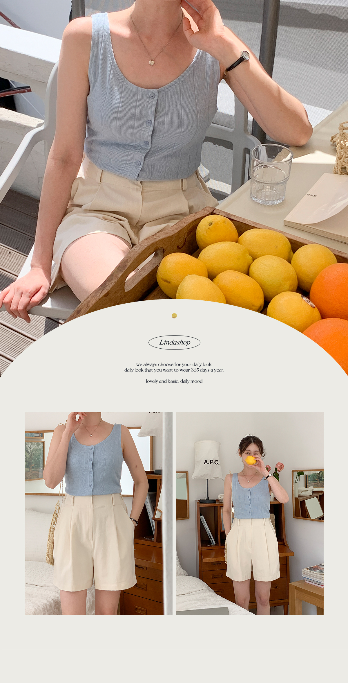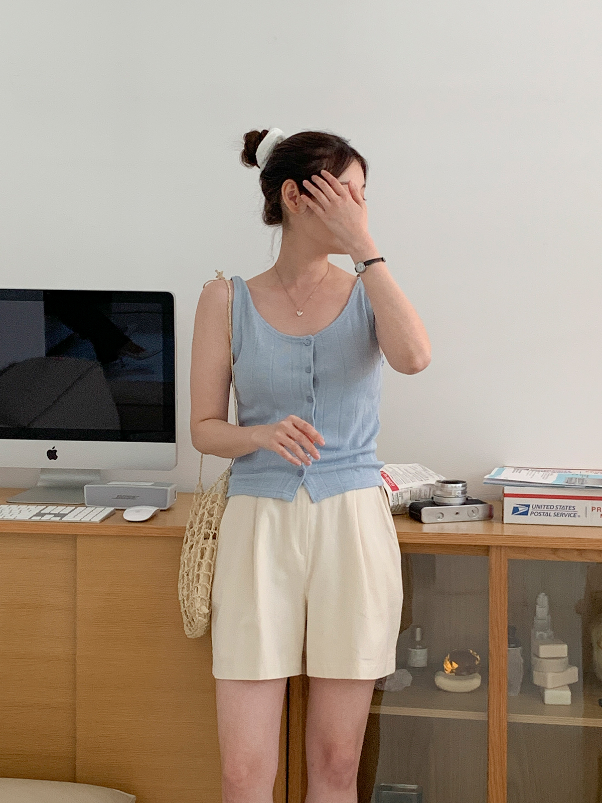라운드 넥라인으로 부담없이 입을 수 있고, 중앙에 세로 버튼으로 자유로운 연출이 가능해 데일리 민소매 가디건으로 추천해요!