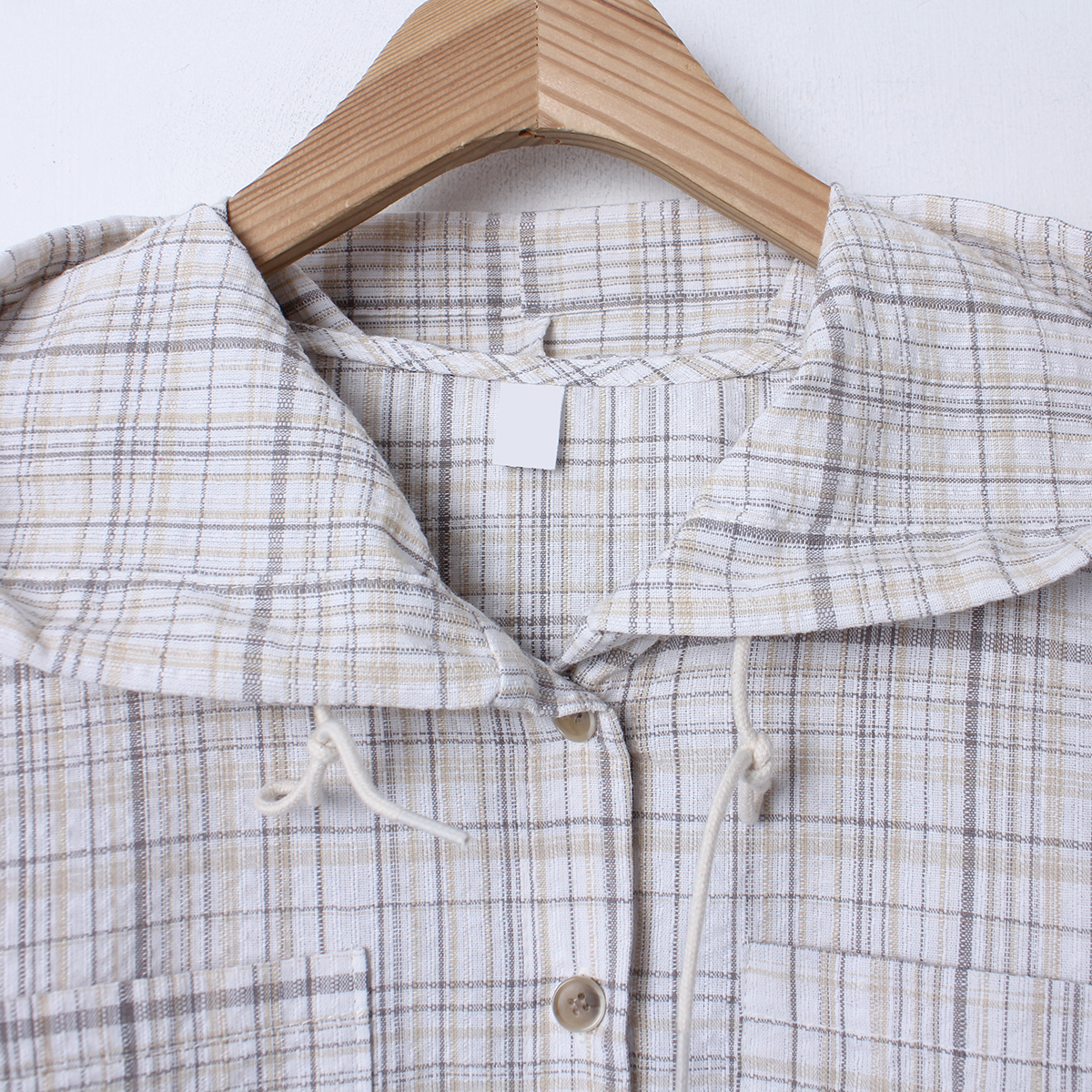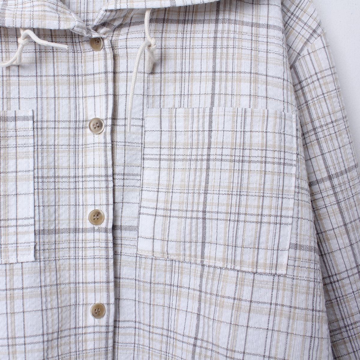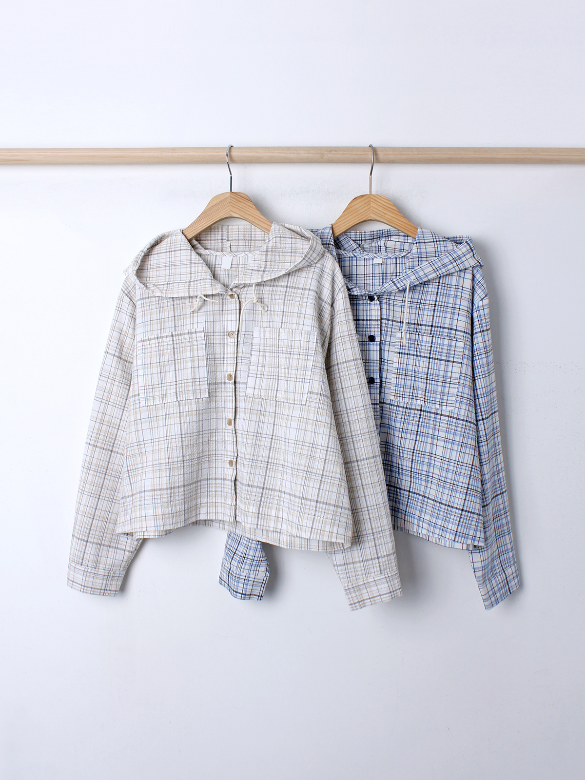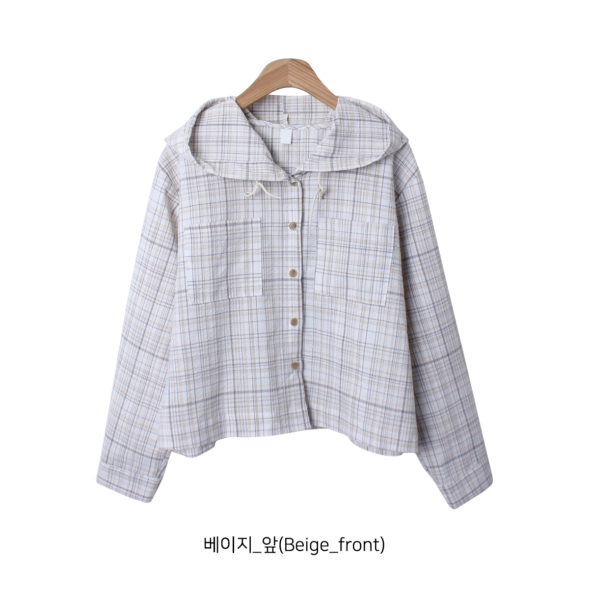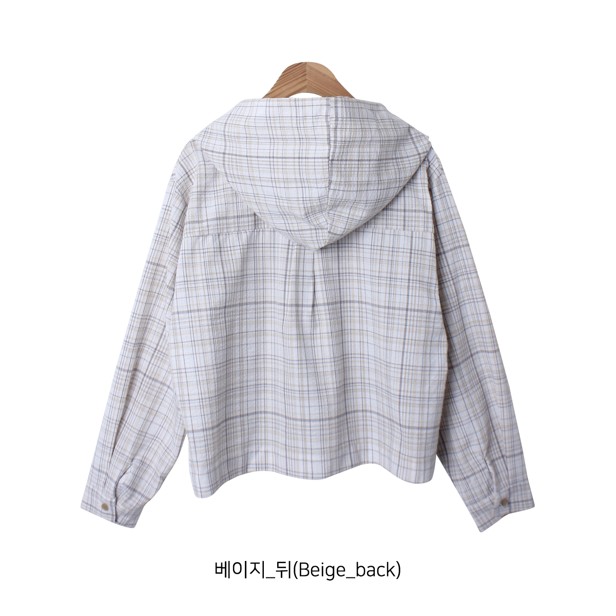 소프트한 컬러감의 체크 패턴의 오버핏 후드 남방