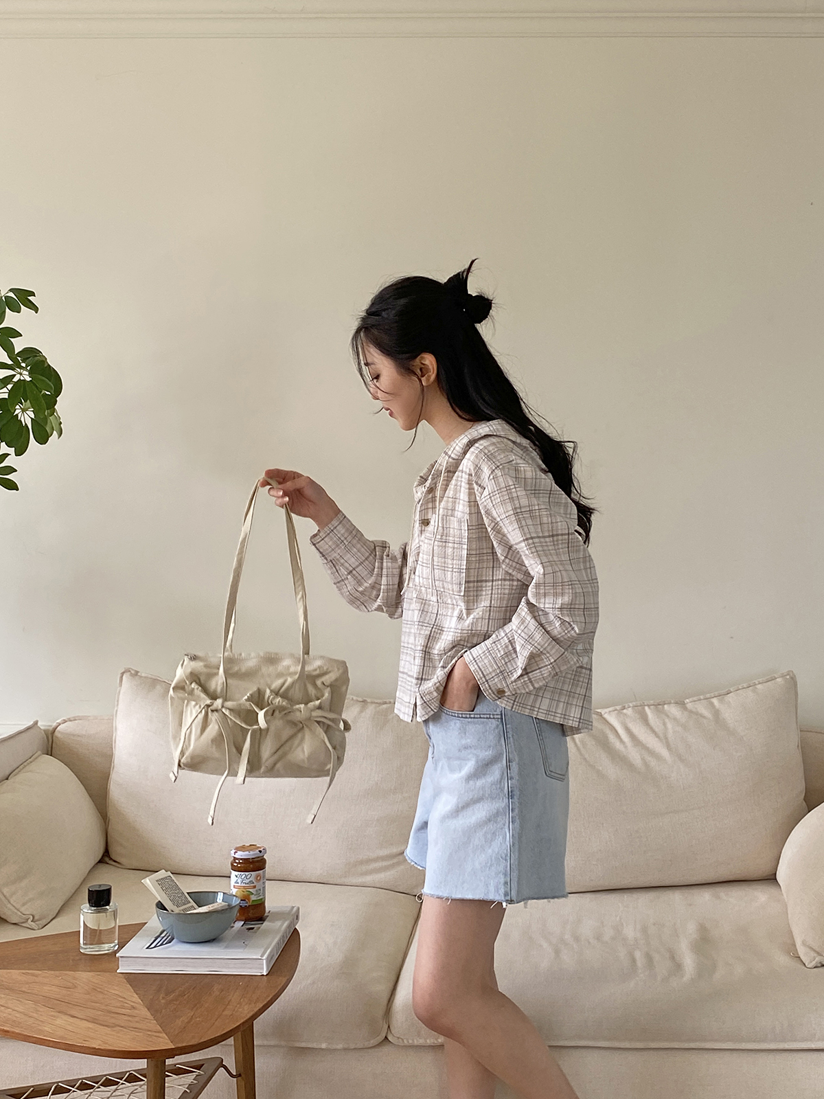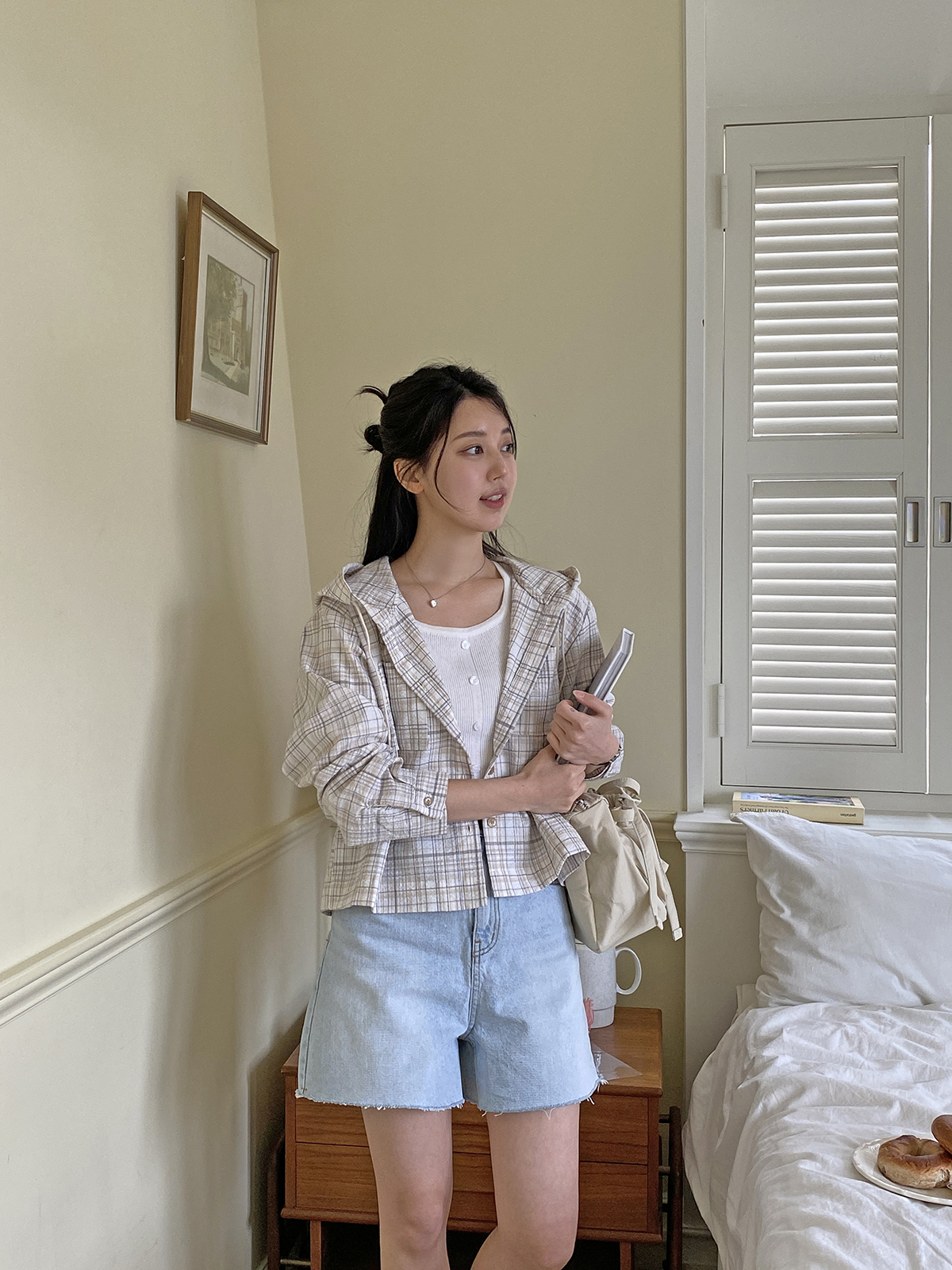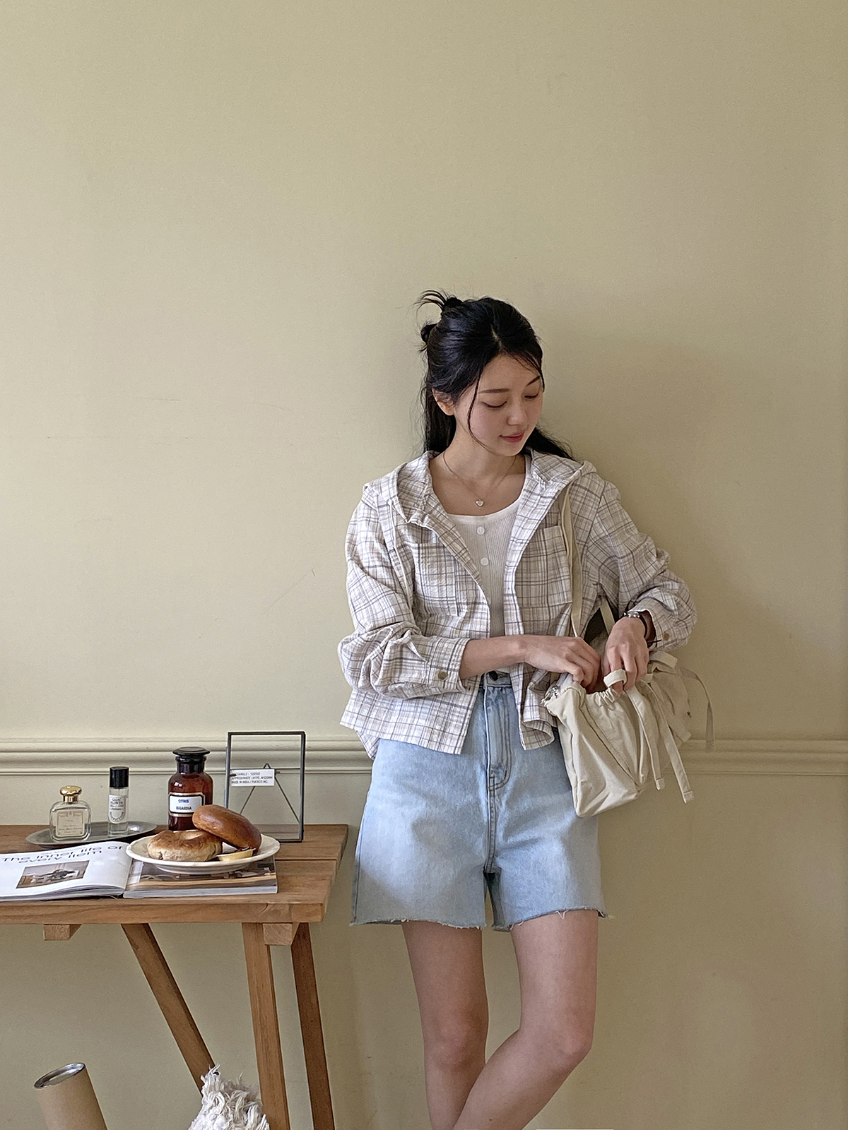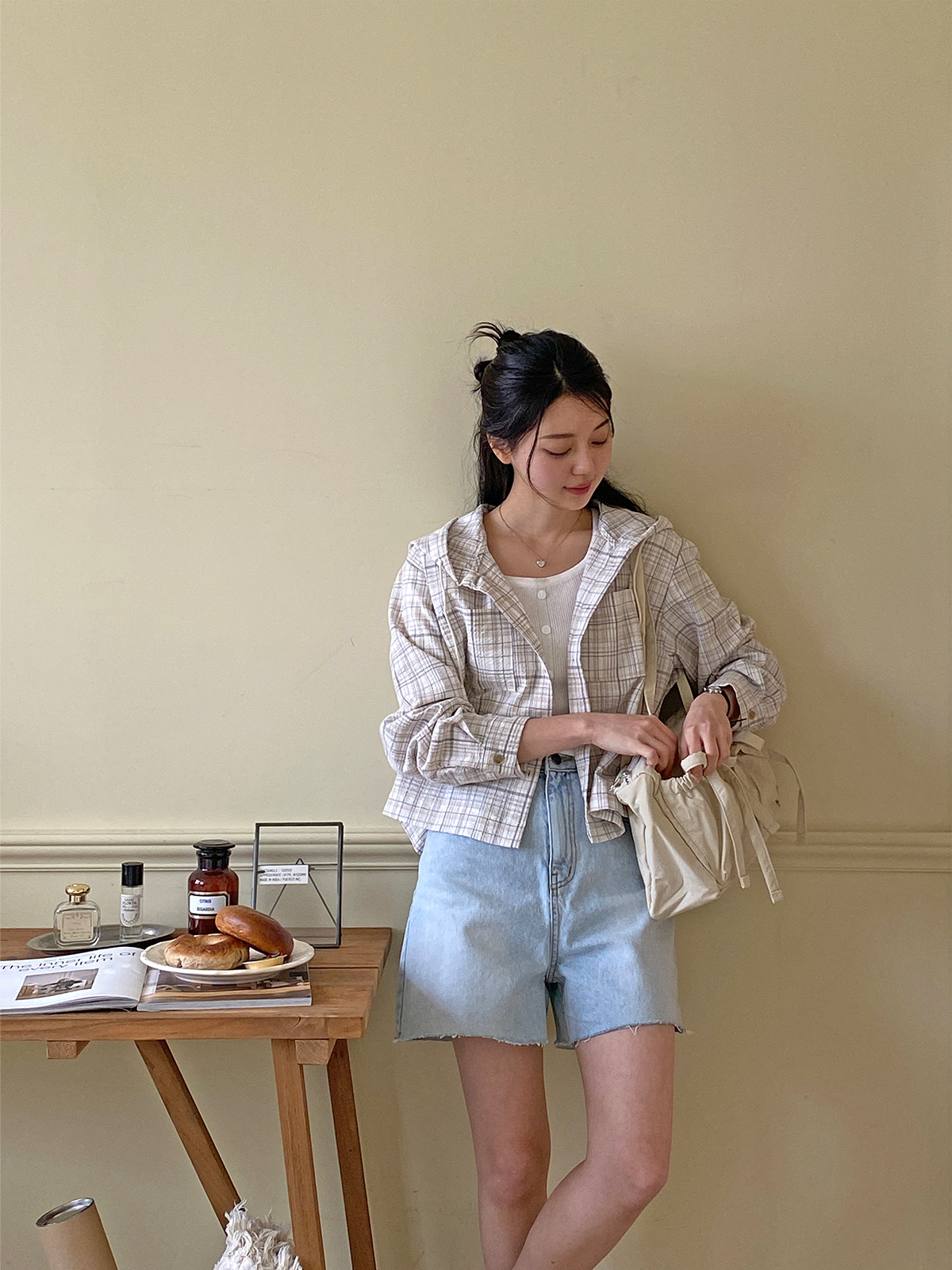 소프트한 컬러감의 체크 패턴의 오버핏 후드 남방