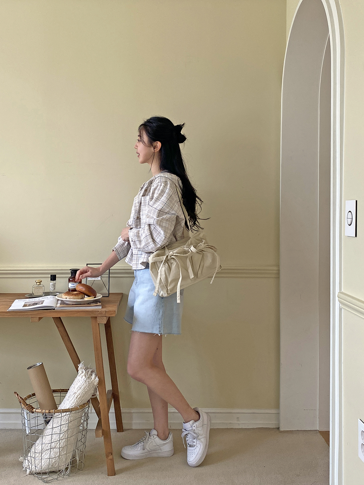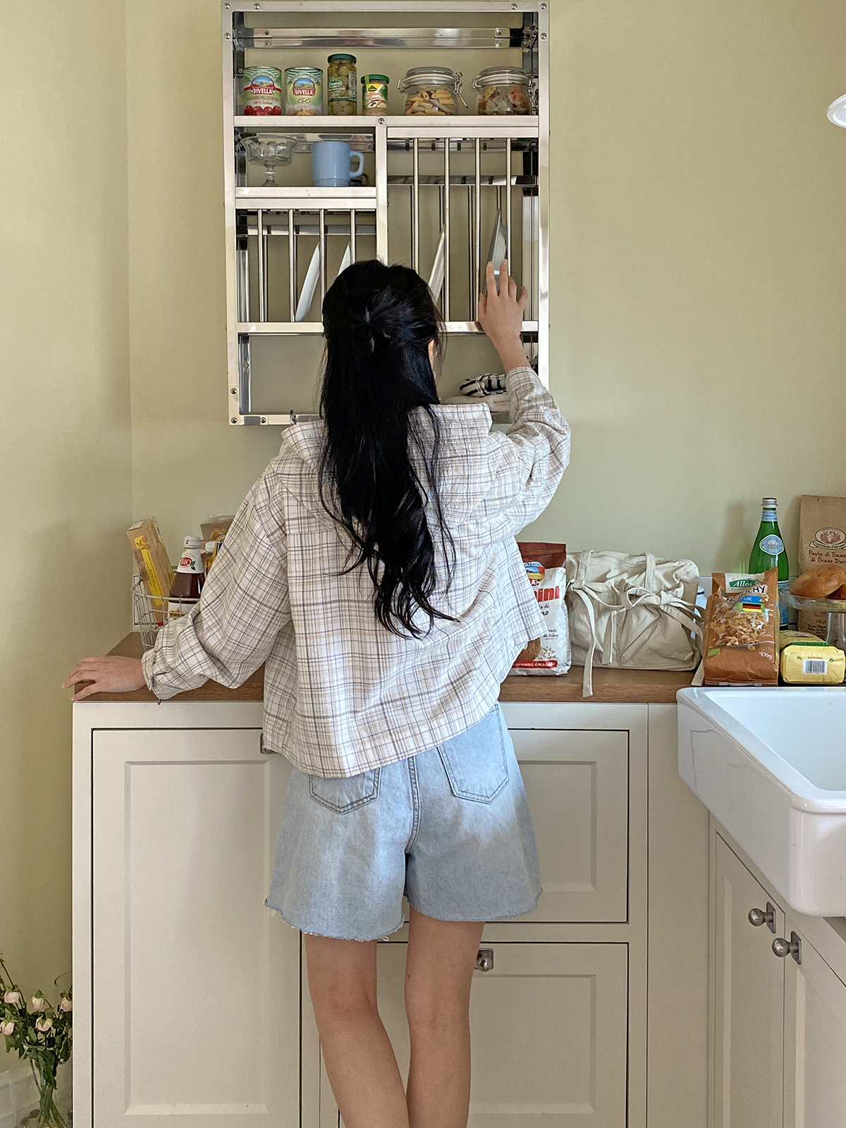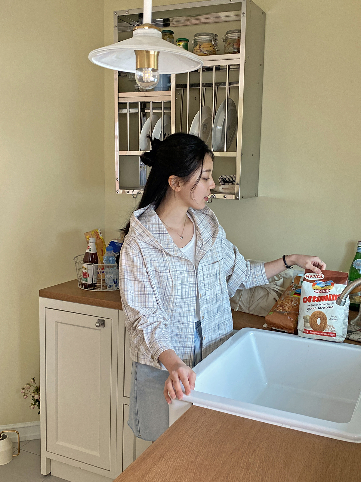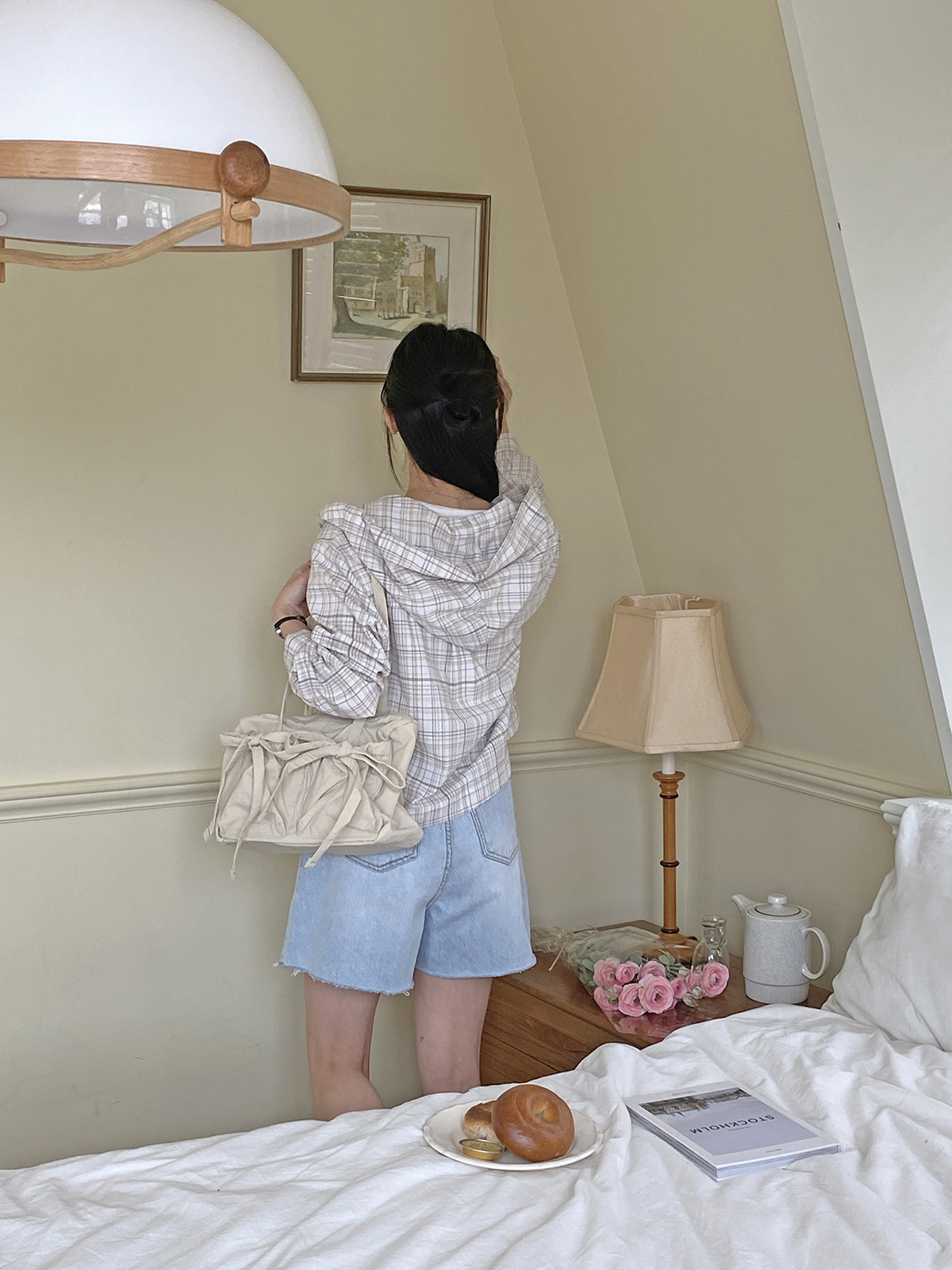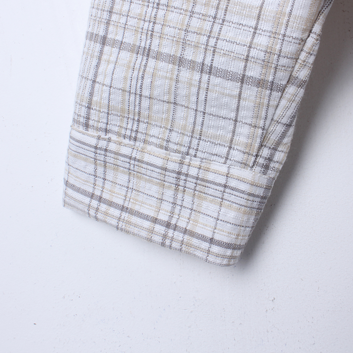 소프트한 컬러감의 체크 패턴의 오버핏 후드 남방