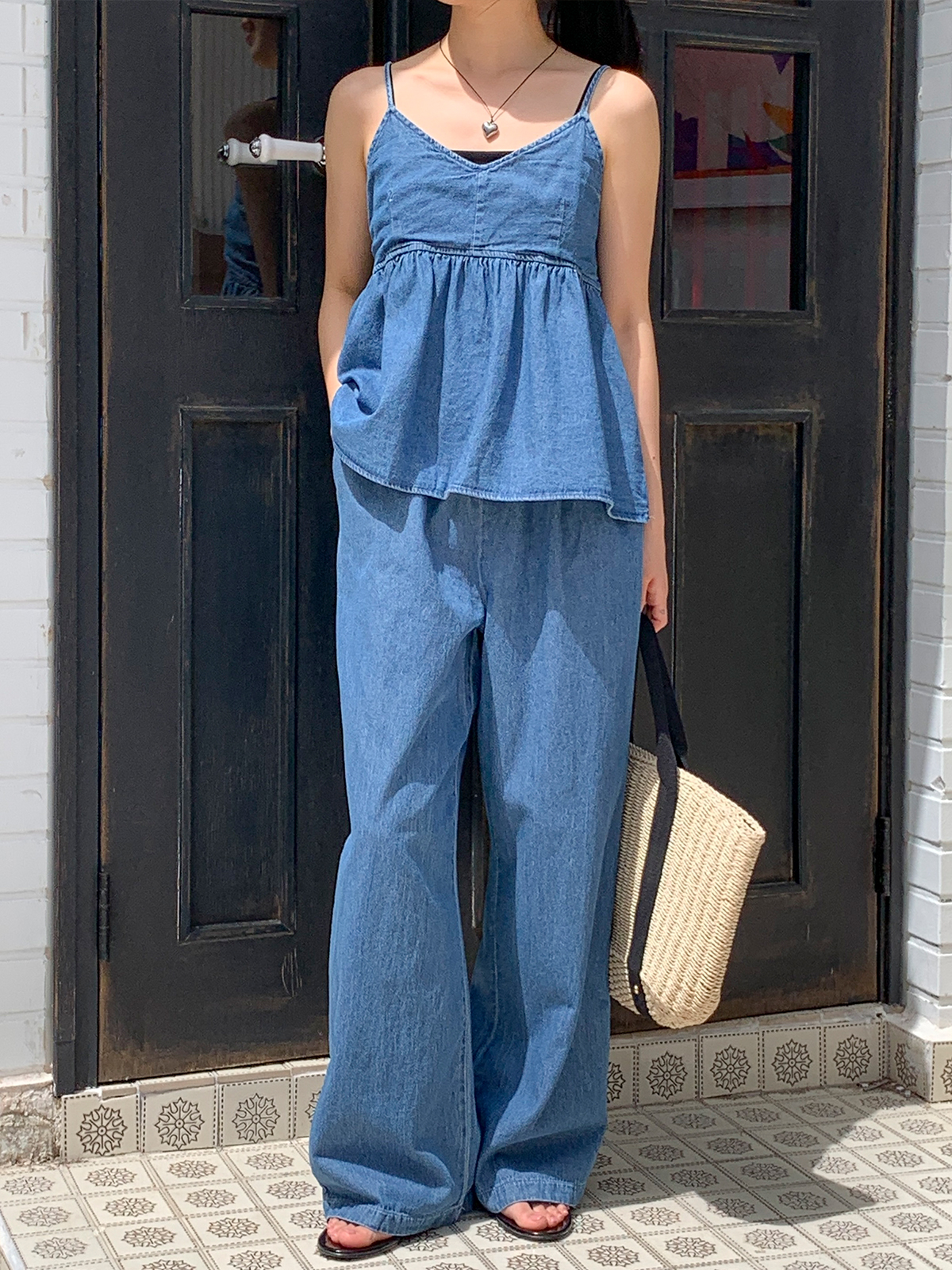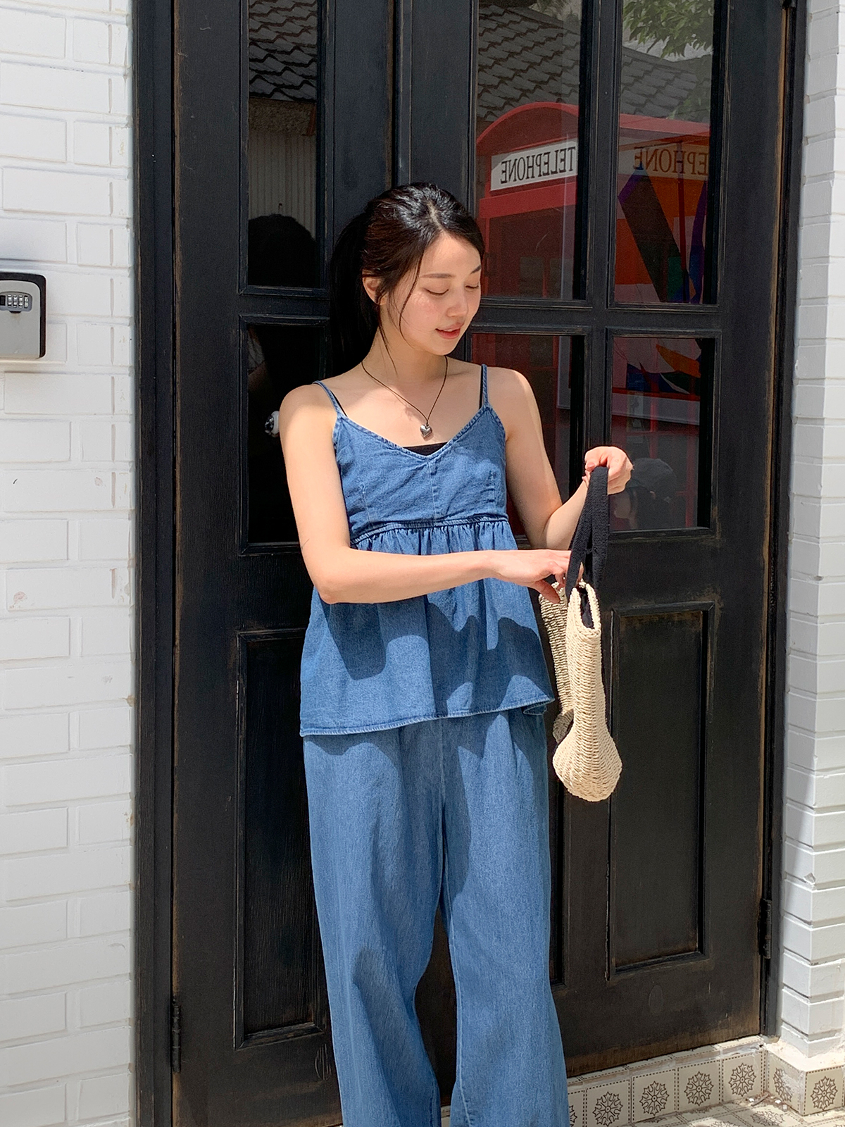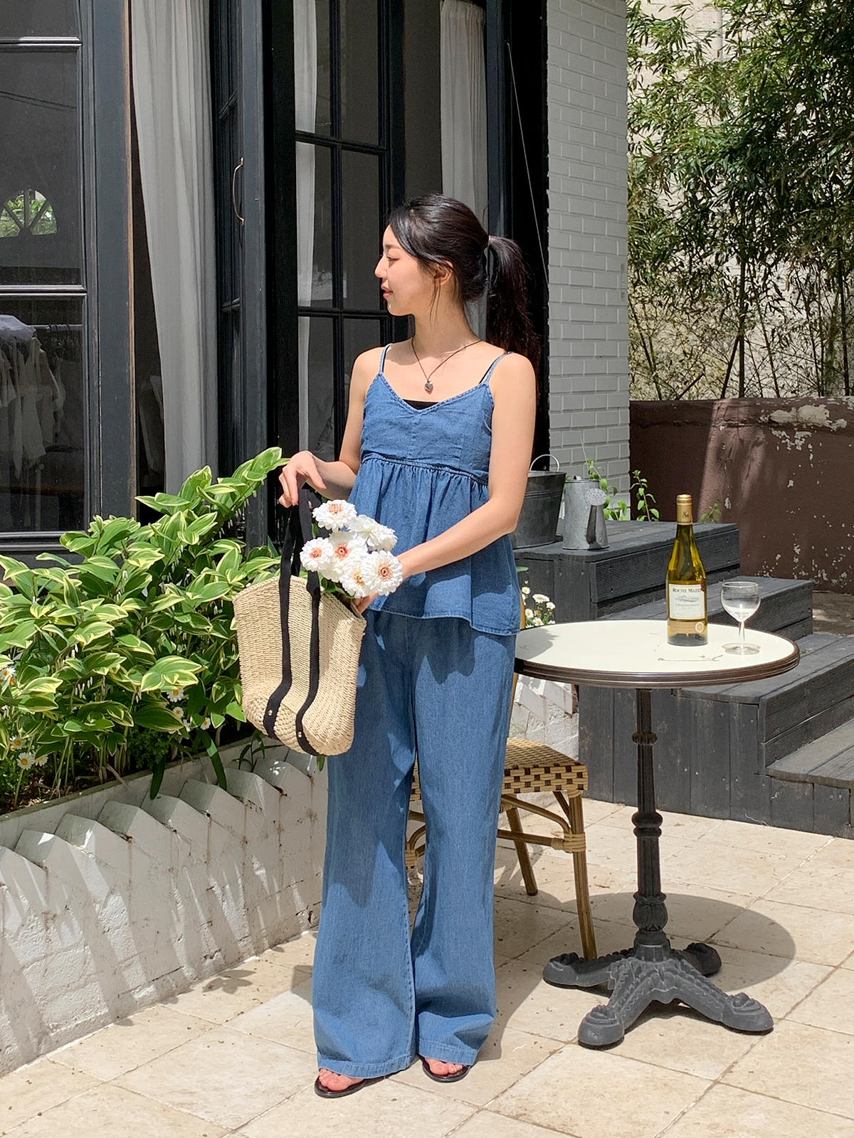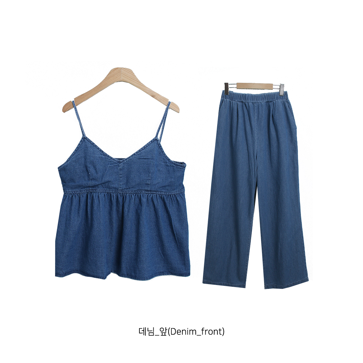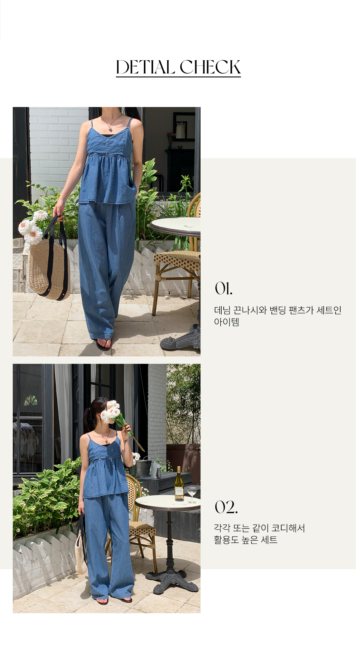 데님 끈나시와 밴딩 팬츠가 세트인 상품으로 각 아이템 각각 다른 코디에 활용해도 좋고, 셋업으로 입어도 코디가 한번에 완성되어 활용도가 좋은 세트 상품
