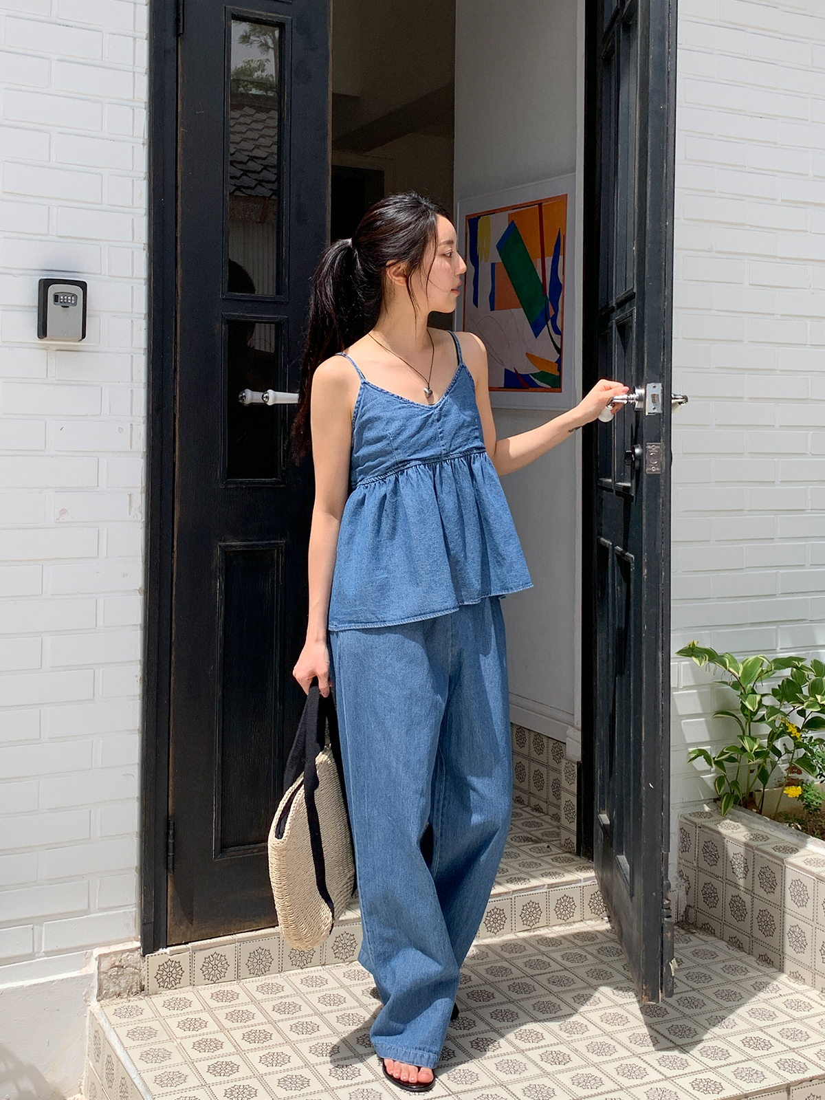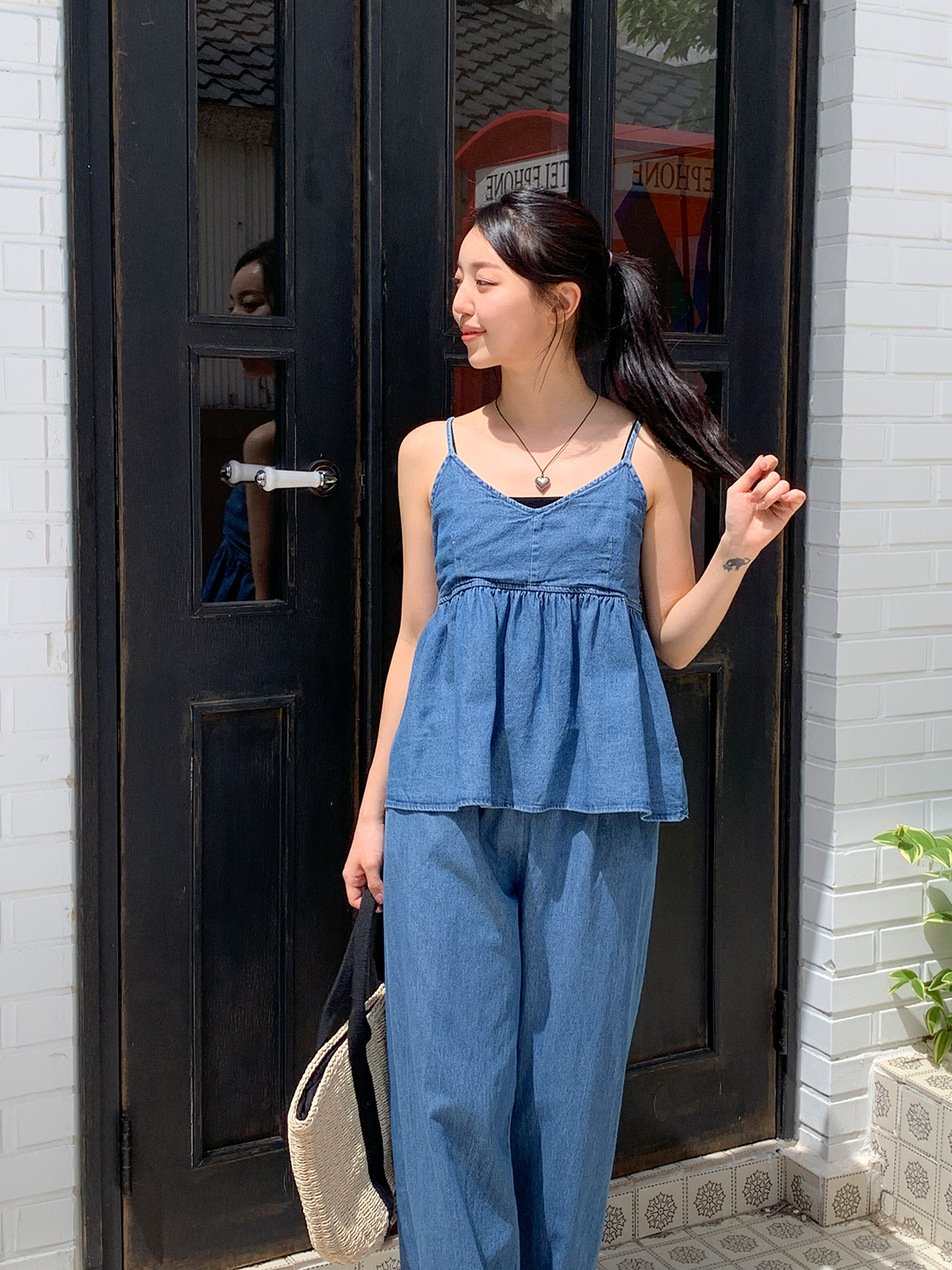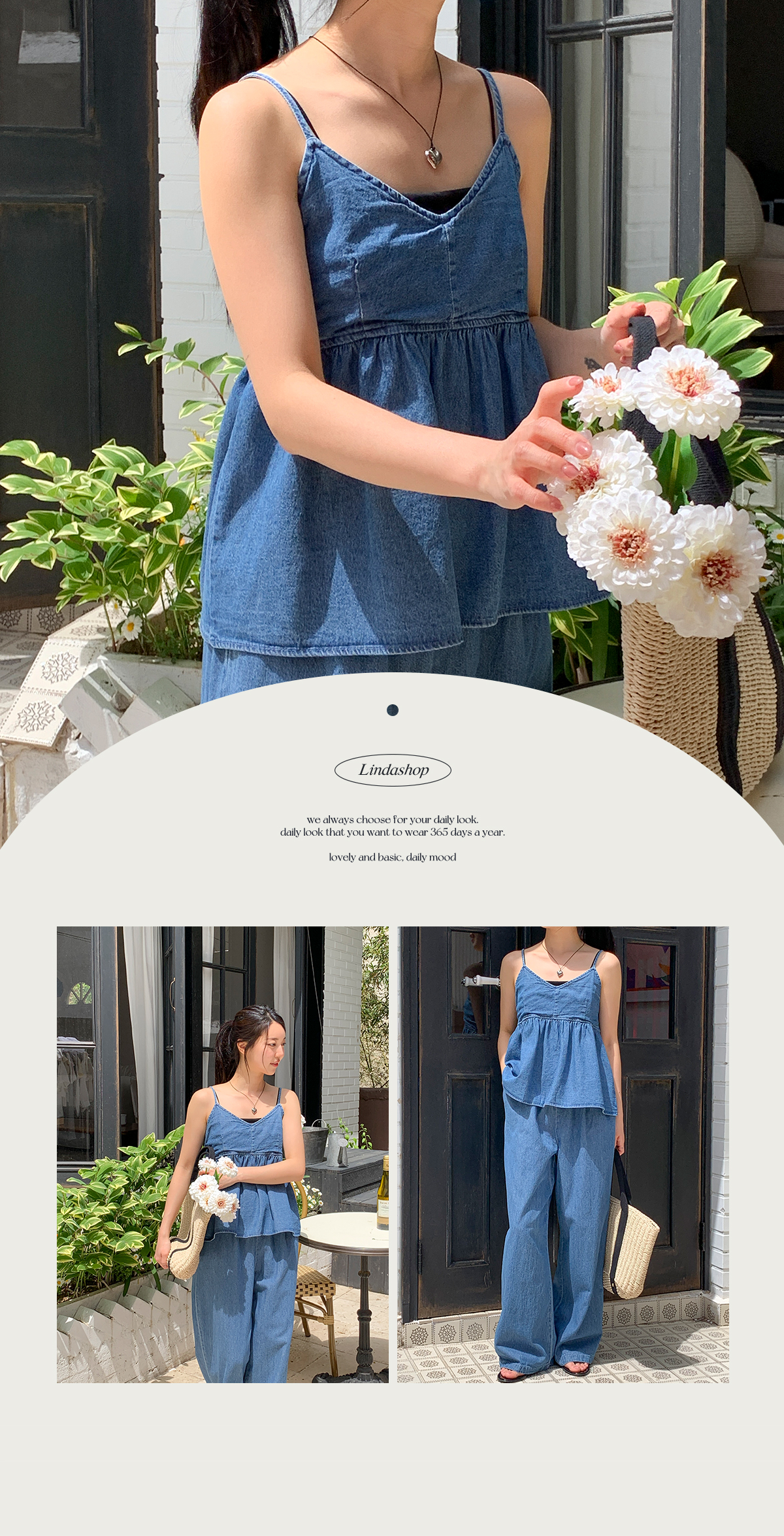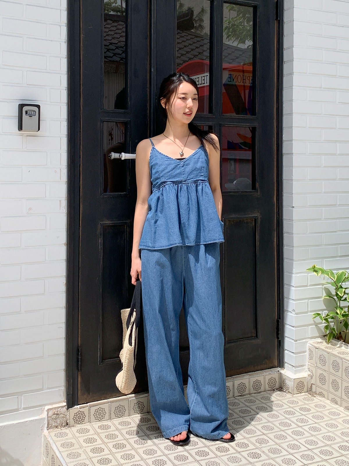 데님 끈나시와 밴딩 팬츠가 세트인 상품으로 각 아이템 각각 다른 코디에 활용해도 좋고, 셋업으로 입어도 코디가 한번에 완성되어 활용도가 좋은 세트 상품