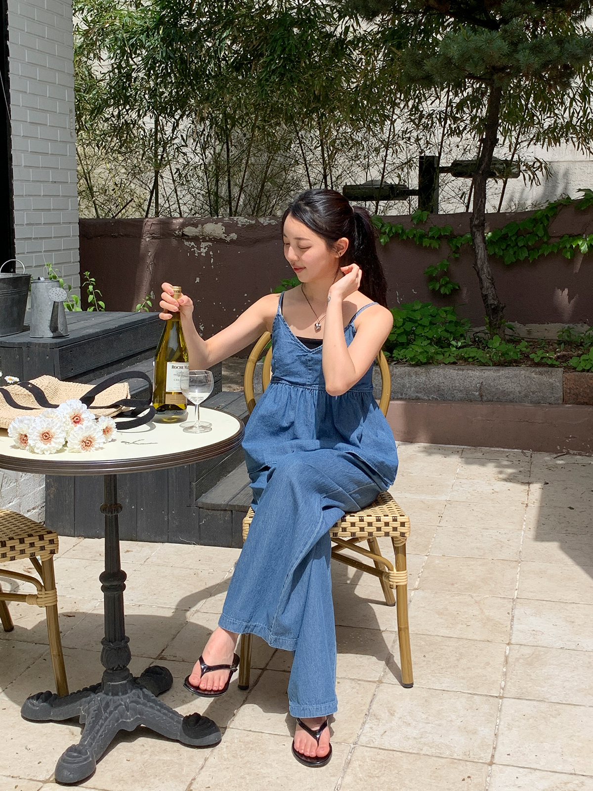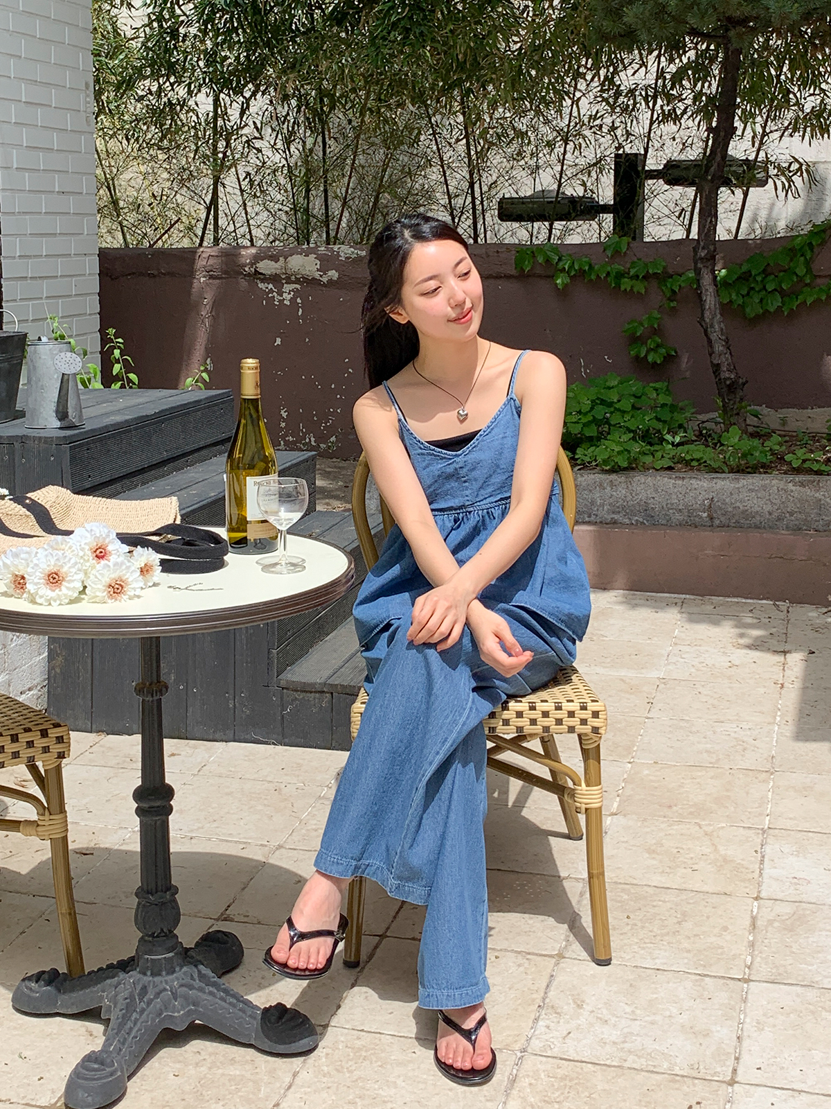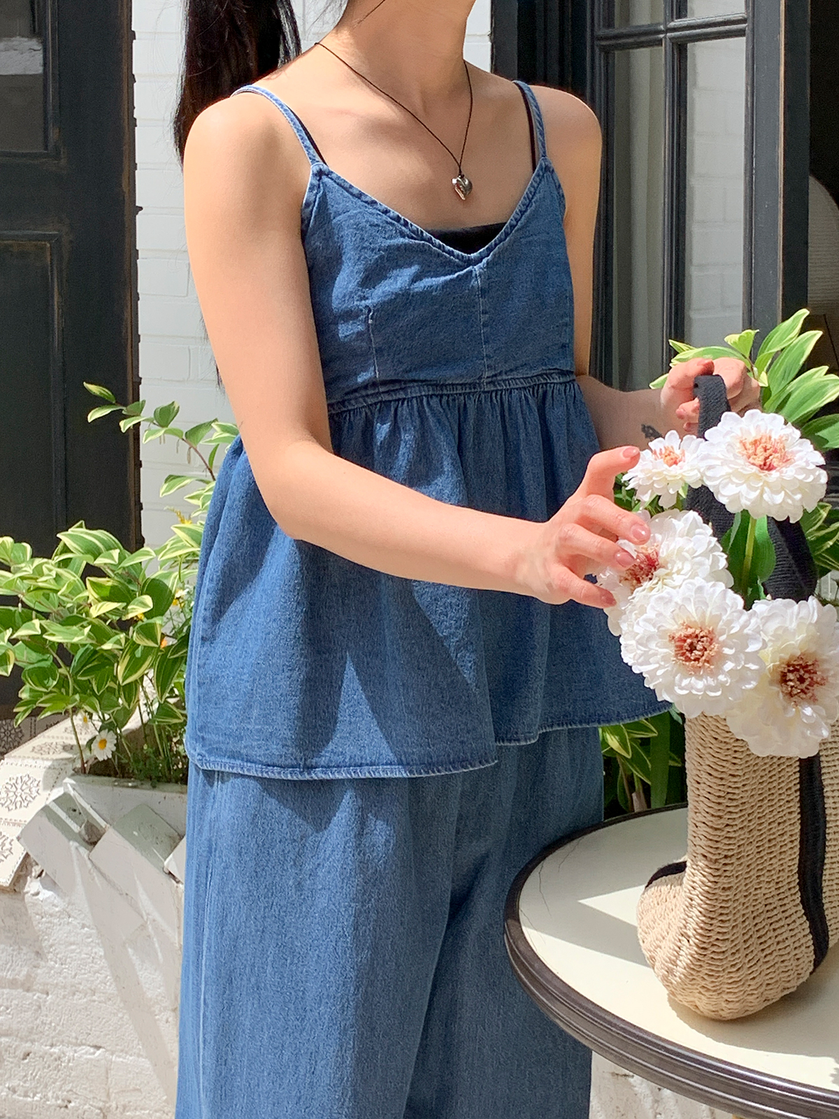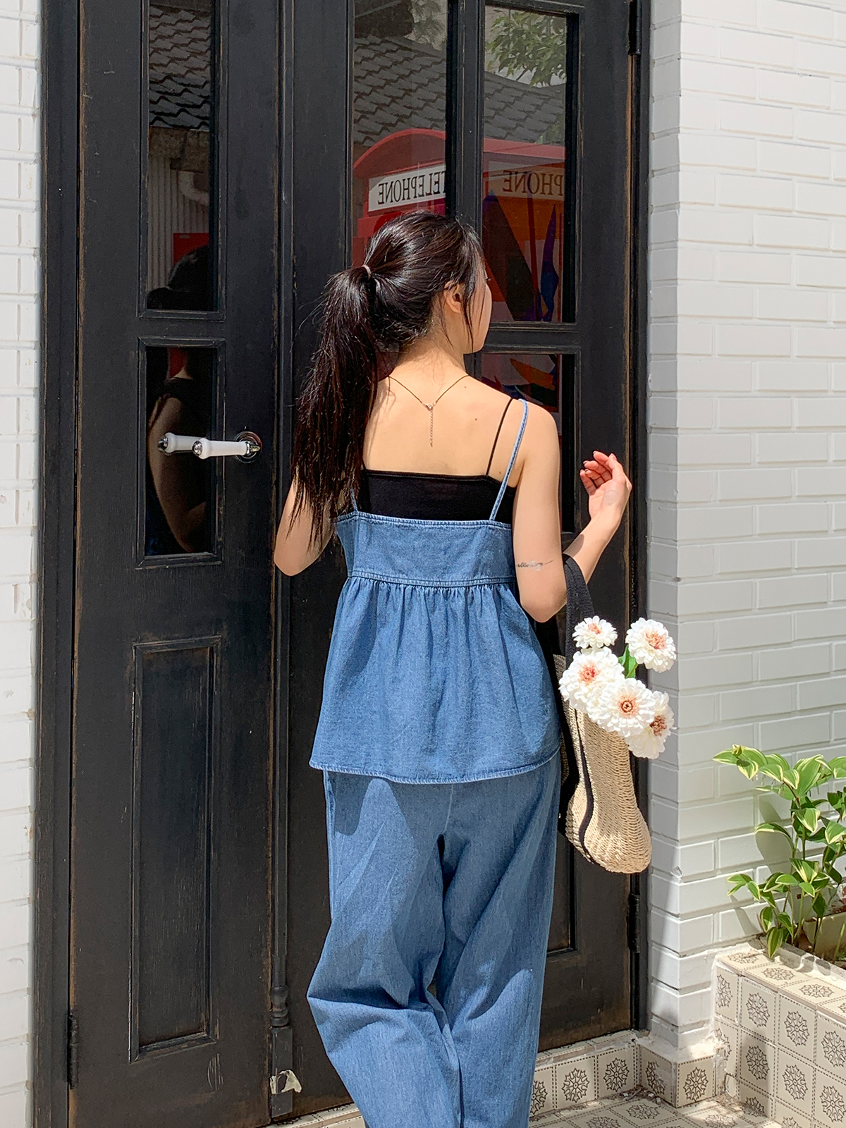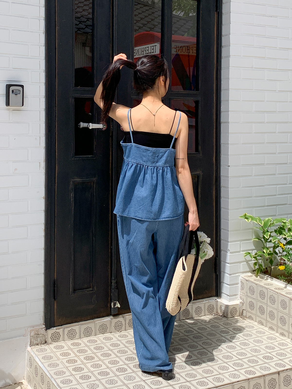 데님 끈나시와 밴딩 팬츠가 세트인 상품으로 각 아이템 각각 다른 코디에 활용해도 좋고, 셋업으로 입어도 코디가 한번에 완성되어 활용도가 좋은 세트 상품