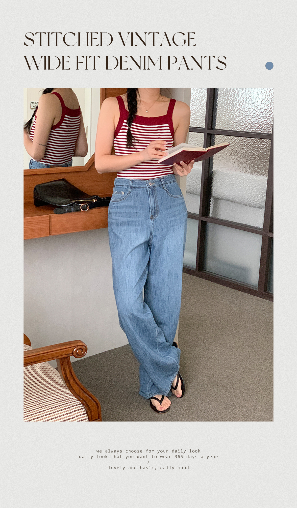 스티치 디테일과 워싱 디테일이 더욱 포인트를 주며 일자 와이드핏으로 어떤 아이템과 매치해도 잘 어울리는 데님 팬츠