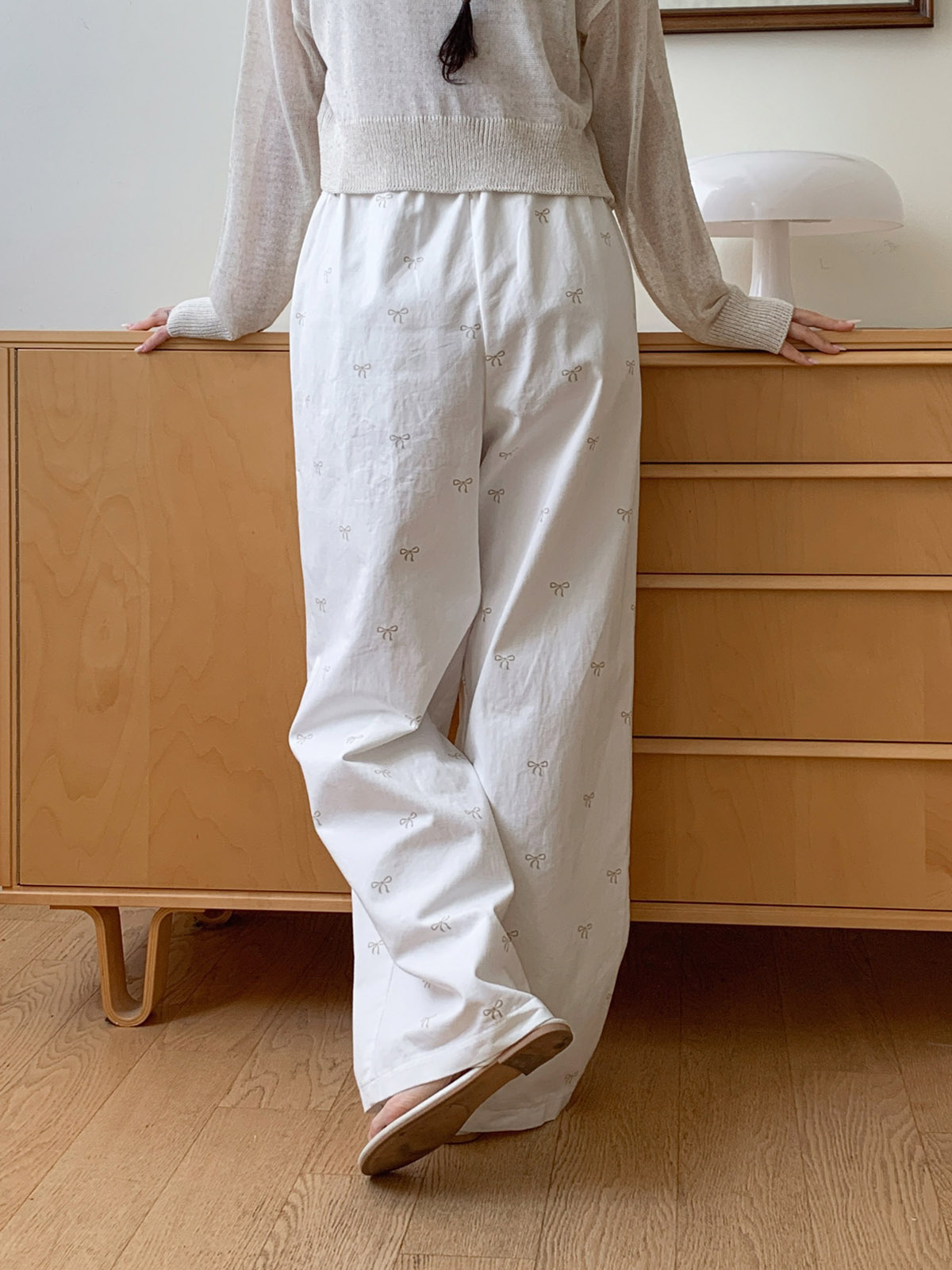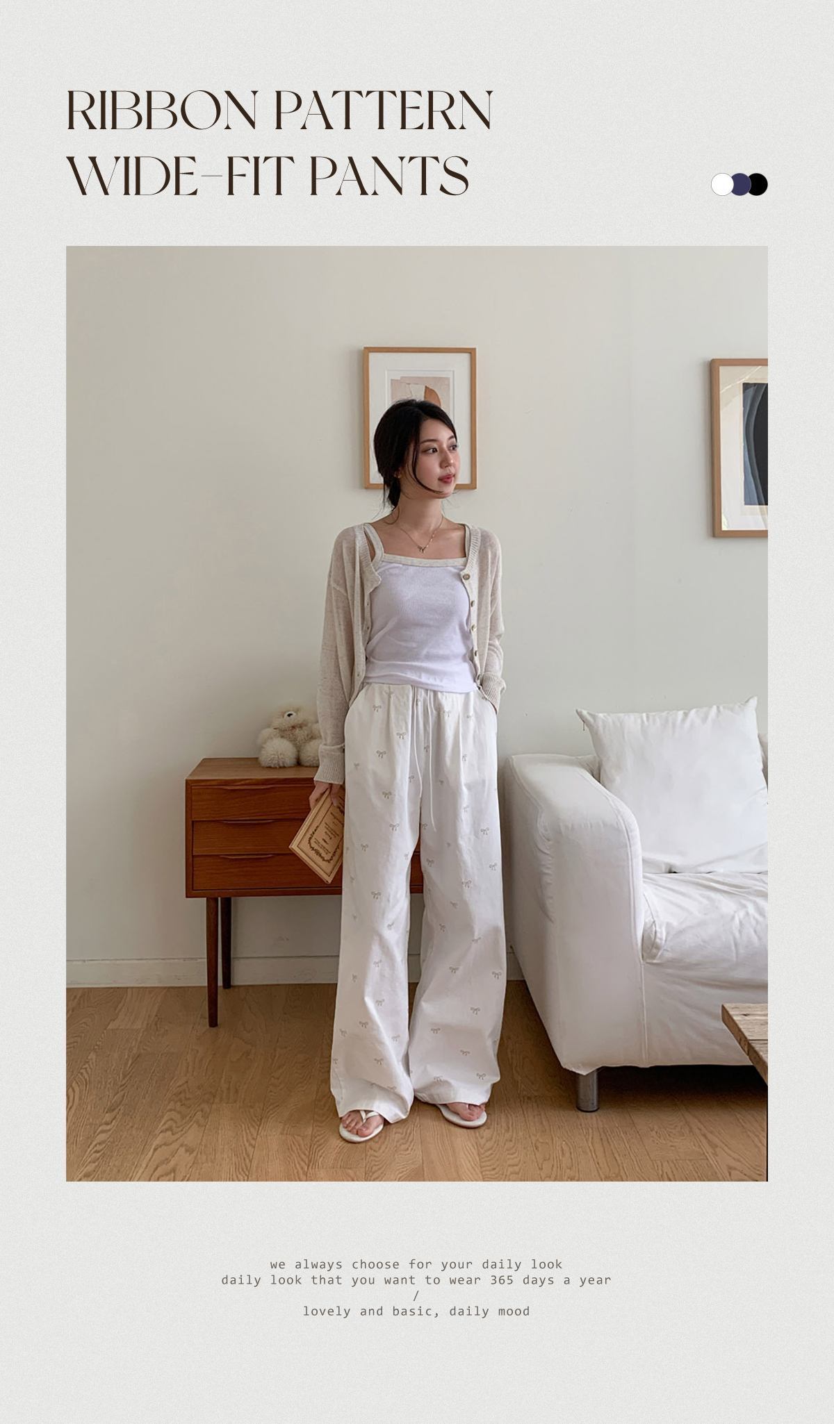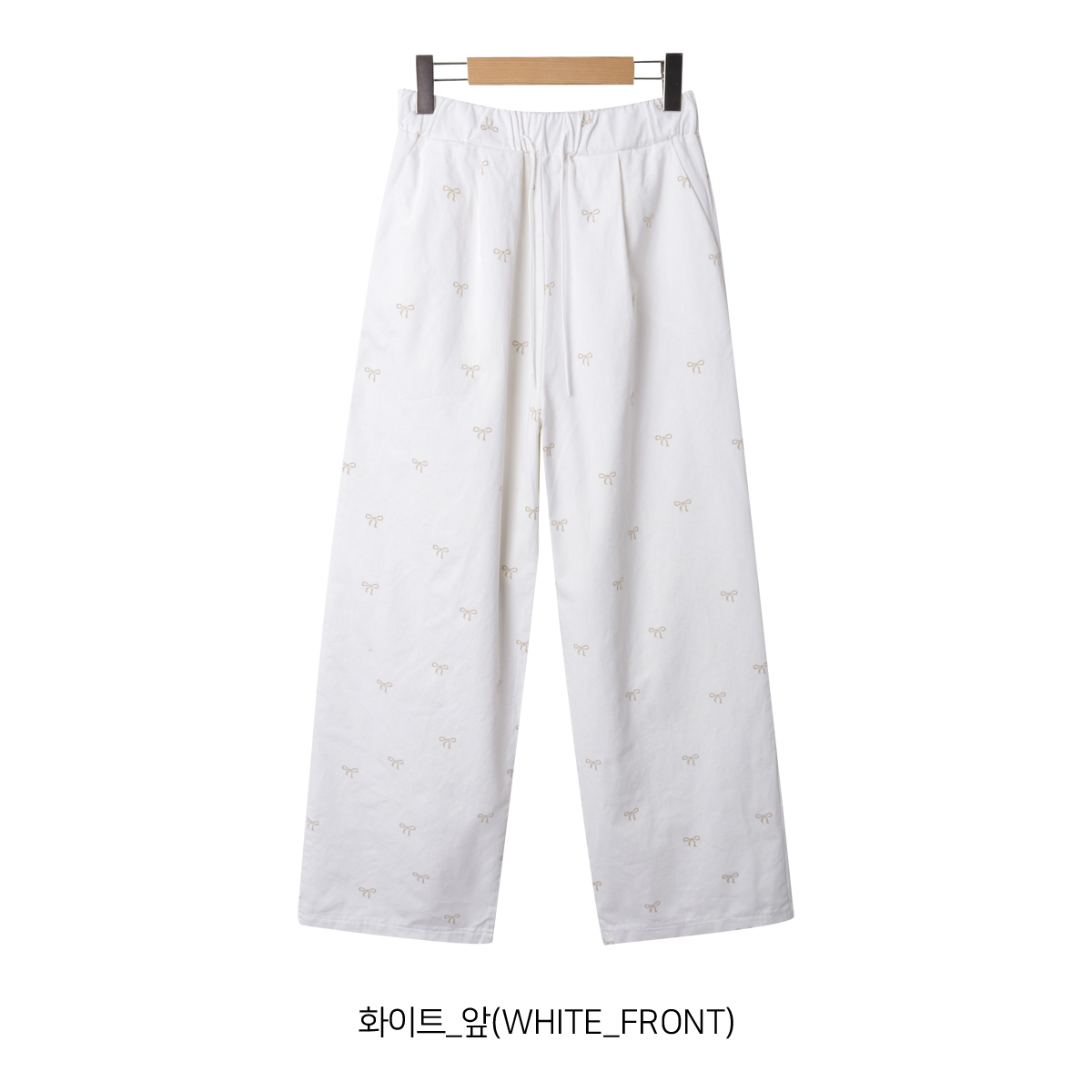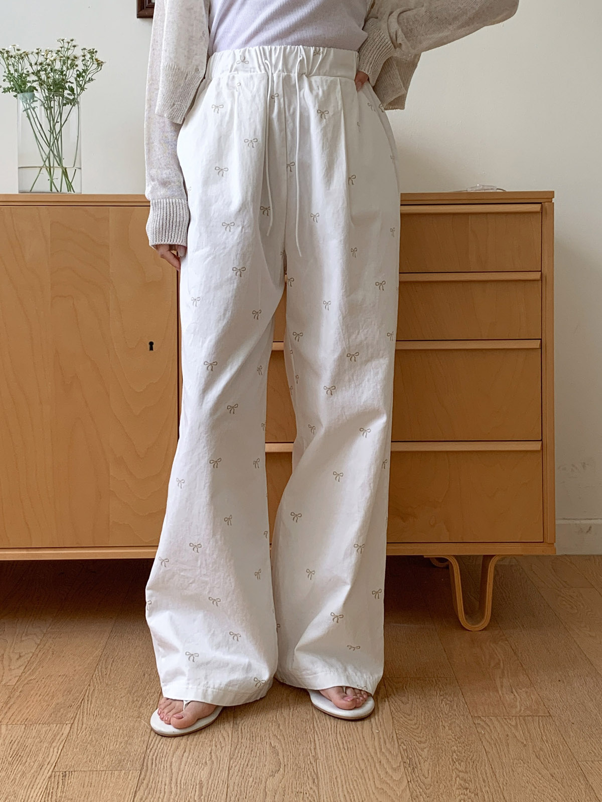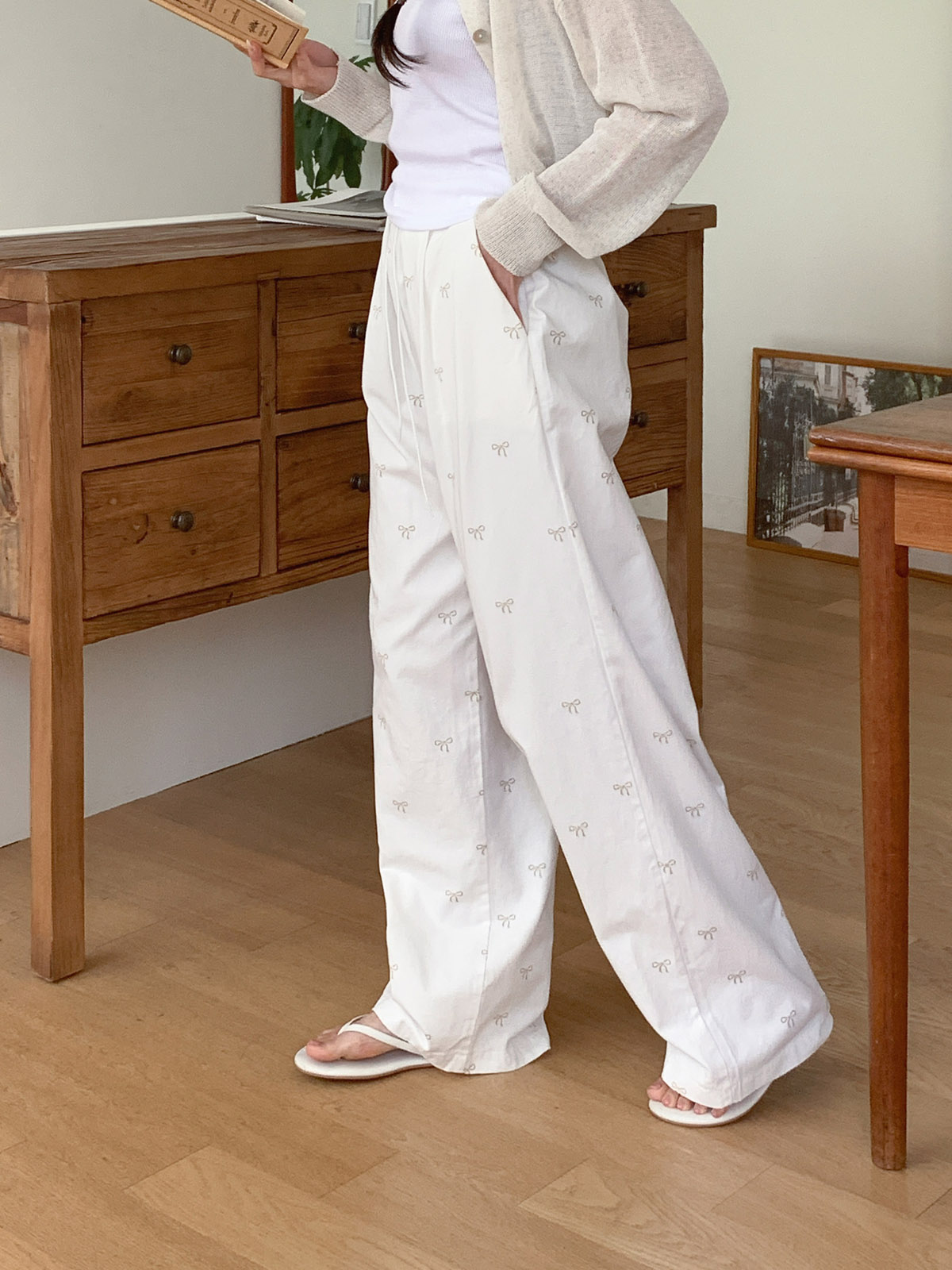 리본 패턴 프린팅이 디자인된 일자 와이드핏 팬츠