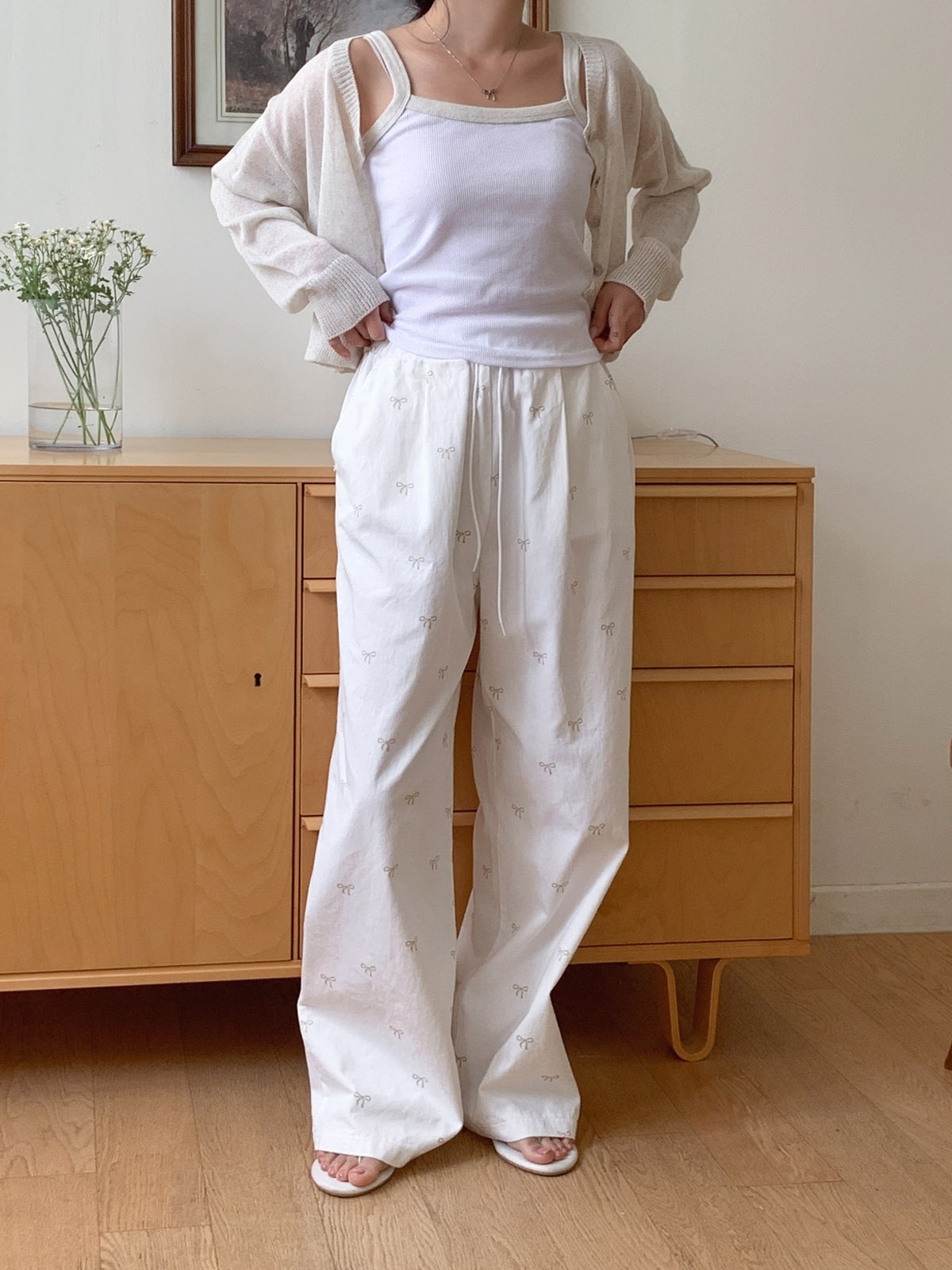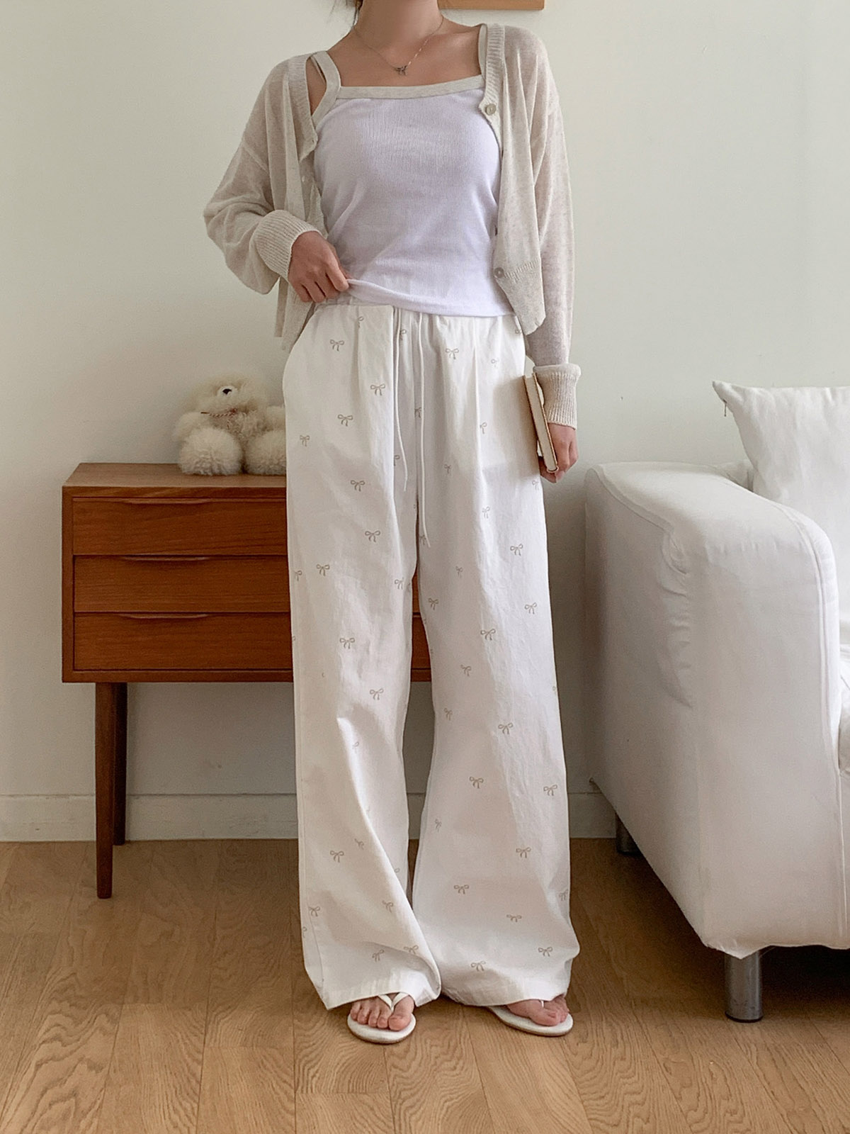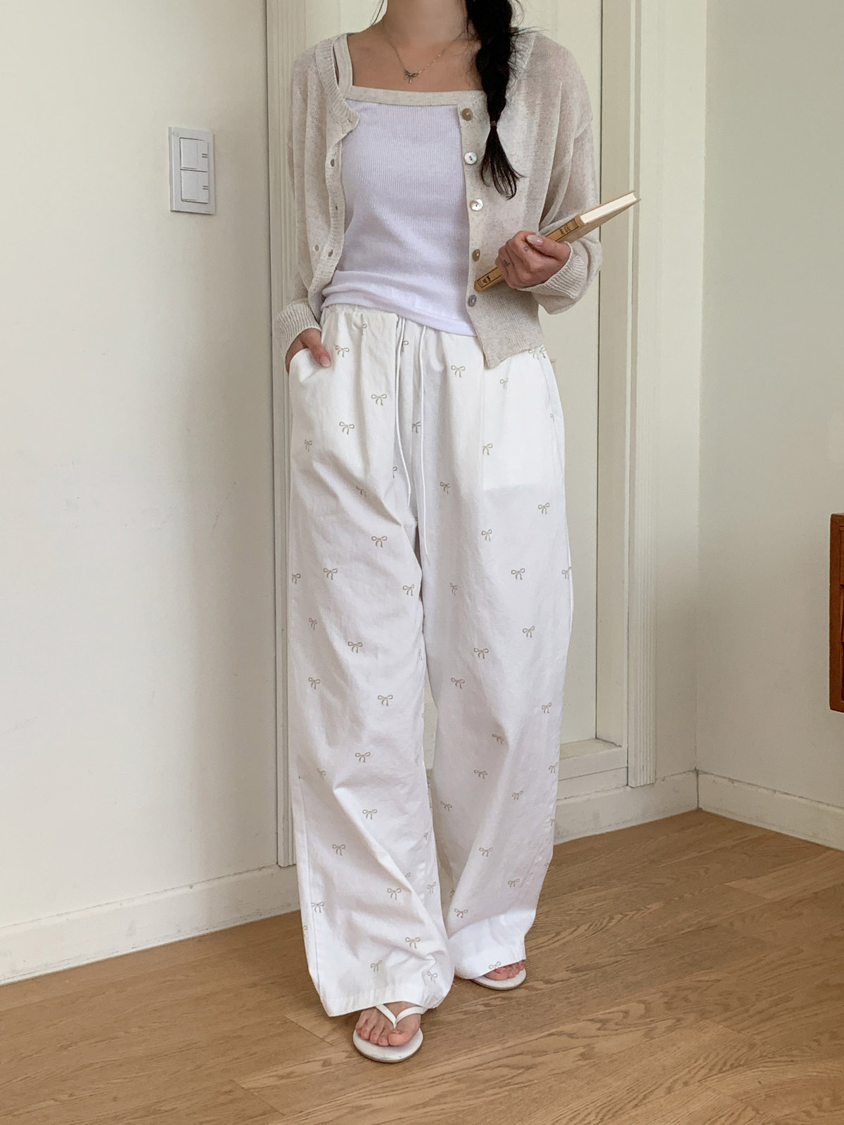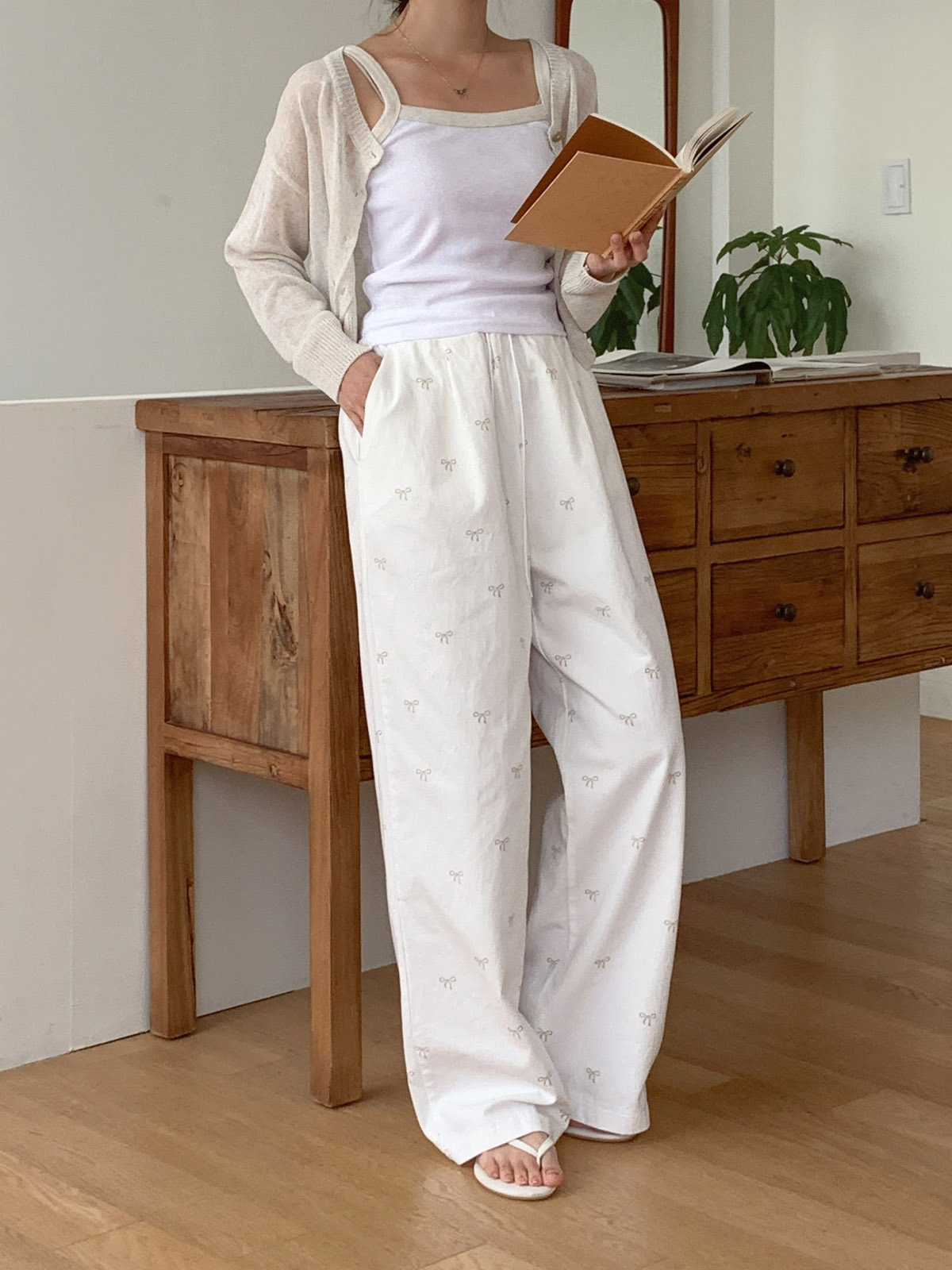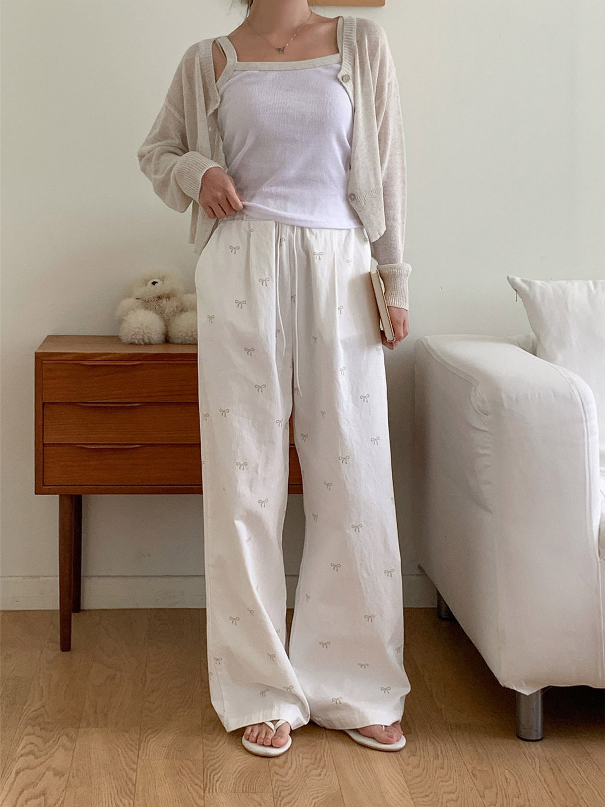 리본 패턴 프린팅이 디자인된 일자 와이드핏 팬츠