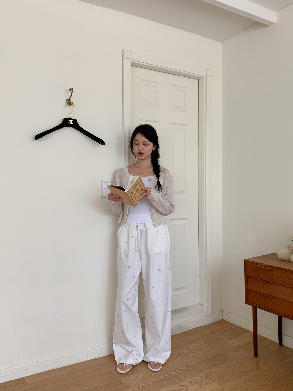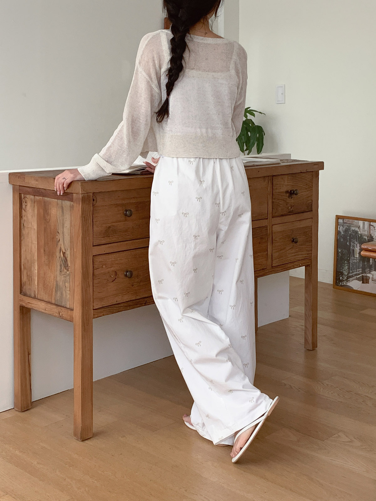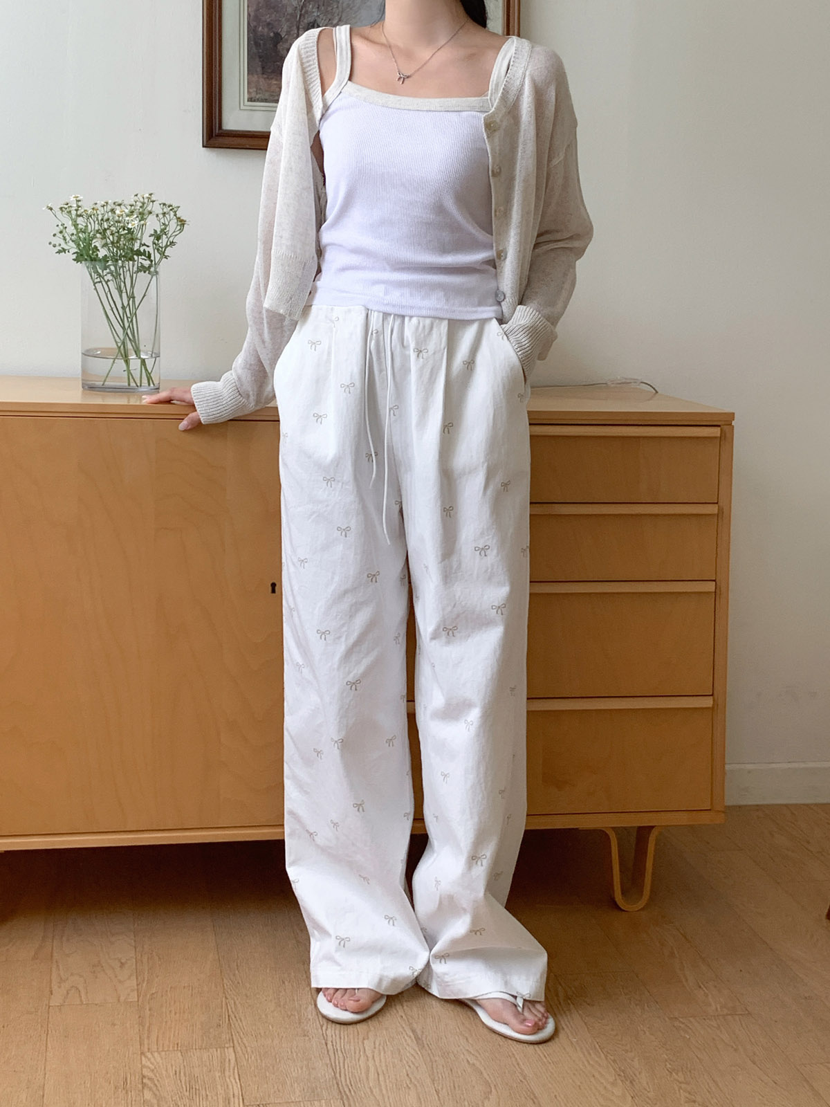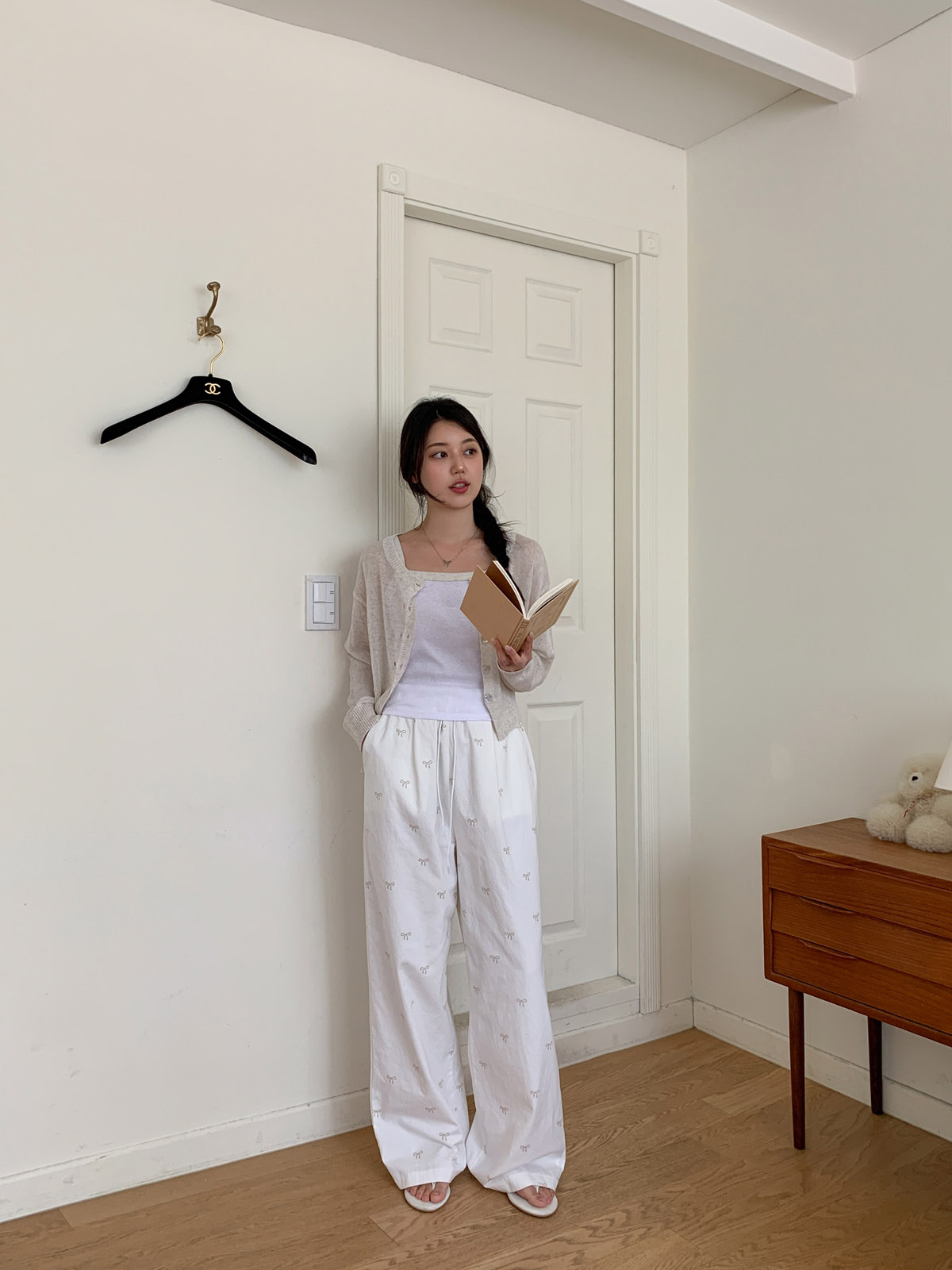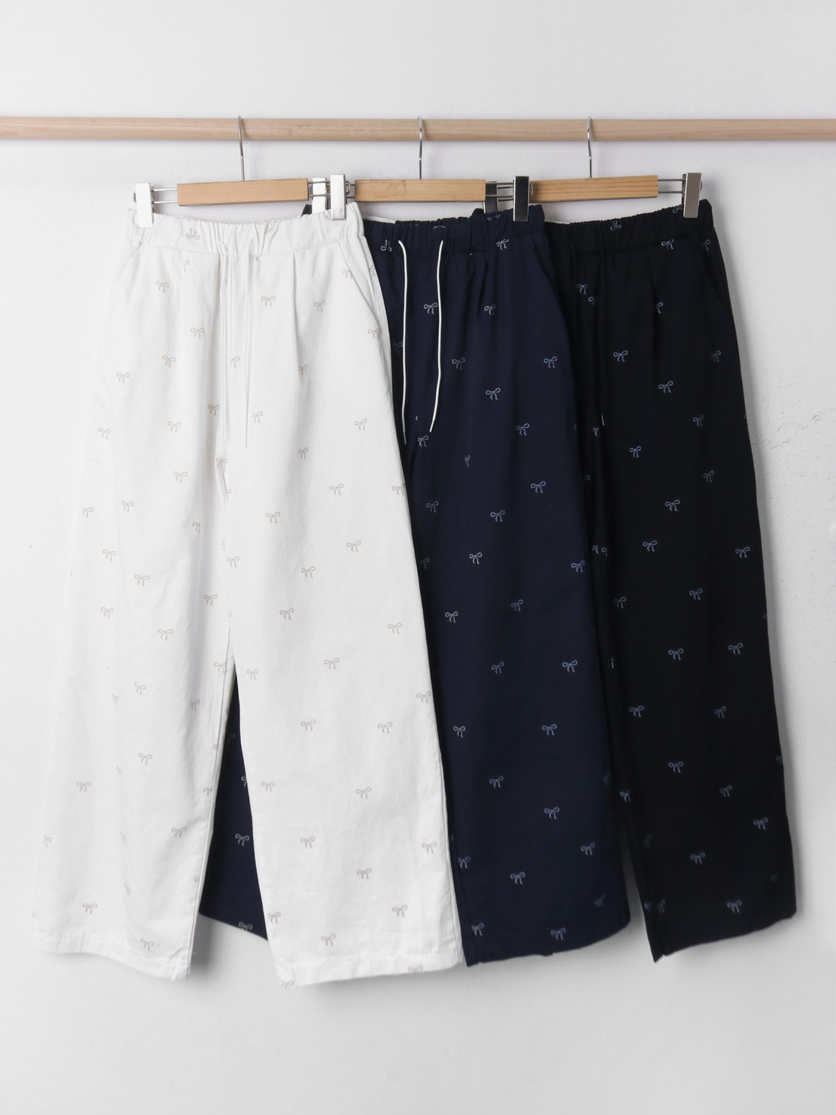 리본 패턴 프린팅이 디자인된 일자 와이드핏 팬츠