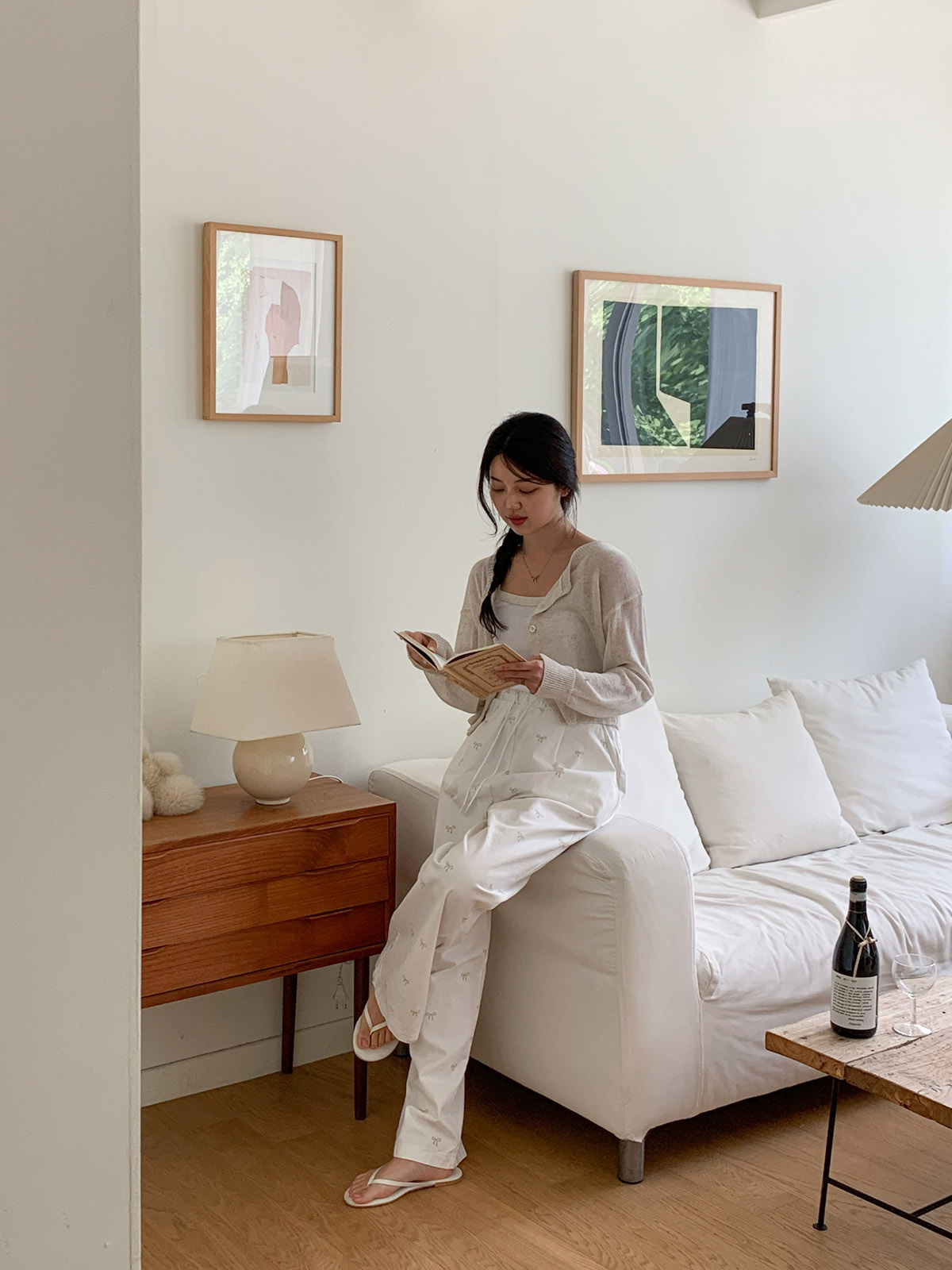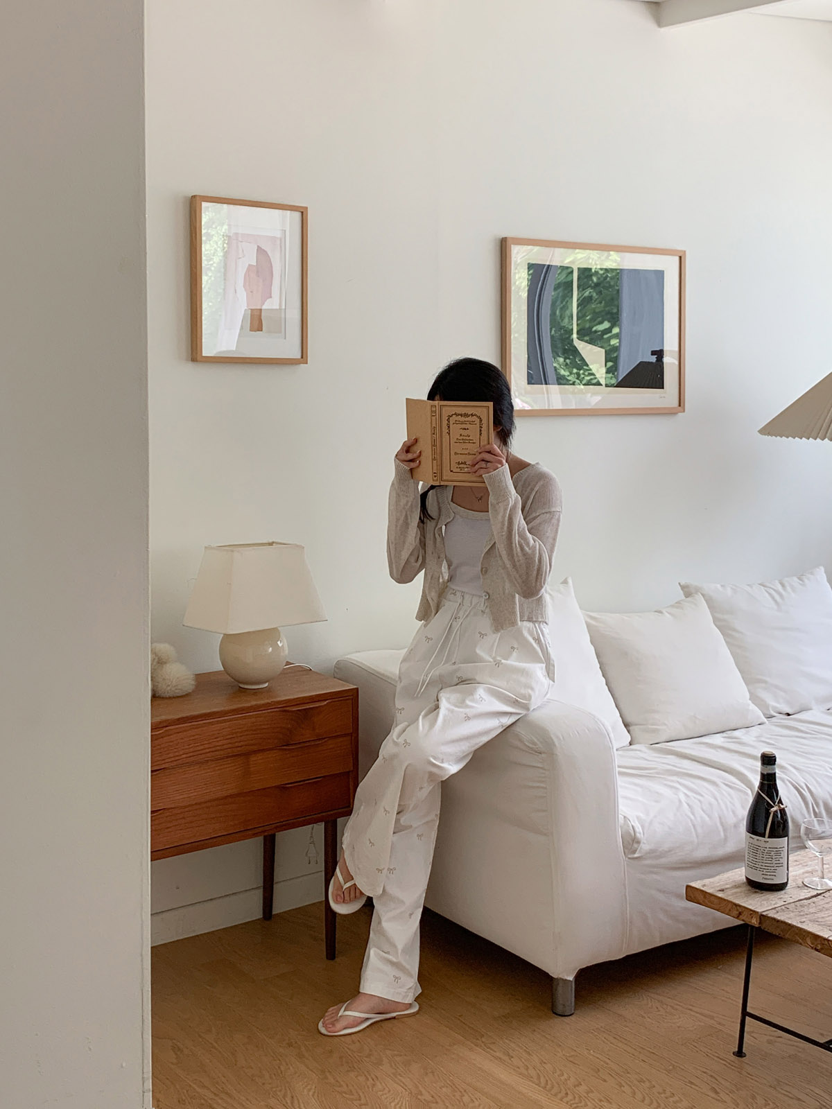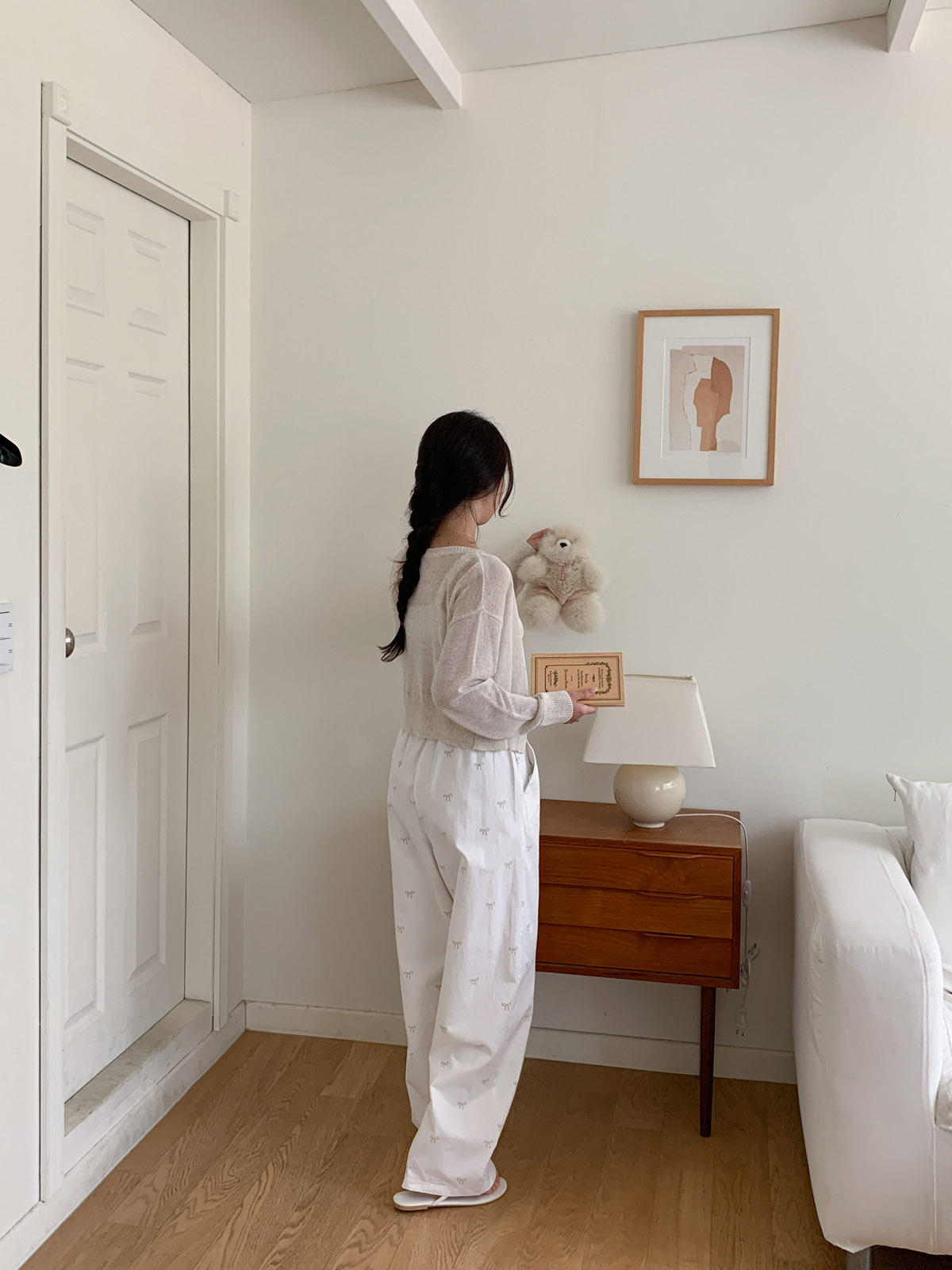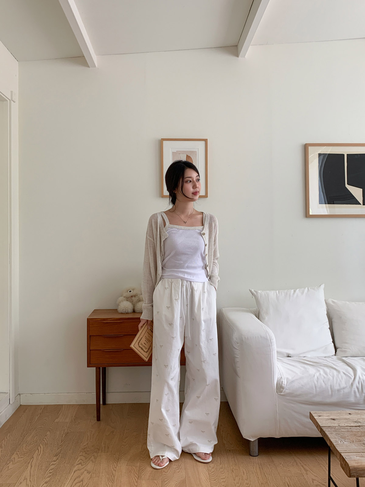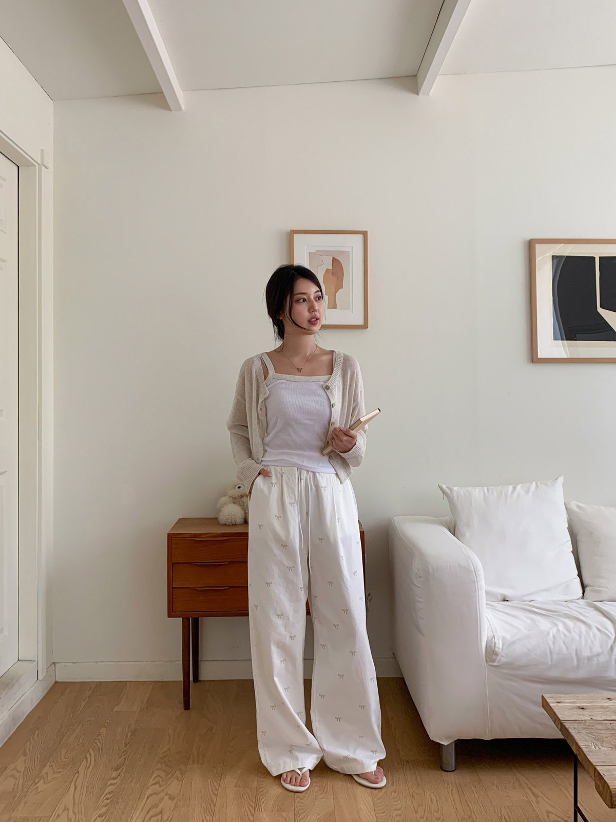 리본 패턴 프린팅이 디자인된 일자 와이드핏 팬츠