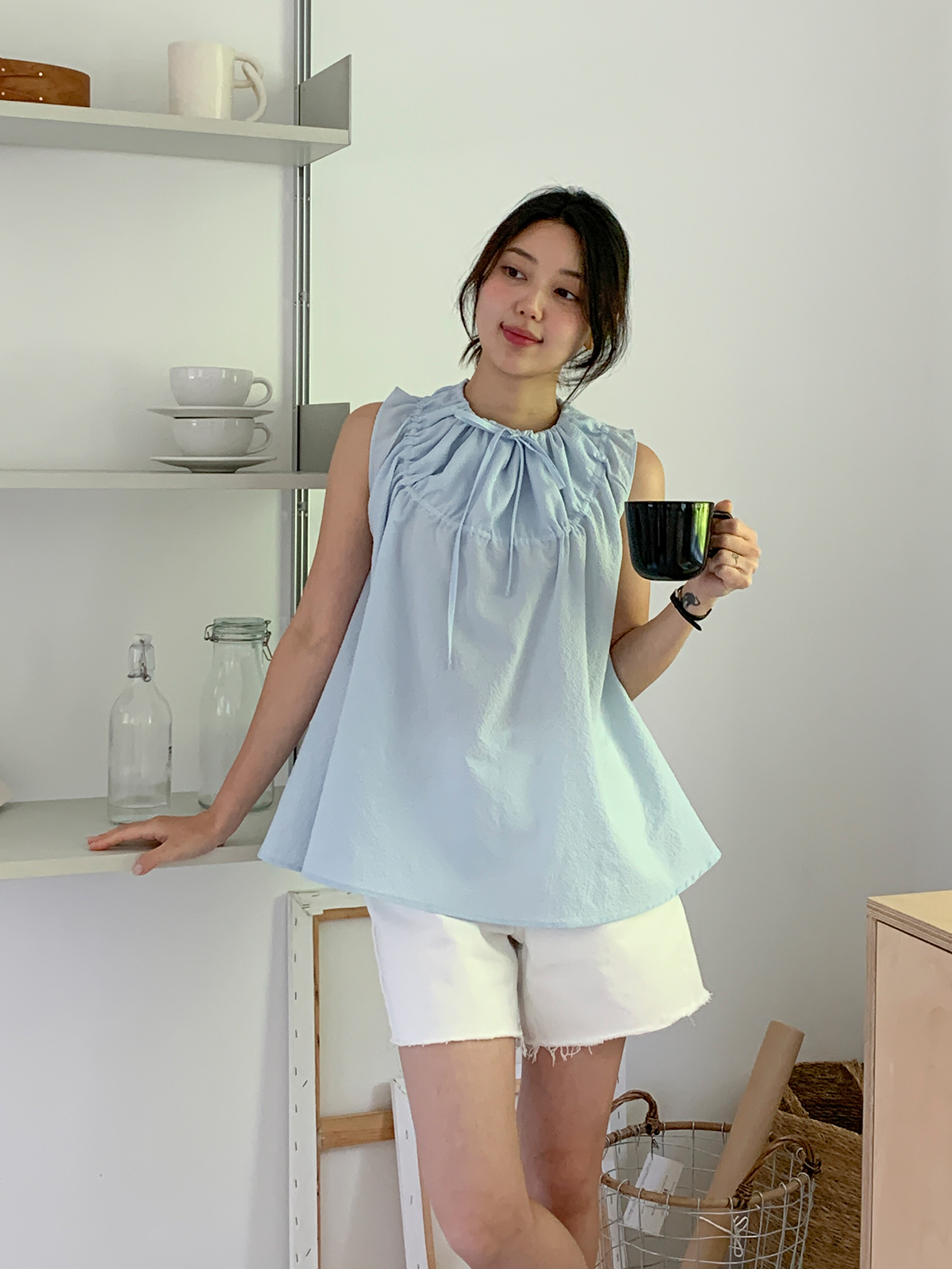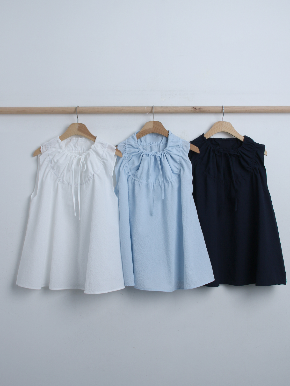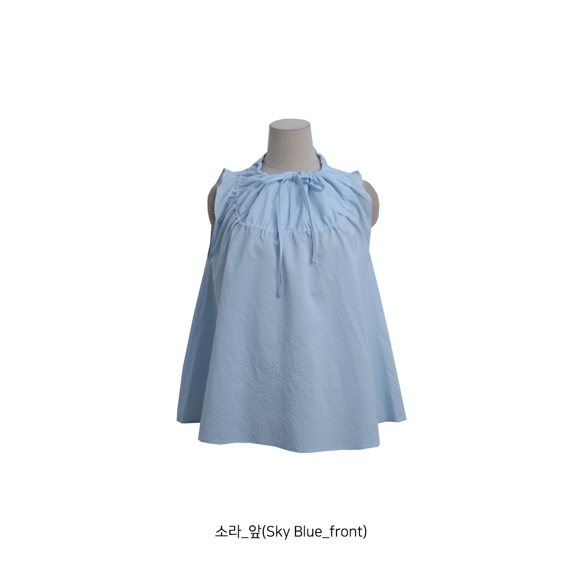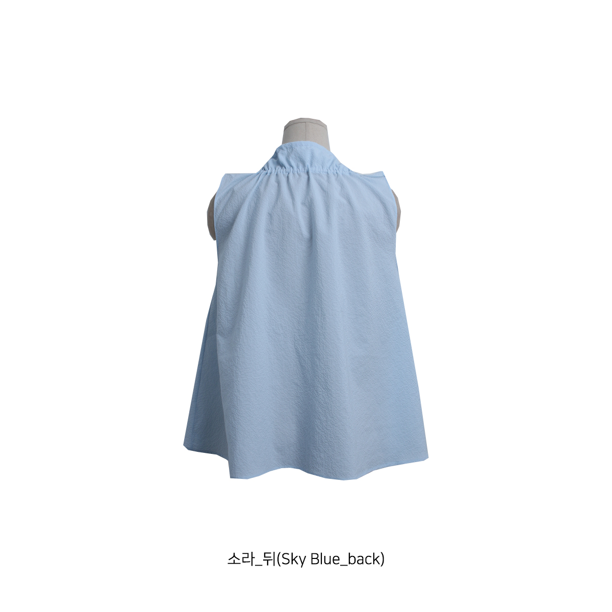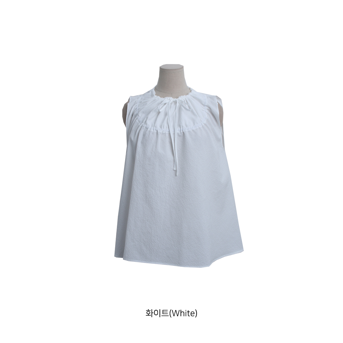 화이트(White),소라(Sky Blue),블랙(Black)프릴과 셔링 디테일이 들어가 있어 러블리하고 페미닌한 무드를 담아냈고 스트랩으로 자유로운 연출이 가능한 플레어 스타일의 민소매 블라우스