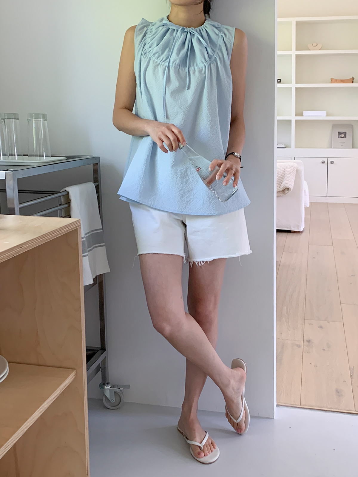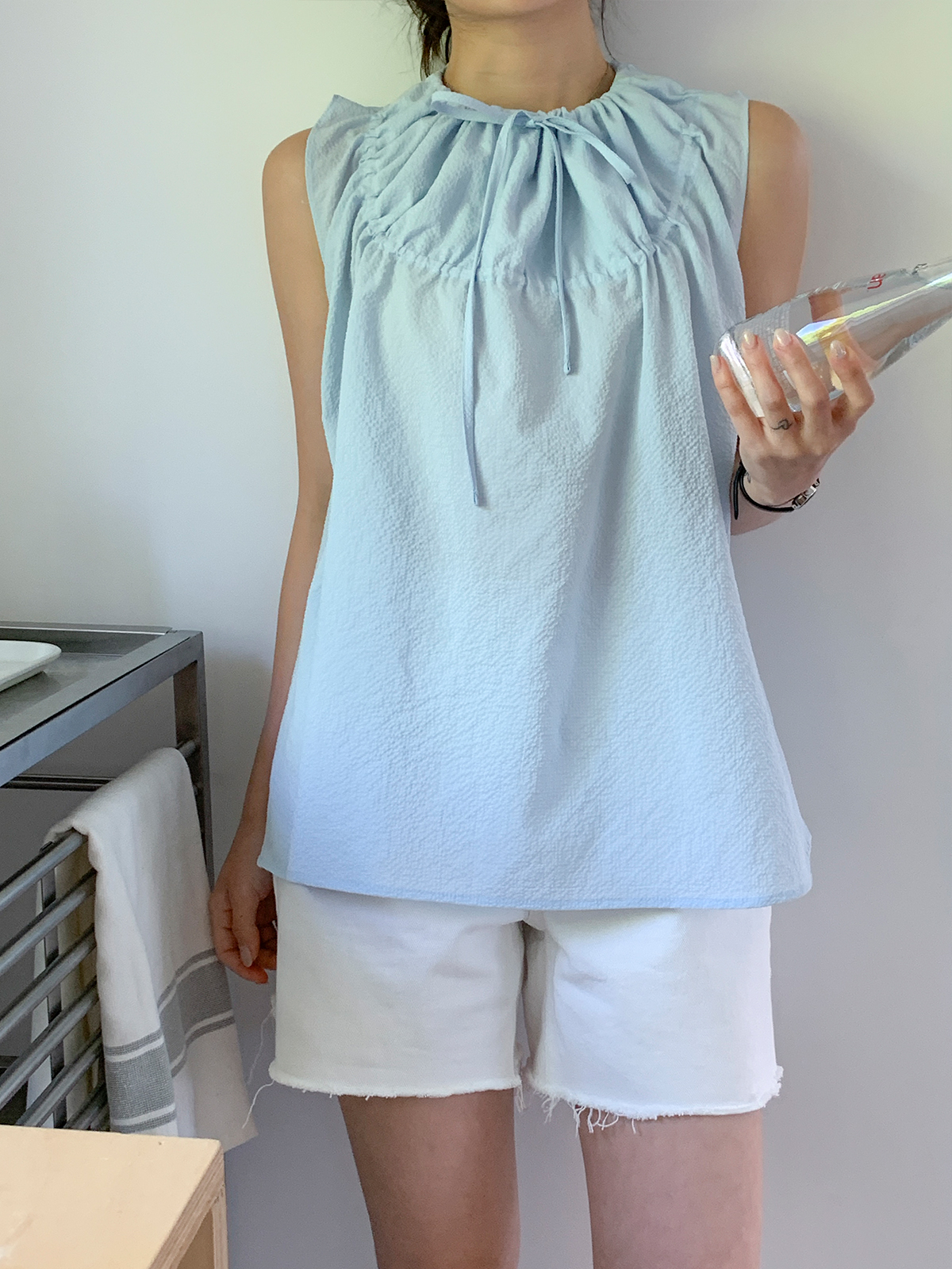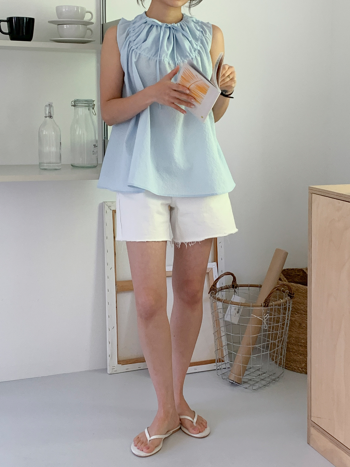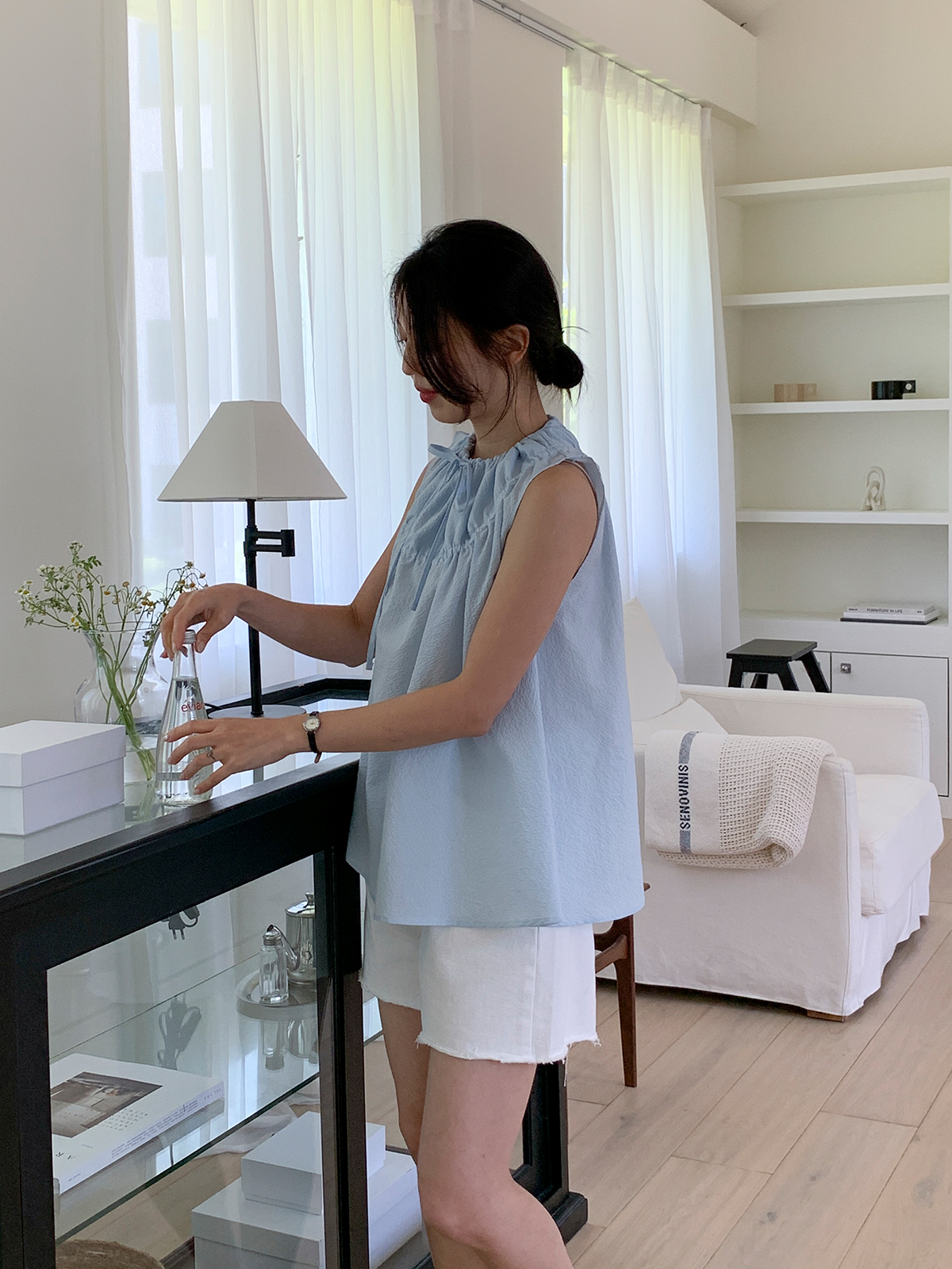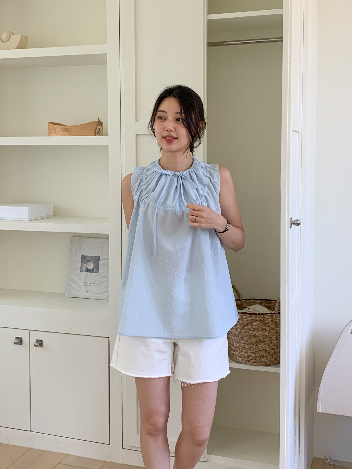 화이트(White),소라(Sky Blue),블랙(Black)프릴과 셔링 디테일이 들어가 있어 러블리하고 페미닌한 무드를 담아냈고 스트랩으로 자유로운 연출이 가능한 플레어 스타일의 민소매 블라우스