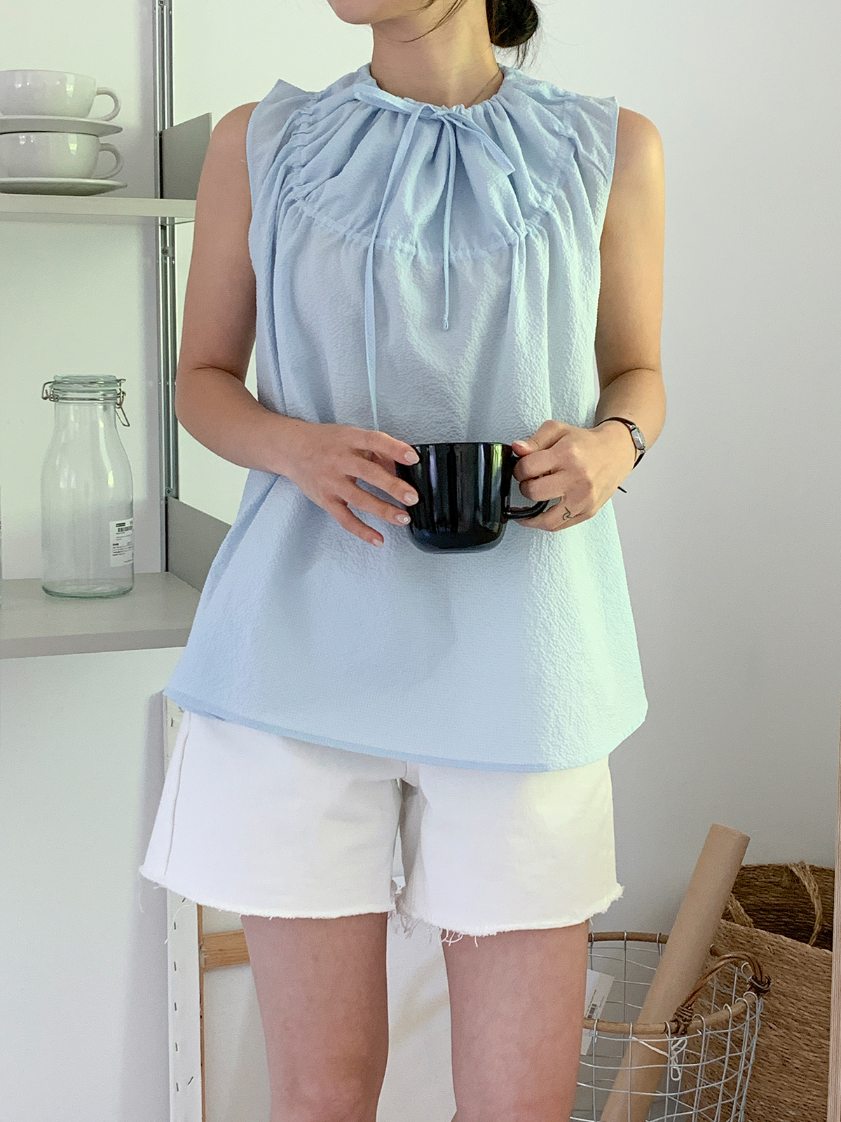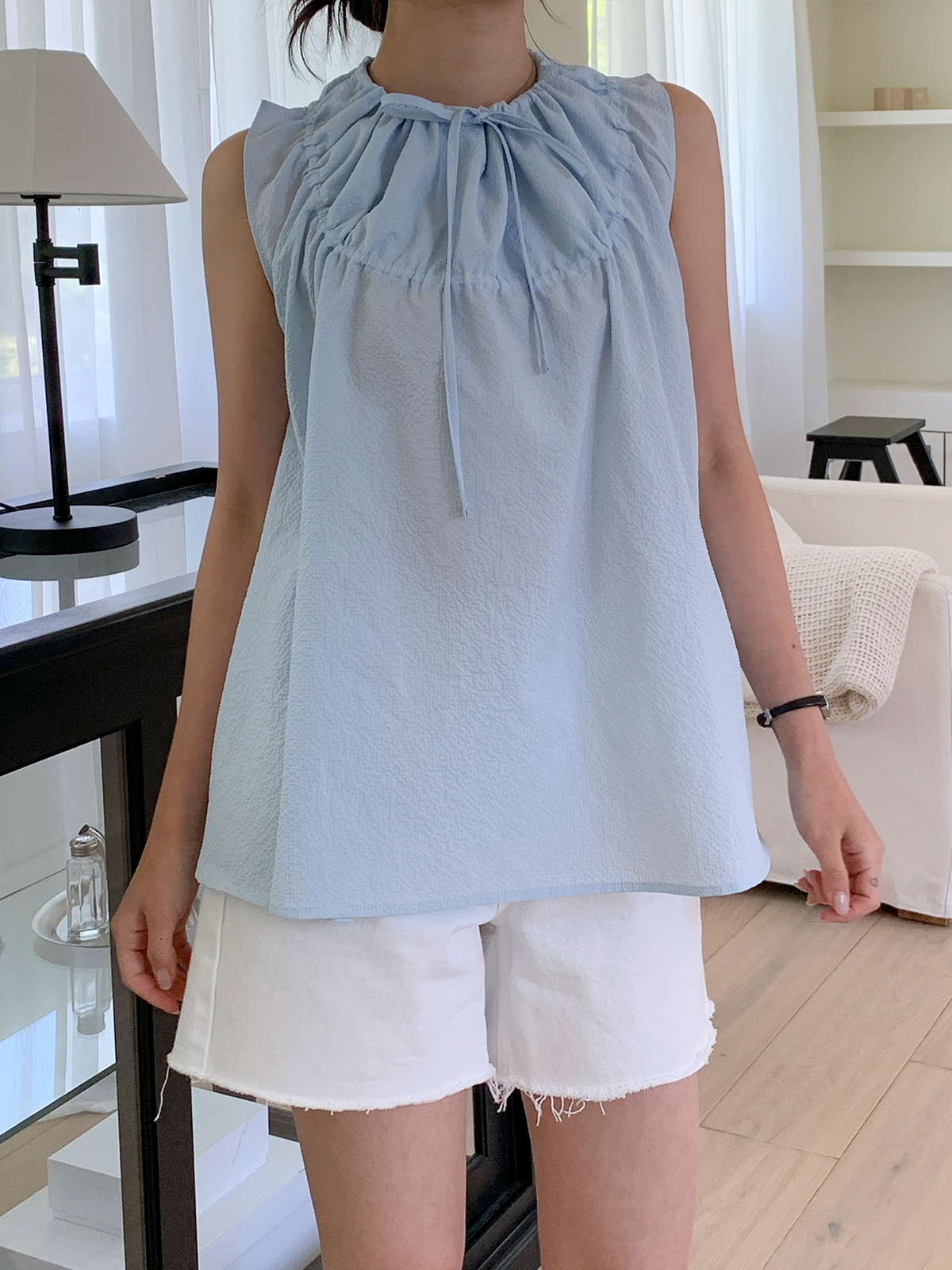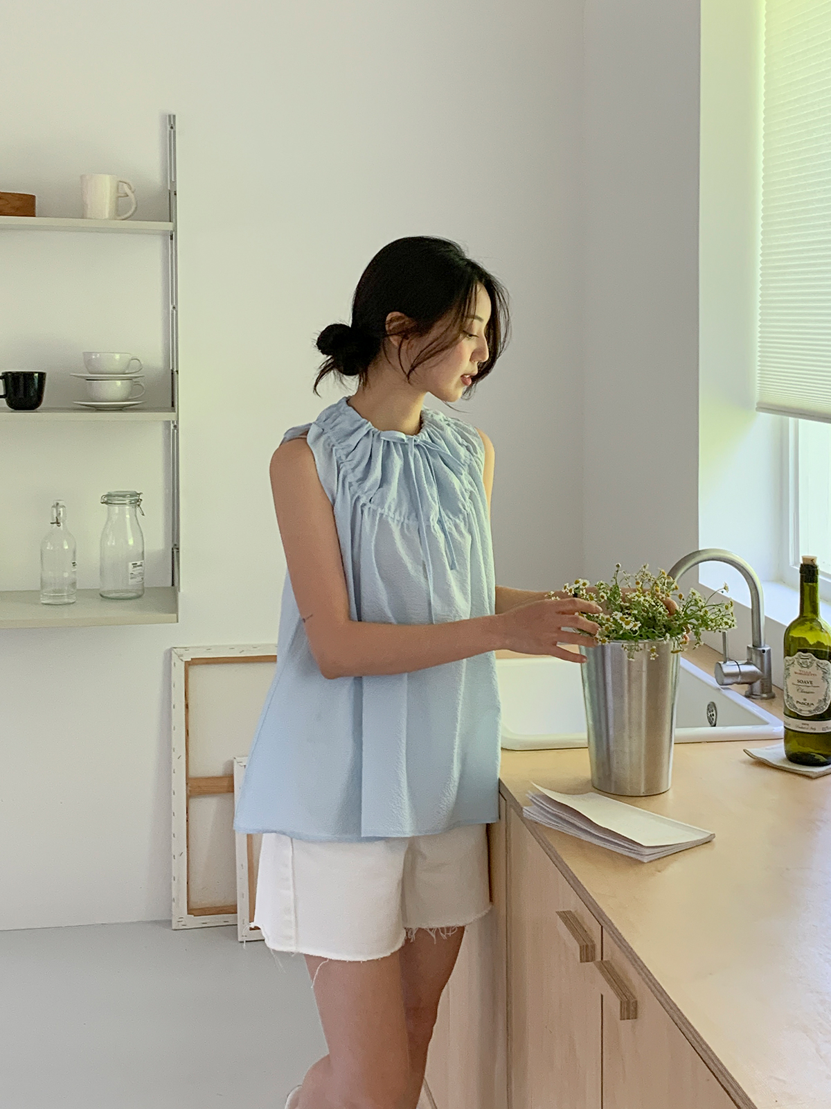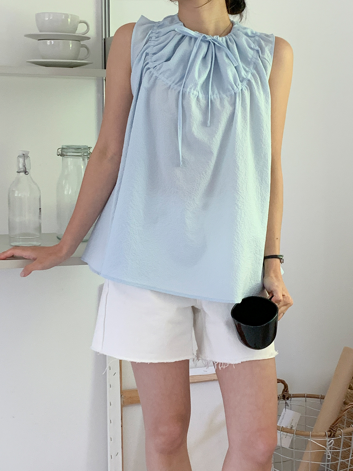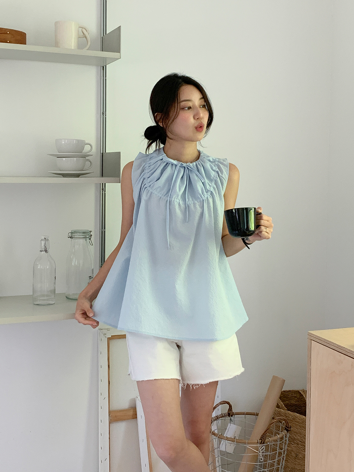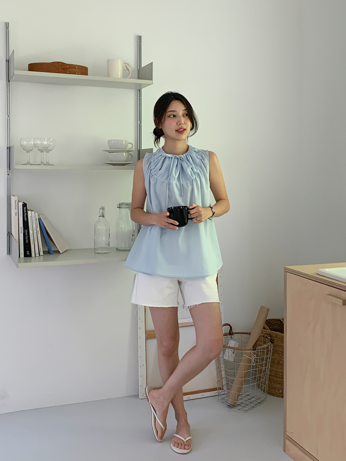 화이트(White),소라(Sky Blue),블랙(Black)프릴과 셔링 디테일이 들어가 있어 러블리하고 페미닌한 무드를 담아냈고 스트랩으로 자유로운 연출이 가능한 플레어 스타일의 민소매 블라우스