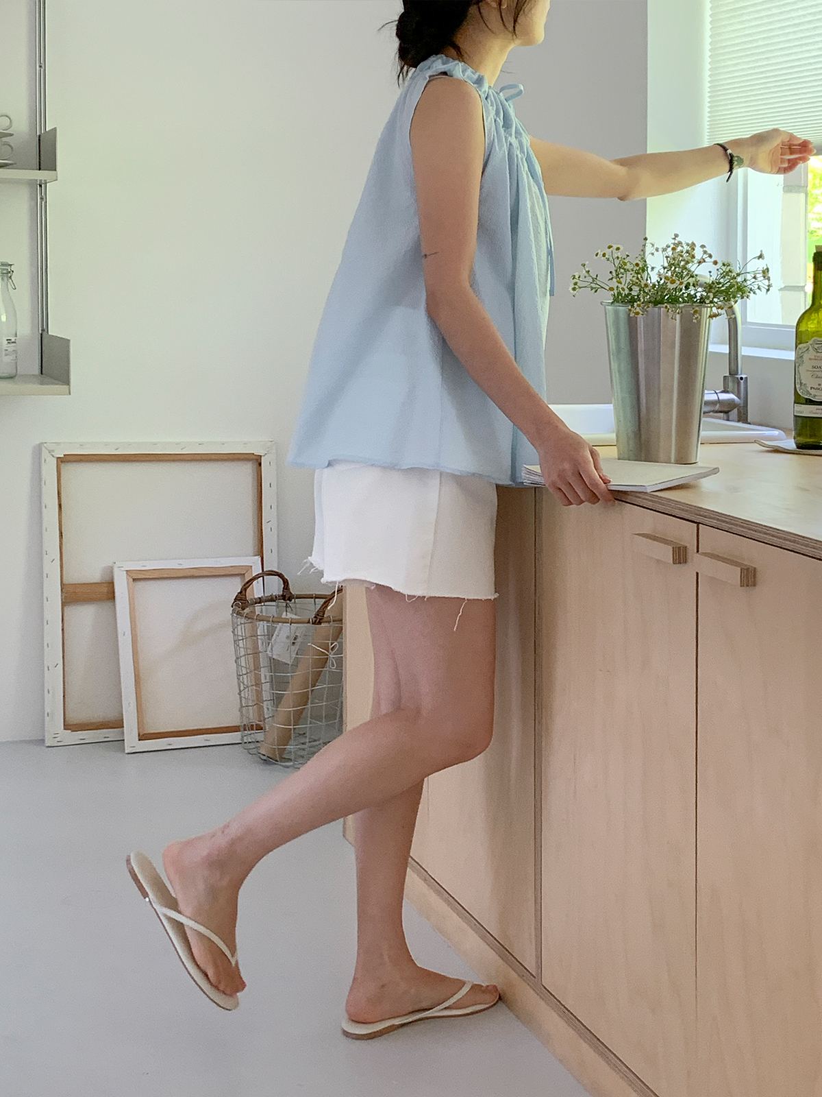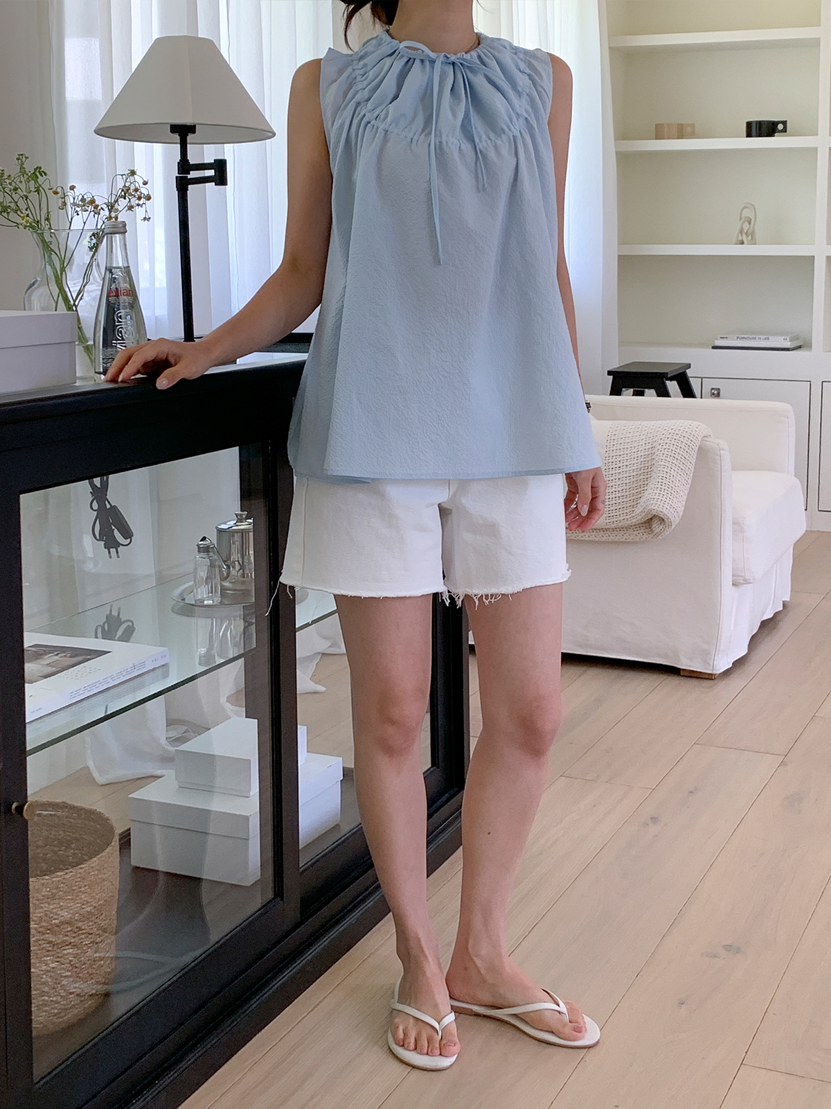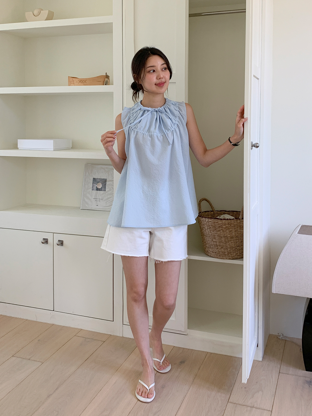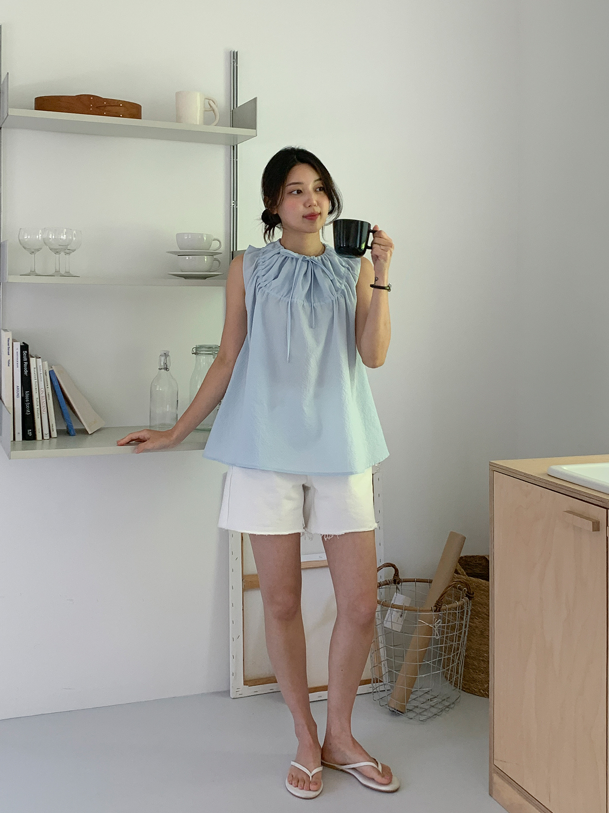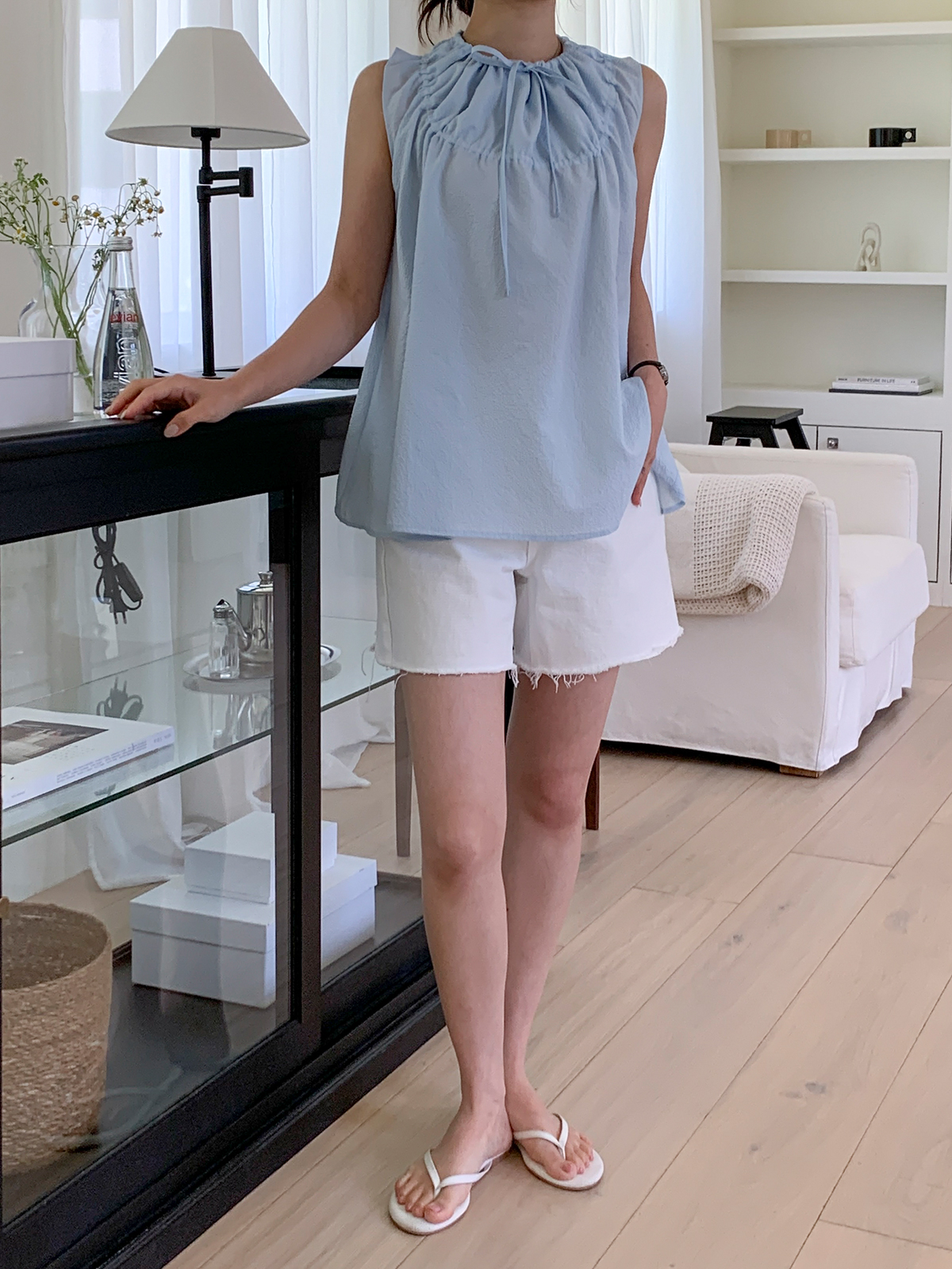 화이트(White),소라(Sky Blue),블랙(Black)프릴과 셔링 디테일이 들어가 있어 러블리하고 페미닌한 무드를 담아냈고 스트랩으로 자유로운 연출이 가능한 플레어 스타일의 민소매 블라우스