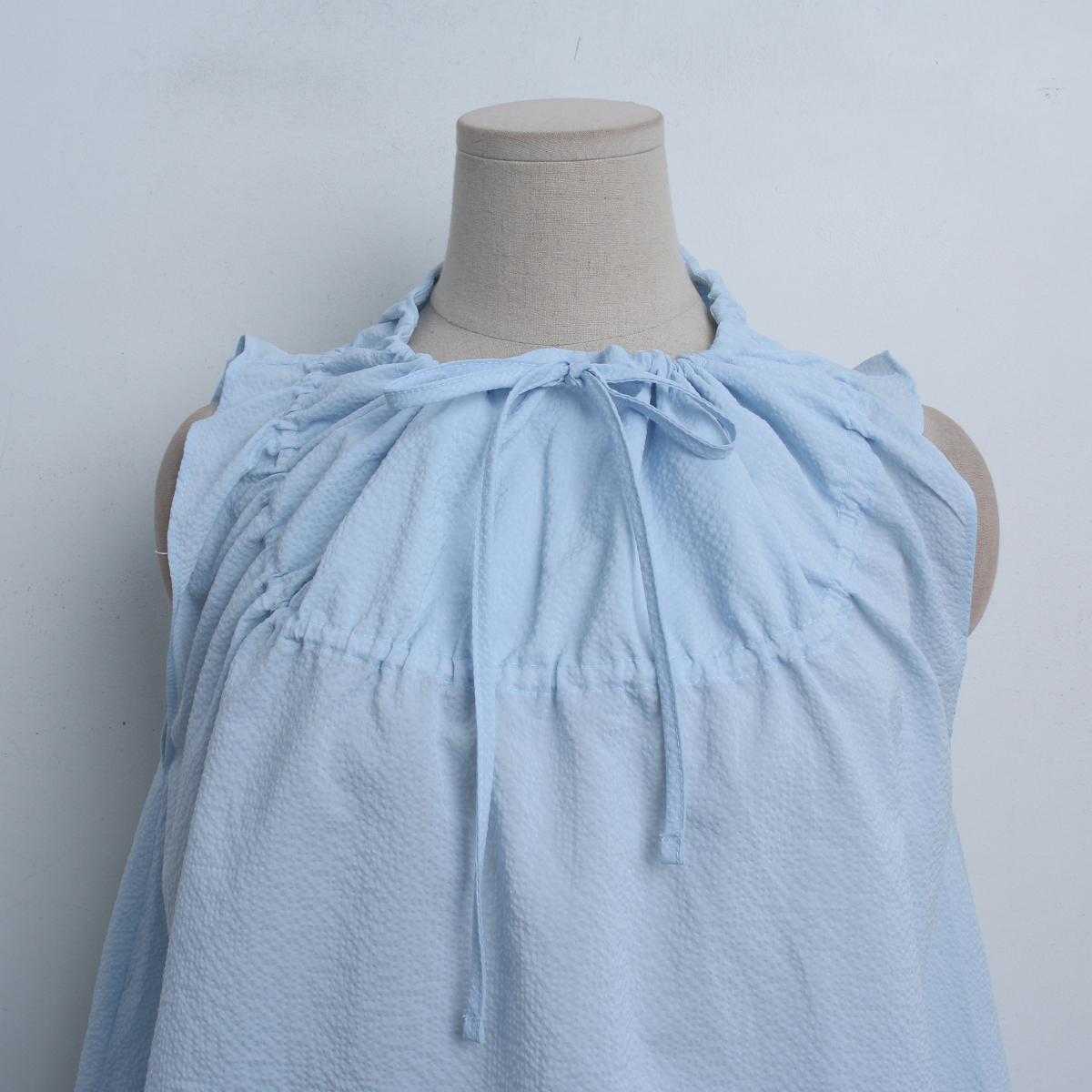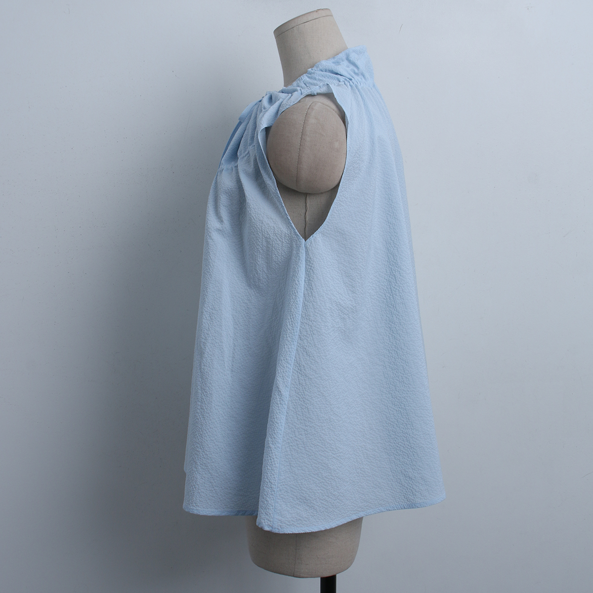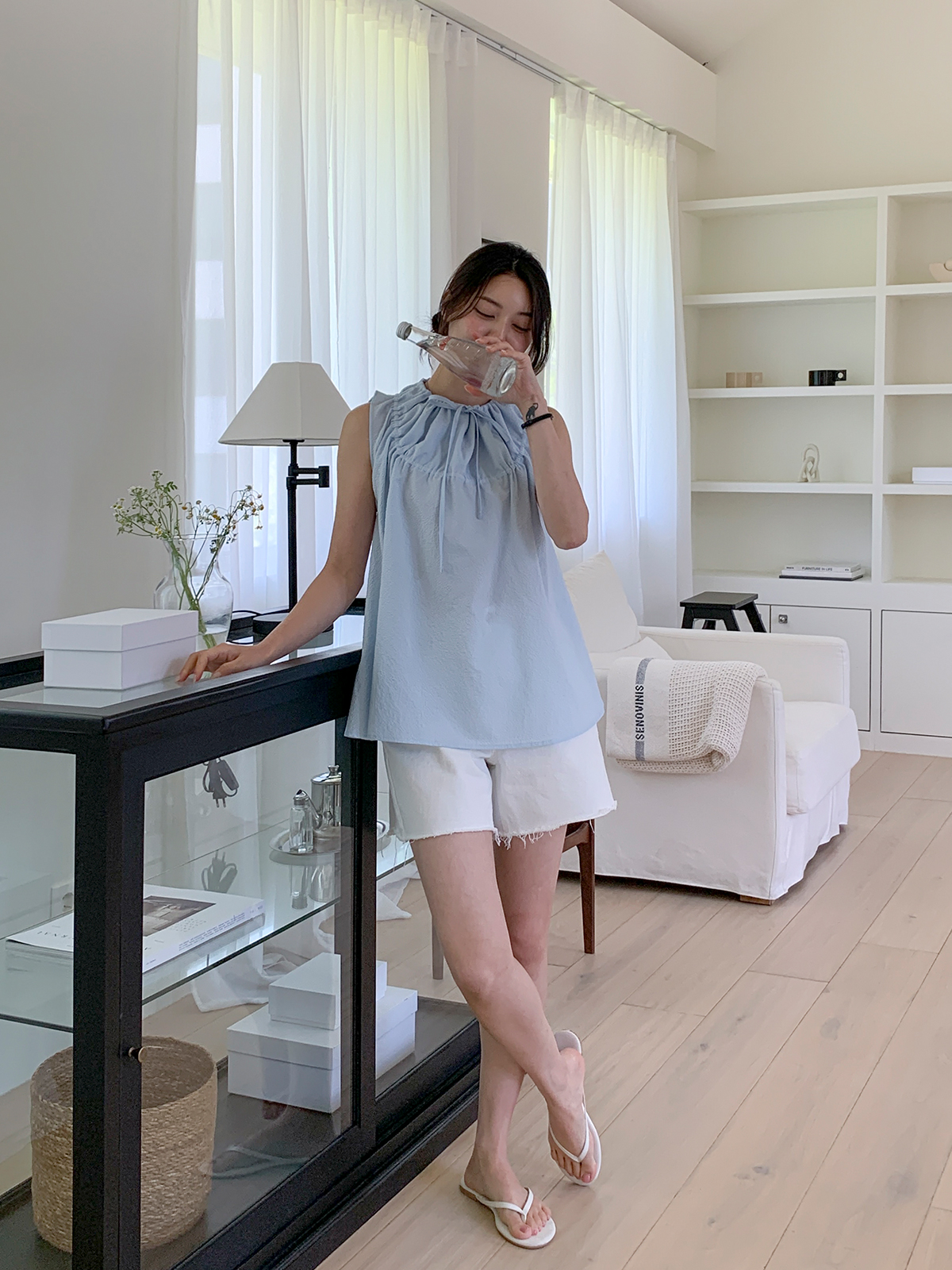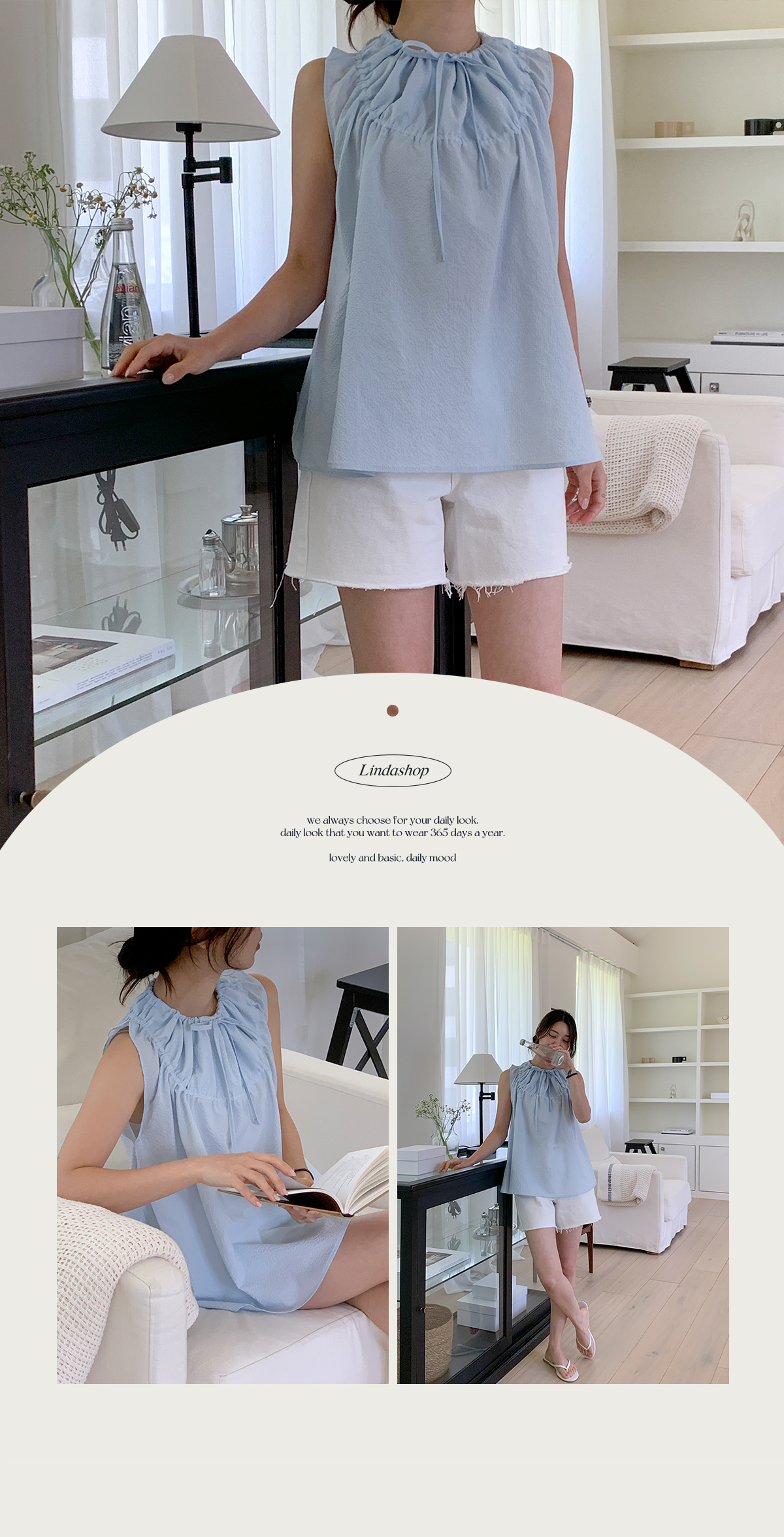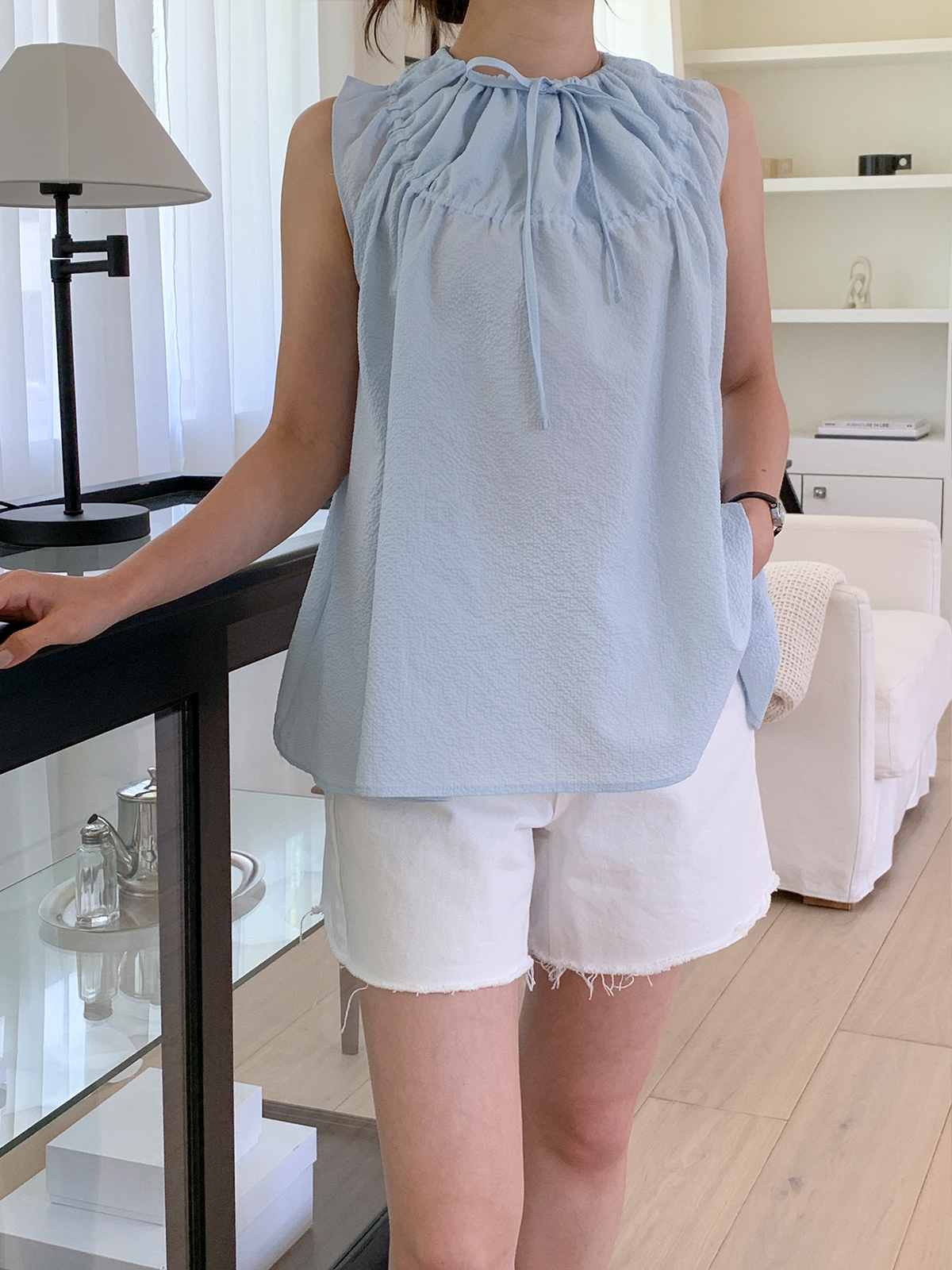 화이트(White),소라(Sky Blue),블랙(Black)프릴과 셔링 디테일이 들어가 있어 러블리하고 페미닌한 무드를 담아냈고 스트랩으로 자유로운 연출이 가능한 플레어 스타일의 민소매 블라우스
