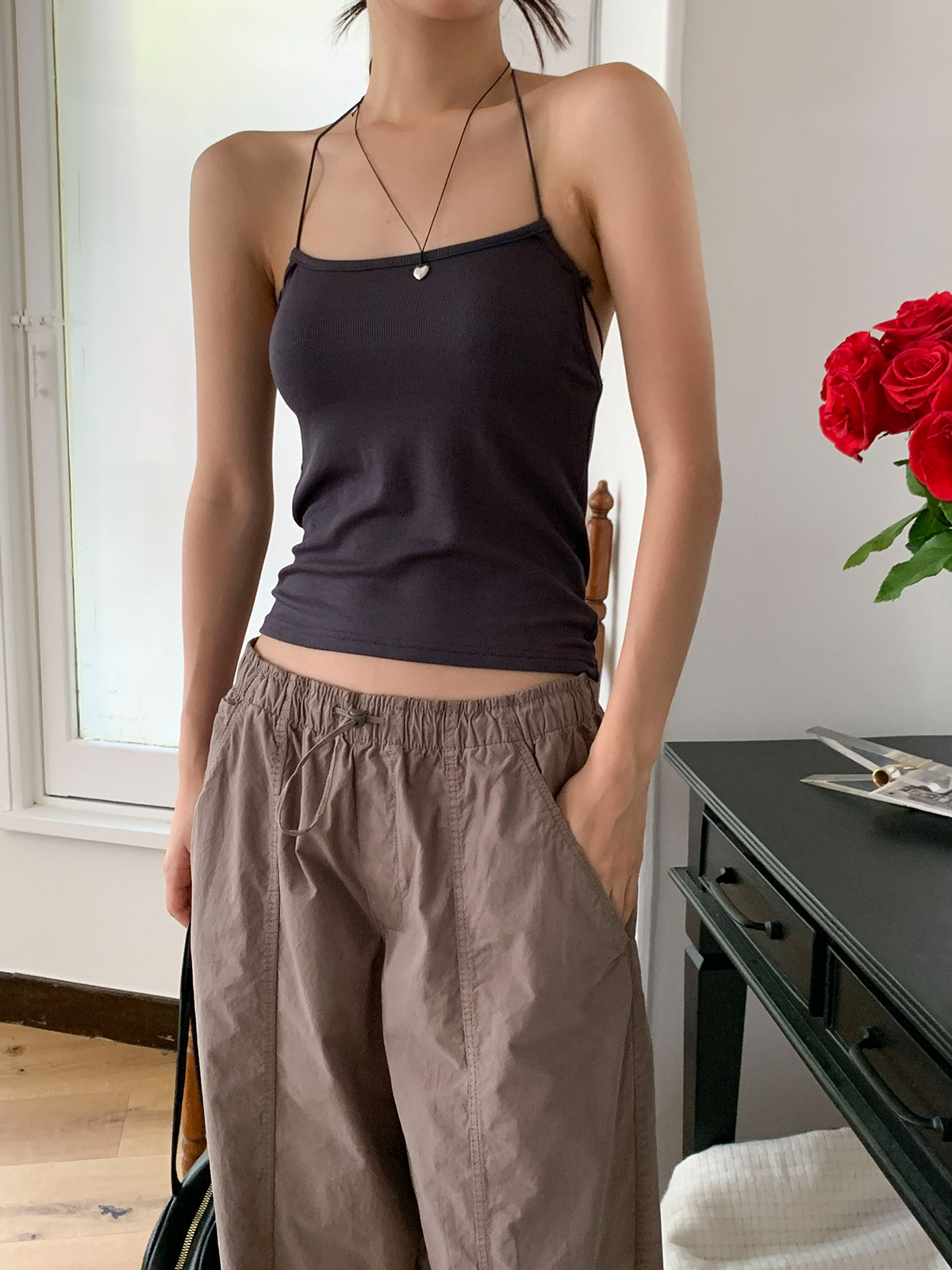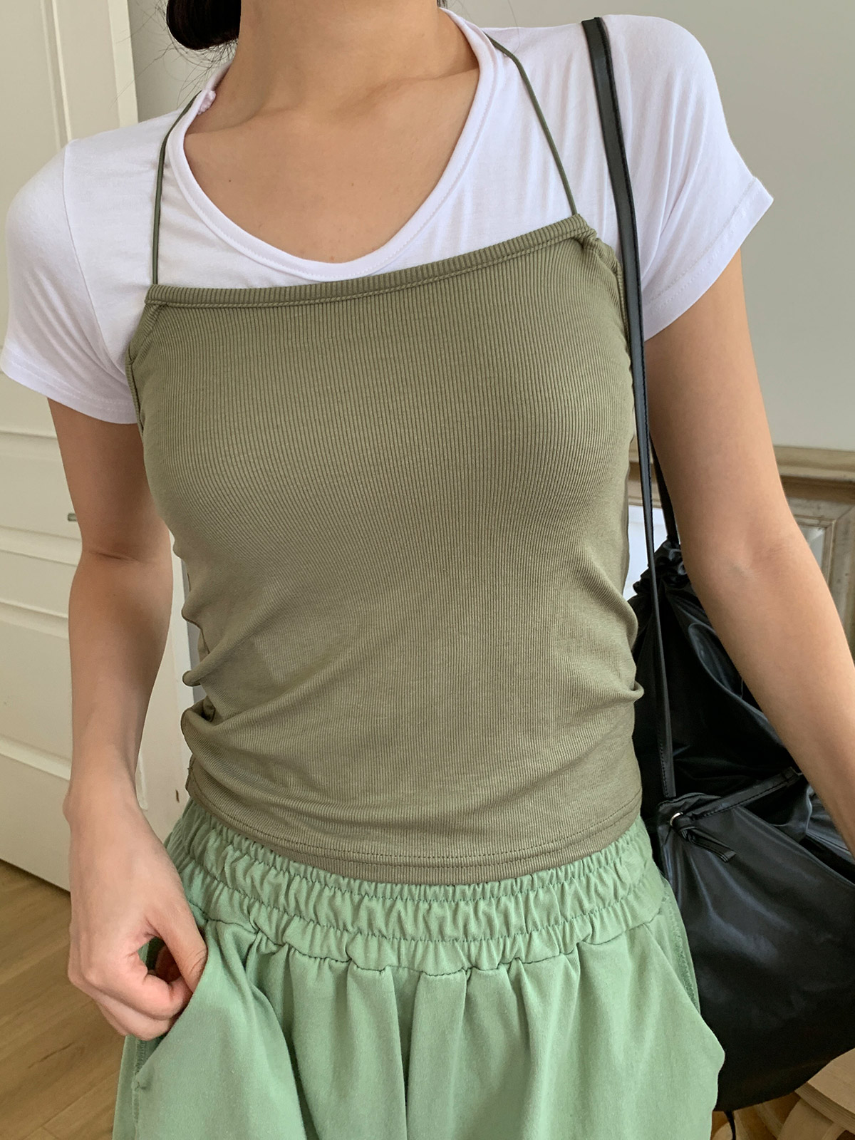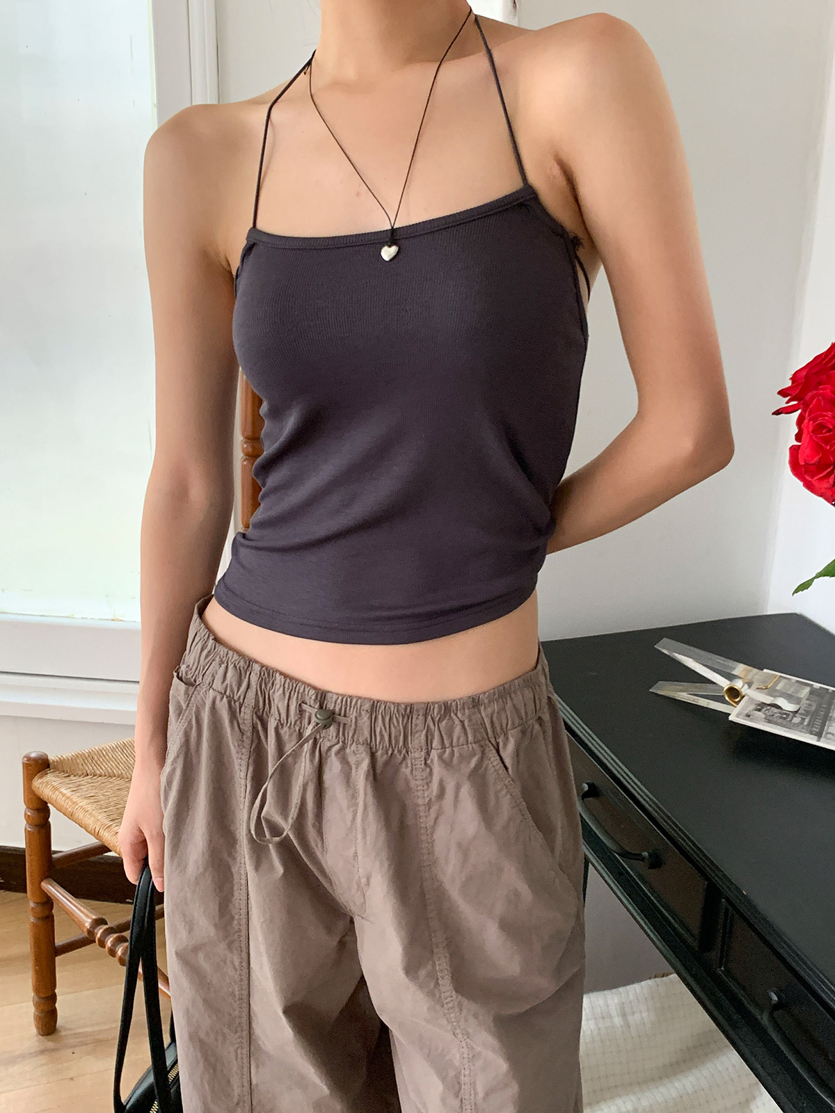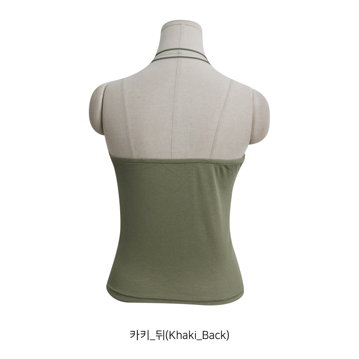 유니크한 더블 스트링 스트랩으로 디자인된 홀터넥 민소매 티셔츠
