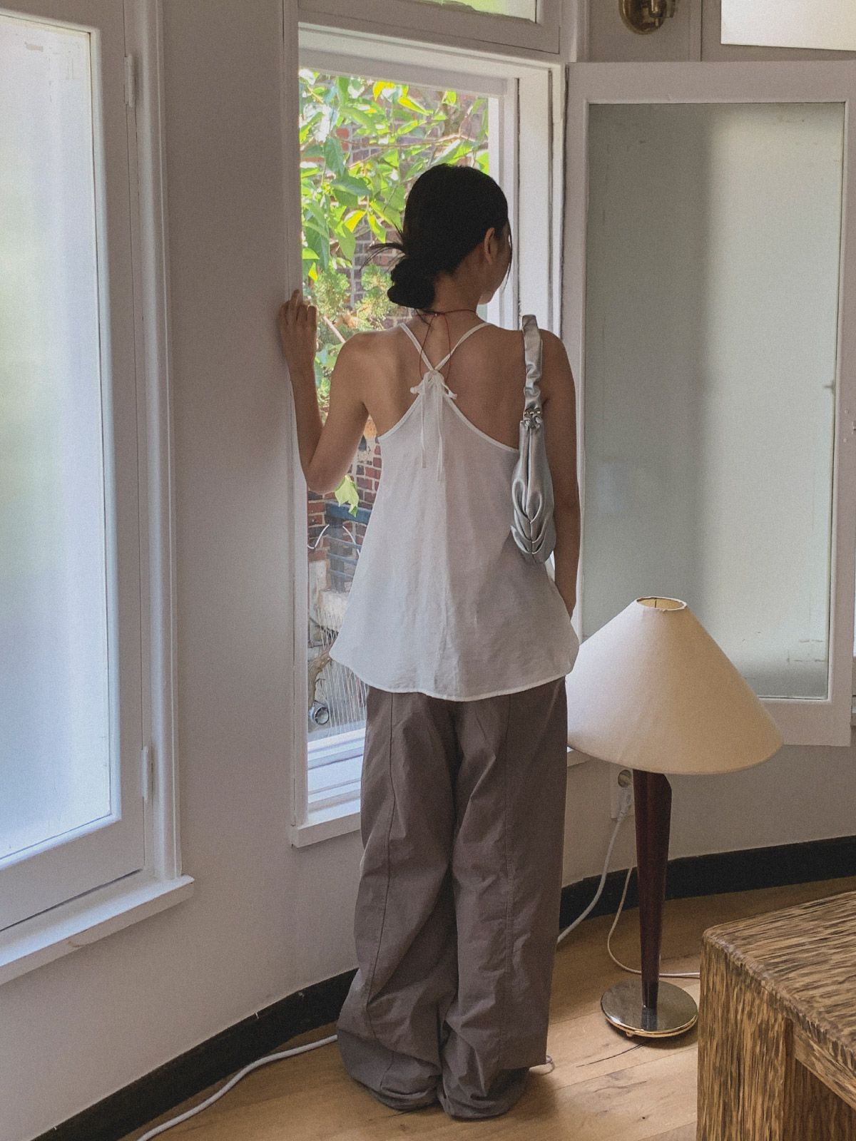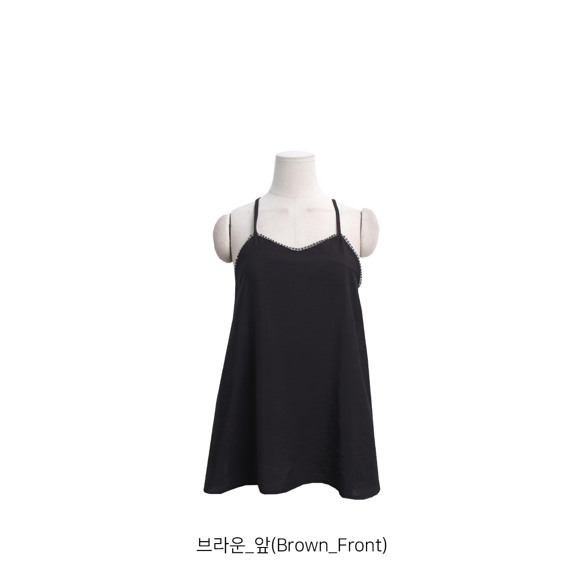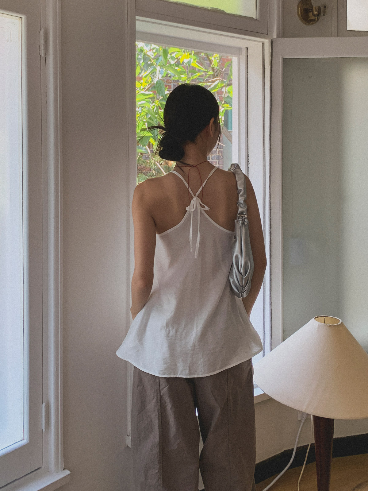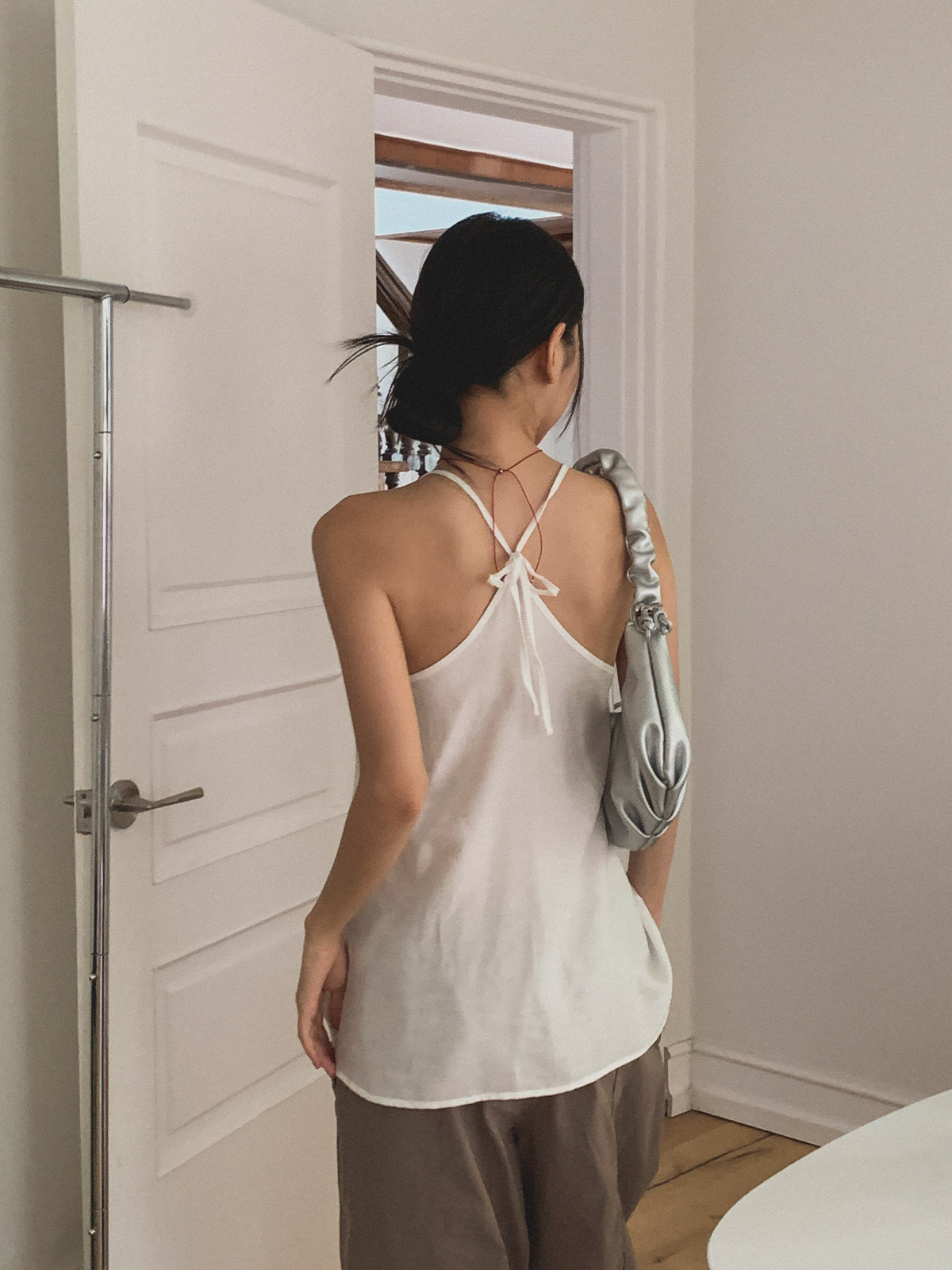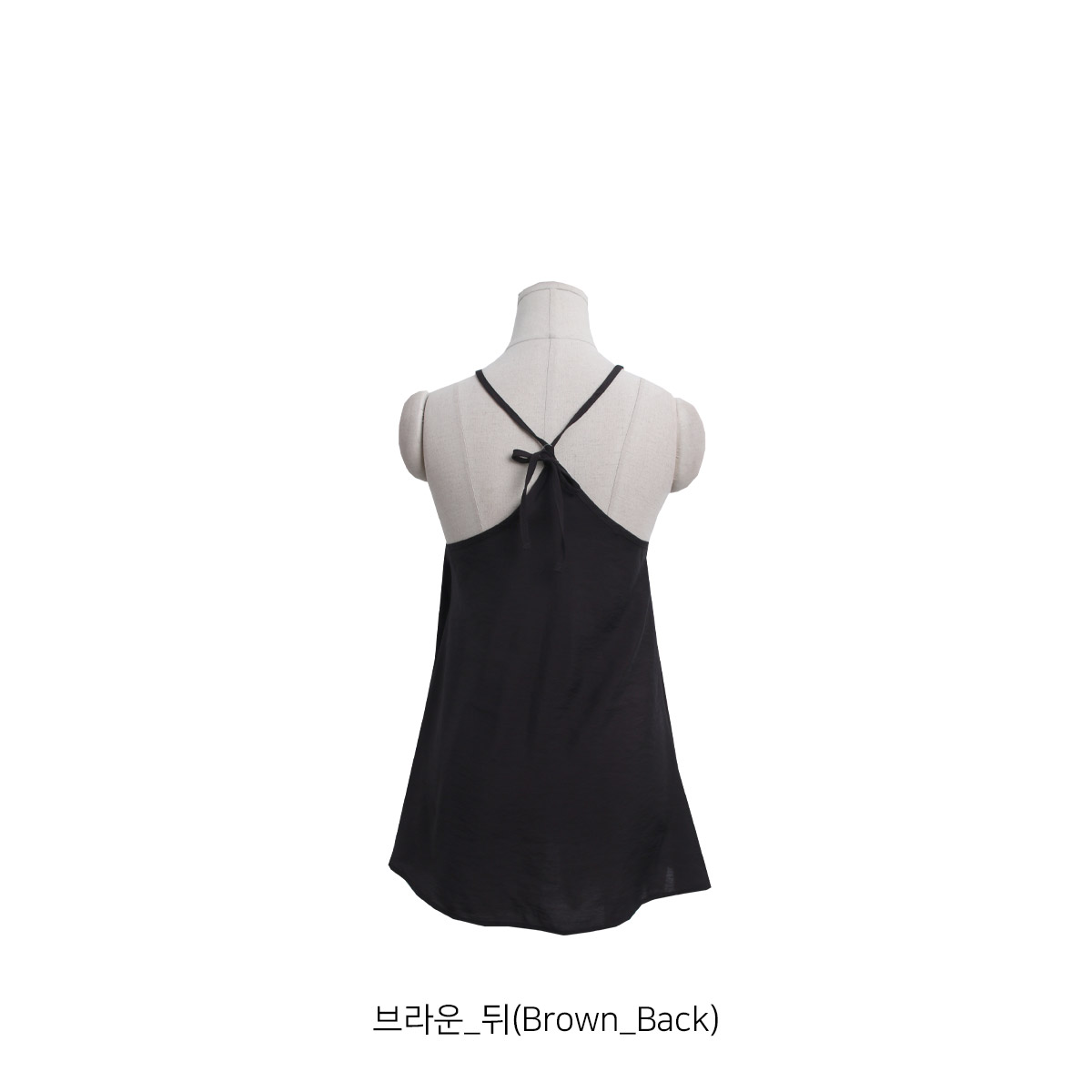 어깨끈이 스트랩으로 디자인되어 뒷면 링에 고정하는 구성으로 흔히 볼 수 없는 유니크한 무드의 끈나시 블라우스