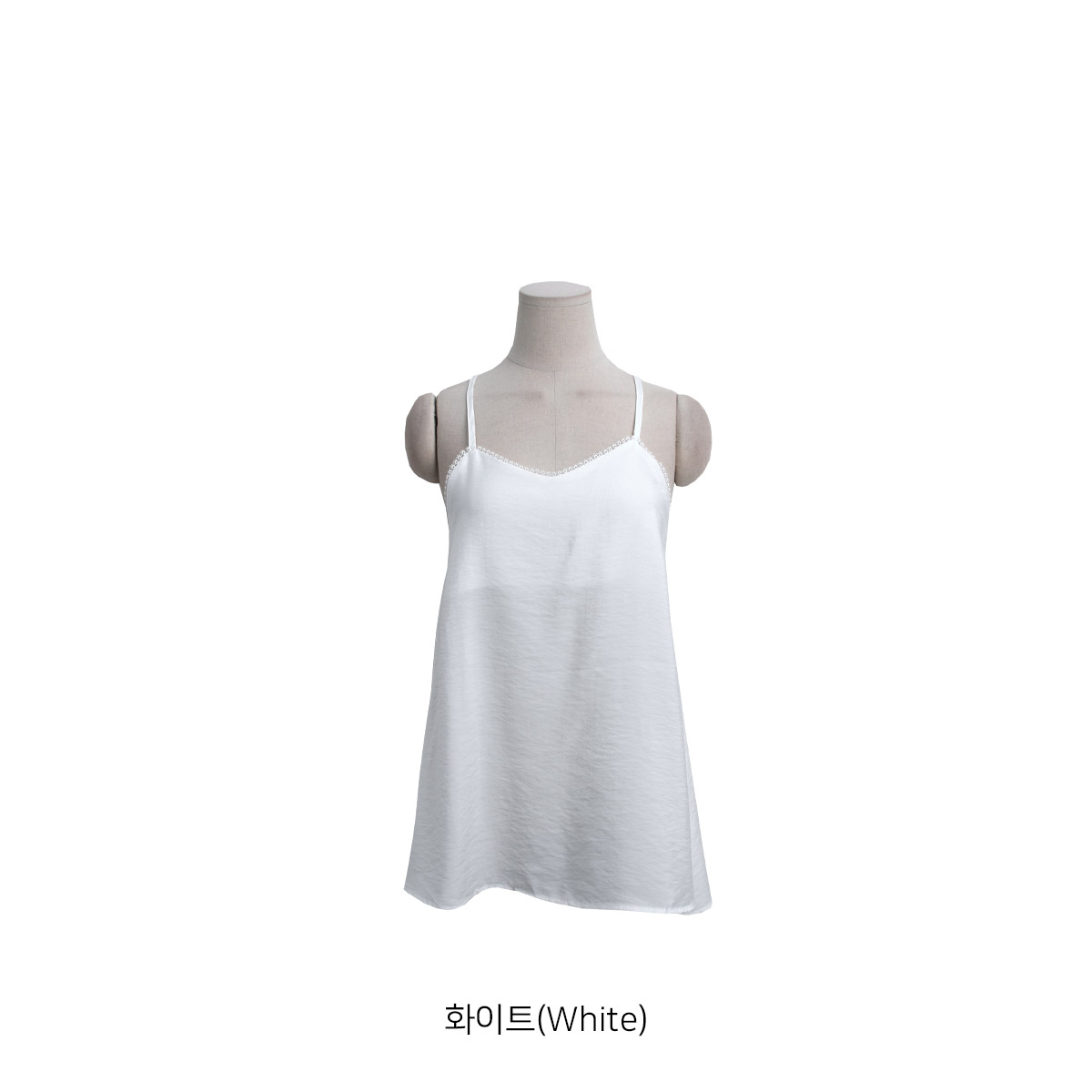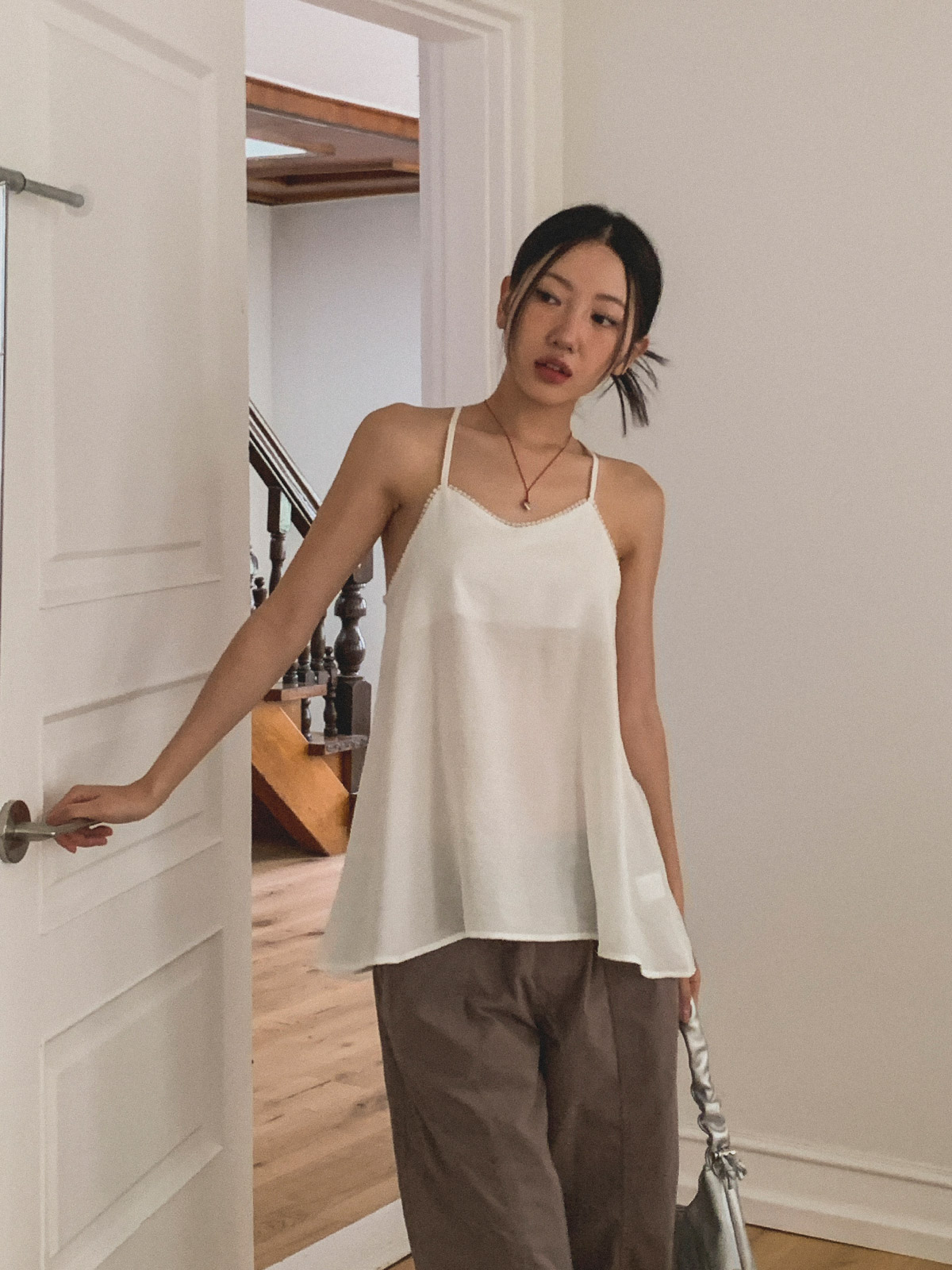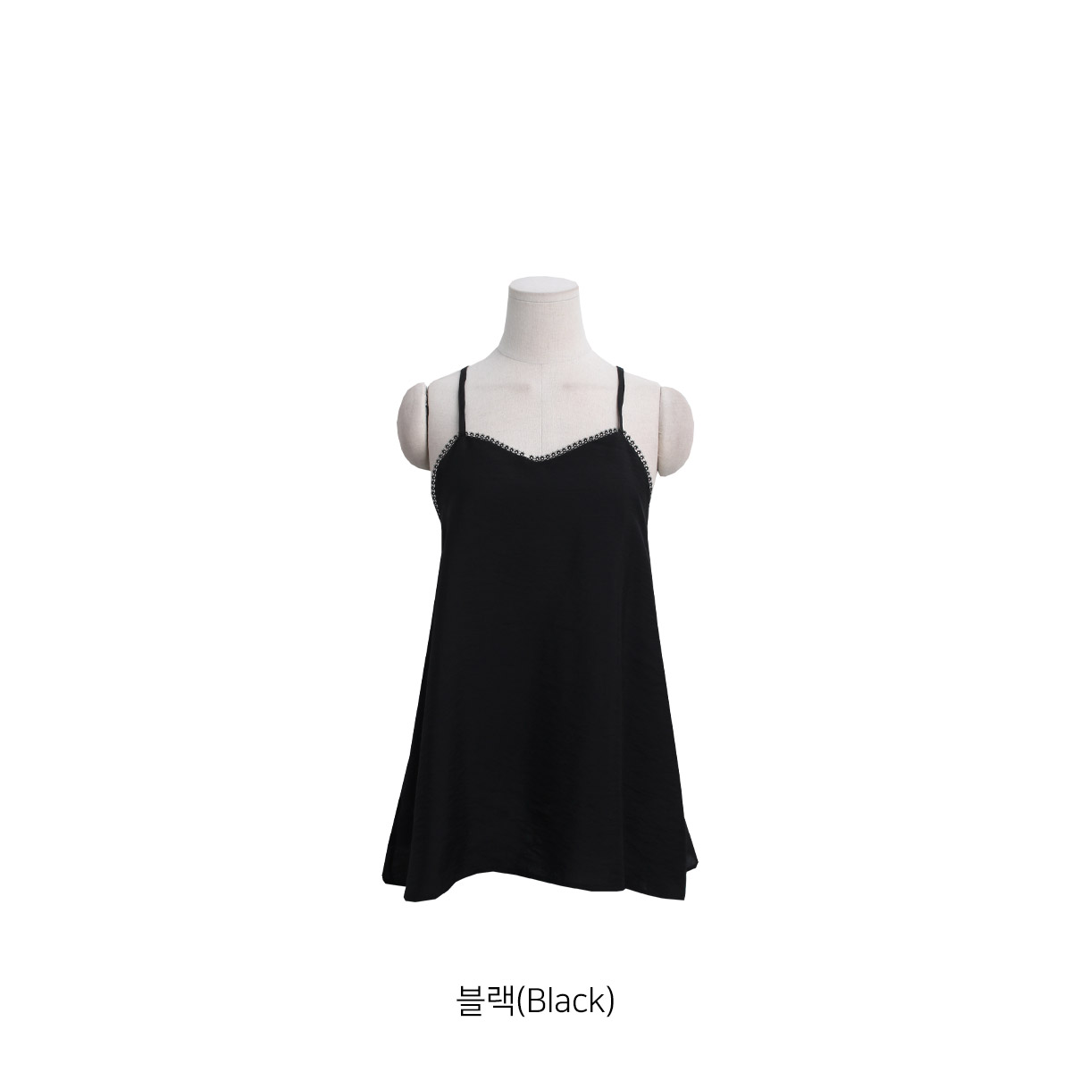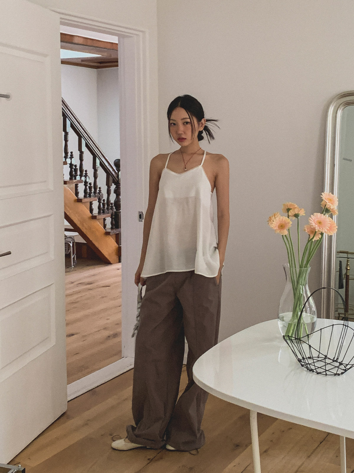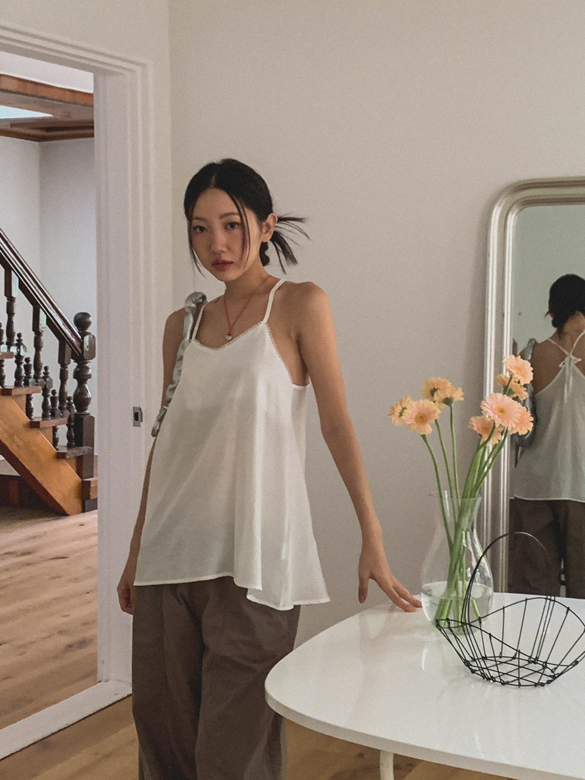 어깨끈이 스트랩으로 디자인되어 뒷면 링에 고정하는 구성으로 흔히 볼 수 없는 유니크한 무드의 끈나시 블라우스