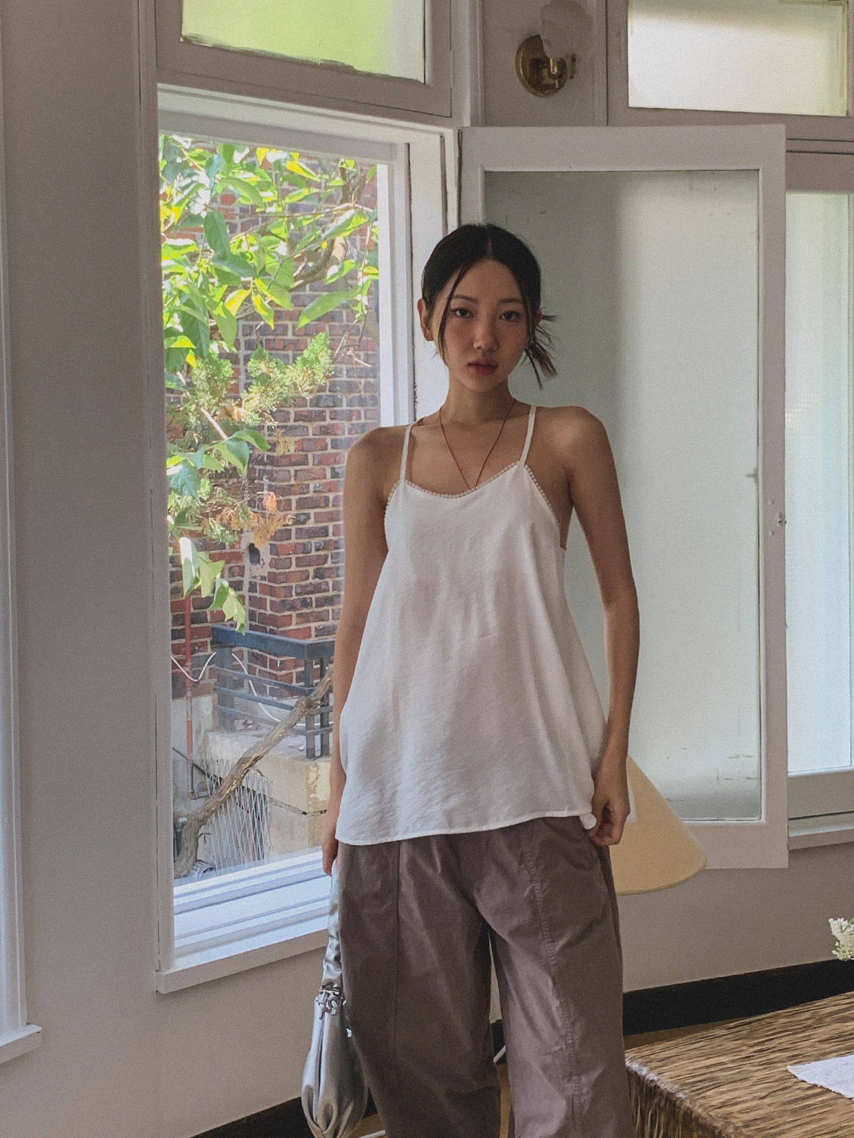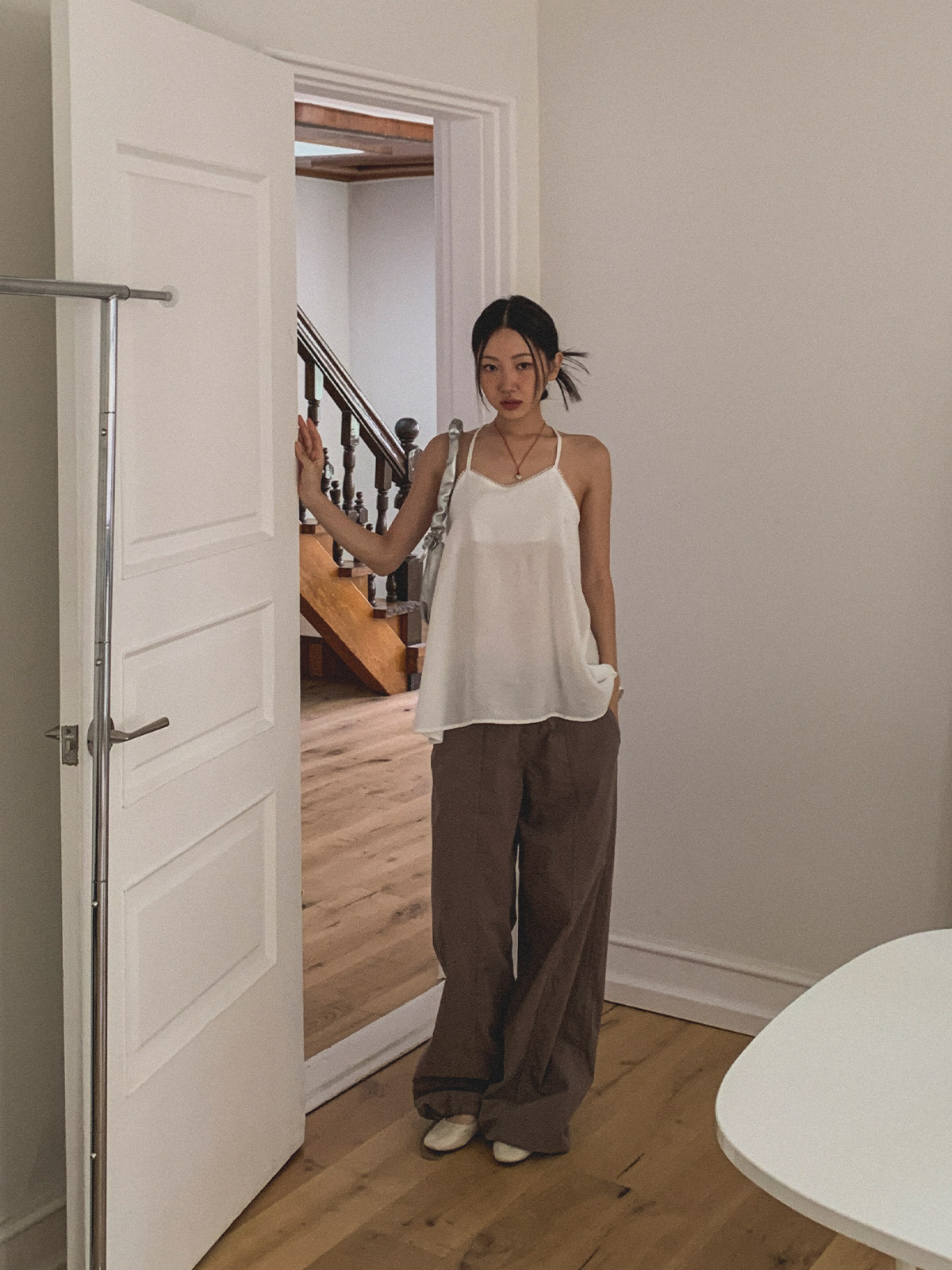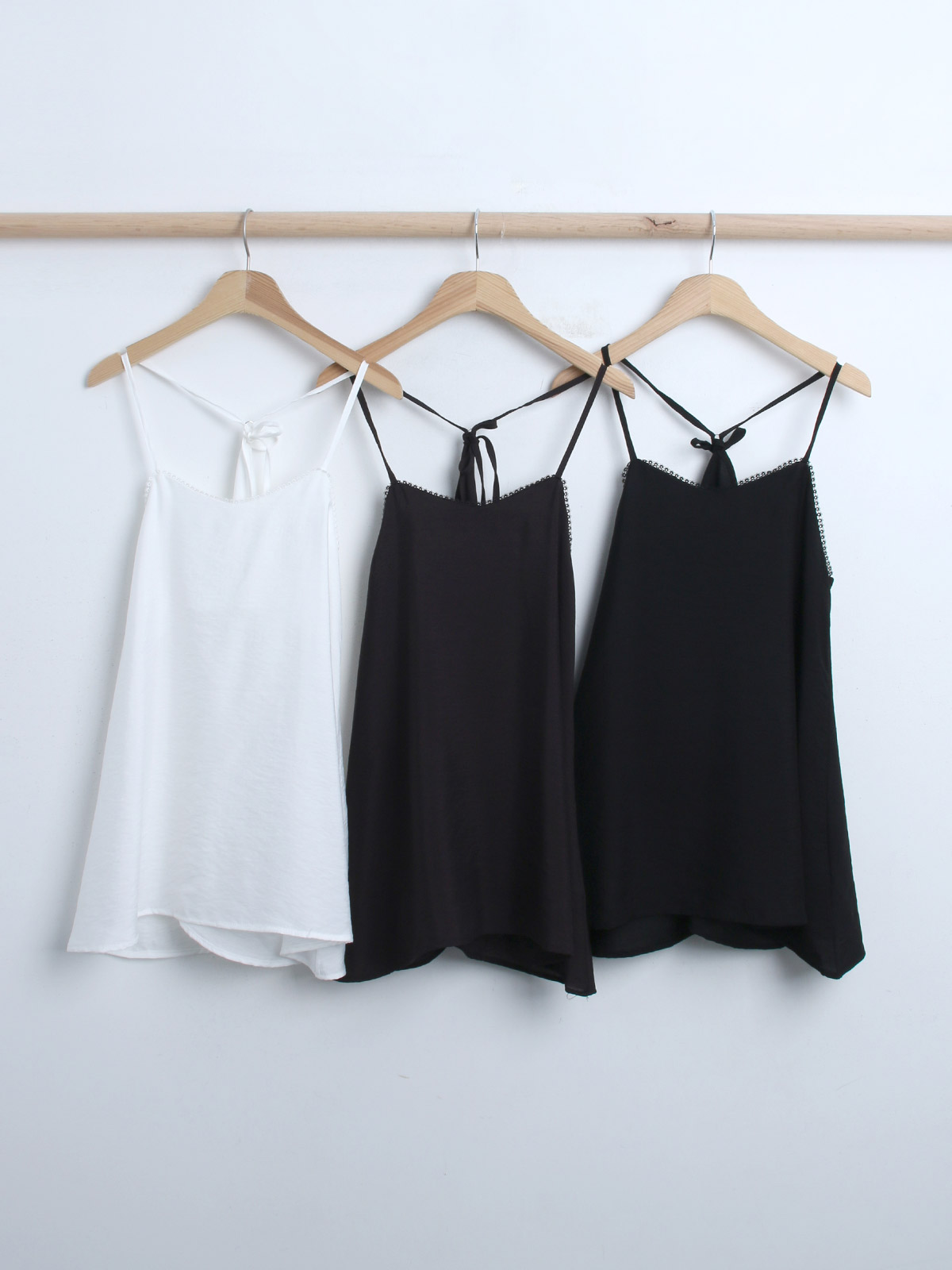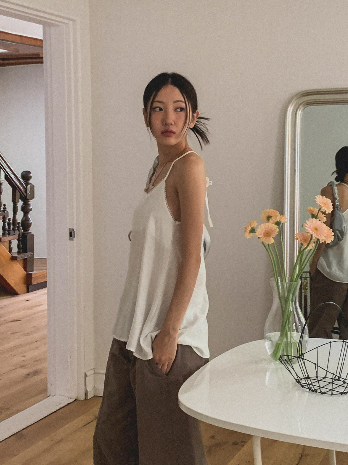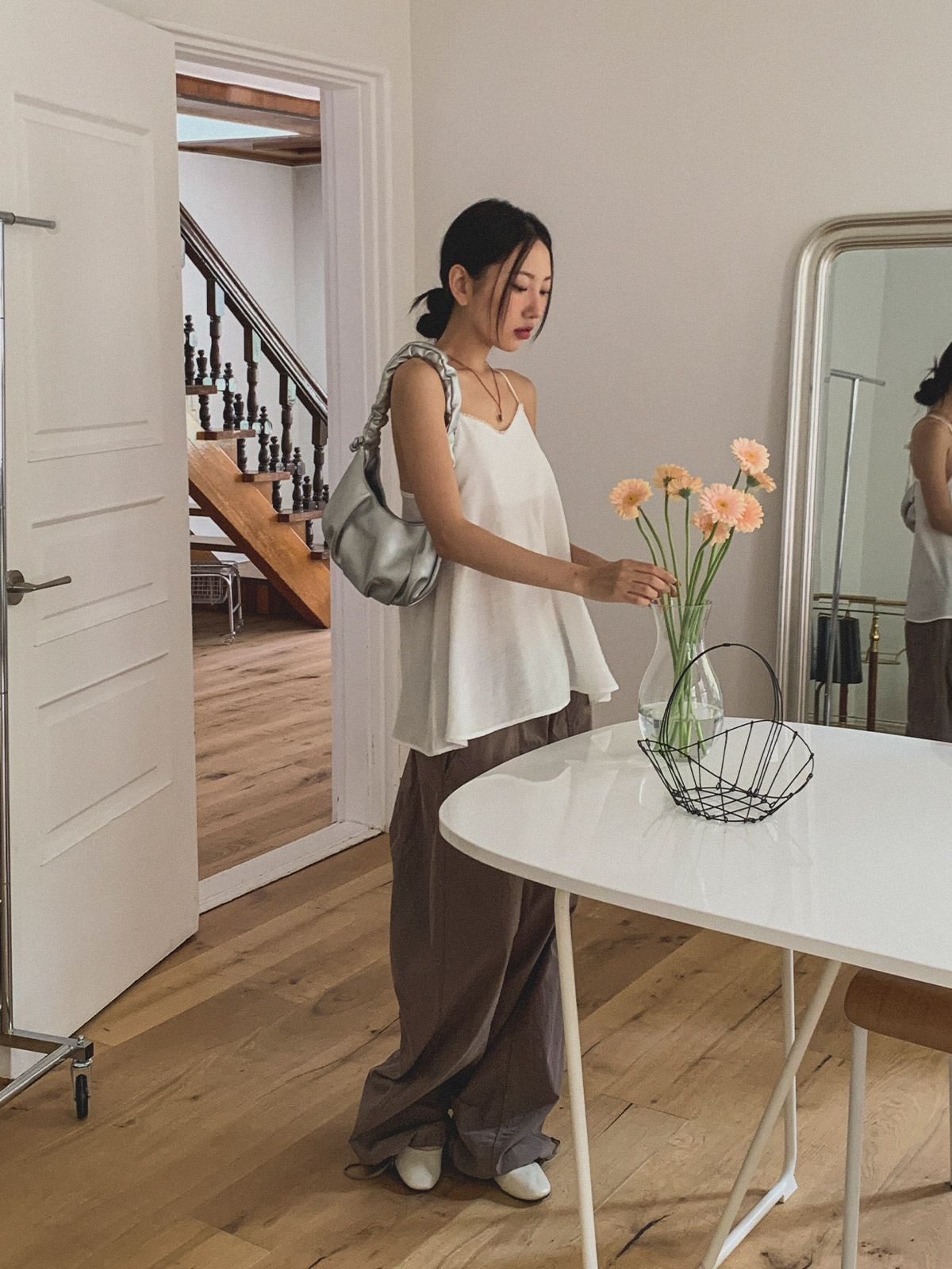 어깨끈이 스트랩으로 디자인되어 뒷면 링에 고정하는 구성으로 흔히 볼 수 없는 유니크한 무드의 끈나시 블라우스