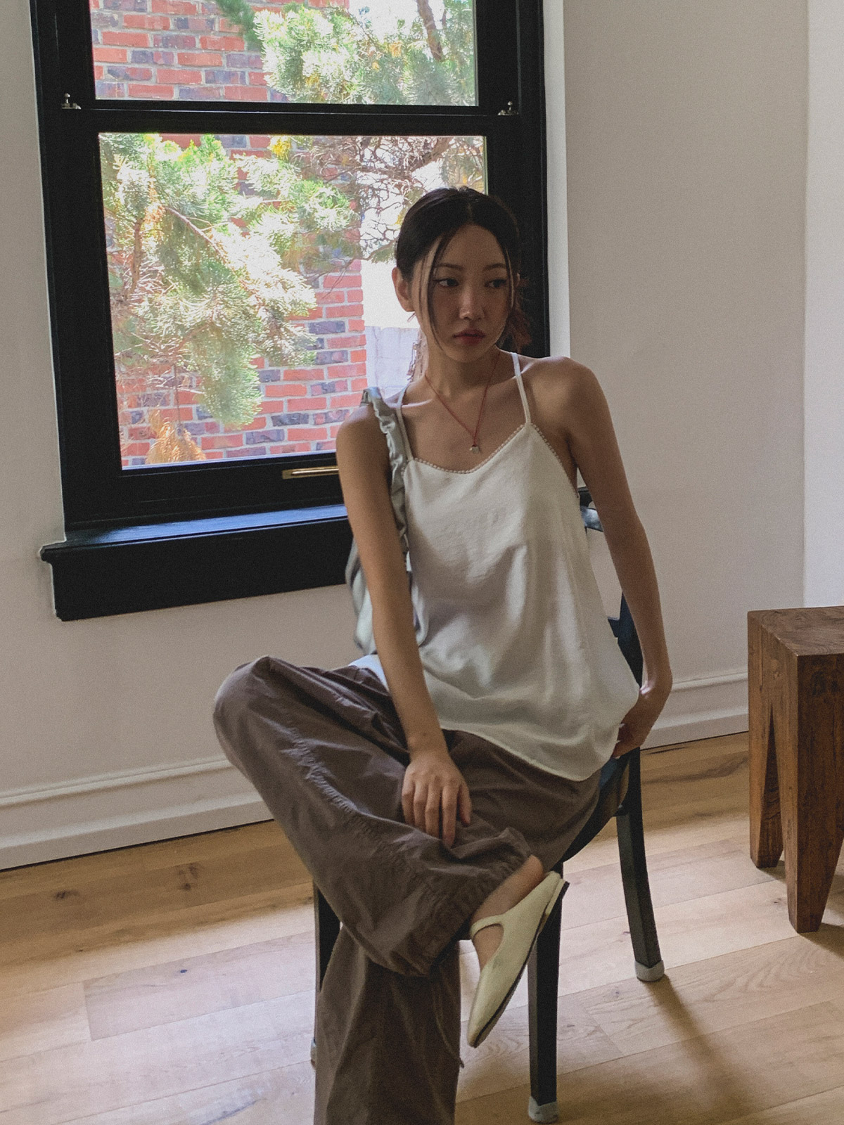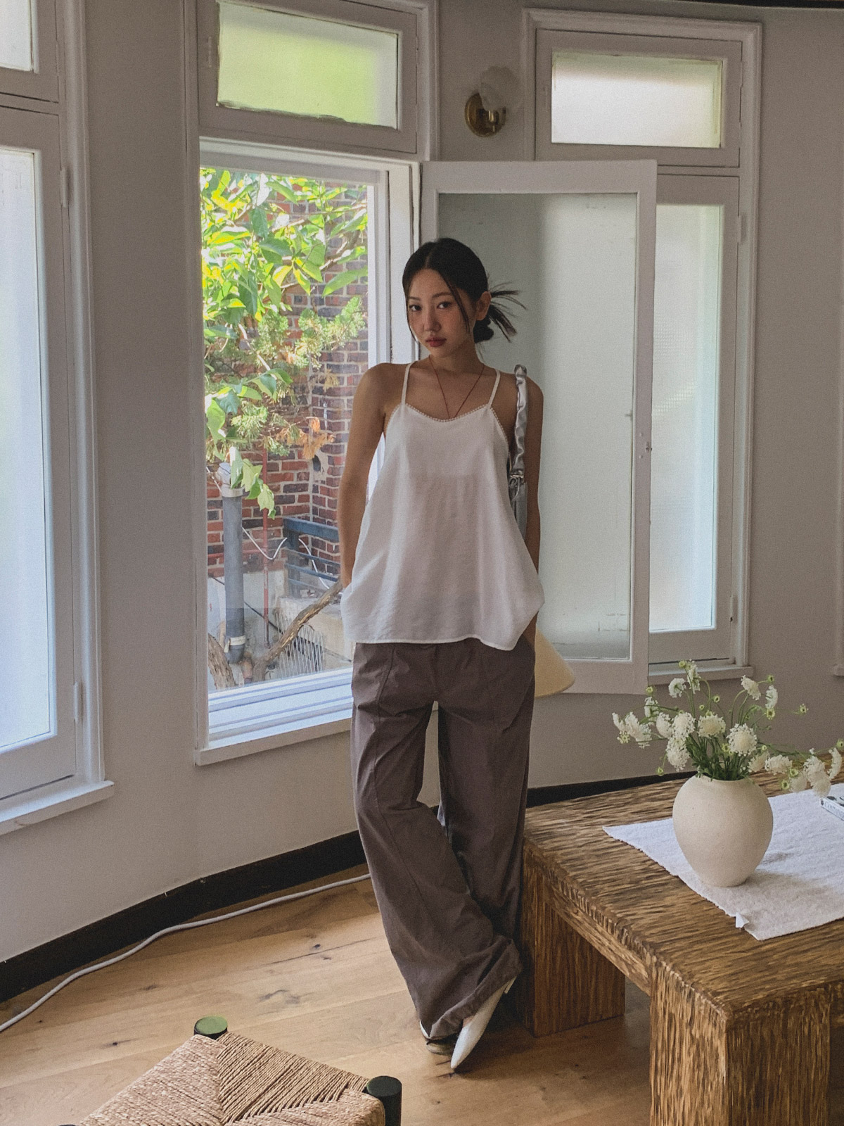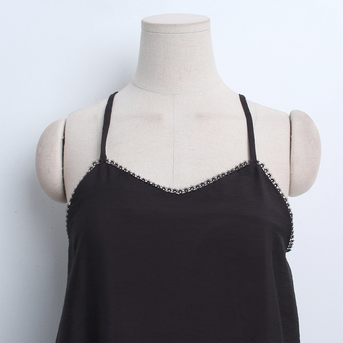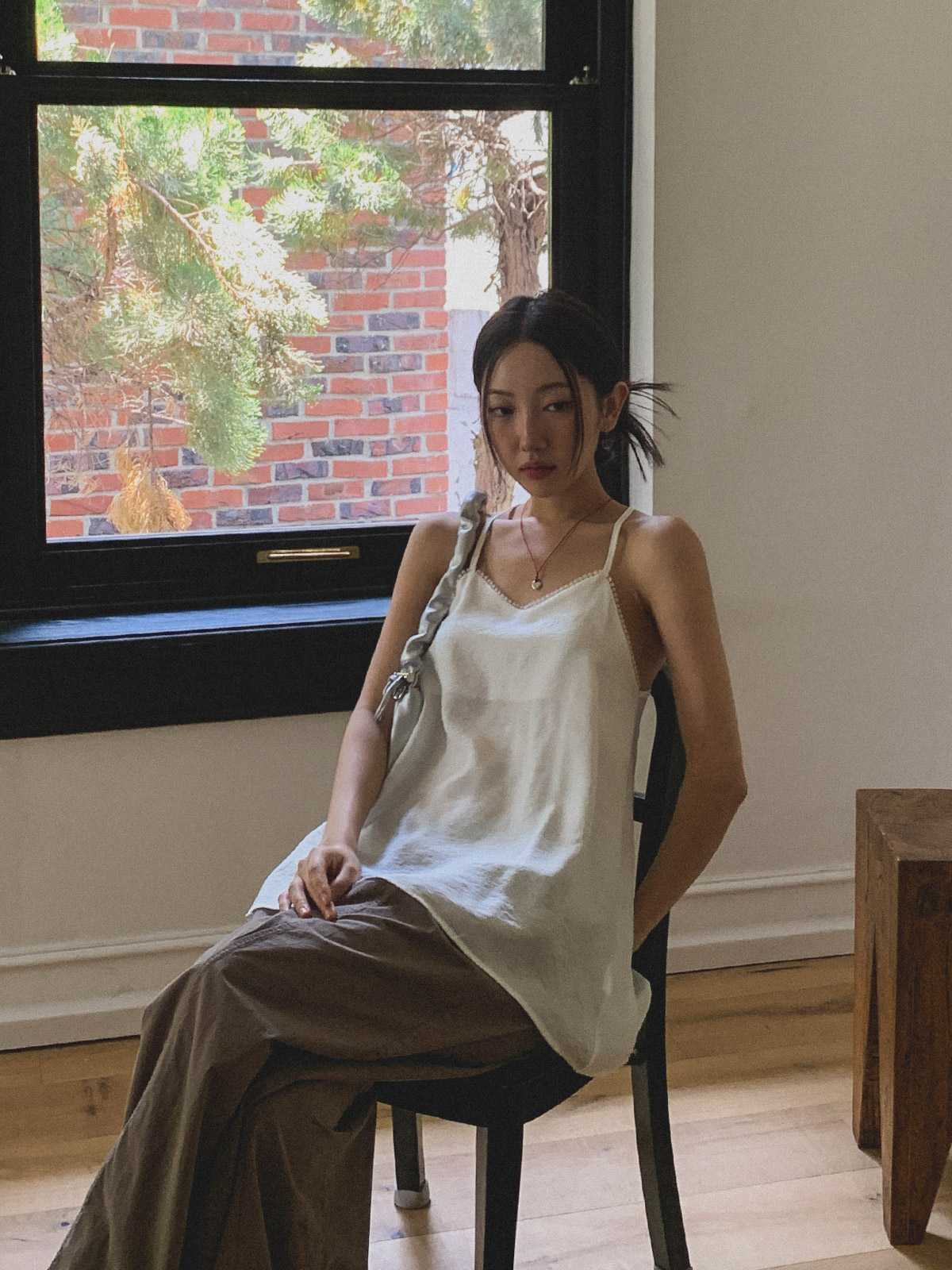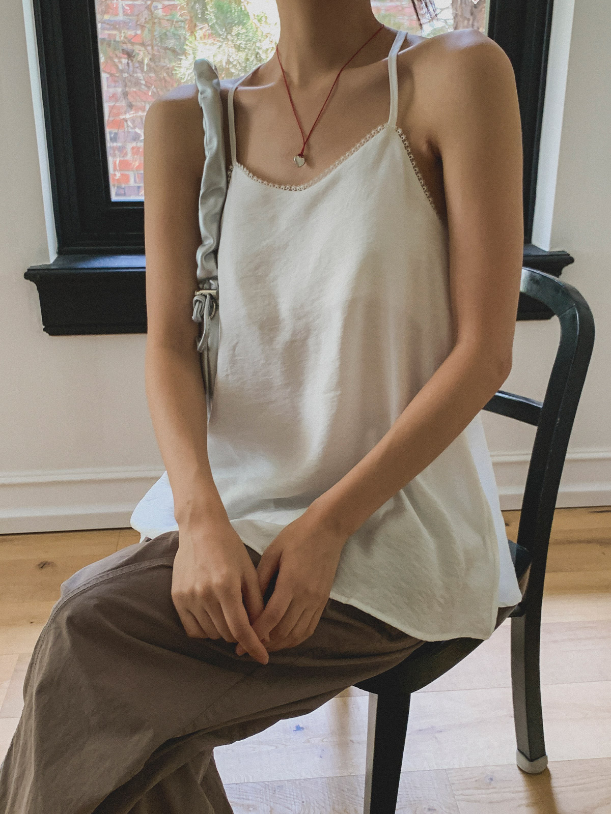 어깨끈이 스트랩으로 디자인되어 뒷면 링에 고정하는 구성으로 흔히 볼 수 없는 유니크한 무드의 끈나시 블라우스