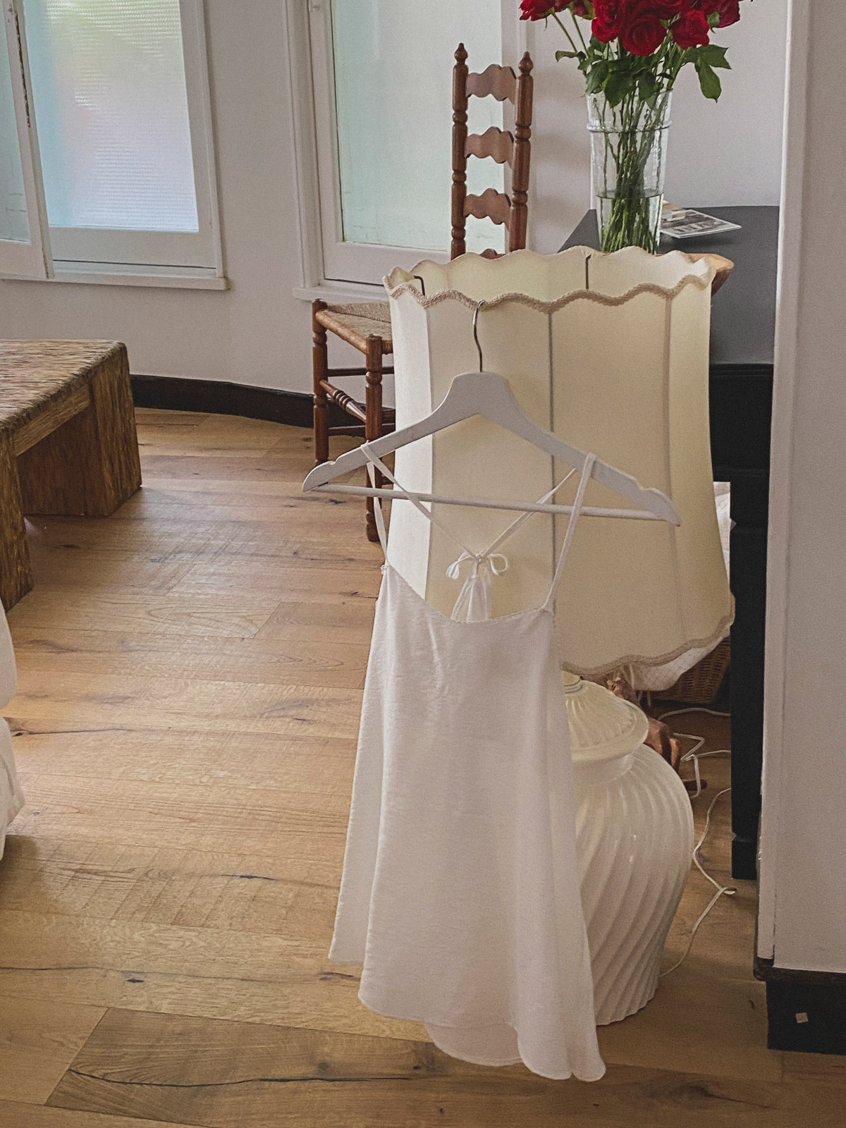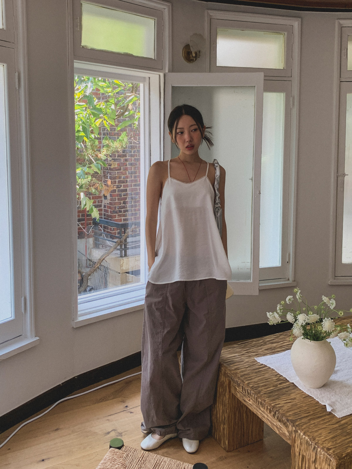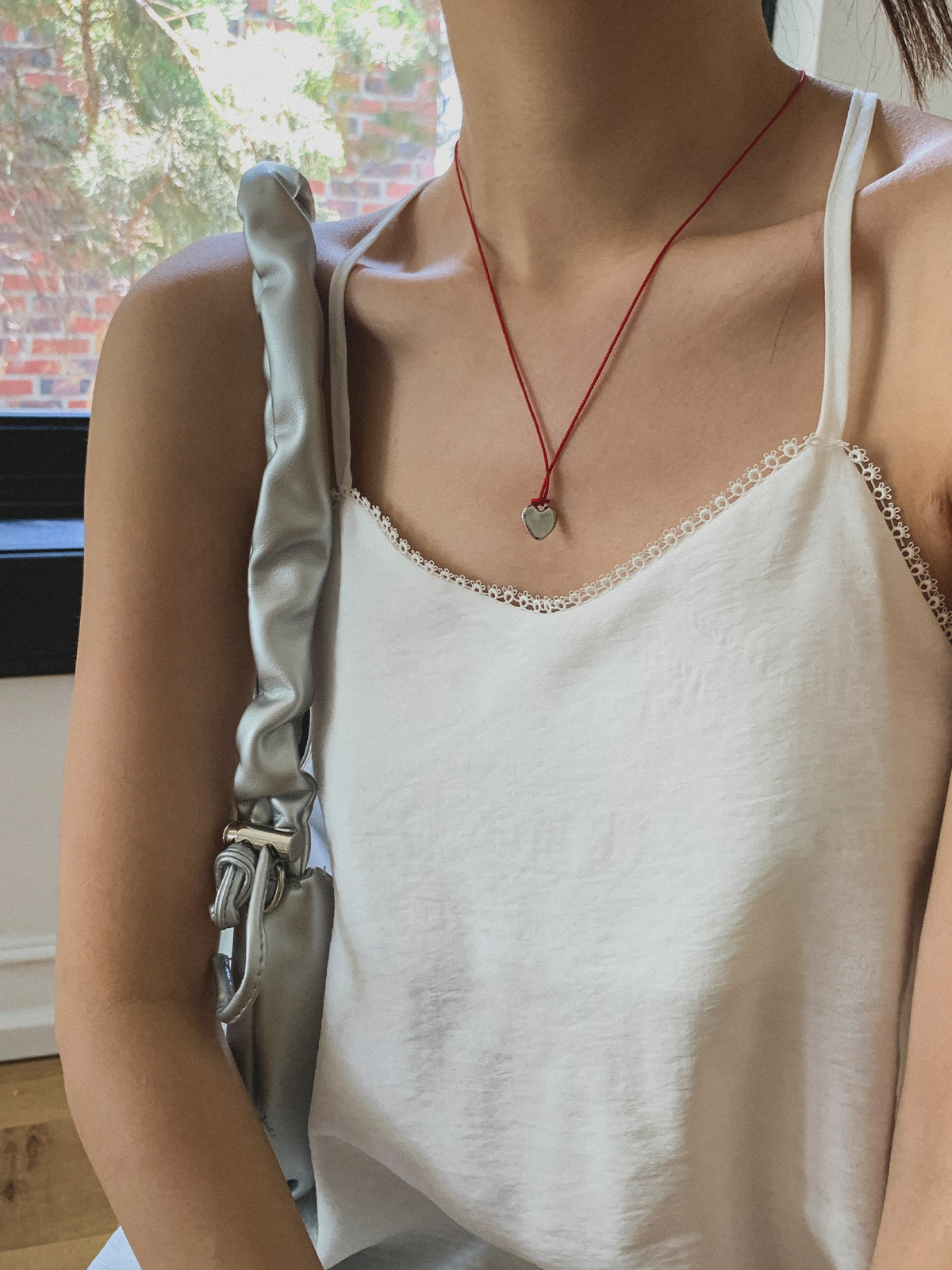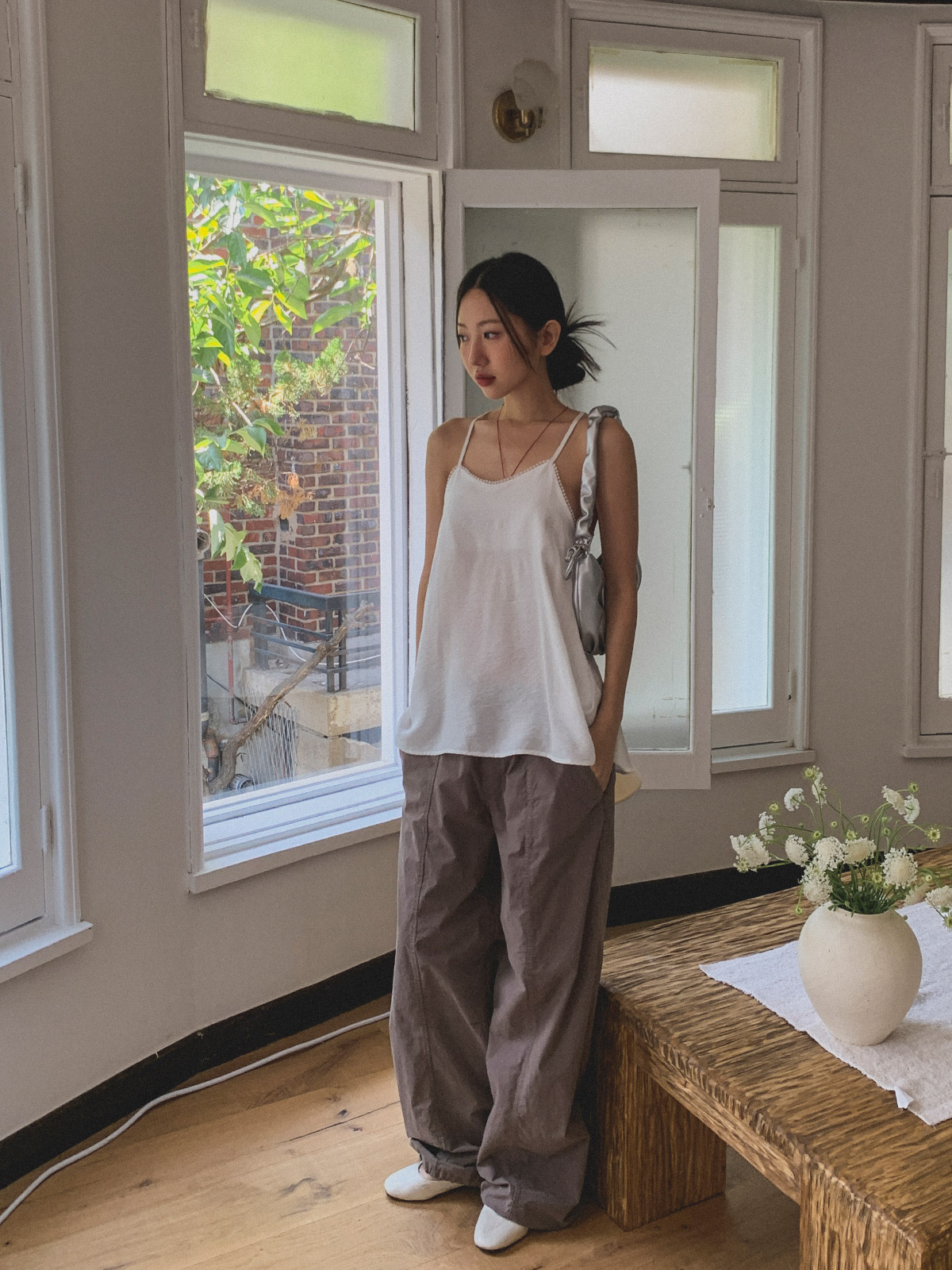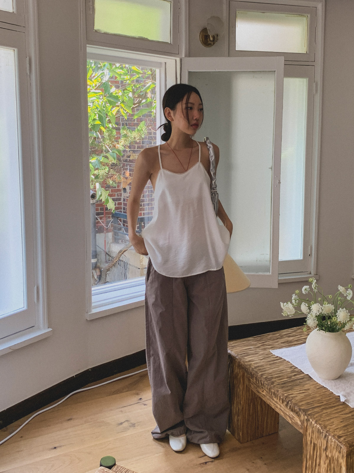 어깨끈이 스트랩으로 디자인되어 뒷면 링에 고정하는 구성으로 흔히 볼 수 없는 유니크한 무드의 끈나시 블라우스