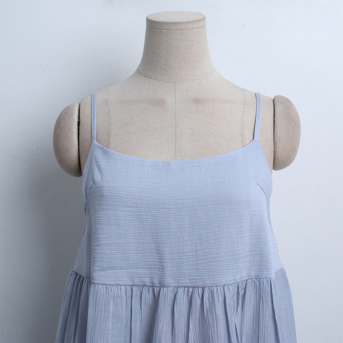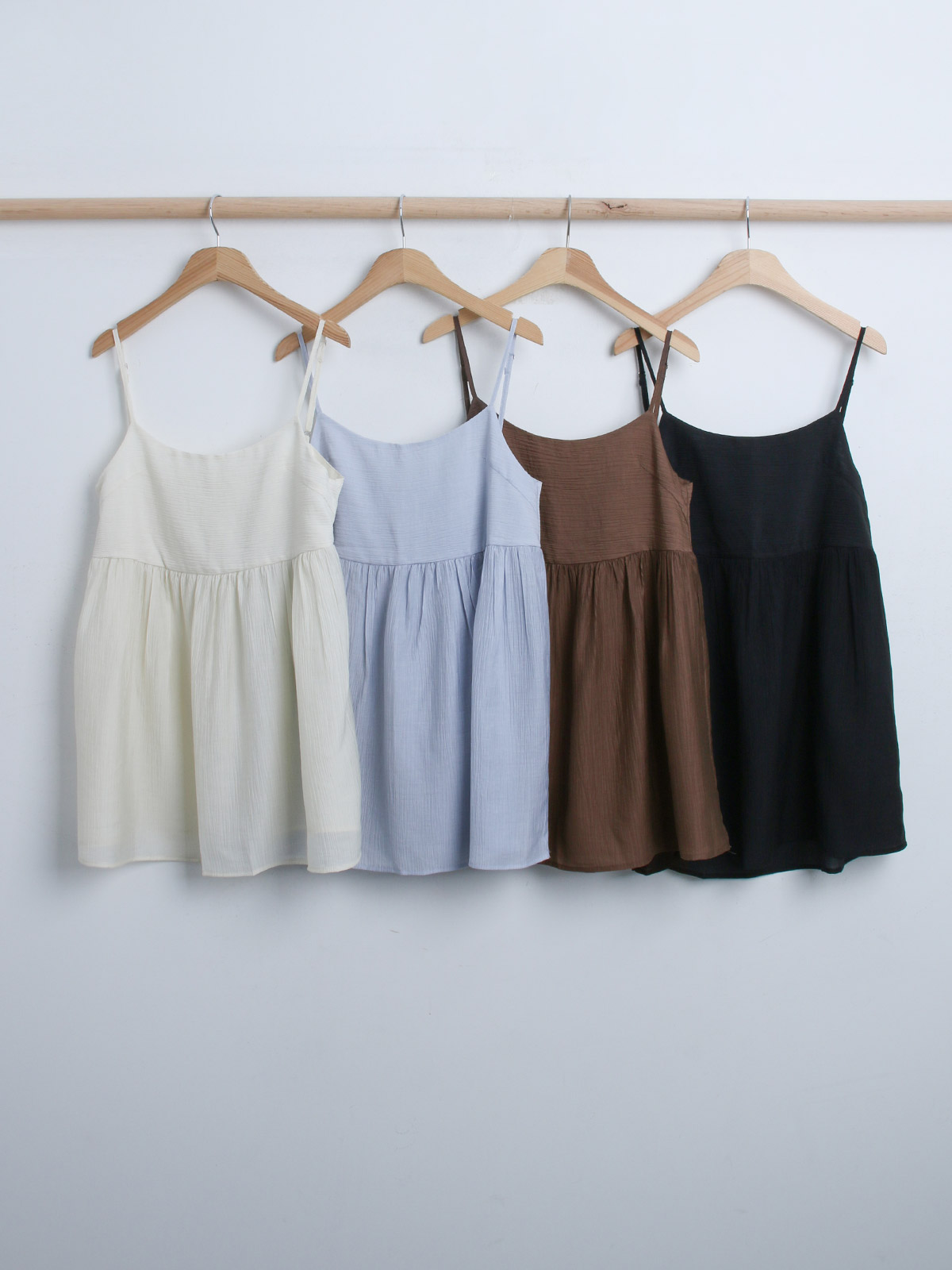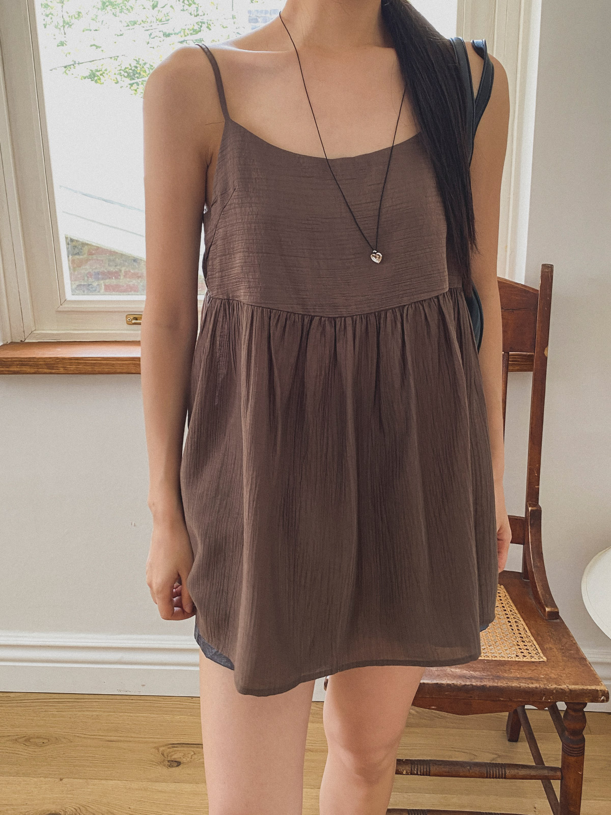 주름 플레어 스타일로 페미닌하고 뒷버튼이 포인트가 있어 밋밋하지 않은 가벼운 쉬폰 소재의 끈나시 블라우스