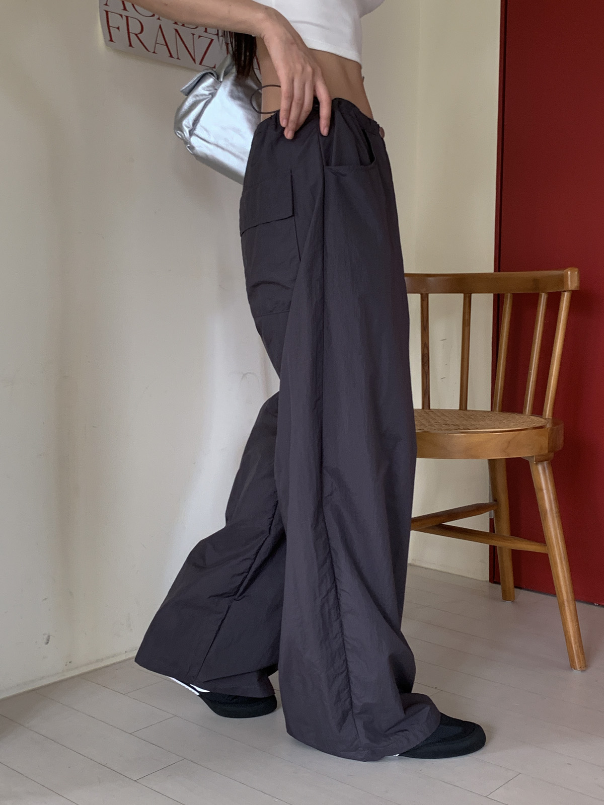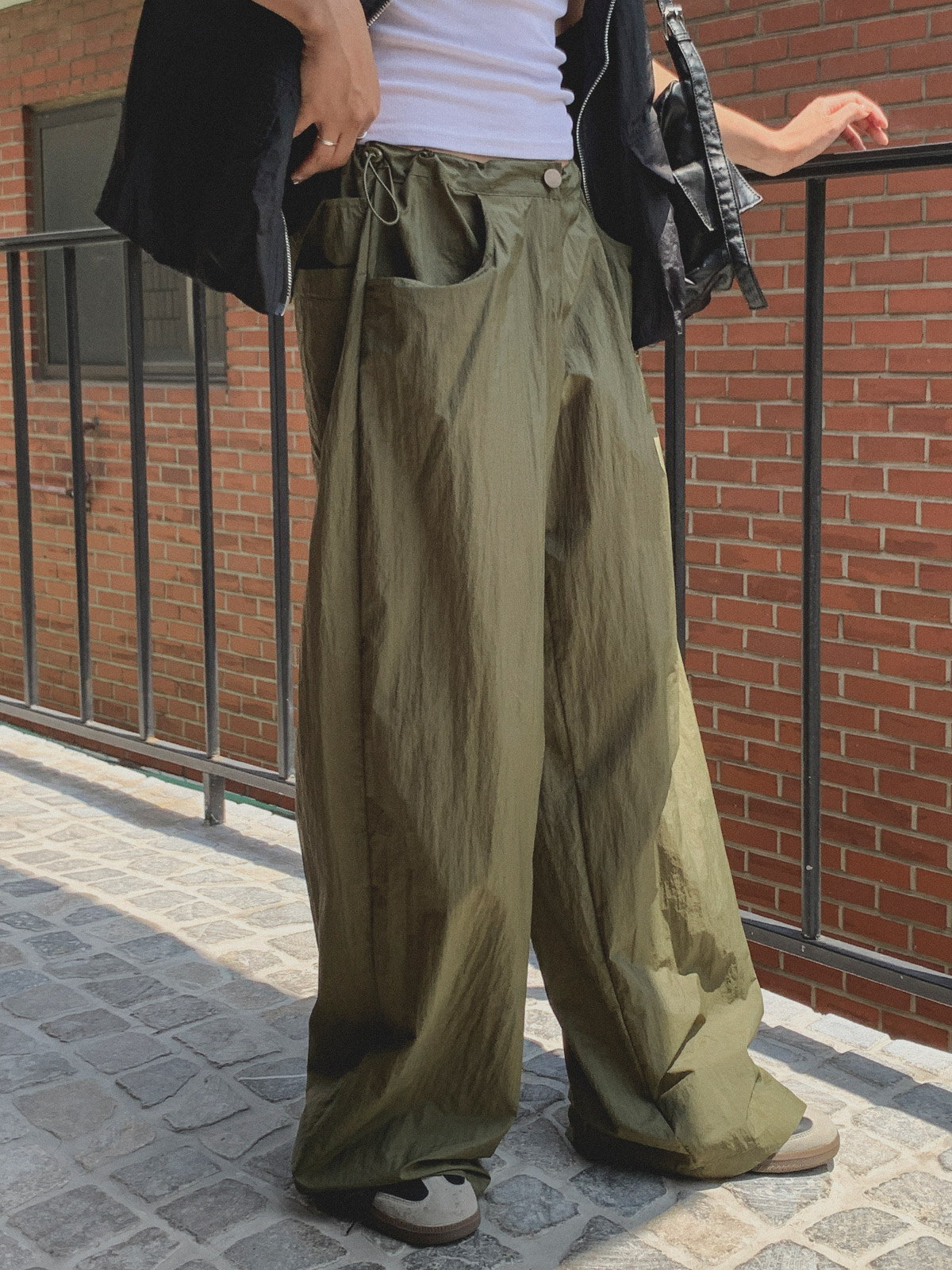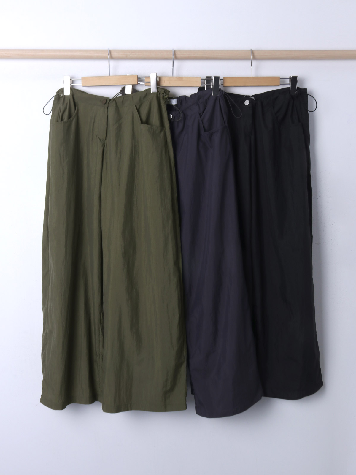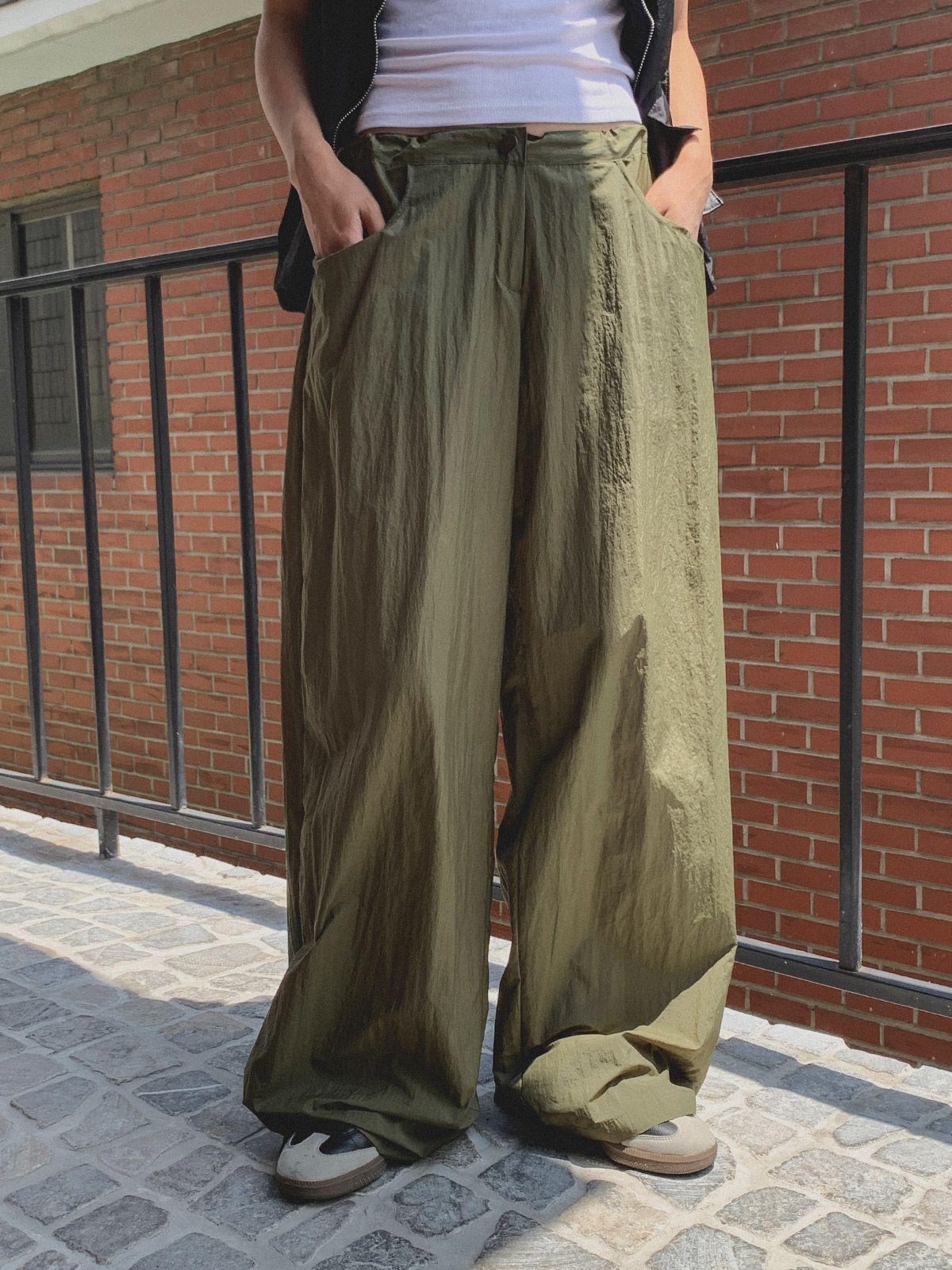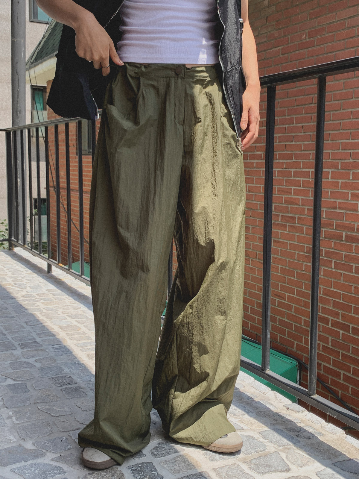 얇고 가벼운 나일론 원단으로 여름에도 답답하지 않게 착용이 가능하며, 체형 부각 걱정없이 데일리로 입기 좋은 팬츠로 추천해요~!