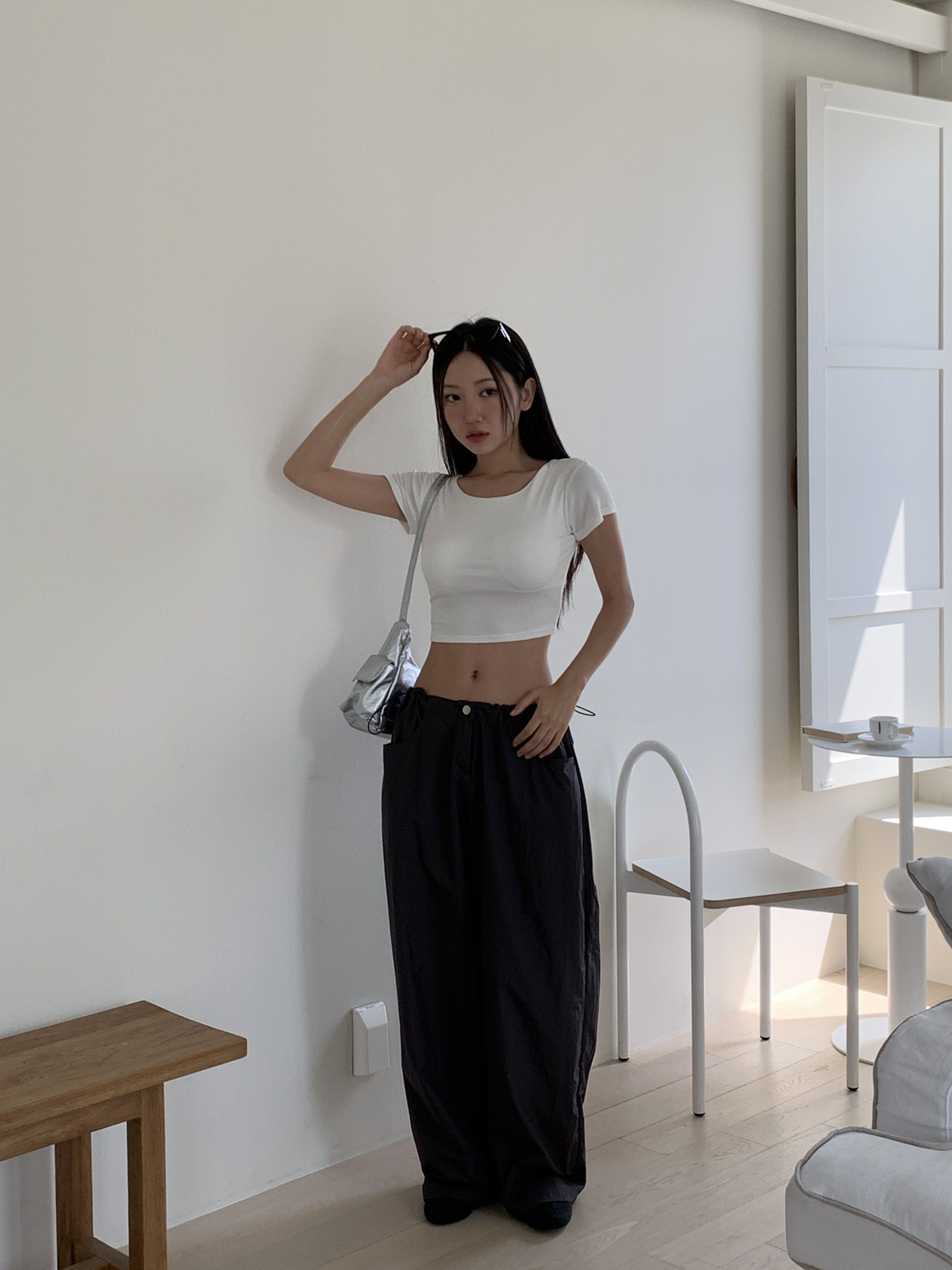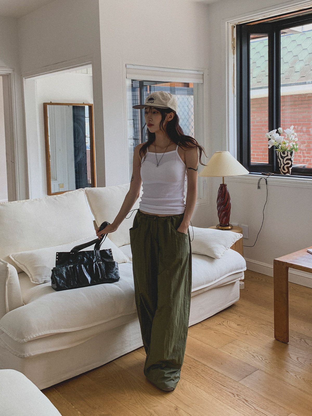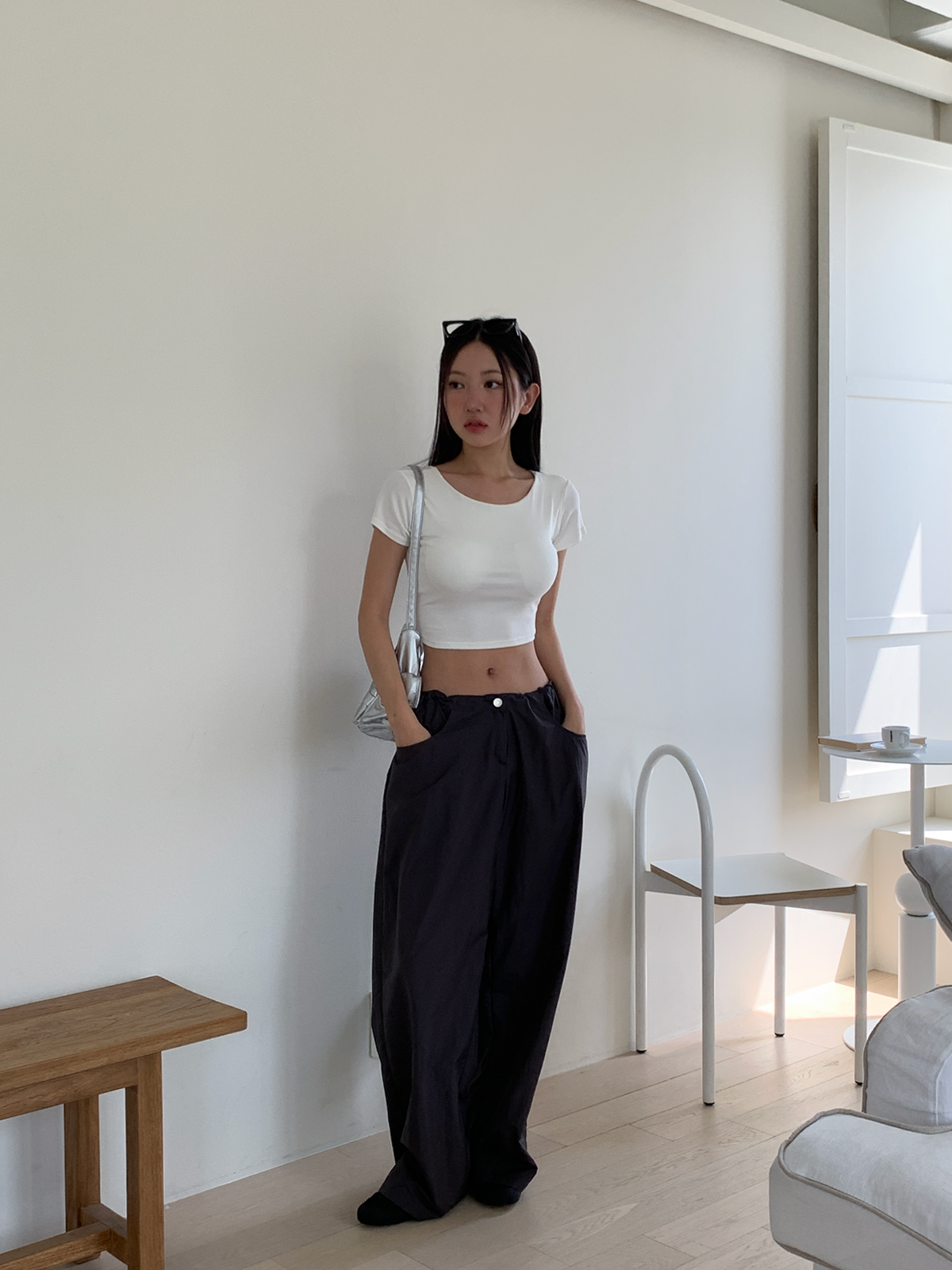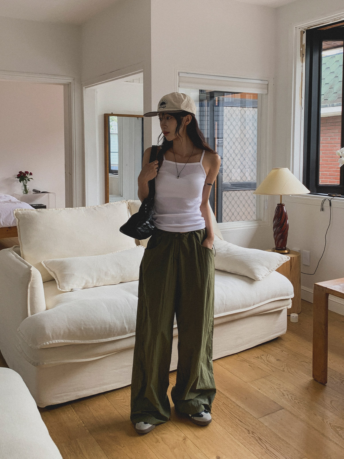 얇고 가벼운 나일론 원단으로 여름에도 답답하지 않게 착용이 가능하며, 체형 부각 걱정없이 데일리로 입기 좋은 팬츠로 추천해요~!