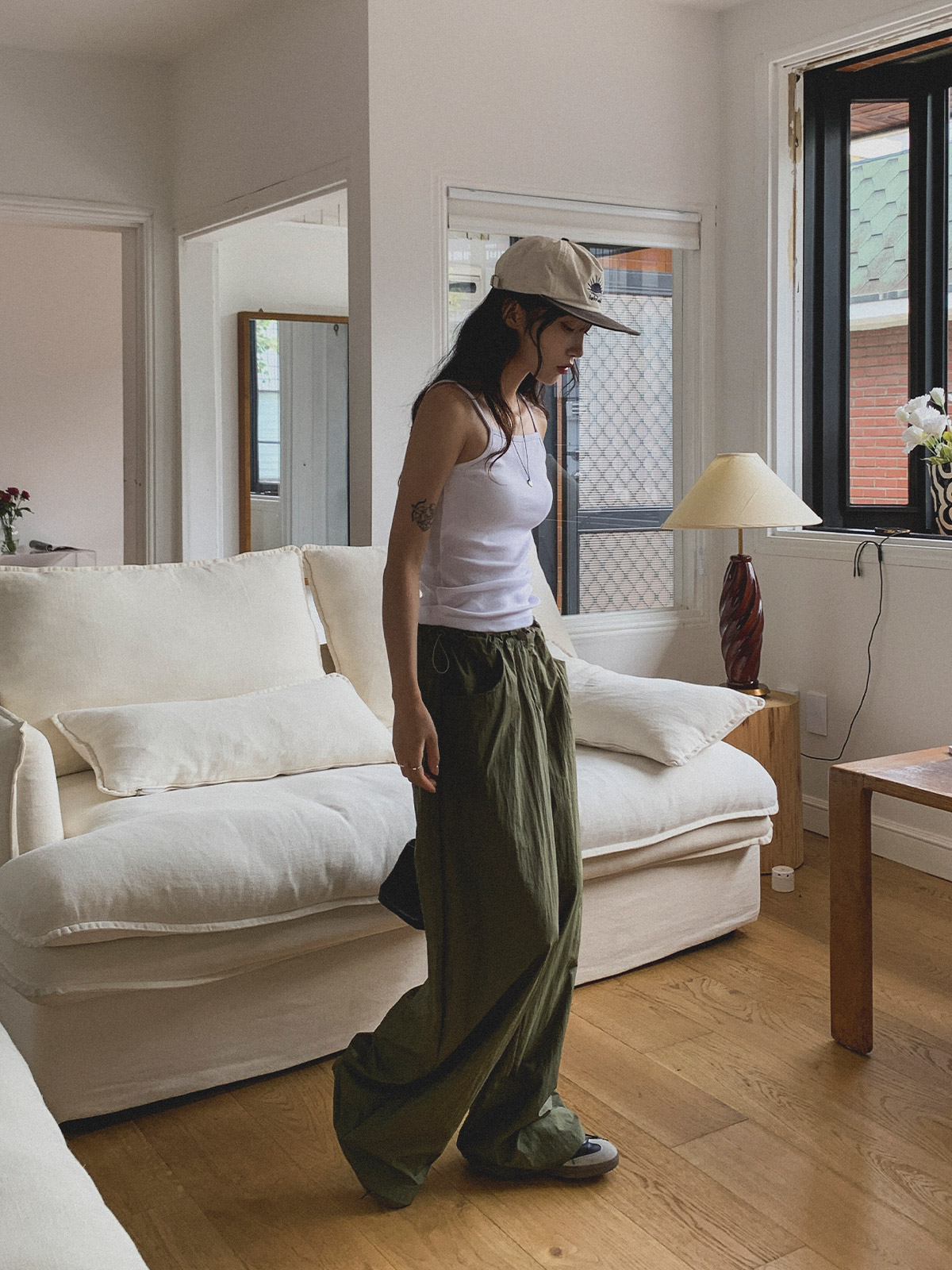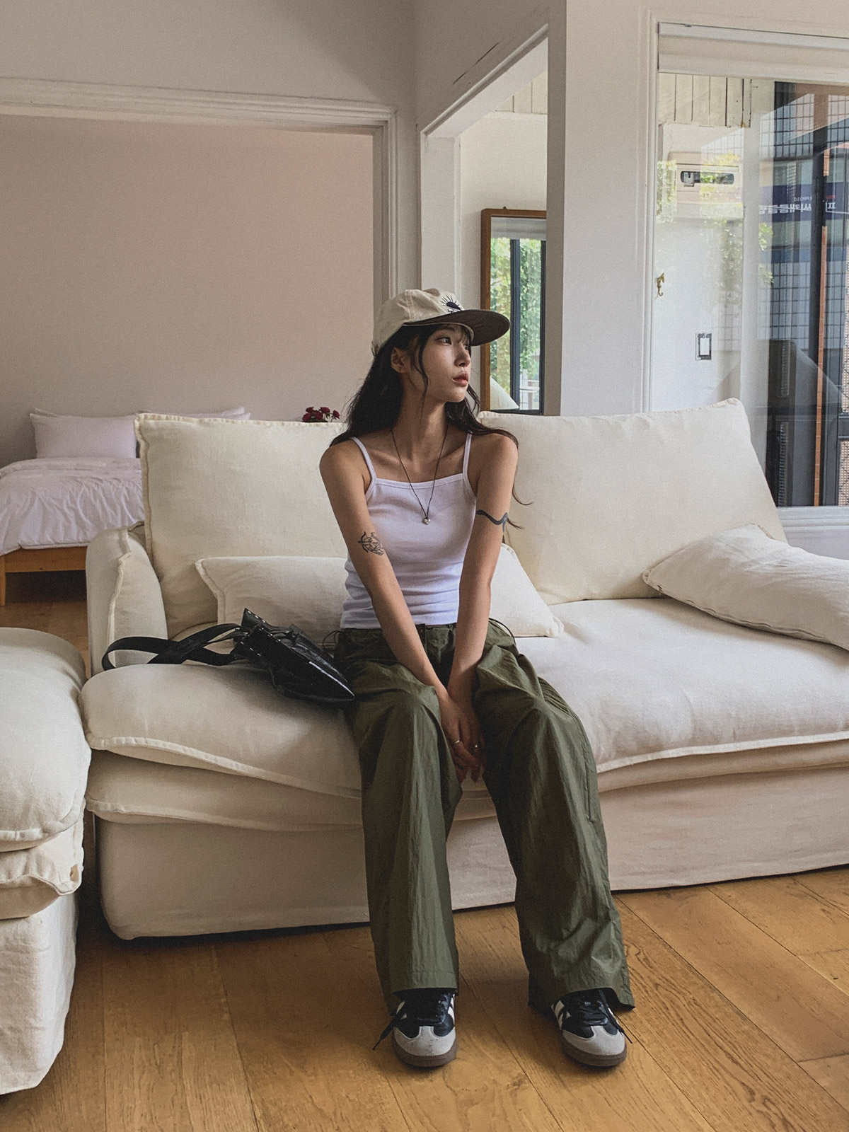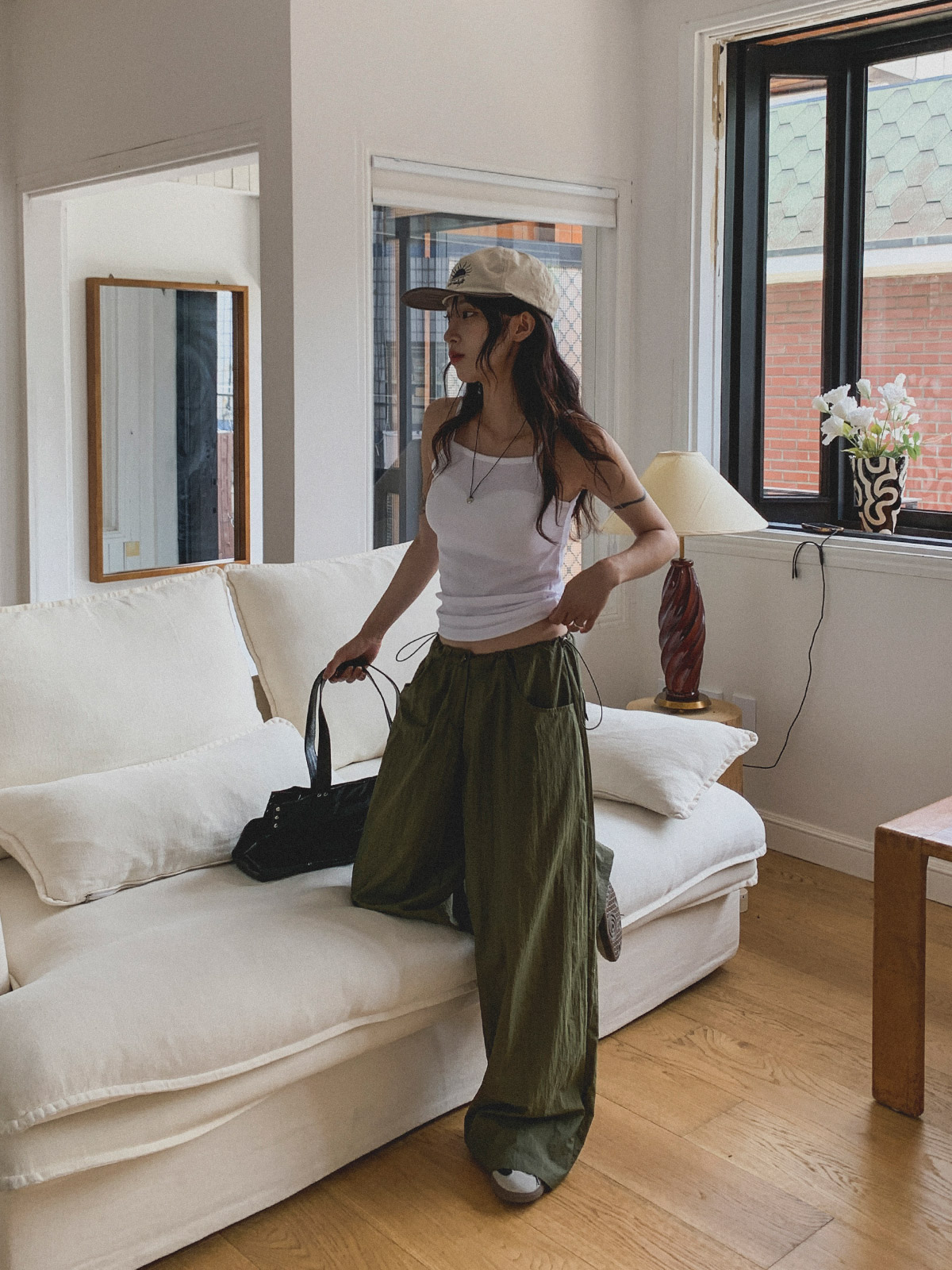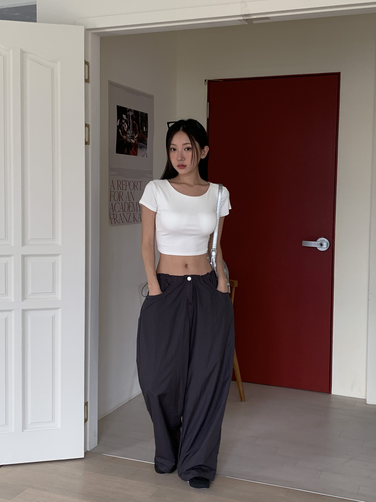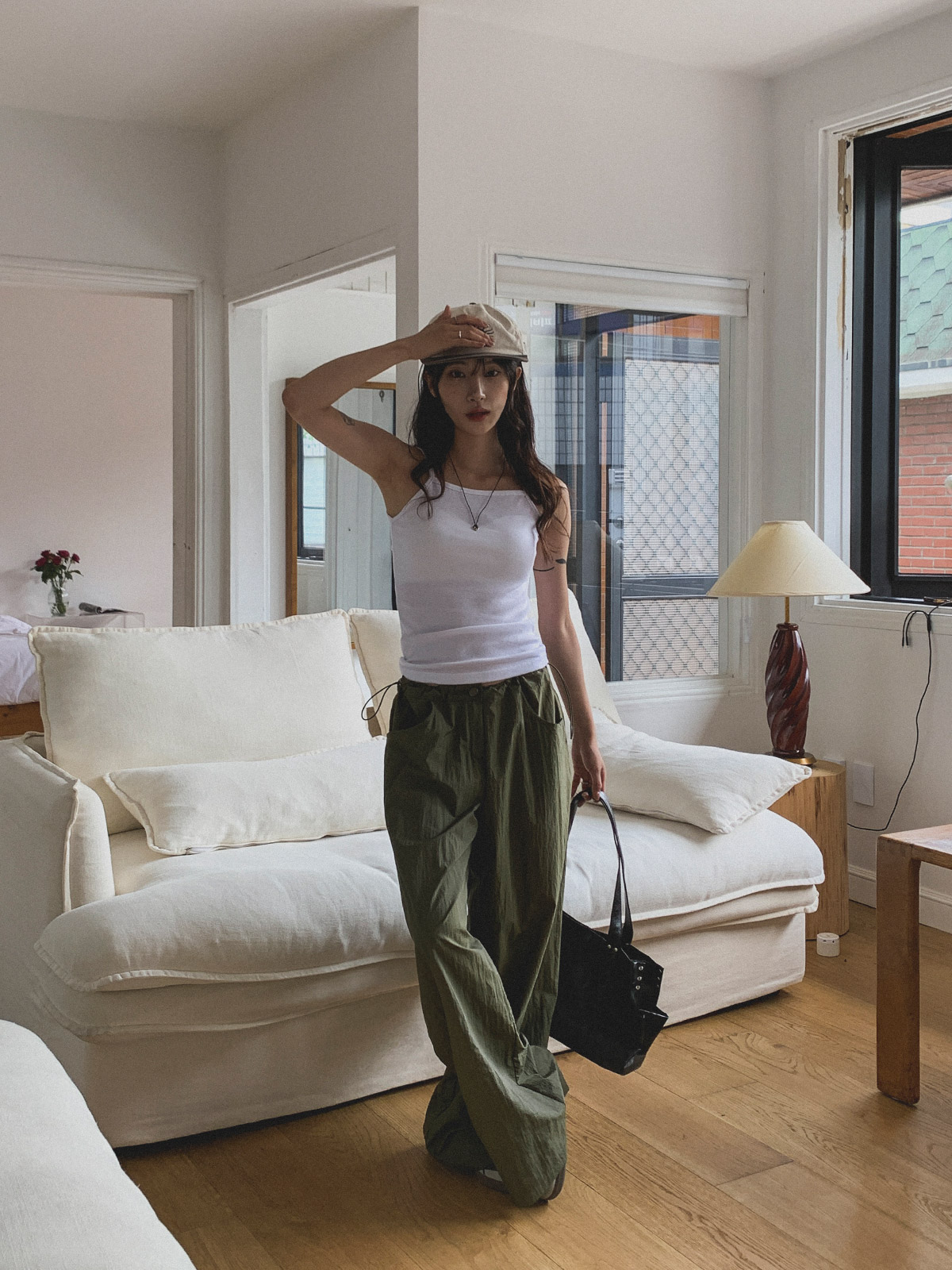 얇고 가벼운 나일론 원단으로 여름에도 답답하지 않게 착용이 가능하며, 체형 부각 걱정없이 데일리로 입기 좋은 팬츠로 추천해요~!