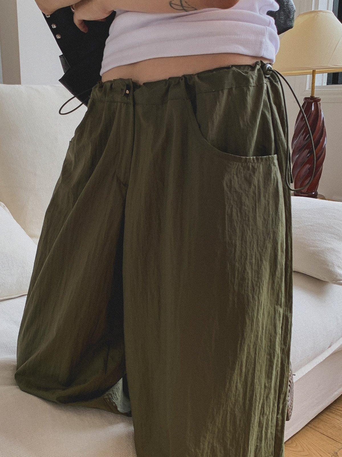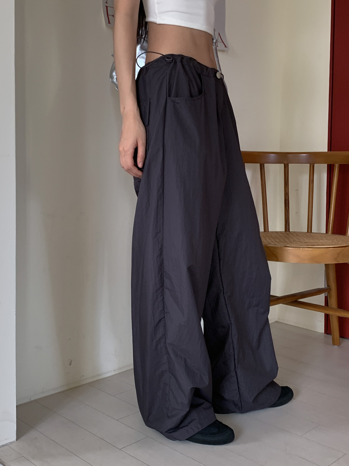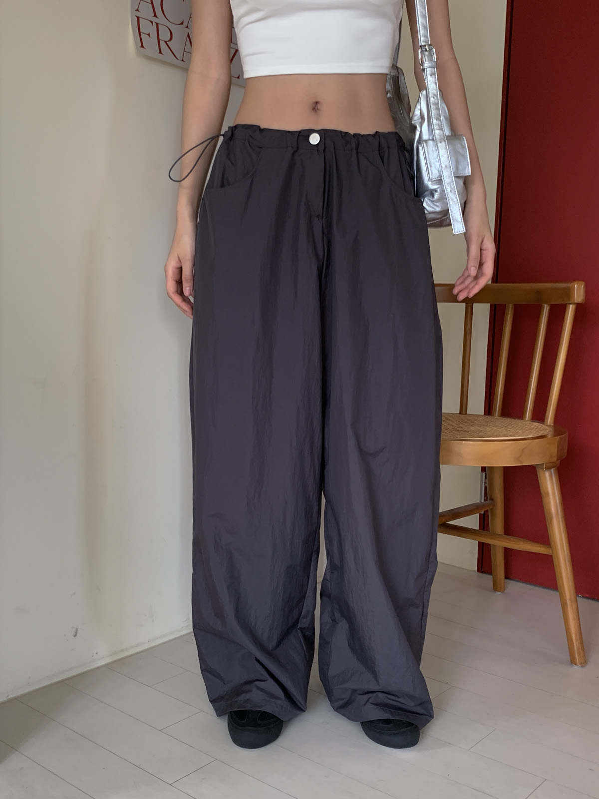 넉넉한 허리 사이즈에 스트링 스토퍼를 더해 다양한 체형에도 잘 어울리는 일자 와이드핏 나일론 팬츠