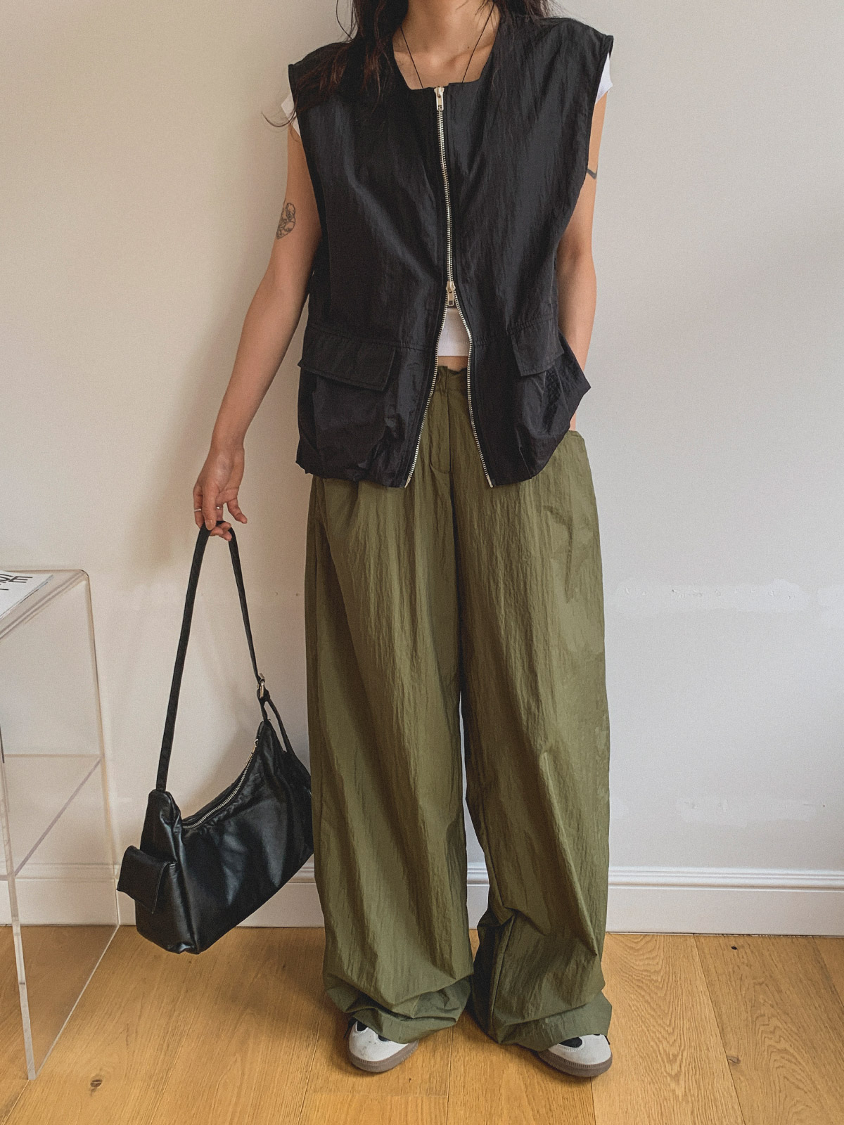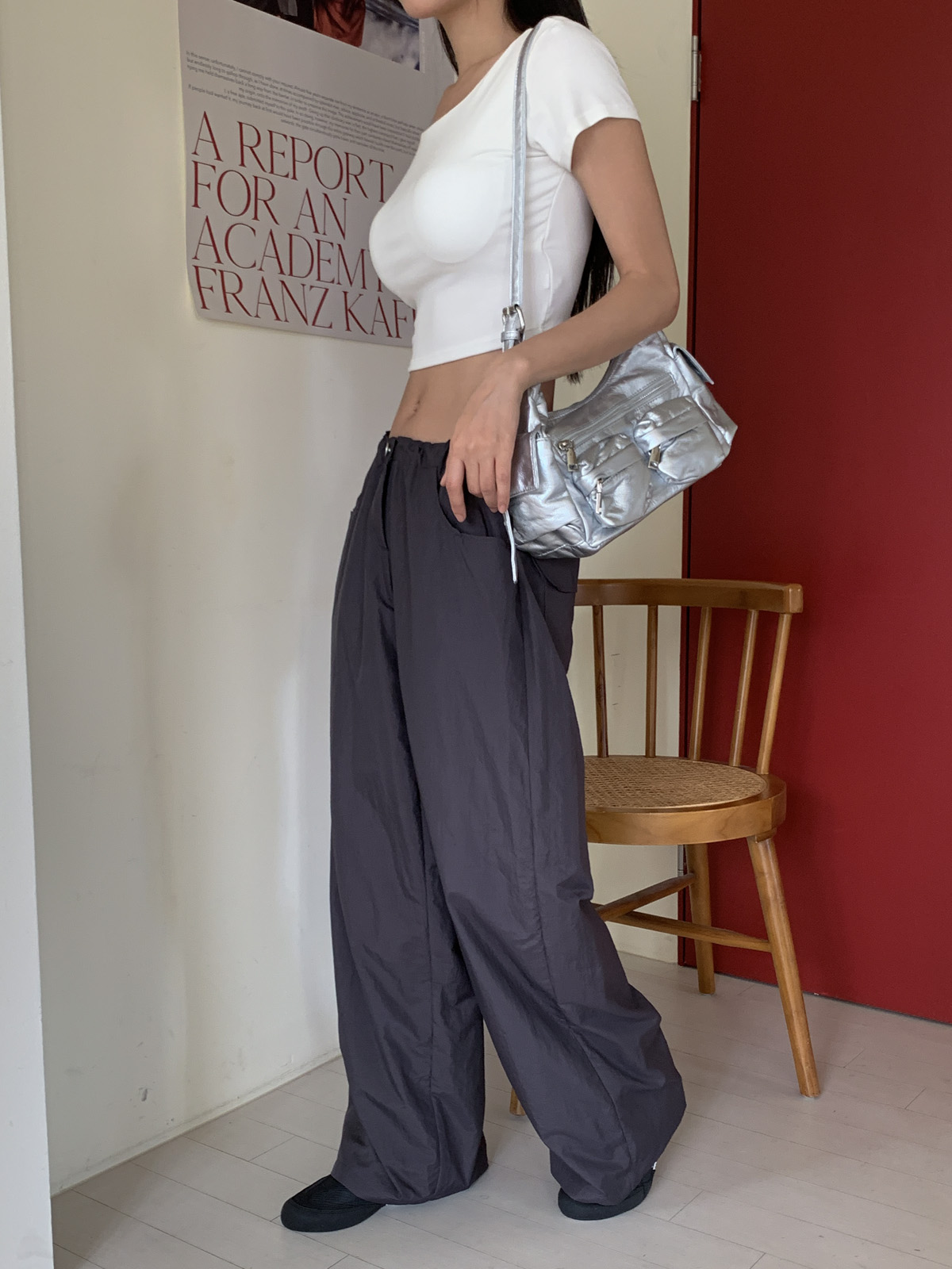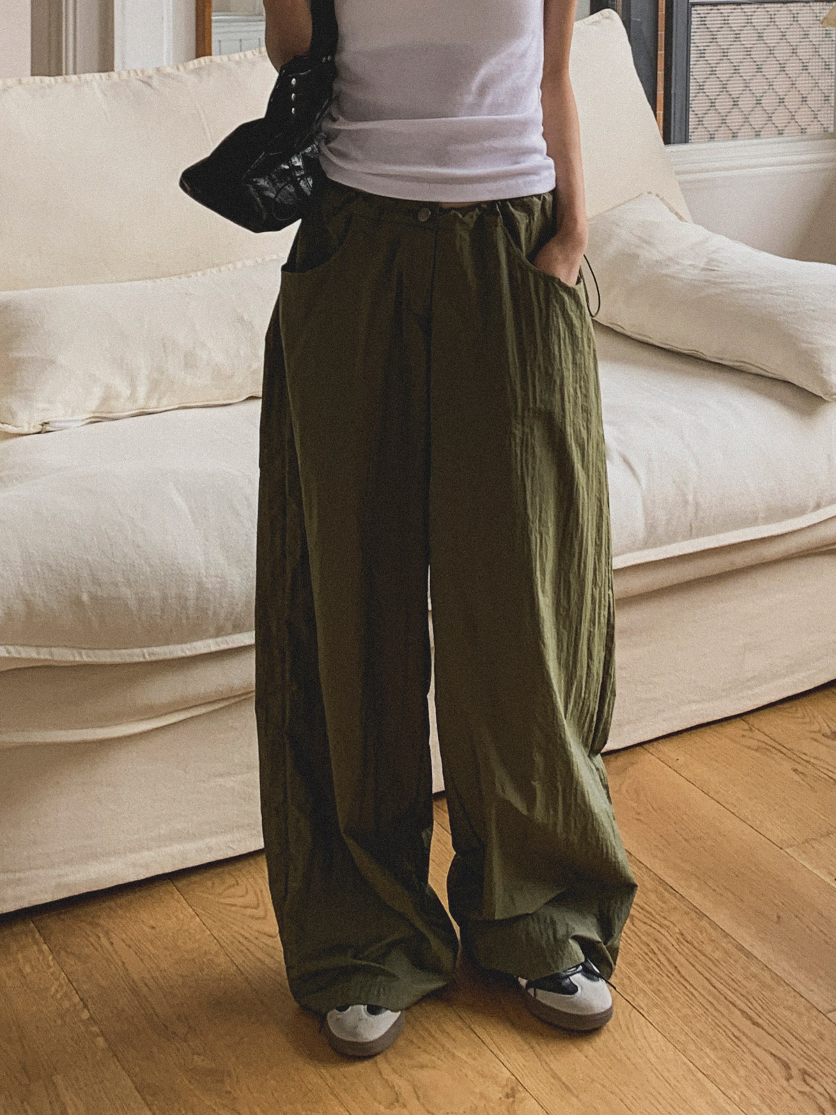 넉넉한 허리 사이즈에 스트링 스토퍼를 더해 다양한 체형에도 잘 어울리는 일자 와이드핏 나일론 팬츠