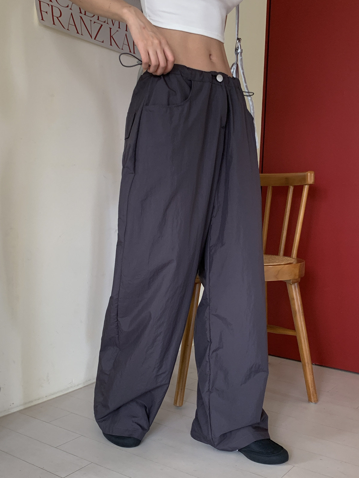 넉넉한 허리 사이즈에 스트링 스토퍼를 더해 다양한 체형에도 잘 어울리는 일자 와이드핏 나일론 팬츠에요!
