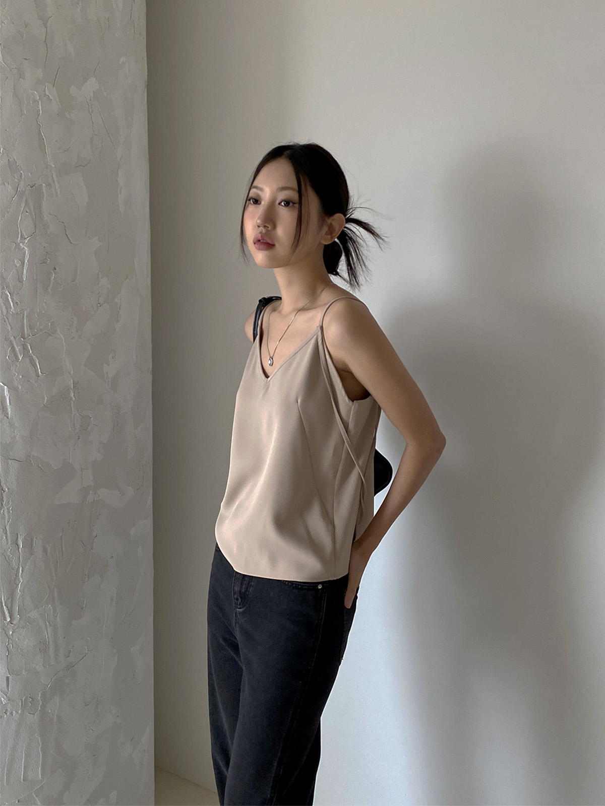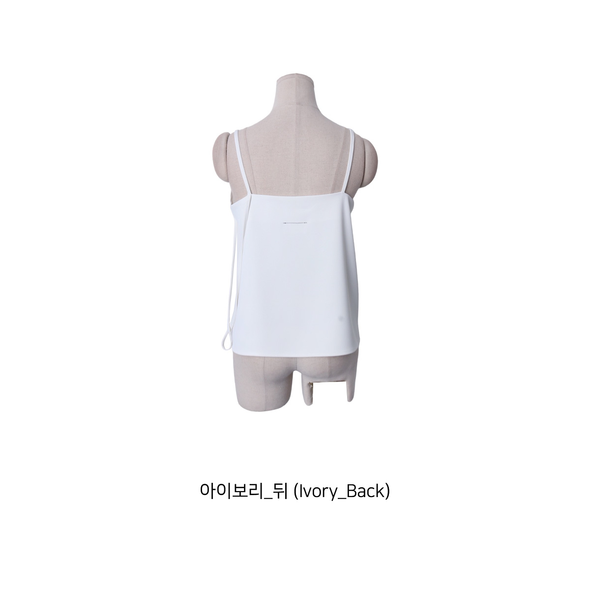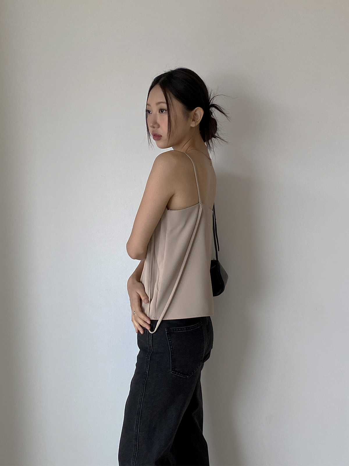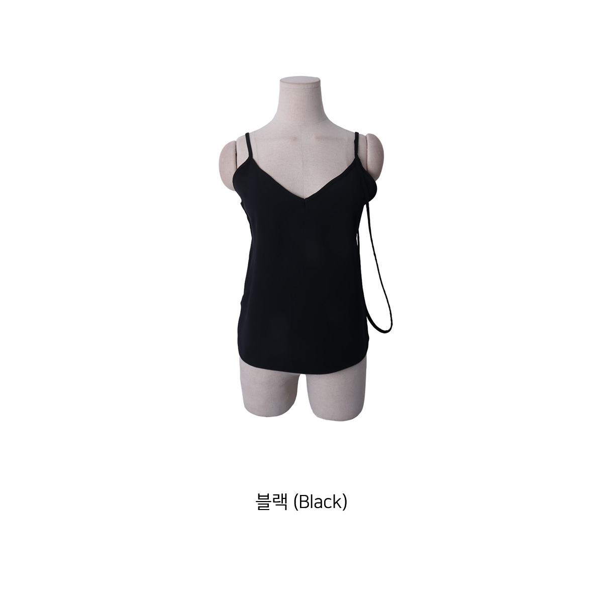 부드럽고 찰랑거리는 소재감으로 착용감이 우수하고 스트랩 포인트가 들어가있어 자유롭게 활용 가능하며 유니크한 끈나시