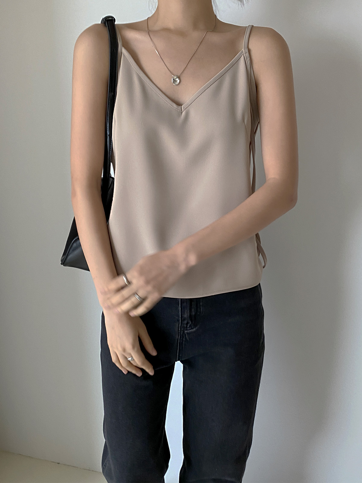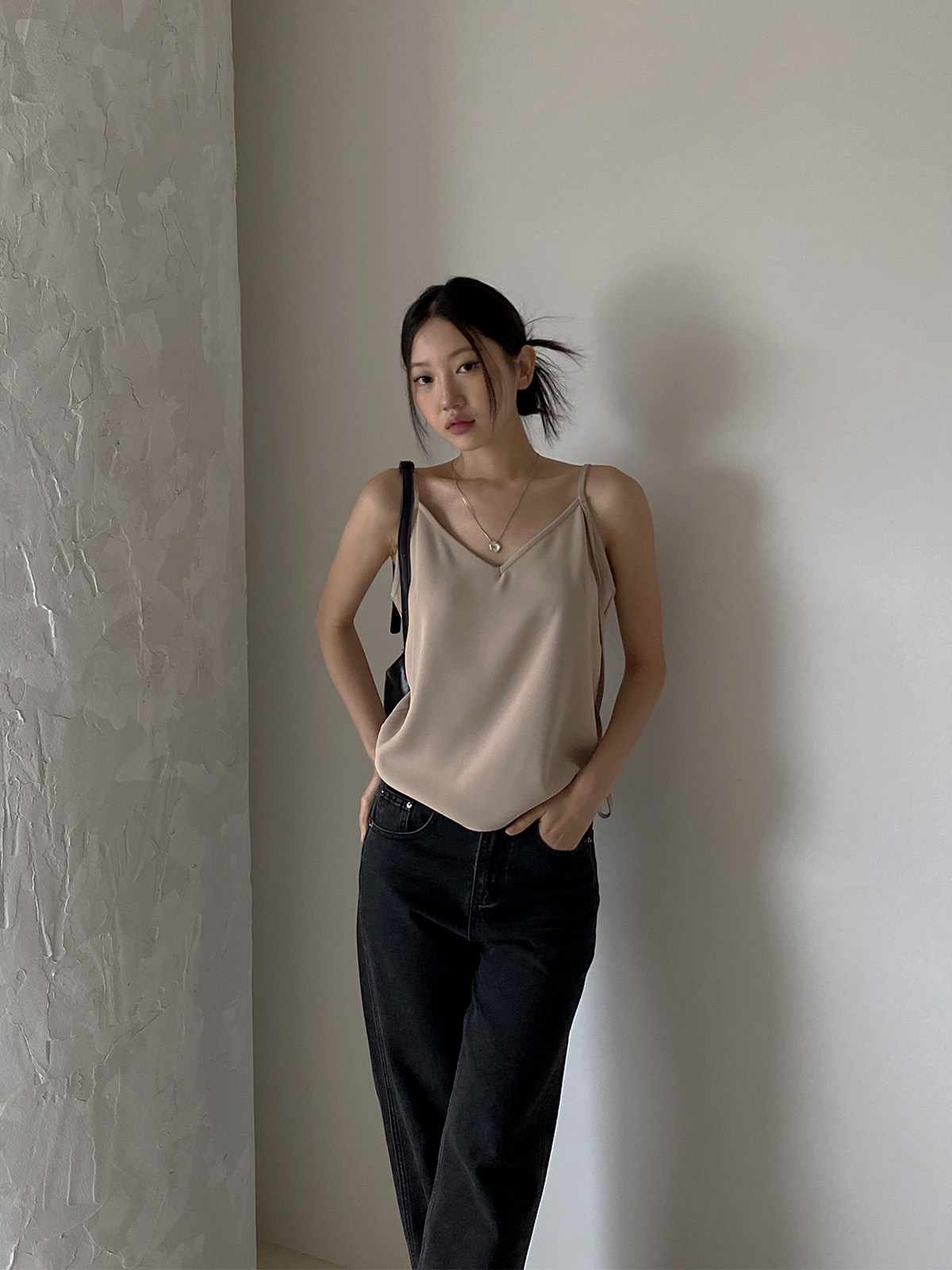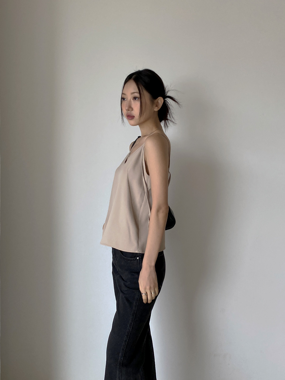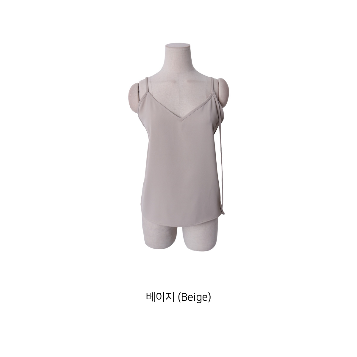 부드럽고 찰랑거리는 소재감으로 착용감이 우수하고 스트랩 포인트가 들어가있어 자유롭게 활용 가능하며 유니크한 끈나시