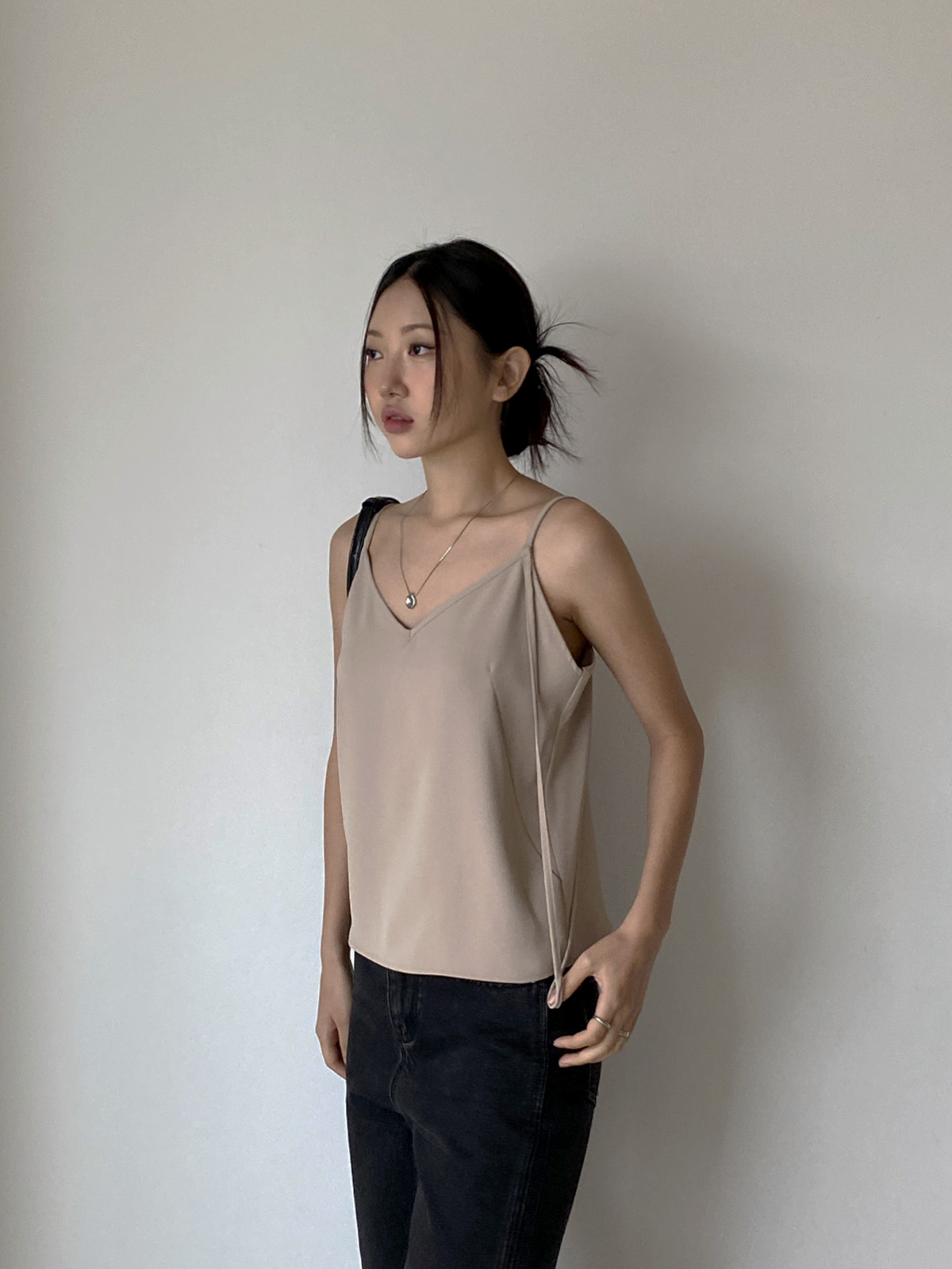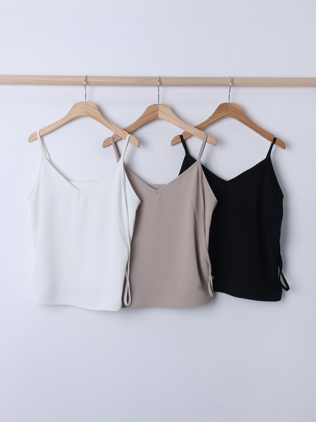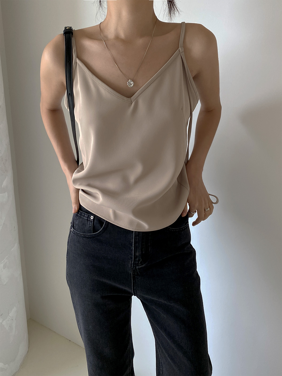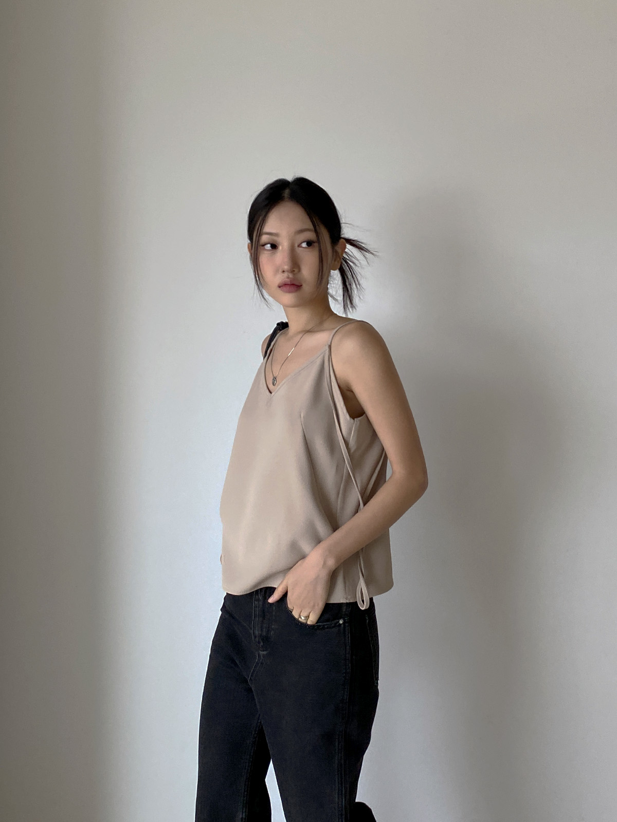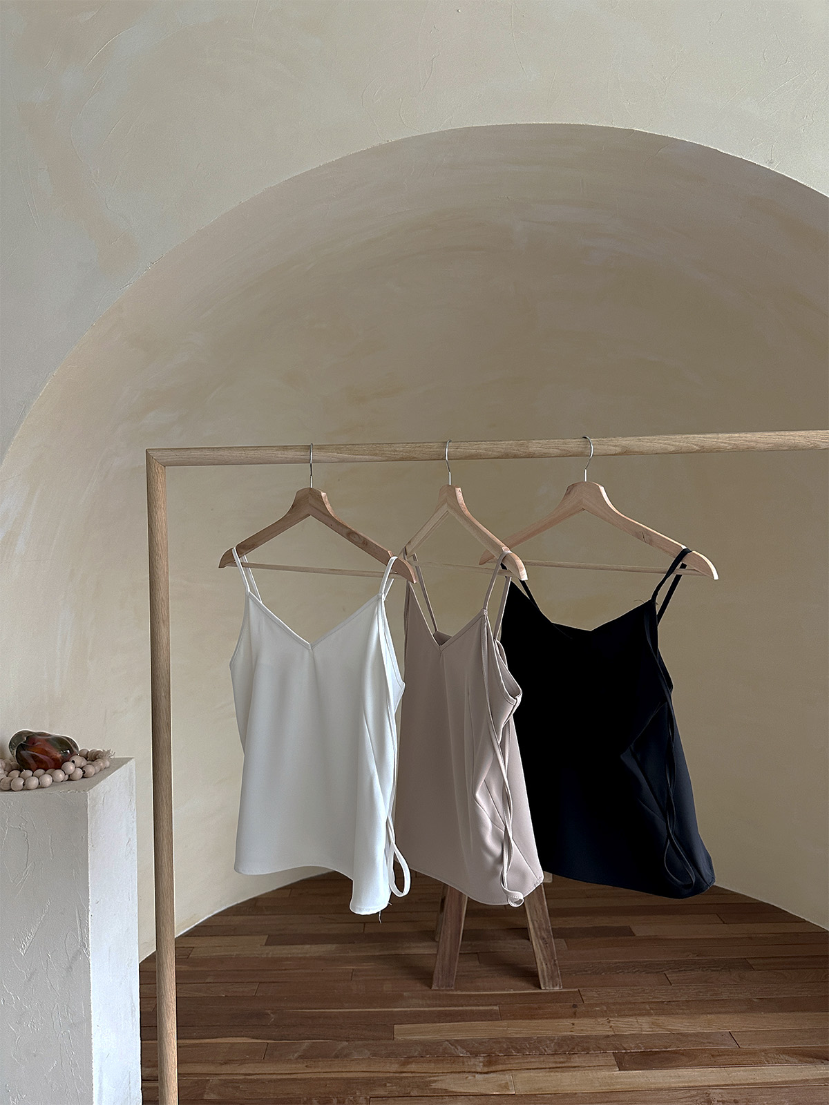 부드럽고 찰랑거리는 소재감으로 착용감이 우수하고 스트랩 포인트가 들어가있어 자유롭게 활용 가능하며 유니크한 끈나시