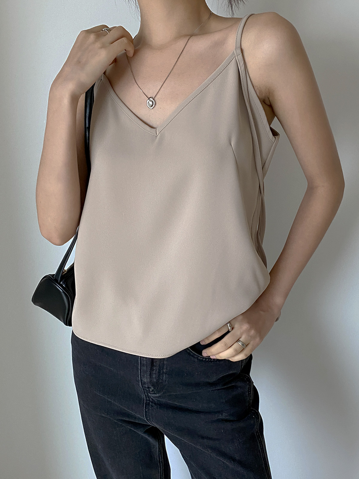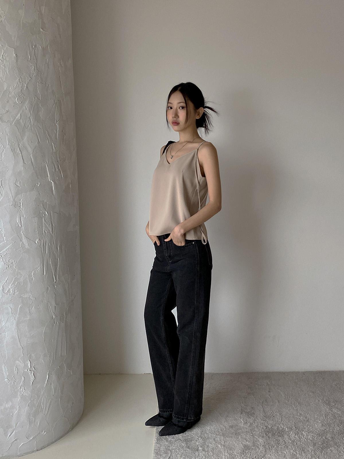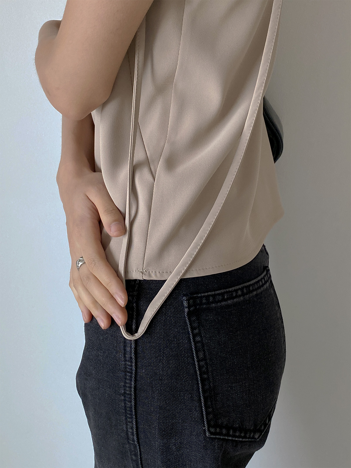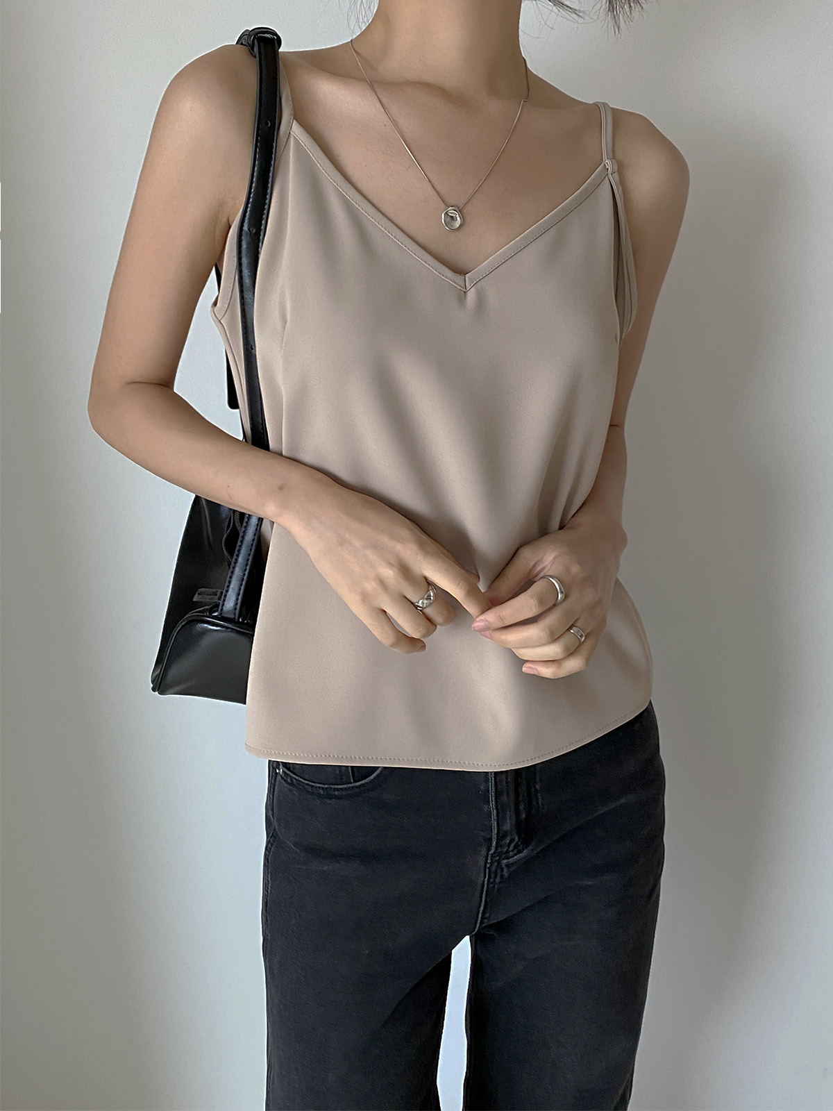 부드럽고 찰랑거리는 소재감으로 착용감이 우수하고 스트랩 포인트가 들어가있어 자유롭게 활용 가능하며 유니크한 끈나시