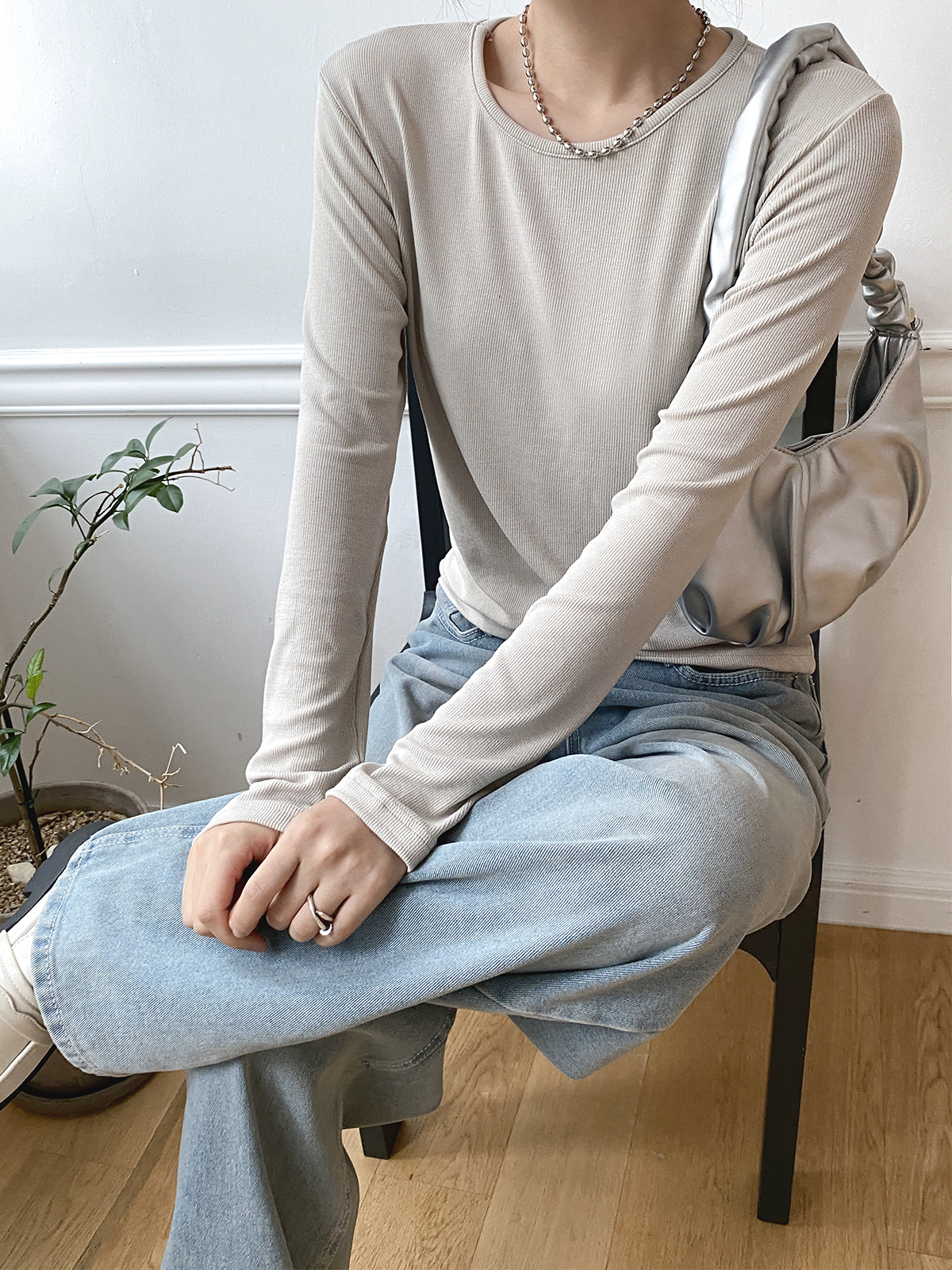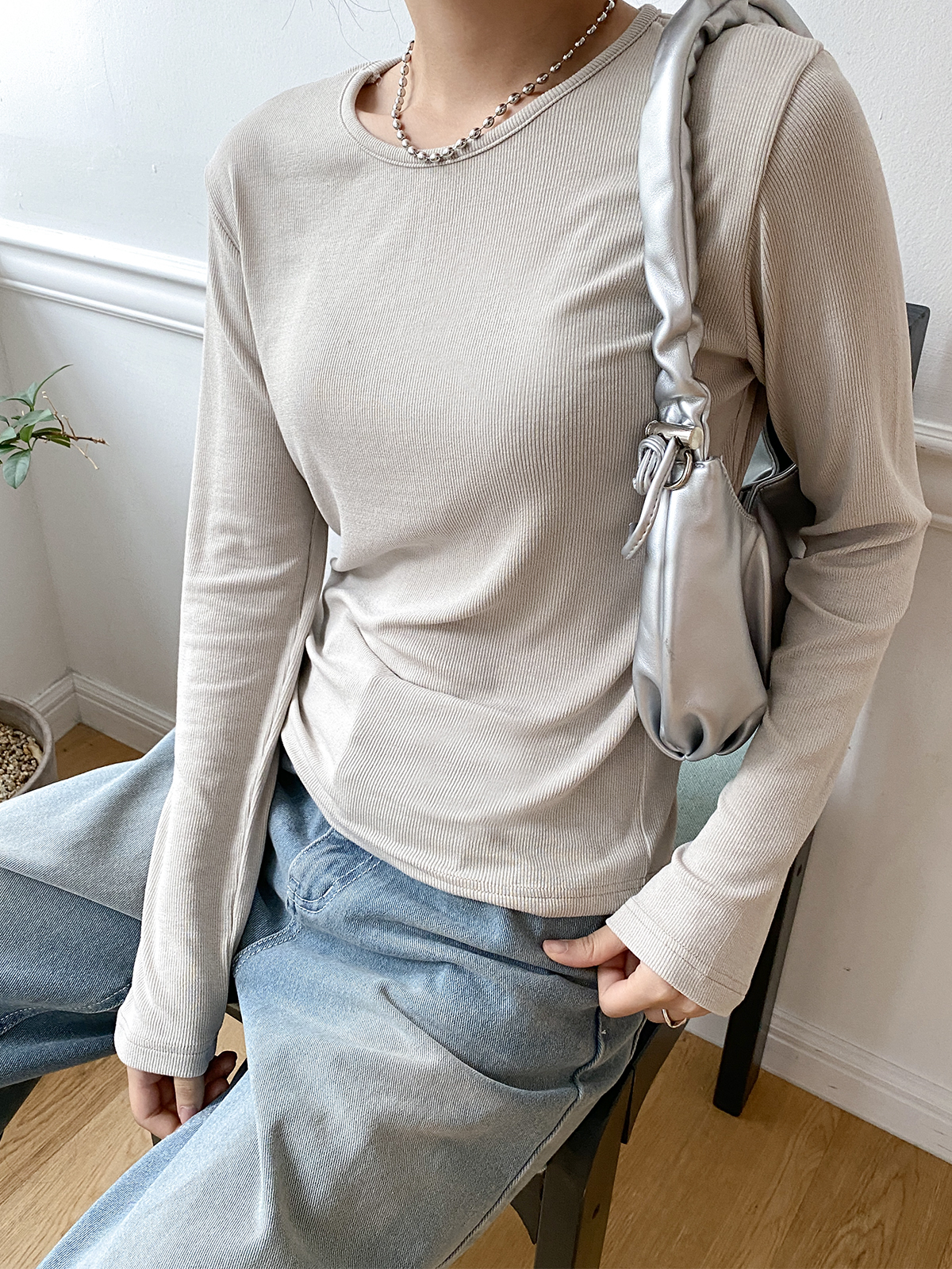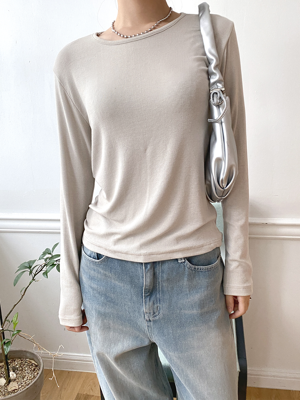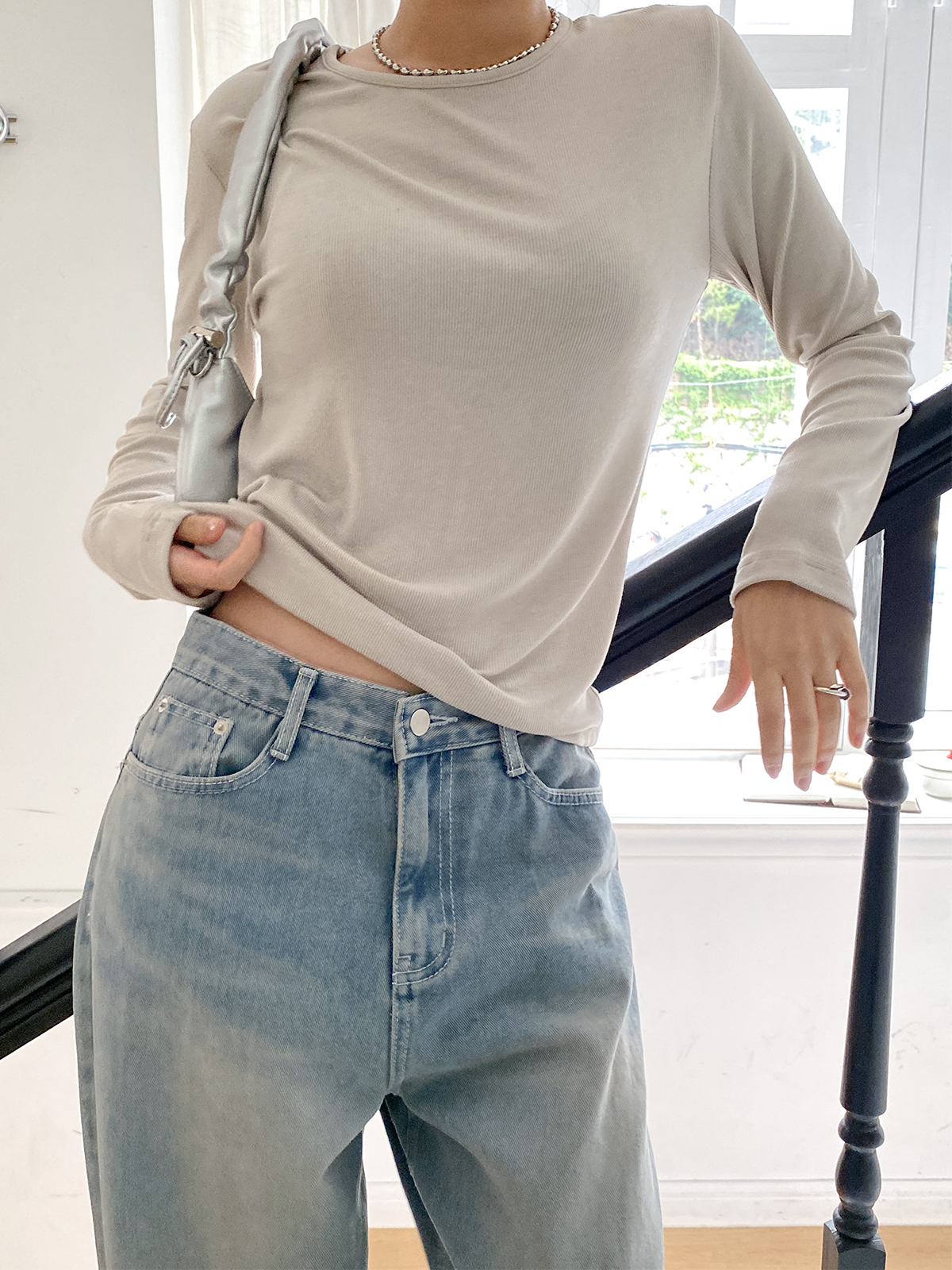 스탠다드한 디자인으로 깔끔하게 떨어지는 실루엣이 매력적인 골지 긴팔티에요!